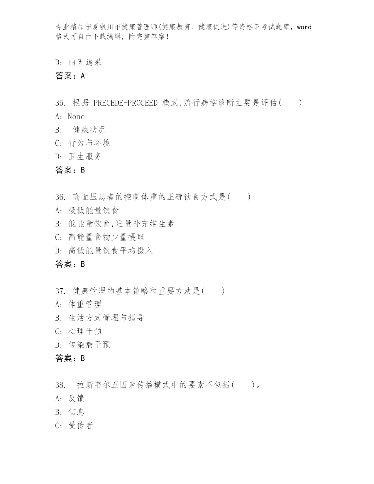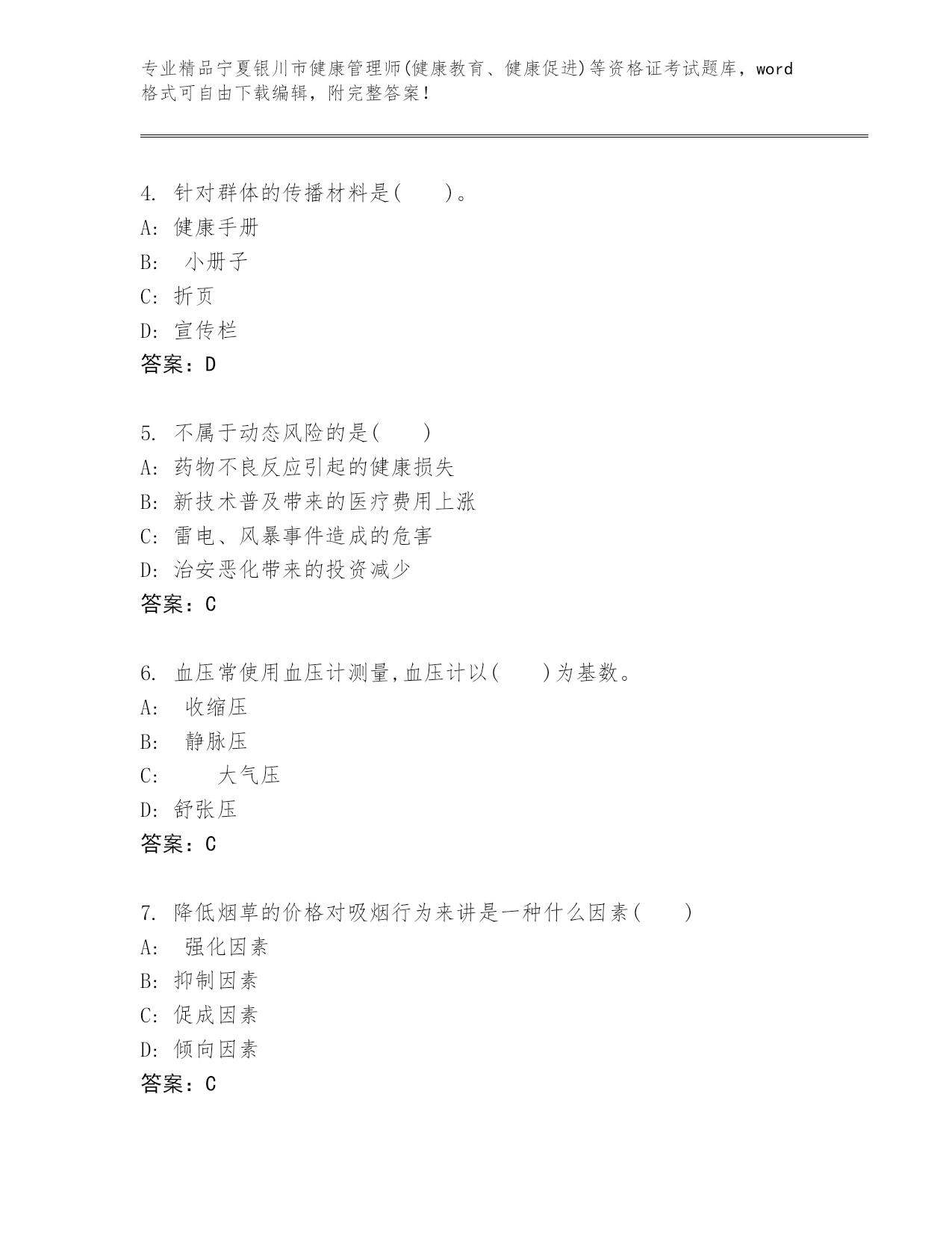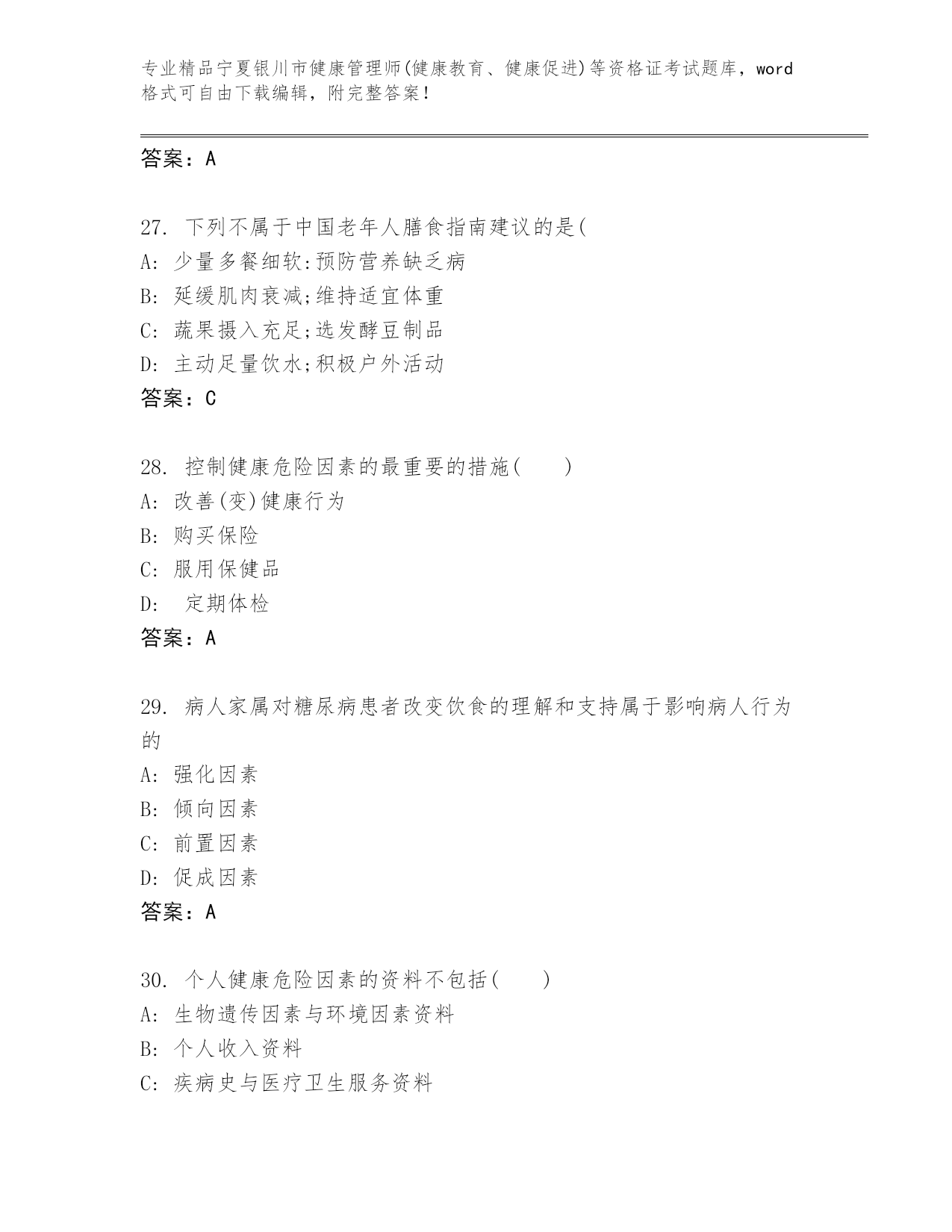 历年宁夏银川市健康管理师(健康教育、健康促进)等资格证考试完整题库及答案(全优).docx