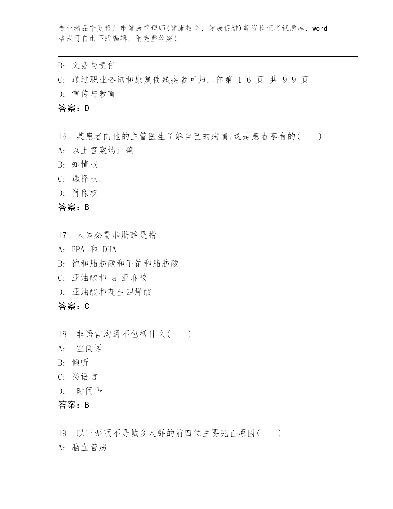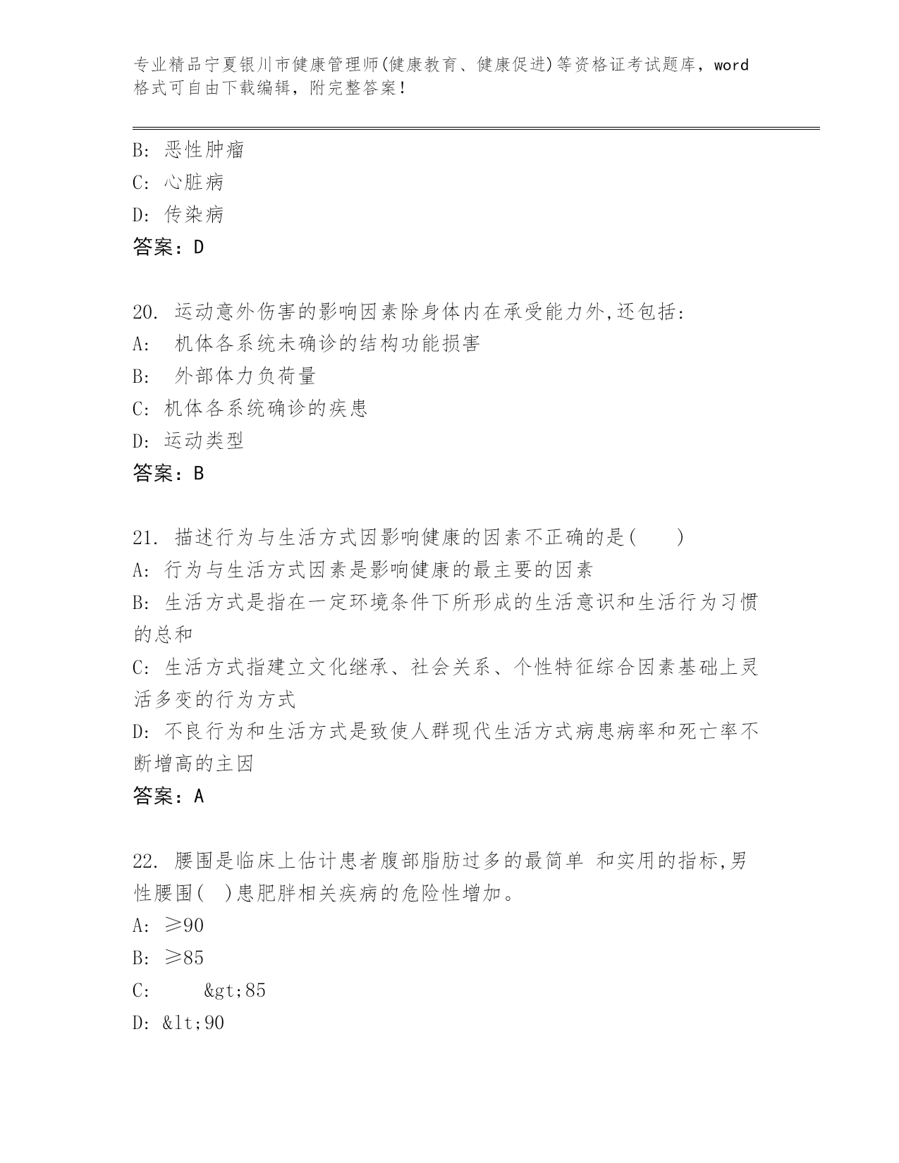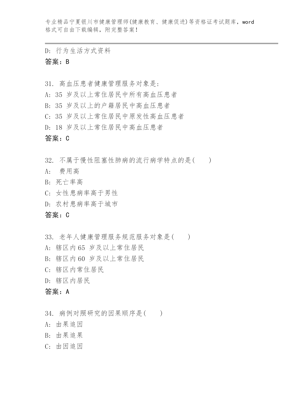 历年宁夏银川市健康管理师(健康教育、健康促进)等资格证考试完整题库及答案(全优).docx