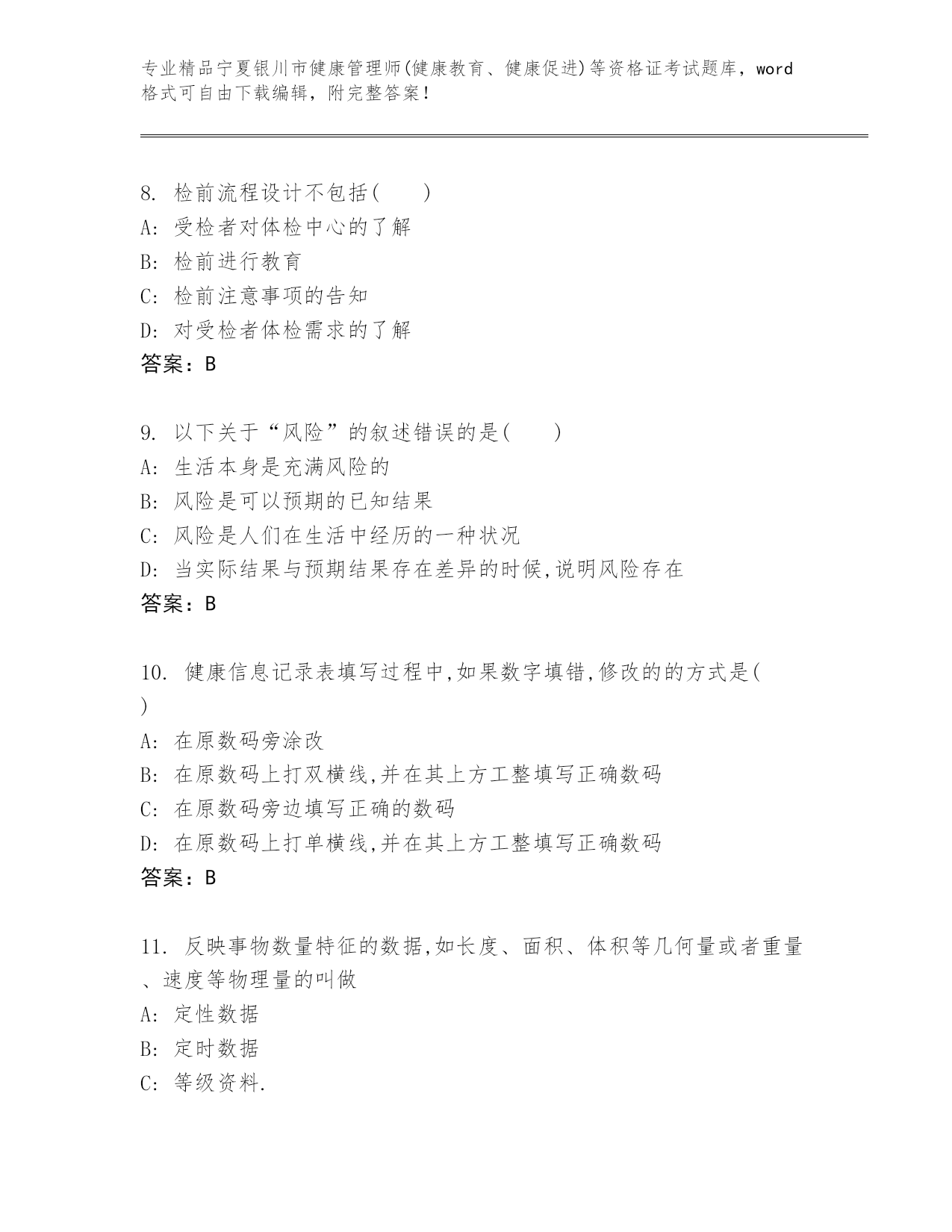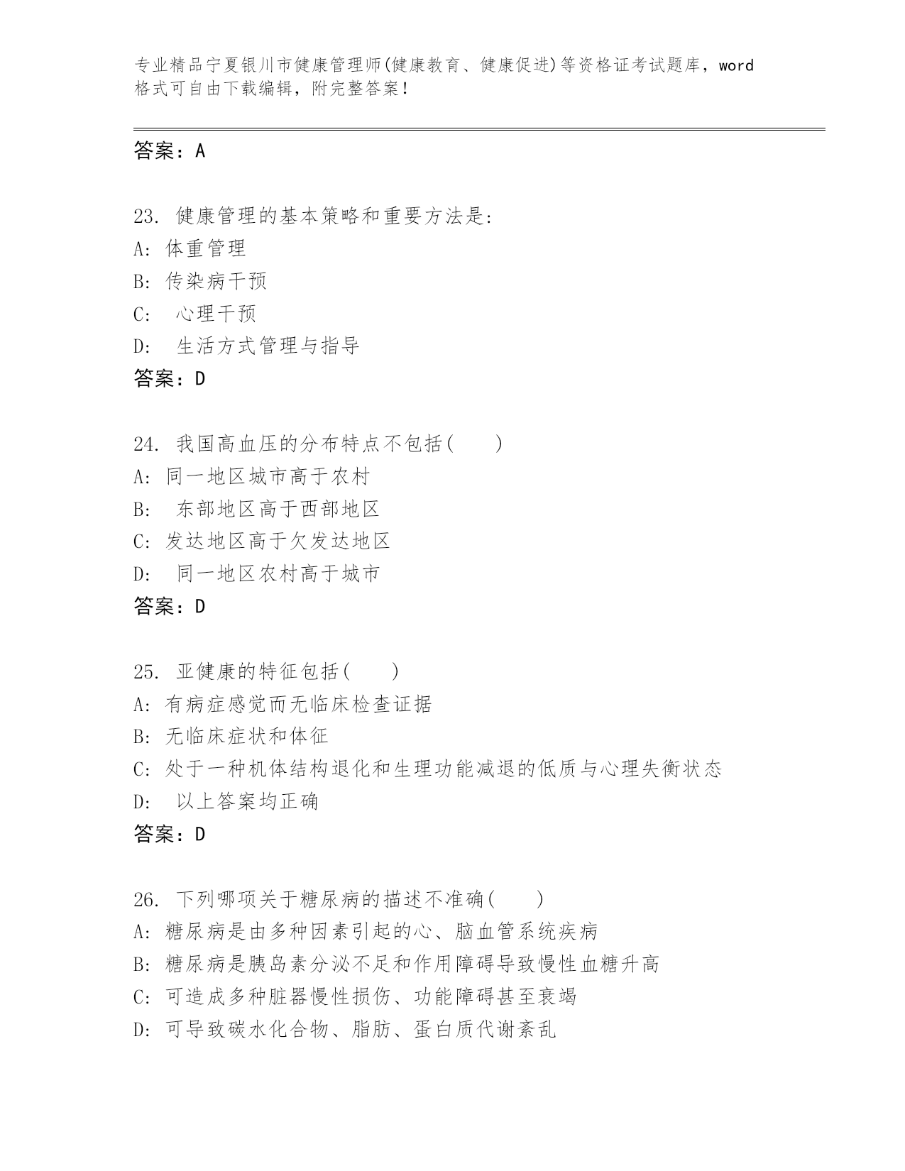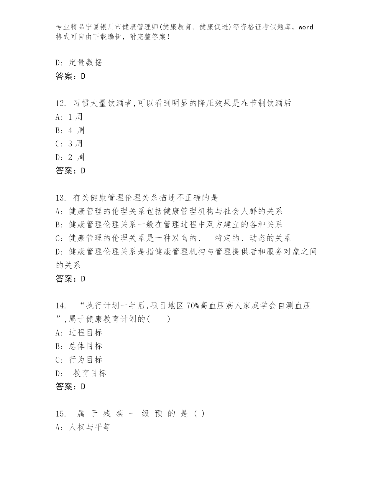历年宁夏银川市健康管理师(健康教育、健康促进)等资格证考试完整题库及答案(全优)