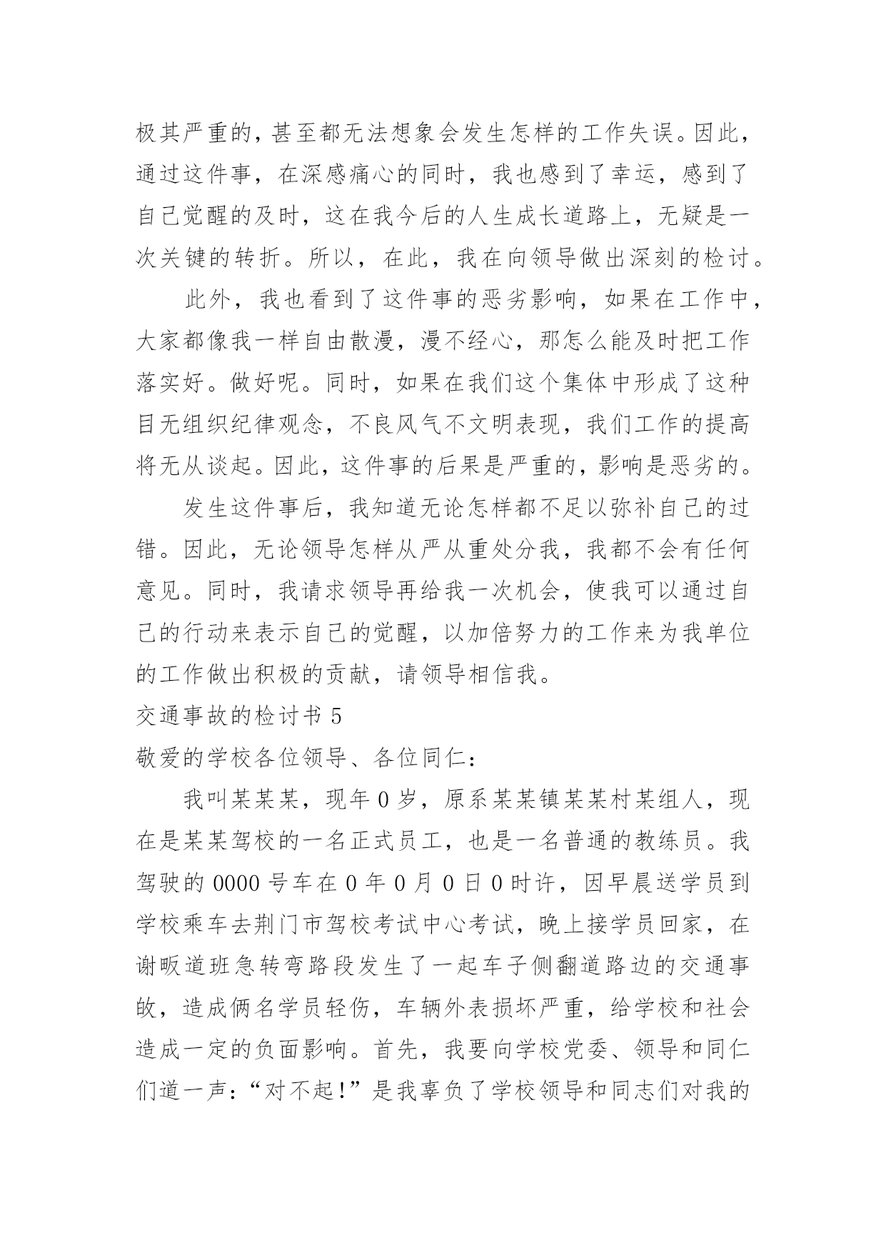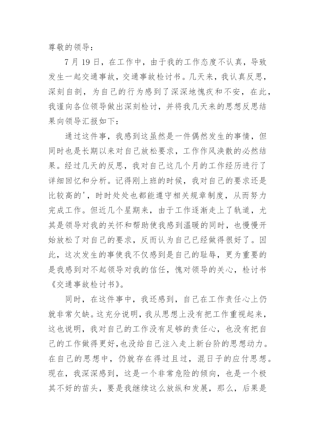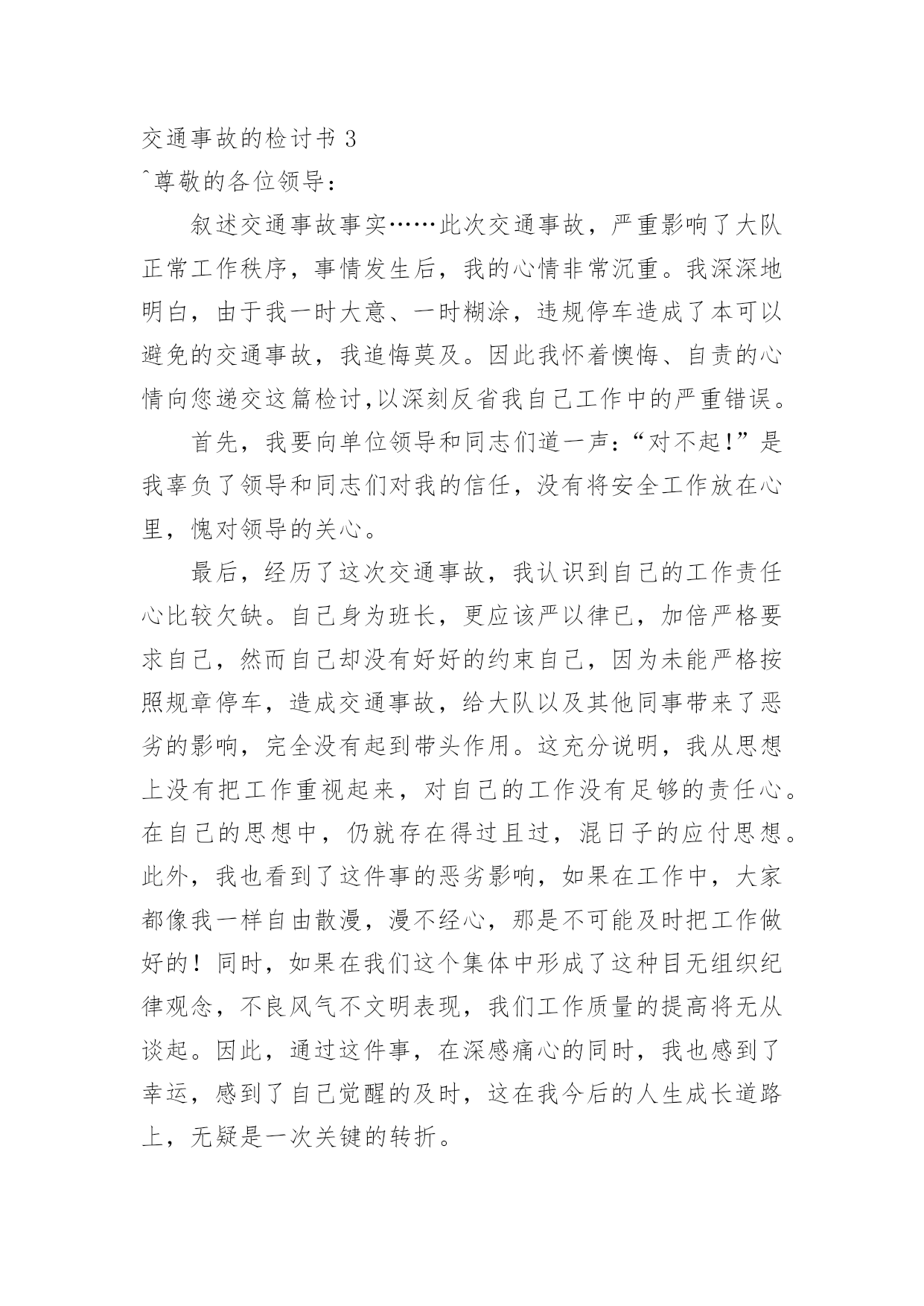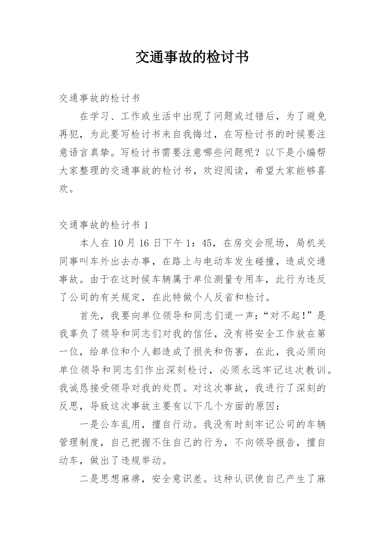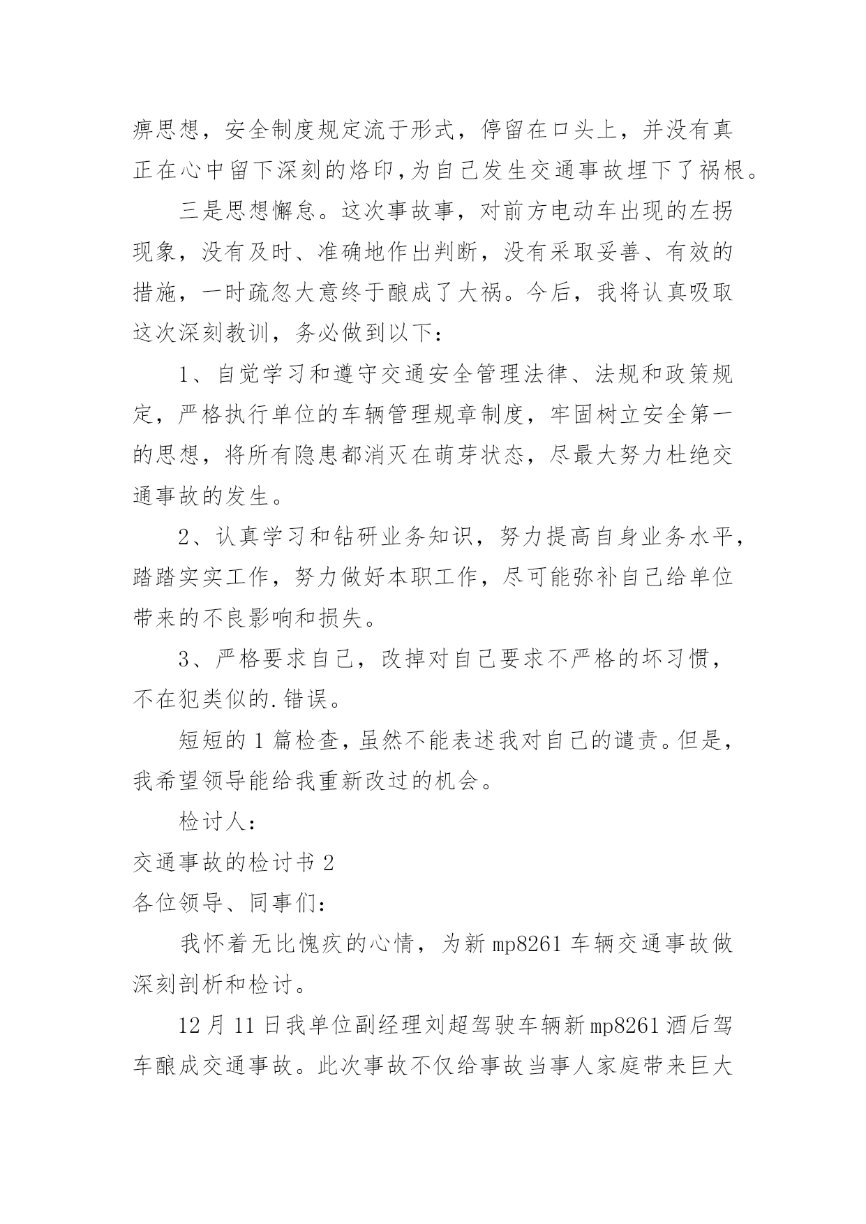 交通事故的检讨书交通事故的检讨书在学习、工作或生活中出现了问题或过错后,为了避免再犯,为此要写检讨书来自我悔过,在写检讨书的时候要注意语言真挚。写检讨书需要注意哪些问题呢?以下是小编帮大家整理的交通事故的检讨书,欢迎阅读,希望大家能够喜欢。交通事故的检讨书1本人在10月16日下午1:45,在房交会现场,局机关同事叫车外出去办事,在路上与电动车发生碰撞,造成交通事故。由于在这时候车辆属于单位测量专用车,此行为违反了公司的有关规定,在此特做个人反省和检讨。首先,我要向单位领导和同志们道一声:“对不起!”是我辜负了领导和同志们对我的信任,没有将安全工作放在第一位,给单位和个人都造成了损失和伤害,在此,我必须向单位领导和同志们作出深刻检讨,必须永远牢记这次教训。我诚恳接受领导对我的处罚。对这次事故,我进行了深刻的反思,导致这次事故主要有以下几个方面的原因:一是公车乱用,擅自行动。我没有时刻牢记公司的车辆管理制度,自己把握不住自己的行为,不向领导报告,擅自动车,做出了违规举动。二是思想麻痹,安全意识差。这种认识使自己产生了麻痹思想,安全制度规定流于形式,停留在口头上,并没有真正在心中留下深刻的烙印,为自己发生交通事故埋下了祸根。三是思想懈怠。这次事故事,对前方电动车出现的左拐现象,没有及时、准确地作出判断,没有采取妥善、有效的措施,一时疏忽大意终于酿成了大祸。今后,我将认真吸取这次深刻教训,务必做到以下:1、自觉学习和遵守交通安全管理法律、法规和政策规定,严格执行单位的车辆管理规章制度,牢固树立安全第一的思想,将所有隐患都消灭在萌芽状态,尽最大努力杜绝交通事故的发生。2、认真学习和钻研业务知识,努力提高自身业务水平,踏踏实实工作,努力做好本职工作,尽可能弥补自己给单位带来的不良影响和损失。3、严格要求自己,改掉对自己要求不严格的坏习惯,不在犯类似的.错误。短短的1篇检查,虽然不能表述我对自己的谴责。但是,我希望领导能给我重新改过的机会。检讨人:交通事故的检讨书2各位领导、同事们:我怀着无比愧疚的心情,为新mp8261车辆交通事故做深刻剖析和检讨。12月11日我单位副经理刘超驾驶车辆新mp8261酒后驾车酿成交通事故。此次事故不仅给事故当事人家庭带来巨大的灾难,也给沙运司、油服司造成了很大的损失。事故的发生正值年末安全环保工作的重要时期,同时又是在“百日安全无事故”的收官阶段;所以造成的影响非常恶劣,极大地损坏了沙运司和油服司的形象、声誉。事故造成油服司安全发展形势受到严重损坏,危害极其严重,影响了沙运司的正规化建设,也给沙运司领导的工作添了乱。几天来,我认真反思,深刻自剖,在此,我谨向各位领导和同事们做出深刻检讨,并将我几天来的思想反思结果向领导汇报如下:一、安全教育针对性不强,车勤人员安全意识淡薄,忽略了安全预防事故工作的经常性。虽然单位的安全预防事故教育是逢会必讲,但只注重教育时间和内容的落实而忽略了教育的效果;一是教育时间上只注重利用每天早班会会议时间泛泛而讲,缺乏对具体违章、违规事件具体说教的随机性教育,针对性不强。二是教育内容上只侧重于学习各种安全规章制度,不能结合单位实际任务进行说教,总认为只要开会讲过了就不会有问题发生,忽略了教育的实效性。尽管教育进行的不少,但收效并不是很大,大部分人缺乏对经常性安全工作的认识,总认为经常性安全工作琐碎,婆婆妈妈,事无巨细,缺乏持之以恒的经常性安全工作的耐心;个别驾驶员对车辆安全工作自身要求的时好时坏,断断续续,开会要求了就注意一阵儿,领导发现了就重视一会儿,平时基本处于“停工”状态。特别是对一些老驾驶员和职工,认为驾驶经验丰富,安全意识强,不会发生问题,只注重完成任务,轻视了安全。人员的遵章守纪、警钟长鸣的安全意识没有得到很好的树立;因此这种安全意识不强,自身要求不严是此次事故苗头的诱发因素。二、任务多,随机性强,制度落实不坚决。油服司的'各项规章制度规定的比较多,但落实到具体事务上就大打折扣。一是车辆派遣有规定,但落实起来很困难,主要是因为油服司是一个抢险性质的单位,需要24小时待命处理生产中的突发情况,随机性任务比较多,按出车审批程序层层请示、按级办手续耽误抢险速度,影响任务的完成;因此出车基本上是以领导的电话通知为主;这就容易形成夜间出险司机容易疲劳驾驶。二是在车场调度的管理上缺乏正规性,由于每天执行的任务多,随意性强,每天每台车进出的次数也相对较多,因此不能严格按照沙运司车场归厂检查管理制度去执行。三是人员管理规定的多,执行的少。油服司平时任务多,随机性强,因为任务多的原因有早起晚睡的现象,不能严格执行一日生活制度,这给人员的管控带来了一定的难度。四是与甲方关系密切,人情多、交往多,存在着请客多、聚会多;容易造成酒后开车等严重违章现象;这些不好的现象都严重的影响了单位规章制度