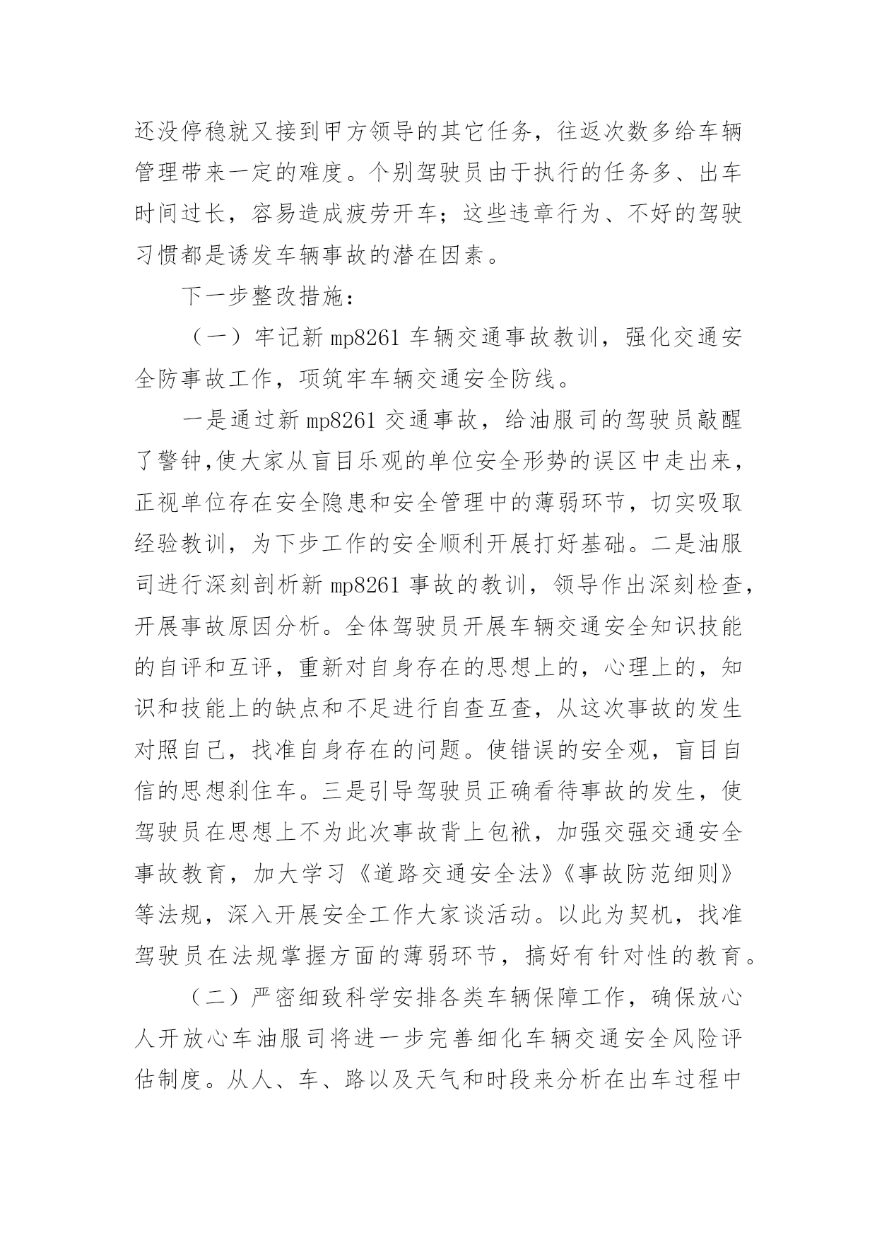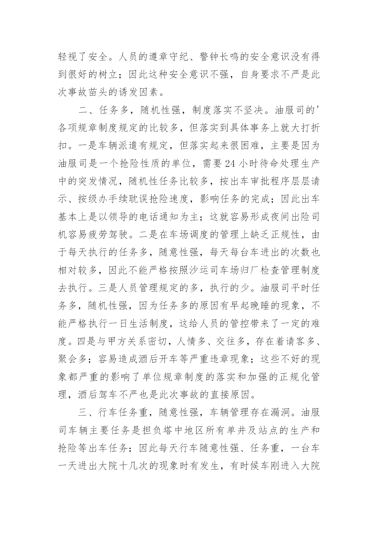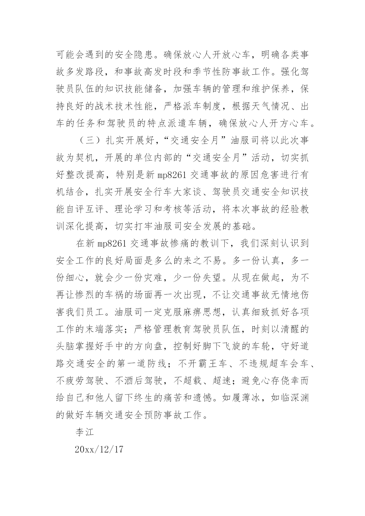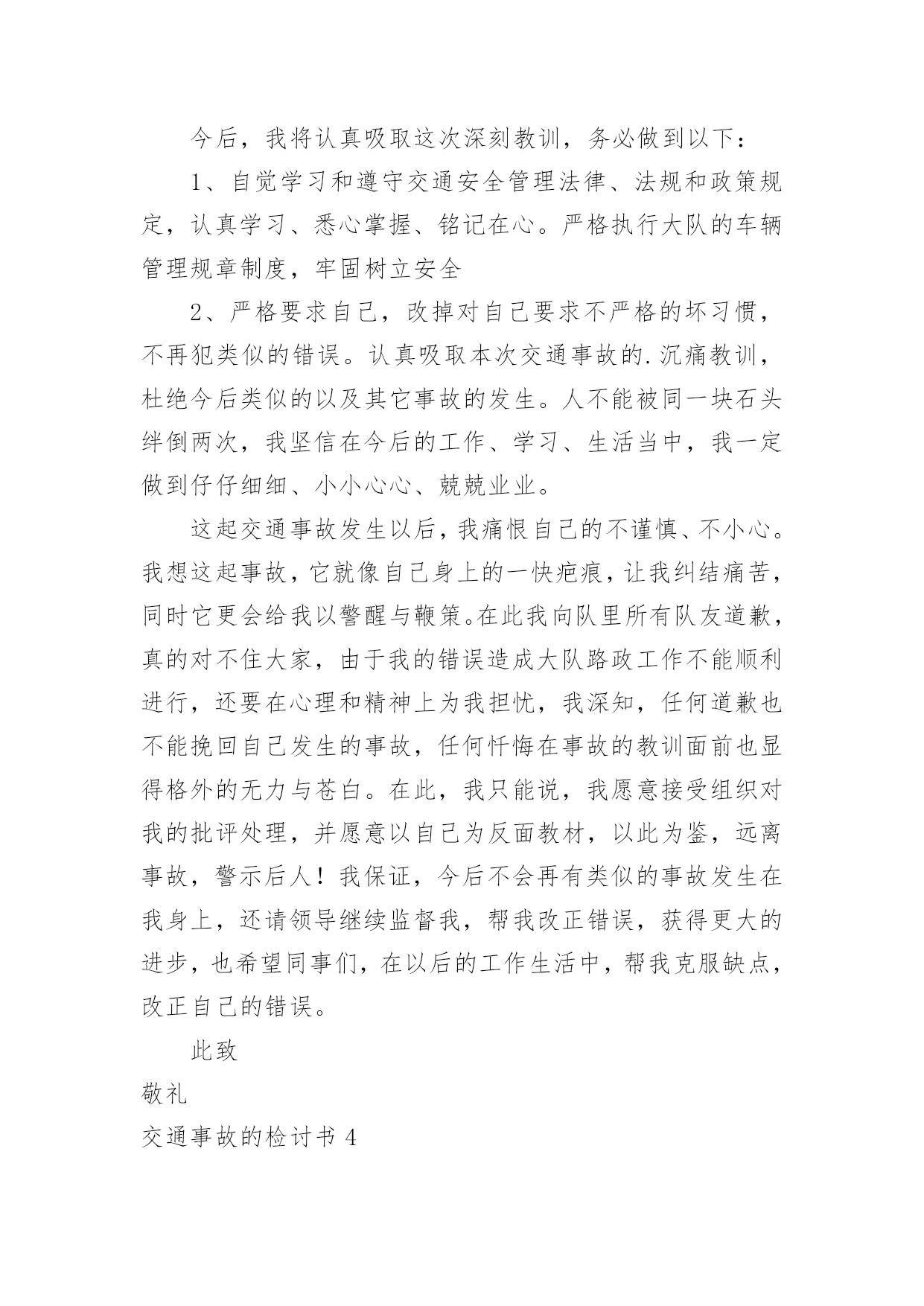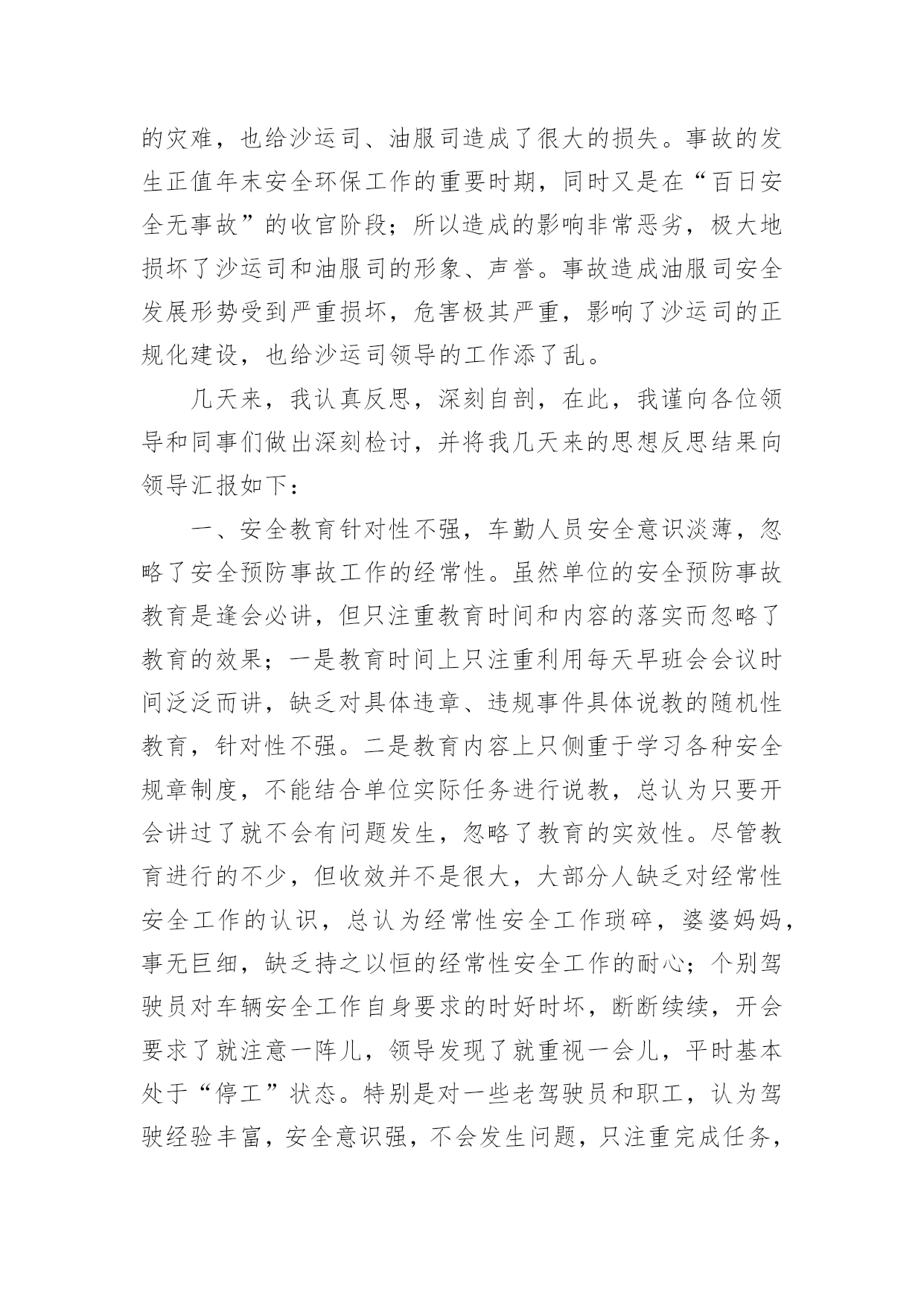 交通事故的检讨书交通事故的检讨书在学习、工作或生活中出现了问题或过错后,为了避免再犯,为此要写检讨书来自我悔过,在写检讨书的时候要注意语言真挚。写检讨书需要注意哪些问题呢?以下是小编帮大家整理的交通事故的检讨书,欢迎阅读,希望大家能够喜欢。交通事故的检讨书1本人在10月16日下午1:45,在房交会现场,局机关同事叫车外出去办事,在路上与电动车发生碰撞,造成交通事故。由于在这时候车辆属于单位测量专用车,此行为违反了公司的有关规定,在此特做个人反省和检讨。首先,我要向单位领导和同志们道一声:“对不起!”是我辜负了领导和同志们对我的信任,没有将安全工作放在第一位,给单位和个人都造成了损失和伤害,在此,我必须向单位领导和同志们作出深刻检讨,必须永远牢记这次教训。我诚恳接受领导对我的处罚。对这次事故,我进行了深刻的反思,导致这次事故主要有以下几个方面的原因:一是公车乱用,擅自行动。我没有时刻牢记公司的车辆管理制度,自己把握不住自己的行为,不向领导报告,擅自动车,做出了违规举动。二是思想麻痹,安全意识差。这种认识使自己产生了麻痹思想,安全制度规定流于形式,停留在口头上,并没有真正在心中留下深刻的烙印,为自己发生交通事故埋下了祸根。三是思想懈怠。这次事故事,对前方电动车出现的左拐现象,没有及时、准确地作出判断,没有采取妥善、有效的措施,一时疏忽大意终于酿成了大祸。今后,我将认真吸取这次深刻教训,务必做到以下:1、自觉学习和遵守交通安全管理法律、法规和政策规定,严格执行单位的车辆管理规章制度,牢固树立安全第一的思想,将所有隐患都消灭在萌芽状态,尽最大努力杜绝交通事故的发生。2、认真学习和钻研业务知识,努力提高自身业务水平,踏踏实实工作,努力做好本职工作,尽可能弥补自己给单位带来的不良影响和损失。3、严格要求自己,改掉对自己要求不严格的坏习惯,不在犯类似的.错误。短短的1篇检查,虽然不能表述我对自己的谴责。但是,我希望领导能给我重新改过的机会。检讨人:交通事故的检讨书2各位领导、同事们:我怀着无比愧疚的心情,为新mp8261车辆交通事故做深刻剖析和检讨。12月11日我单位副经理刘超驾驶车辆新mp8261酒后驾车酿成交通事故。此次事故不仅给事故当事人家庭带来巨大的灾难,也给沙运司、油服司造成了很大的损失。事故的发生正值年末安全环保工作的重要时期,同时又是在“百日安全无事故”的收官阶段;所以造成的影响非常恶劣,极大地损坏了沙运司和油服司的形象、声誉。事故造成油服司安全发展形势受到严重损坏,危害极其严重,影响了沙运司的正规化建设,也给沙运司领导的工作添了乱。几天来,我认真反思,深刻自剖,在此,我谨向各位领导和同事们做出深刻检讨,并将我几天来的思想反思结果向领导汇报如下:一、安全教育针对性不强,车勤人员安全意识淡薄,忽略了安全预防事故工作的经常性。虽然单位的安全预防事故教育是逢会必讲,但只注重教育时间和内容的落实而忽略了教育的效果;一是教育时间上只注重利用每天早班会会议时间泛泛而讲,缺乏对具体违章、违规事件具体说教的随机性教育,针对性不强。二是教育内容上只侧重于学习各种安全规章制度,不能结合单位实际任务进行说教,总认为只要开会讲过了就不会有问题发生,忽略了教育的实效性。尽管教育进行的不少,但收效并不是很大,大部分人缺乏对经常性安全工作的认识,总认为经常性安全工作琐碎,婆婆妈妈,事无巨细,缺乏持之以恒的经常性安全工作的耐心;个别驾驶员对车辆安全工作自身要求的时好时坏,断断续续,开会要求了就注意一阵儿,领导发现了就重视一会儿,平时基本处于“停工”状态。特别是对一些老驾驶员和职工,认为驾驶经验丰富,安全意识强,不会发生问题,只注重完成任务,轻视了安全。人员的遵章守纪、警钟长鸣的安全意识没有得到很好的树立;因此这种安全意识不强,自身要求不严是此次事故苗头的诱发因素。二、任务多,随机性强,制度落实不坚决。油服司的'各项规章制度规定的比较多,但落实到具体事务上就大打折扣。一是车辆派遣有规定,但落实起来很困难,主要是因为油服司是一个抢险性质的单位,需要24小时待命处理生产中的突发情况,随机性任务比较多,按出车审批程序层层请示、按级办手续耽误抢险速度,影响任务的完成;因此出车基本上是以领导的电话通知为主;这就容易形成夜间出险司机容易疲劳驾驶。二是在车场调度的管理上缺乏正规性,由于每天执行的任务多,随意性强,每天每台车进出的次数也相对较多,因此不能严格按照沙运司车场归厂检查管理制度去执行。三是人员管理规定的多,执行的少。油服司平时任务多,随机性强,因为任务多的原因有早起晚睡的现象,不能严格执行一日生活制度,这给人员的管控带来了一定的难度。四是与甲方关系密切,人情多、交往多,存在着请客多、聚会多;容易造成酒后开车等严重违章现象;这些不好的现象都严重的影响了单位规章制度