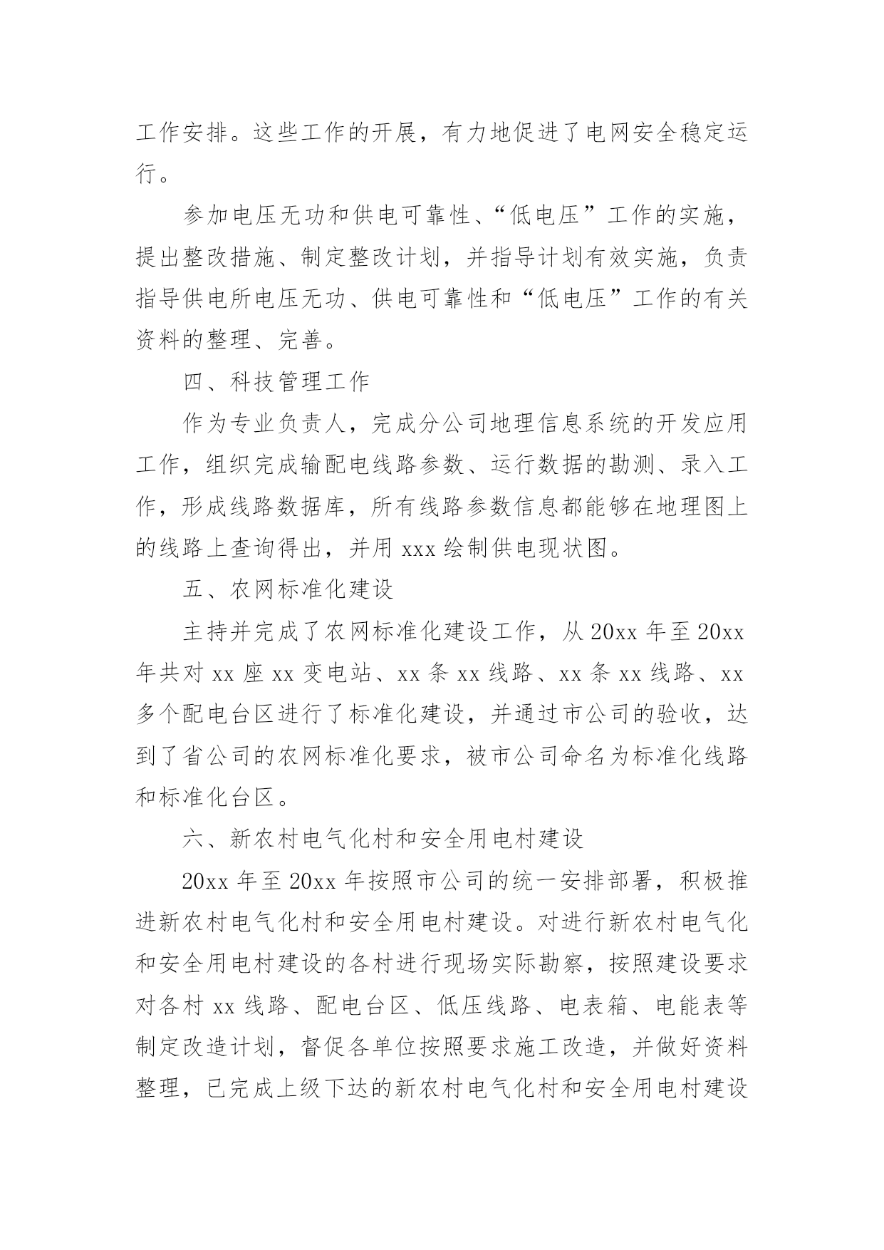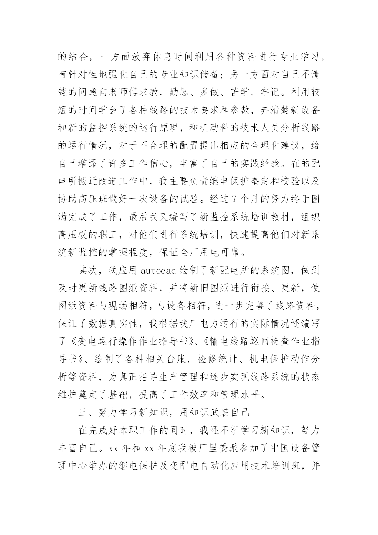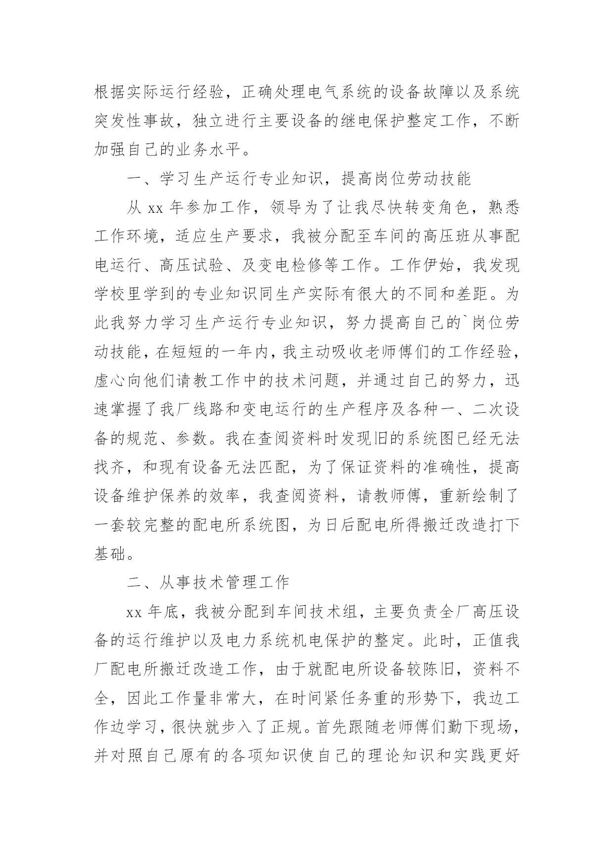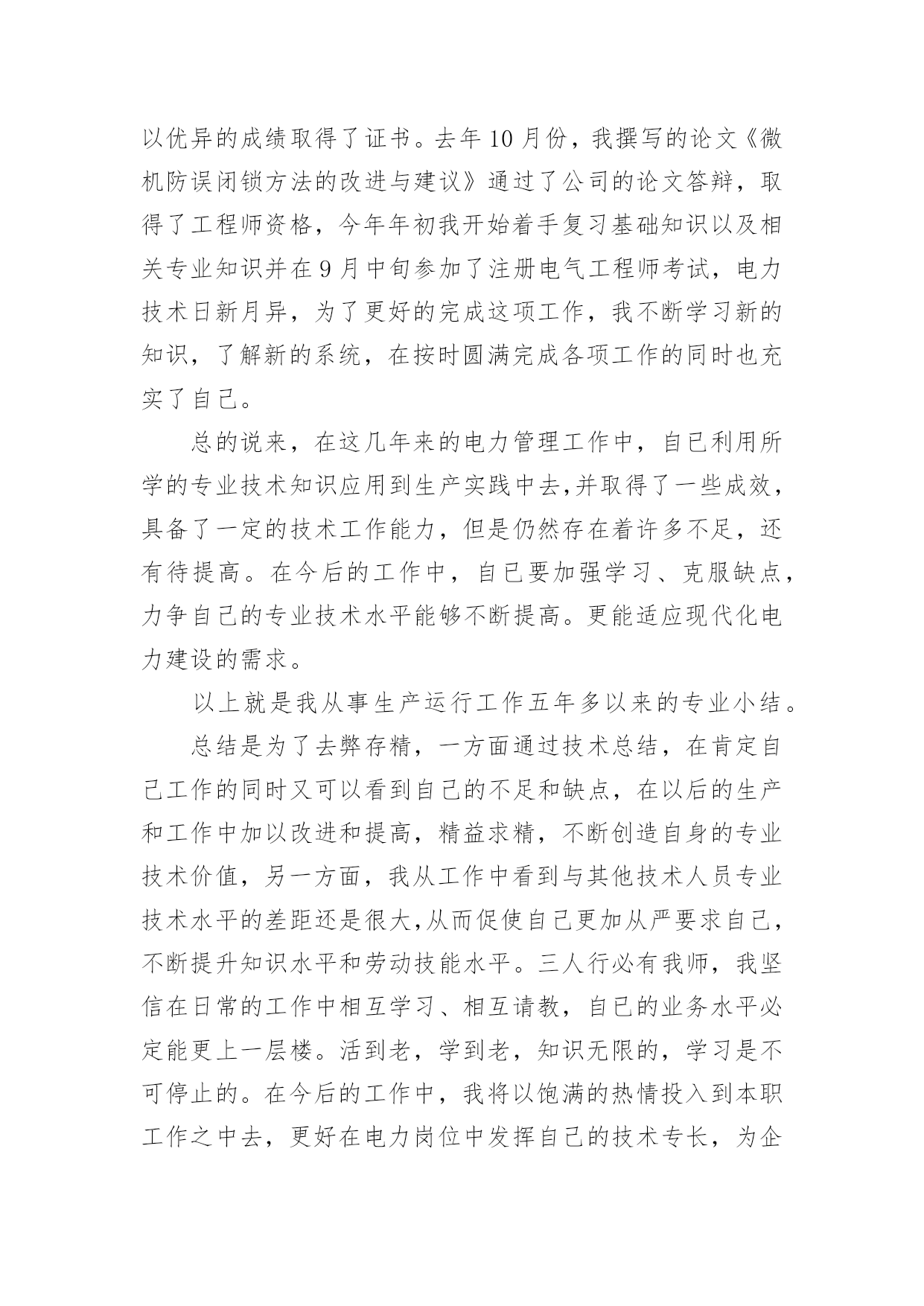 电力专业技术个人工作总结电力专业技术个人工作总结总结是在一段时间内对学习和工作生活等表现加以总结和概括的一种书面材料,它是增长才干的一种好办法,不妨让我们认真地完成总结吧。那么如何把总结写出新花样呢?以下是小编收集整理的电力专业技术个人工作总结,仅供参考,希望能够帮助到大家。电力专业技术个人工作总结1本人于20xx年毕业于xxxx大学,所学专业为xxxxxxxx方向。在xx年x月进入xx公司化机厂机动车间参加工作至今。在这六年中,我先后在xx车间的高压班、电工维修班从事生产一线工作。在各位领导和同事的支持和帮助下,自己的思想、工作、学习等各方面都取得了一定的成绩,个人综合素质也得到了一定的提高,下面就从专业技术角度对我这五年来的专业技术工作做一次全面总结:电力企业是一个特殊的行业,电工是是一个高危的工种,尤其是高压电,它需要职工有良好的自身能力和心理素质,因此我不断学习各种技能,努力学习和掌握电力系统运行方式及其特点,了解全厂的配电运行情况,同时能根据各类电气设备的需要,掌握相关的高压工程技术专业知识,能根据现场电气设备运行情况选择最佳运行方式及经济运行方法,根据实际运行经验,正确处理电气系统的设备故障以及系统突发性事故,独立进行主要设备的继电保护整定工作,不断加强自己的业务水平。一、学习生产运行专业知识,提高岗位劳动技能从xx年参加工作,领导为了让我尽快转变角色,熟悉工作环境,适应生产要求,我被分配至车间的高压班从事配电运行、高压试验、及变电检修等工作。工作伊始,我发现学校里学到的专业知识同生产实际有很大的不同和差距。为此我努力学习生产运行专业知识,努力提高自己的`岗位劳动技能,在短短的一年内,我主动吸收老师傅们的工作经验,虚心向他们请教工作中的技术问题,并通过自己的努力,迅速掌握了我厂线路和变电运行的生产程序及各种一、二次设备的规范、参数。我在查阅资料时发现旧的系统图已经无法找齐,和现有设备无法匹配,为了保证资料的准确性,提高设备维护保养的效率,我查阅资料,请教师傅,重新绘制了一套较完整的配电所系统图,为日后配电所得搬迁改造打下基础。二、从事技术管理工作xx年底,我被分配到车间技术组,主要负责全厂高压设备的运行维护以及电力系统机电保护的整定。此时,正值我厂配电所搬迁改造工作,由于就配电所设备较陈旧,资料不全,因此工作量非常大,在时间紧任务重的形势下,我边工作边学习,很快就步入了正规。首先跟随老师傅们勤下现场,并对照自己原有的各项知识使自己的理论知识和实践更好的结合,一方面放弃休息时间利用各种资料进行专业学习,有针对性地强化自己的专业知识储备;另一方面对自己不清楚的问题向老师傅求教,勤思、多做、苦学、牢记。利用较短的时间学会了各种线路的技术要求和参数,弄清楚新设备和新的监控系统的运行原理,和机动科的技术人员分析线路的运行情况,对于不合理的配置提出相应的合理化建议,给自己增添了许多工作信心,丰富了自己的实践经验。在的配电所搬迁改造工作中,我主要负责继电保护整定和校验以及协助高压班做好一次设备的试验。经过7个月的努力终于圆满完成了工作,最后我又编写了新监控系统培训教材,组织高压板的职工,对他们进行系统培训,快速提高他们对新系统新监控的掌握程度,保证全厂用电可靠。其次,我应用autocad绘制了新配电所的系统图,做到及时更新线路图纸资料,并将新旧图纸进行衔接、更新,使图纸资料与现场相符,与设备相符,进一步完善了线路资料,保证了数据真实性,我根据我厂电力运行的实际情况还编写了《变电运行操作作业指导书》、《输电线路巡回检查作业指导书》、绘制了各种相关台账,检修统计、机电保护动作分析等资料,为真正指导生产管理和逐步实现线路系统的状态维护奠定了基础,提高了工作效率和管理水平。三、努力学习新知识,用知识武装自己在完成好本职工作的同时,我还不断学习新知识,努力丰富自己。xx年和xx年底我被厂里委派参加了中国设备管理中心举办的继电保护及变配电自动化应用技术培训班,并以优异的成绩取得了证书。去年10月份,我撰写的论文《微机防误闭锁方法的改进与建议》通过了公司的论文答辩,取得了工程师资格,今年年初我开始着手复习基础知识以及相关专业知识并在9月中旬参加了注册电气工程师考试,电力技术日新月异,为了更好的完成这项工作,我不断学习新的知识,了解新的系统,在按时圆满完成各项工作的同时也充实了自己。总的说来,在这几年来的电力管理工作中,自已利用所学的专业技术知识应用到生产实践中去,并取得了一些成效,具备了一定的技术工作能力,但是仍然存在着许多不足,还有待提高。在今后的工作中,自已要加强学习、克服缺点,力争自己的专业技术水平能够不断提高。更能适应现代化电力建设的需求。以上就是我从事生产运行工作五年多以来的专业小结。总结是为了去弊存精,一方面通过技术总结,在肯