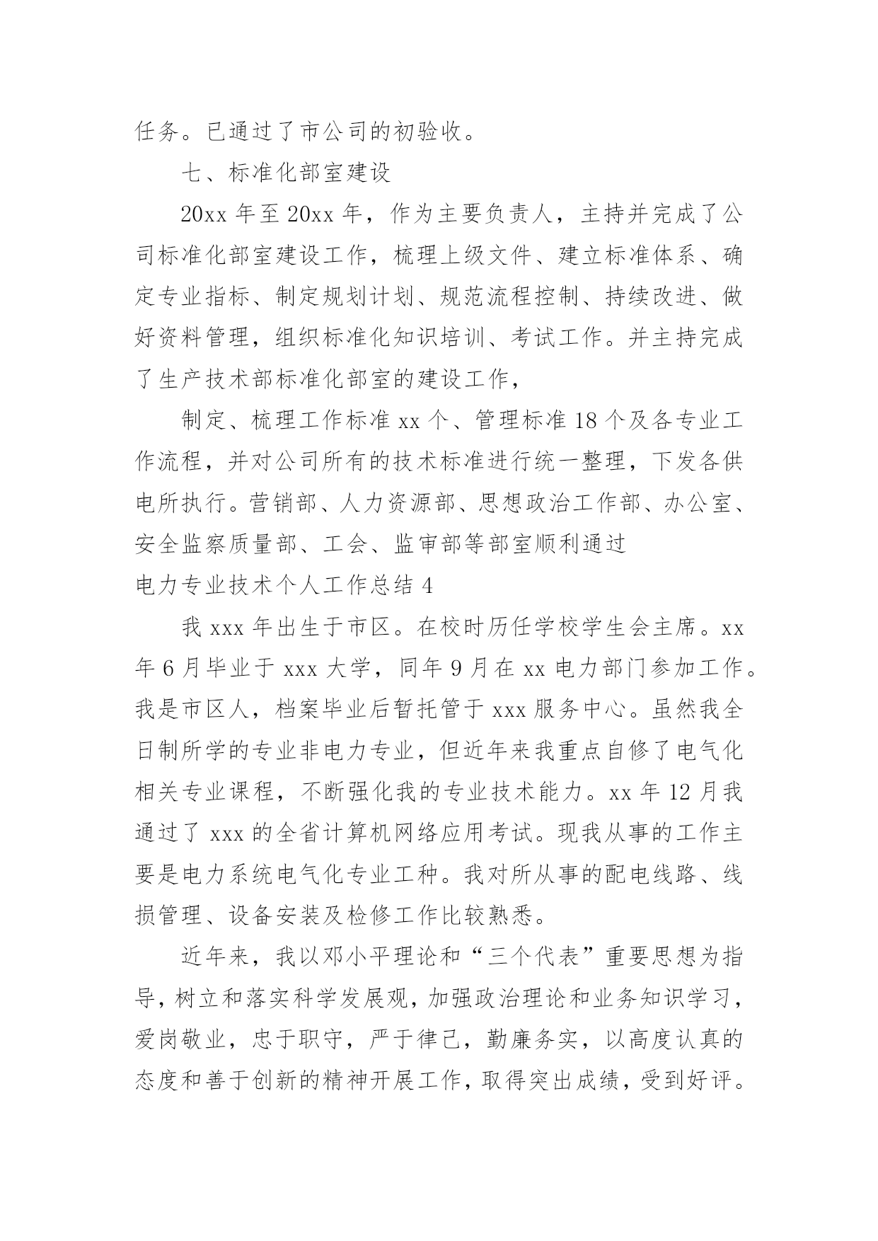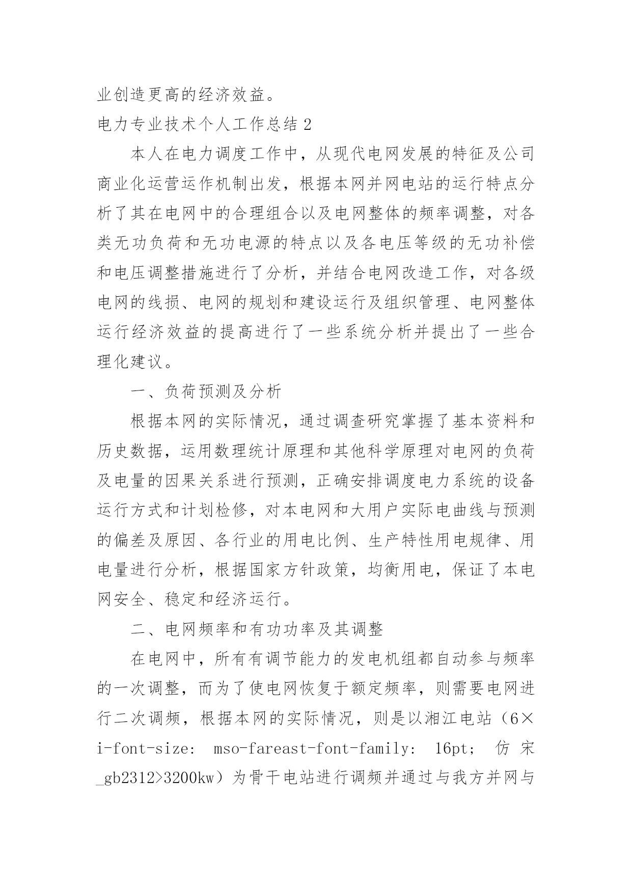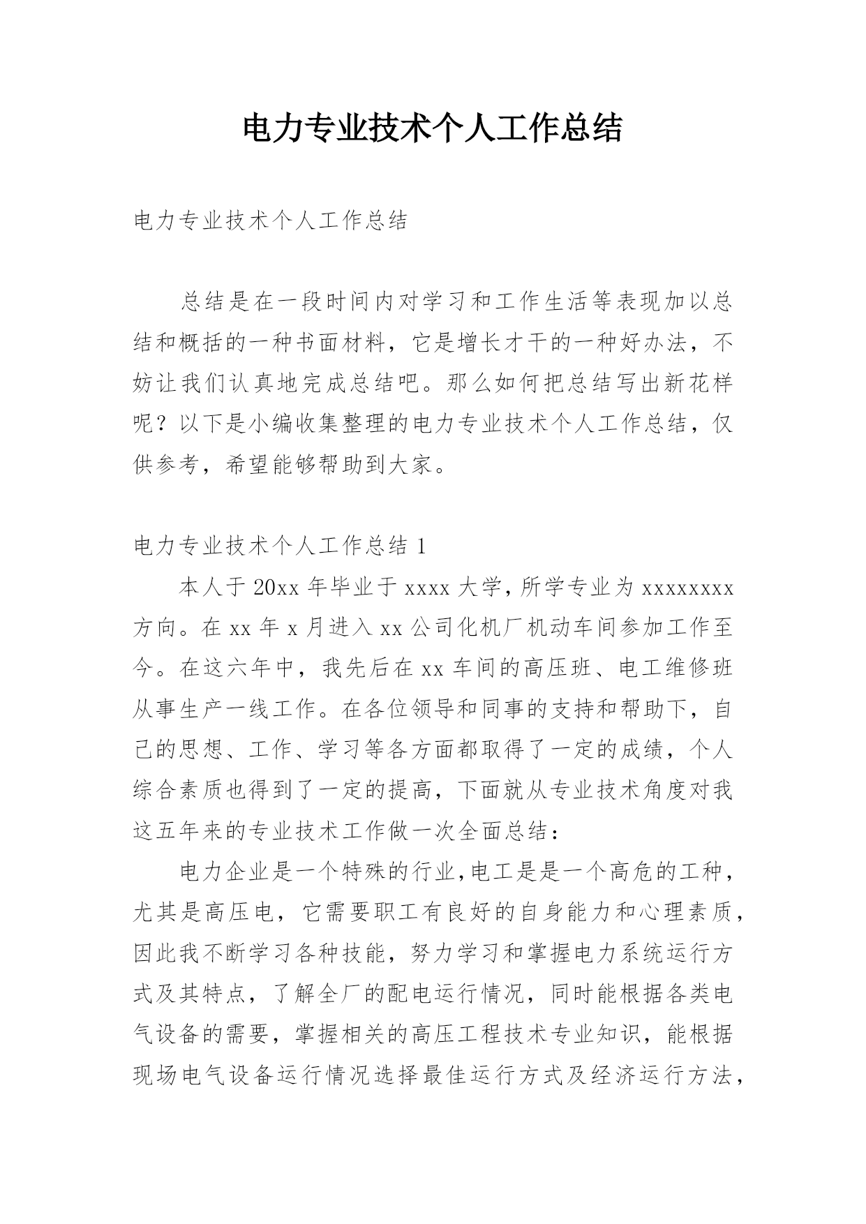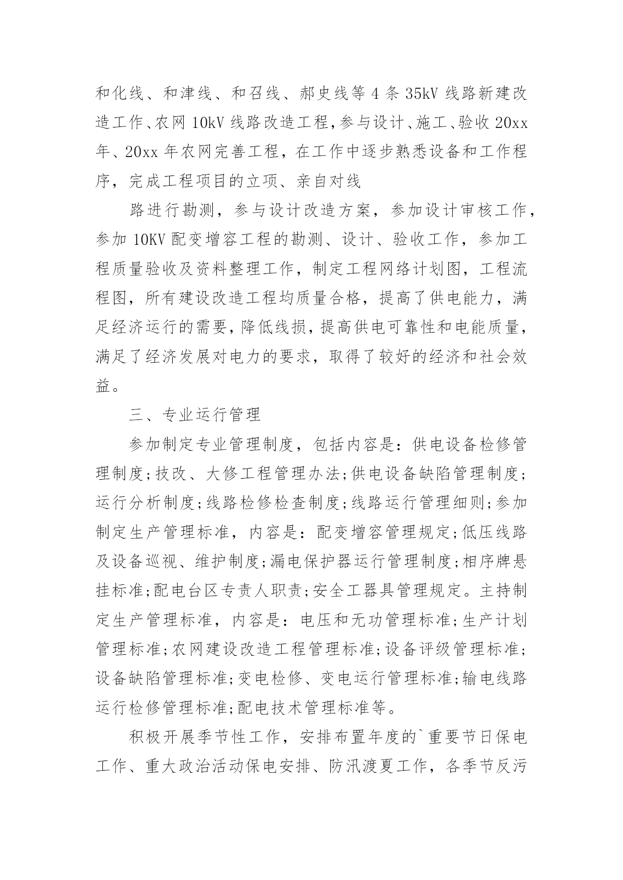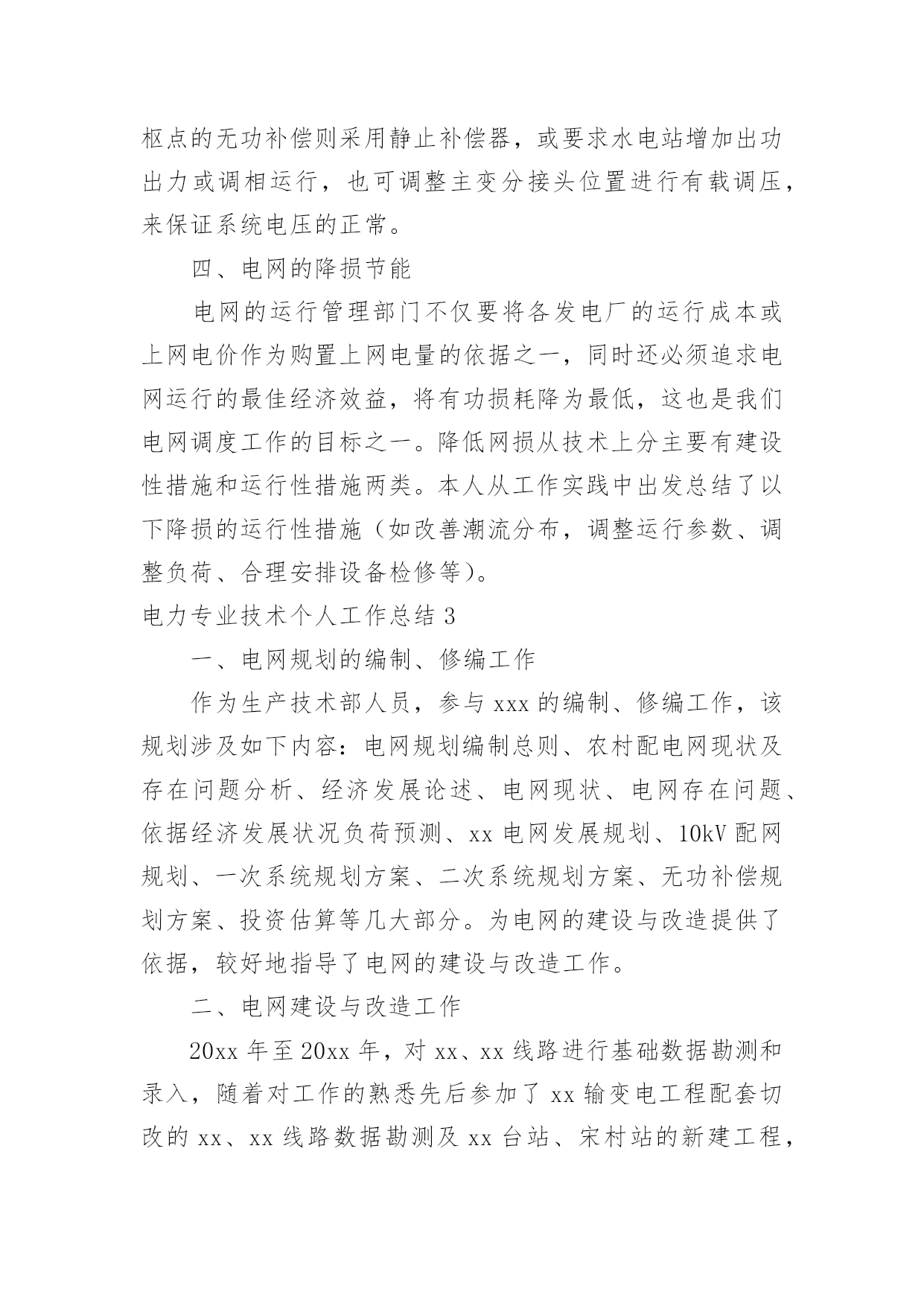 电力专业技术个人工作总结电力专业技术个人工作总结总结是在一段时间内对学习和工作生活等表现加以总结和概括的一种书面材料,它是增长才干的一种好办法,不妨让我们认真地完成总结吧。那么如何把总结写出新花样呢?以下是小编收集整理的电力专业技术个人工作总结,仅供参考,希望能够帮助到大家。电力专业技术个人工作总结1本人于20xx年毕业于xxxx大学,所学专业为xxxxxxxx方向。在xx年x月进入xx公司化机厂机动车间参加工作至今。在这六年中,我先后在xx车间的高压班、电工维修班从事生产一线工作。在各位领导和同事的支持和帮助下,自己的思想、工作、学习等各方面都取得了一定的成绩,个人综合素质也得到了一定的提高,下面就从专业技术角度对我这五年来的专业技术工作做一次全面总结:电力企业是一个特殊的行业,电工是是一个高危的工种,尤其是高压电,它需要职工有良好的自身能力和心理素质,因此我不断学习各种技能,努力学习和掌握电力系统运行方式及其特点,了解全厂的配电运行情况,同时能根据各类电气设备的需要,掌握相关的高压工程技术专业知识,能根据现场电气设备运行情况选择最佳运行方式及经济运行方法,根据实际运行经验,正确处理电气系统的设备故障以及系统突发性事故,独立进行主要设备的继电保护整定工作,不断加强自己的业务水平。一、学习生产运行专业知识,提高岗位劳动技能从xx年参加工作,领导为了让我尽快转变角色,熟悉工作环境,适应生产要求,我被分配至车间的高压班从事配电运行、高压试验、及变电检修等工作。工作伊始,我发现学校里学到的专业知识同生产实际有很大的不同和差距。为此我努力学习生产运行专业知识,努力提高自己的`岗位劳动技能,在短短的一年内,我主动吸收老师傅们的工作经验,虚心向他们请教工作中的技术问题,并通过自己的努力,迅速掌握了我厂线路和变电运行的生产程序及各种一、二次设备的规范、参数。我在查阅资料时发现旧的系统图已经无法找齐,和现有设备无法匹配,为了保证资料的准确性,提高设备维护保养的效率,我查阅资料,请教师傅,重新绘制了一套较完整的配电所系统图,为日后配电所得搬迁改造打下基础。二、从事技术管理工作xx年底,我被分配到车间技术组,主要负责全厂高压设备的运行维护以及电力系统机电保护的整定。此时,正值我厂配电所搬迁改造工作,由于就配电所设备较陈旧,资料不全,因此工作量非常大,在时间紧任务重的形势下,我边工作边学习,很快就步入了正规。首先跟随老师傅们勤下现场,并对照自己原有的各项知识使自己的理论知识和实践更好的结合,一方面放弃休息时间利用各种资料进行专业学习,有针对性地强化自己的专业知识储备;另一方面对自己不清楚的问题向老师傅求教,勤思、多做、苦学、牢记。利用较短的时间学会了各种线路的技术要求和参数,弄清楚新设备和新的监控系统的运行原理,和机动科的技术人员分析线路的运行情况,对于不合理的配置提出相应的合理化建议,给自己增添了许多工作信心,丰富了自己的实践经验。在的配电所搬迁改造工作中,我主要负责继电保护整定和校验以及协助高压班做好一次设备的试验。经过7个月的努力终于圆满完成了工作,最后我又编写了新监控系统培训教材,组织高压板的职工,对他们进行系统培训,快速提高他们对新系统新监控的掌握程度,保证全厂用电可靠。其次,我应用autocad绘制了新配电所的系统图,做到及时更新线路图纸资料,并将新旧图纸进行衔接、更新,使图纸资料与现场相符,与设备相符,进一步完善了线路资料,保证了数据真实性,我根据我厂电力运行的实际情况还编写了《变电运行操作作业指导书》、《输电线路巡回检查作业指导书》、绘制了各种相关台账,检修统计、机电保护动作分析等资料,为真正指导生产管理和逐步实现线路系统的状态维护奠定了基础,提高了工作效率和管理水平。三、努力学习新知识,用知识武装自己在完成好本职工作的同时,我还不断学习新知识,努力丰富自己。xx年和xx年底我被厂里委派参加了中国设备管理中心举办的继电保护及变配电自动化应用技术培训班,并以优异的成绩取得了证书。去年10月份,我撰写的论文《微机防误闭锁方法的改进与建议》通过了公司的论文答辩,取得了工程师资格,今年年初我开始着手复习基础知识以及相关专业知识并在9月中旬参加了注册电气工程师考试,电力技术日新月异,为了更好的完成这项工作,我不断学习新的知识,了解新的系统,在按时圆满完成各项工作的同时也充实了自己。总的说来,在这几年来的电力管理工作中,自已利用所学的专业技术知识应用到生产实践中去,并取得了一些成效,具备了一定的技术工作能力,但是仍然存在着许多不足,还有待提高。在今后的工作中,自已要加强学习、克服缺点,力争自己的专业技术水平能够不断提高。更能适应现代化电力建设的需求。以上就是我从事生产运行工作五年多以来的专业小结。总结是为了去弊存精,一方面通过技术总结,在肯