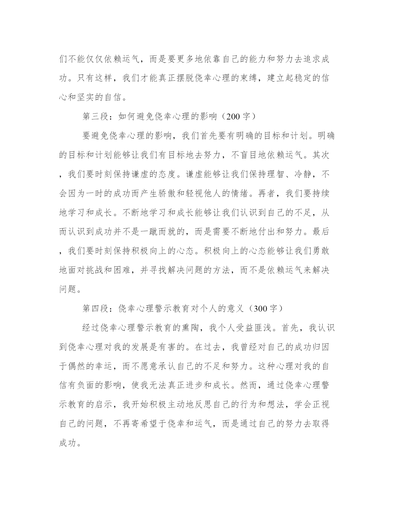 最优侥幸心理的心得体会(汇总13篇)在学习和工作中,总结是一种重要的反思和成长的方式。在写心得体会时有哪些常见的错误和误区需要避免?以下是小编为大家收集的心得体会范文,希望对大家有所启发。侥幸心理的心得体会篇一侥幸心理是指一种一种相信自己在不良事件中具有逃脱困境的能力的心理。那么,当询问别人的侥幸心理时,这会给我们带来哪些收获呢?在本篇文章中,我将分享我在了解一位朋友的侥幸心理时的体会。第二段:询问侥幸心理一天晚上,我和我的好朋友聊天时,我们谈到了一个车祸的新闻。我询问朋友如果她在这种情况下收到了告知,她的反应是什么。她回答说:“我不会害怕,因为我相信我的侥幸会帮助我幸存。”第三段:探究侥幸心理我好奇地问她,为什么你会相信自己会幸存下来?她解释说:“我感觉自己有个守护神,能保护我免受不良事件的侵害。”在听完朋友的描述后,我深入思考侥幸心理的本质。我们的生活中有很多不可预见的情况,我们无法提前知道什么会发生。如果我们有可能在之前发现或逃脱,我们可以看到自己的努力。然而,如果我们不确定会发生什么,我们可能会感到无助和害怕。对于我们无法控制的情况,侥幸心理成为我们的逃避机制。第四段:面对真正的风险然而,我们应该看到事情的两面。真正的风险不应该仅仅建立在侥幸心理的基础上。过去的生活经历或者好运并不能保证我们在面对真正的危险时安全。我们需要接受现实并采取实际行动来减轻潜在的风险。只有这样,我们才能真正保护自己和他人的安全。第五段:总结在了解我的好朋友的侥幸心理时,我意识到人们在面对风险时可能会产生从未想过的想法和反应。我们需要在了解风险和采取行动之间找到平衡点。我们需要认识到真正的风险,并采取措施来减轻可能的后果。正如阿兰德波顿所说:“安全全靠侥幸是不可靠的,安全全靠努力才是可靠的。”侥幸心理的心得体会篇二第一段:引言(150字)侥幸心理是人们在面对风险和危险时产生的一种不负责任的心态。在生活中,我们时常听到有人侥幸逃过一劫,或者抱着侥幸心理做出了错误的选择,最终付出了沉重的代价。为了避免侥幸心理对我们的决策和行为带来负面影响,近年来,社会对于侥幸心理的警惕和教育也越来越重视。在参加侥幸心理警示教育活动后,我深感收获良多,得到了许多有益的启示和体悟。第二段:认识侥幸心理的危害(250字)侥幸心理是现代社会一个普遍存在的心态。人们容易低估风险,倾向于相信自己可以在困难和危险面前充当起“侥幸儿”的角色。然而,不负责任的侥幸心理会带来严重的后果。在工作中,有人因为过分依赖侥幸心理而懈怠工作,最终造成业绩的下滑;在学习中,有人因为侥幸心理而松懈对知识的学习,最终导致考试不理想;在生活中,有人因为侥幸心理而不重视健康,最终患上严重疾病。侥幸心理不仅会导致自身的损失,还会对他人和社会产生负面影响。第三段:认识侥幸心理的成因(250字)为了更好地解决侥幸心理问题,我们需要从根源上找到其成因。有几个主要因素导致了人们容易产生侥幸心理。首先,缺乏风险意识是侥幸心理形成的主要原因。人们往往只看到好的一面,忽略了风险的存在。其次,成功的经验也会导致侥幸心理的产生。成功的一次经历会给人带来自满和自信,从而产生侥幸心理。再次,外界环境的压力和变化也是侥幸心理的诱因。当人们面对复杂和艰难的环境时,很容易产生侥幸心理,希望通过运气来解决问题。第四段:克服侥幸心理的方法(300字)尽管侥幸心理是一个普遍存在的心态,但是我们可以通过一些方法来克服它。首先,我们应该加强风险意识,时刻警惕可能的风险和危险,不盲目相信运气。其次,我们要树立正确的人生观和价值观。只有把握好自己的人生方向,明确自己的目标,才能避免侥幸心理的诱惑。再次,我们应该培养良好的学习习惯和工作态度。通过勤奋学习和努力工作,我们能够树立起一种踏实认真的心态,消除侥幸心理的产生。最后,我们需要改变自己的心态,接受失败和挫折。成功并不总是与侥幸相关,只有接受失败,我们才能从中吸取教训,取得更大的成长。第五段:结语(250字)侥幸心理是现代社会一个普遍存在的心态,但它会给个人和社会带来不可忽视的负面影响。通过参加侥幸心理警示教育,我们能够更好地认识到侥幸心理的危害,并采取相关的措施来克服它。将正确的人生观和价值观融入到自己的生活中,加强风险意识,培养良好的学习和工作习惯,接受失败和挫折,这些都是克服侥幸心理的有效方法。只有保持谨慎和付出努力,我们才能走出侥幸心理的阴影,朝着自己的目标前进,取得更好的成就。在今后的生活中,我们应时刻牢记克服侥幸心理的重要性,保持积极向上的心态,以实际行动为自己的人生保驾护航。侥幸心理的心得体会篇三军人侥幸心理是指在军人执行任务或训练时,由于各种原因,产生的侥幸心理和侥幸心态。这种心理和心态的出现,在很大程度上会影响到军人的工作效率和