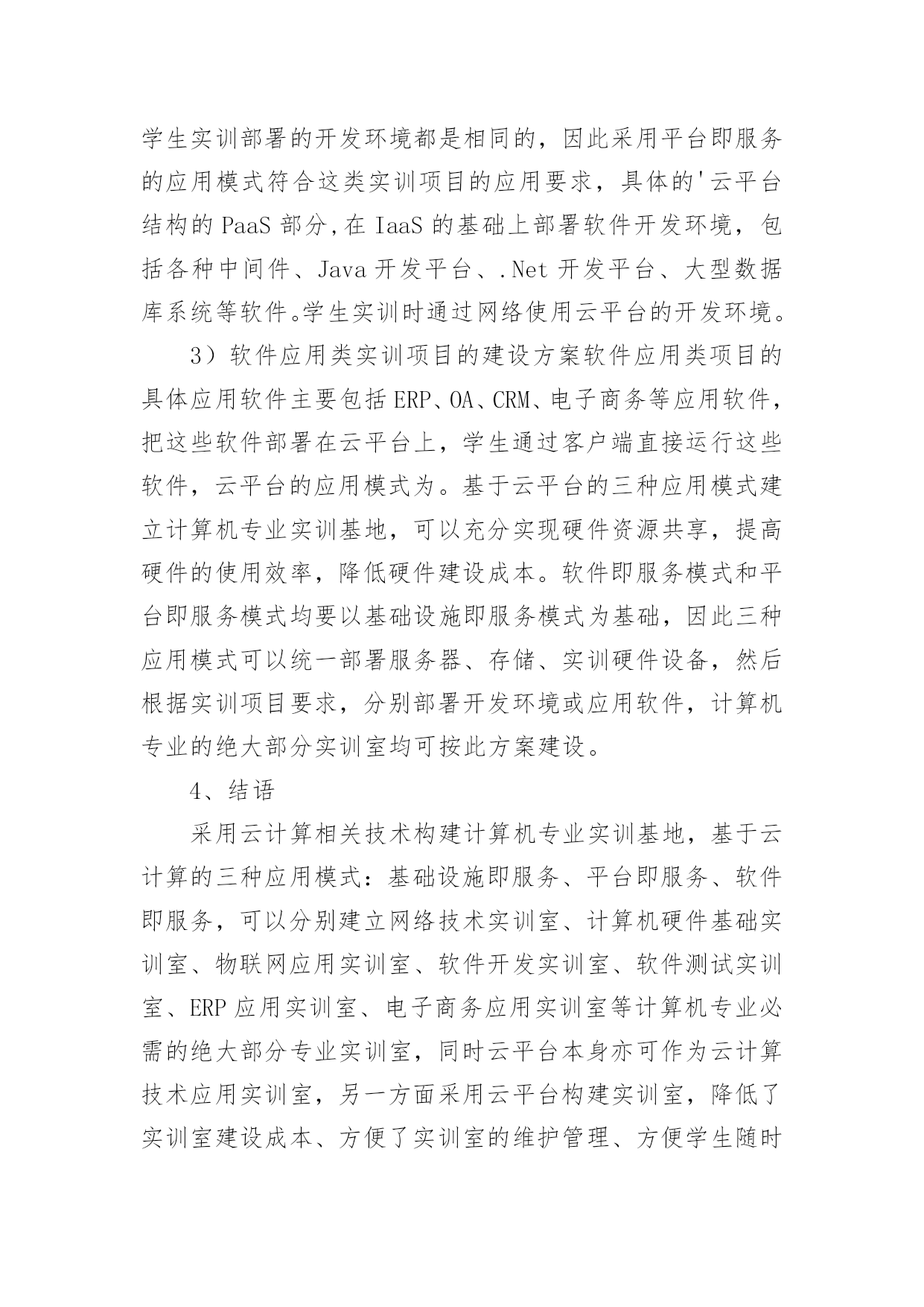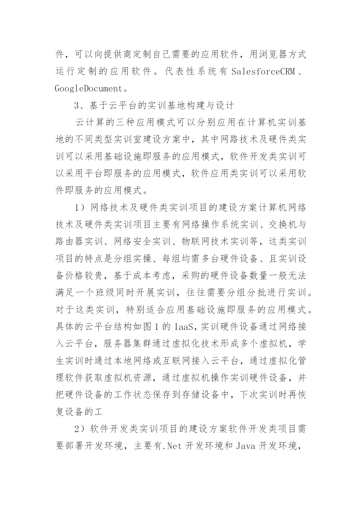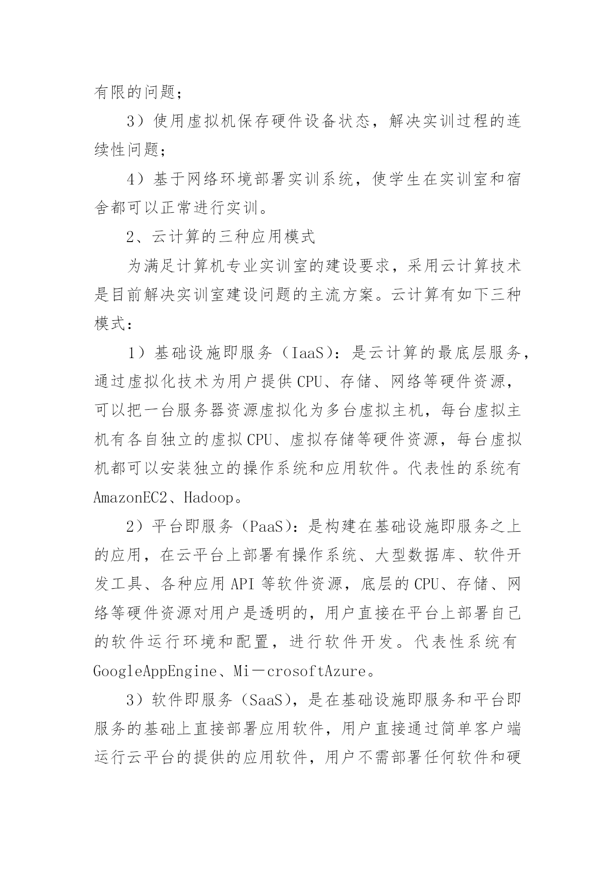 实训基地建设下计算机专业的论文实训基地建设下计算机专业的论文1、计算机专业实训基地建设的目标与要求计算机专业的实训项目主要包括软件开发、软件测试、网络管理、网络安全、计算机系统管理与维护、数据库系统管理、信息系统应用、物联网技术、云计算技术、图形图像处理、音视频编辑、三维动画与三维模型等,可以把这些实训项目分为四类,即软件开发、软件应用、网络系统管理、硬件应用。在以往的计算机专业实训室建设中,主要存在以下问题:1)电脑使用年限长,设备老化、性能落后;2)不同专业实训室的软硬件环境不同,导致机房维护管理困难,更改软件工作量大;3)硬件设备资源有限,难以满足一个班级同时进行实训,实训效率低;4)由于不同专业、不同班级共享同一个实训室,导致实训结果对应的设备状态不能保存,使实训过程缺少连续性;5)实训场地只能在实训室,不能方便学生随时随地开展实训项目。针对计算机专业实训室的实训特点及使用过程存在的问题,我们提出如下要求:1)实训环境部署在服务器端,降低对客户端的软硬件资源要求;2)采用虚拟化技术实现硬件资源共享,解决硬件资源有限的问题;3)使用虚拟机保存硬件设备状态,解决实训过程的连续性问题;4)基于网络环境部署实训系统,使学生在实训室和宿舍都可以正常进行实训。2、云计算的三种应用模式为满足计算机专业实训室的建设要求,采用云计算技术是目前解决实训室建设问题的主流方案。云计算有如下三种模式:1)基础设施即服务(IaaS):是云计算的最底层服务,通过虚拟化技术为用户提供CPU、存储、网络等硬件资源,可以把一台服务器资源虚拟化为多台虚拟主机,每台虚拟主机有各自独立的虚拟CPU、虚拟存储等硬件资源,每台虚拟机都可以安装独立的操作系统和应用软件。代表性的系统有AmazonEC2、Hadoop。2)平台即服务(PaaS):是构建在基础设施即服务之上的应用,在云平台上部署有操作系统、大型数据库、软件开发工具、各种应用API等软件资源,底层的CPU、存储、网络等硬件资源对用户是透明的,用户直接在平台上部署自己的软件运行环境和配置,进行软件开发。代表性系统有GoogleAppEngine、Mi-crosoftAzure。3)软件即服务(SaaS),是在基础设施即服务和平台即服务的基础上直接部署应用软件,用户直接通过简单客户端运行云平台的提供的应用软件,用户不需部署任何软件和硬件,可以向提供商定制自己需要的应用软件,用浏览器方式运行定制的应用软件。代表性系统有SalesforceCRM、GoogleDocument。3、基于云平台的实训基地构建与设计云计算的三种应用模式可以分别应用在计算机实训基地的不同类型实训室建设方案中,其中网路技术及硬件类实训可以采用基础设施即服务的应用模式,软件开发类实训可以采用平台即服务的应用模式,软件应用类实训可以采用软件即服务的应用模式。1)网络技术及硬件类实训项目的建设方案计算机网络技术及硬件类实训项目主要有网络操作系统实训、交换机与路由器实训、网络安全实训、物联网技术实训等,这类实训项目的特点是分组实操、每组均需多台硬件设备、且实训设备价格较贵,基于成本考虑,采购的硬件设备数量一般无法满足一个班级同时开展实训,往往需要分组分批进行实训。对于这类实训,特别适合应用基础设施即服务的应用模式。具体的云平台结构如图1的IaaS,实训硬件设备通过网络接入云平台,服务器集群通过虚拟化技术形成多个虚拟机,学生实训时通过本地网络或互联网接入云平台,通过虚拟化管理软件获取虚拟机资源,通过虚拟机操作实训硬件设备,并把硬件设备的工作状态保存到存储设备中,下次实训时再恢复设备的工2)软件开发类实训项目的建设方案软件开发类项目需要部署开发环境,主要有.Net开发环境和Java开发环境,学生实训部署的开发环境都是相同的,因此采用平台即服务的应用模式符合这类实训项目的应用要求,具体的'云平台结构的PaaS部分,在IaaS的基础上部署软件开发环境,包括各种中间件、Java开发平台、.Net开发平台、大型数据库系统等软件。学生实训时通过网络使用云平台的开发环境。3)软件应用类实训项目的建设方案软件应用类项目的具体应用软件主要包括ERP、OA、CRM、电子商务等应用软件,把这些软件部署在云平台上,学生通过客户端直接运行这些软件,云平台的应用模式为。基于云平台的三种应用模式建立计算机专业实训基地,可以充分实现硬件资源共享,提高硬件的使用效率,降低硬件建设成本。软件即服务模式和平台即服务模式均要以基础设施即服务模式为基础,因此三种应用模式可以统一部署服务器、存储、实训硬件设备,然后根据实训项目要求,分别部署开发环境或应用软件,计算机专业的绝大部分实训室均可按此方案建设。4、结语采用云计算相关技术构建计算机专业实训基地,基于云计算的三种应用模式:基础设施即