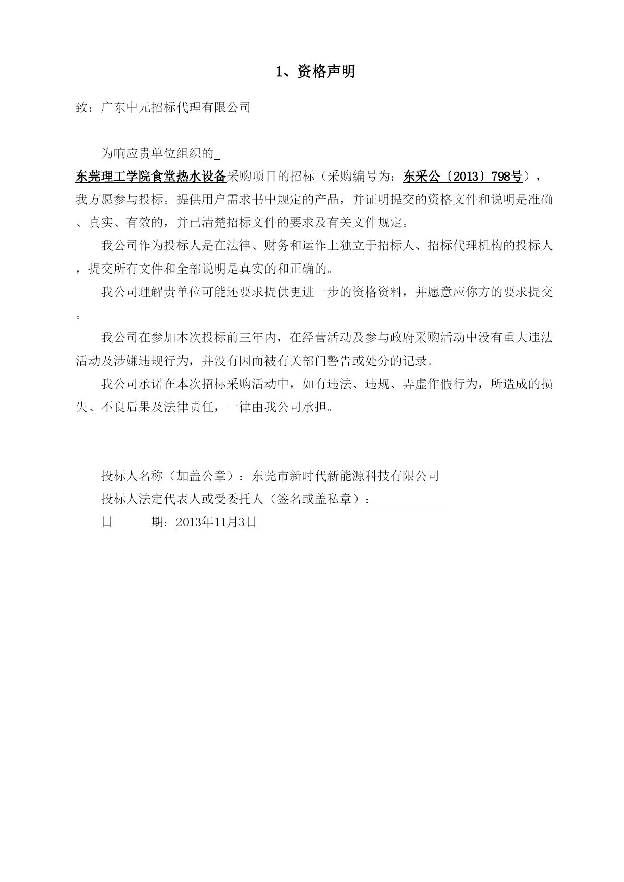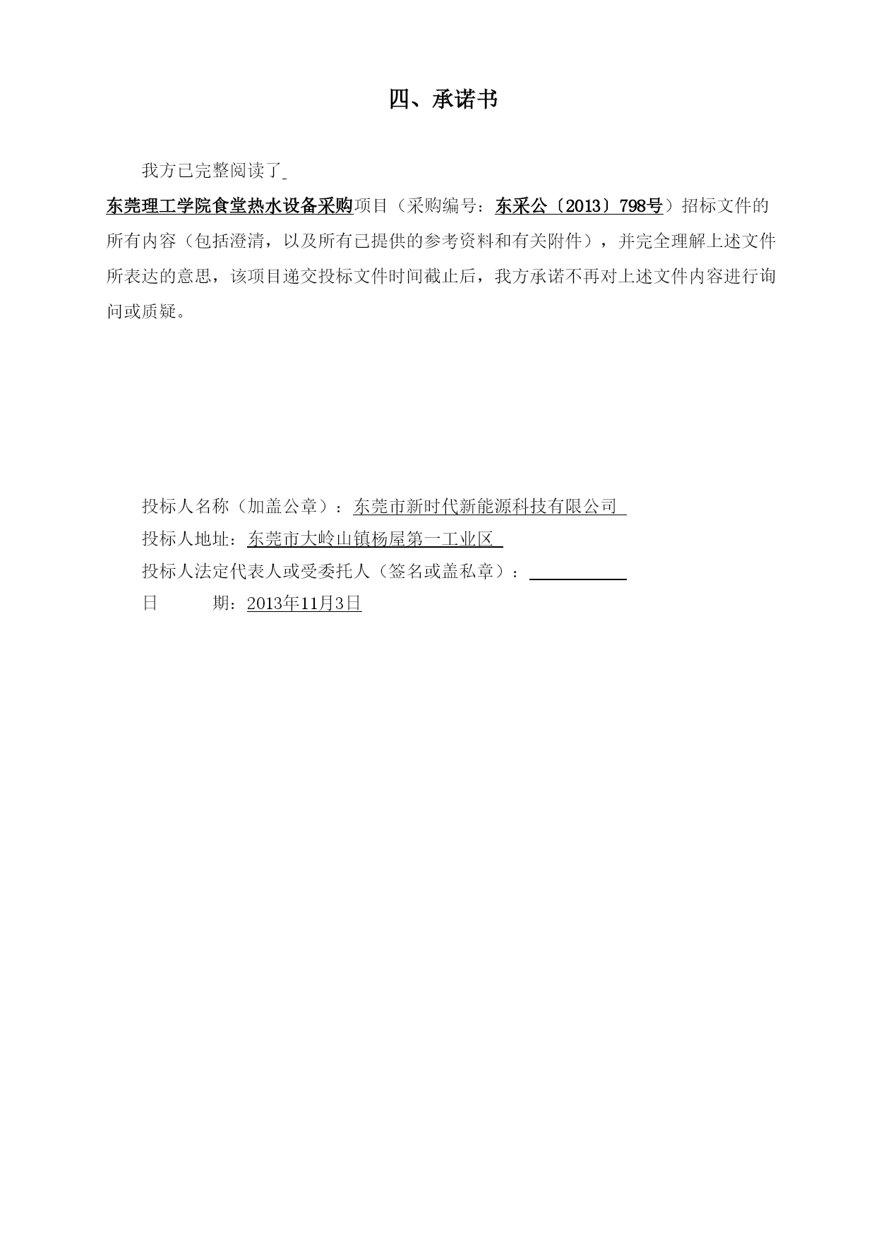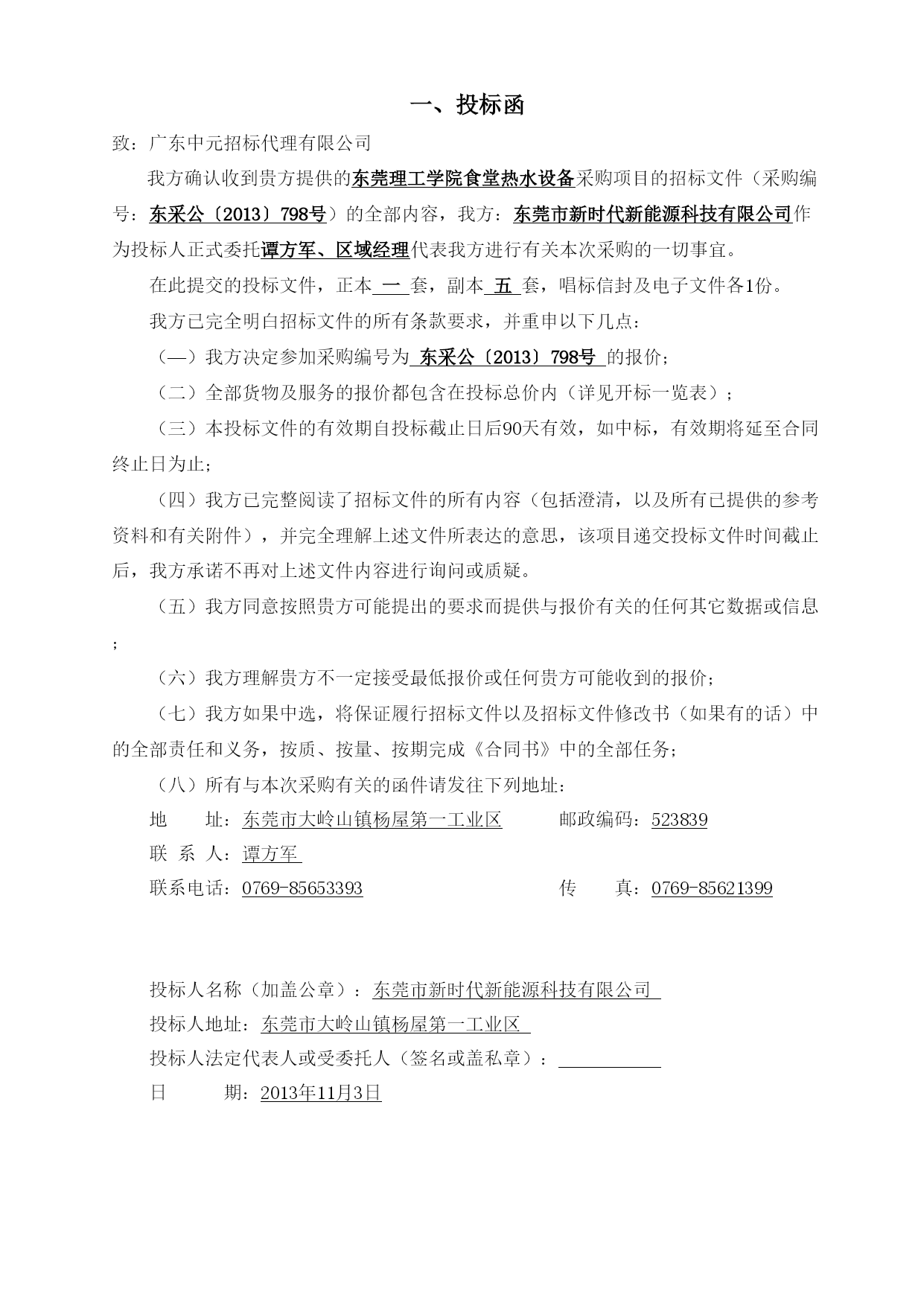 正本项目名称:东莞理工学院食堂热水设备采购项目采标编号:东采公〔2013〕798号投标文件招标人:东莞理工学院投标人:东莞市新时代新能源科技有限公司投标人地址:东莞市大岭山镇杨屋第一工业区二○一三年十一月目录一、投标函---------------------------------------------------------------3二、开标一览表-----------------------------------------------------------4三、报价明细表-----------------------------------------------------------5四、承诺书---------------------------------------------------------------7五、投标人资格证明文件---------------------------------------------------81、投标人资格声明-----------------------------------------------------92、投标人基本情况-----------------------------------------------------103、营业执照、税务登记证和组织机构代码证、法定代表人证明书及身份证复印件、法人代表授权委托书及身份证复印件---------------------------123.1、营业执照------------------------------------------------------123.2、税务登记证----------------------------------------------------133.3、组织机构代码证------------------------------------------------143.4、法定代表人证明书及身份证复印件--------------------------------153.5、法人代表授权委托书及身份证复印件------------------------------164、公司简介、获奖情况和招标文件中要求的有关资质证书-------------------17商标注册证---------------------------------------------------------18ISO9001:2008质量保证体系的认证书----------------------------------19ISO14001系列质量管理体系认证证书-----------------------------------20GB/T28001职业健康安全管理体系认证证书------------------------------21节能协会会员证书---------------------------------------------------22守合同重信用企业---------------------------------------------------23财务状况-----------------------------------------------------------245、业绩合同和验收报告等证明材料---------------------------------------676、招标文件要求的其他资格证明材料-------------------------------------84银行开户许可证-----------------------------------------------------847、投标人认为需要提交的其他资料---------------------------------------857.1、投标人技术力量------------------------------------------------857.2、投标人荣誉----------------------------------------------------877.3、产品专利------------------------------------------------------109六、售后服务方案---------------------------------------------------------143服务机构工商证明-------------------------------------------