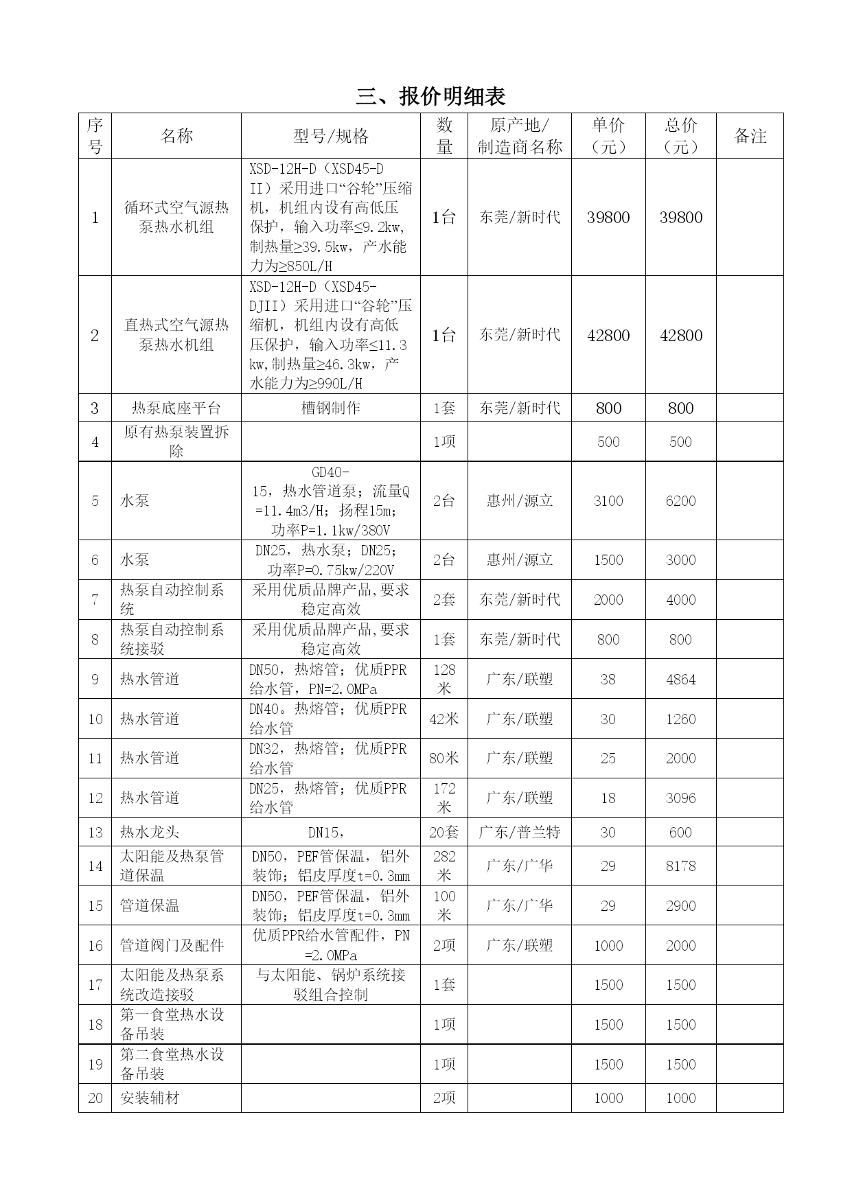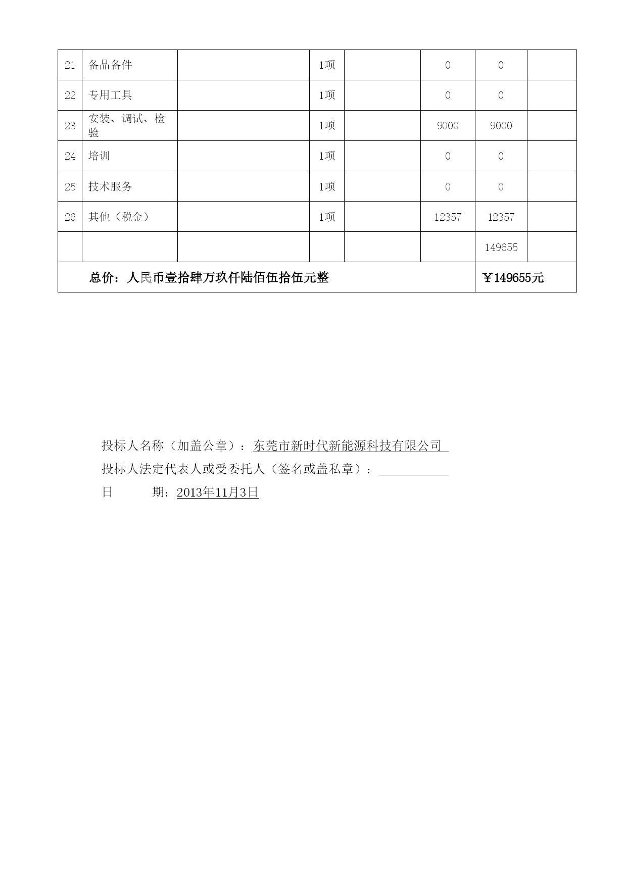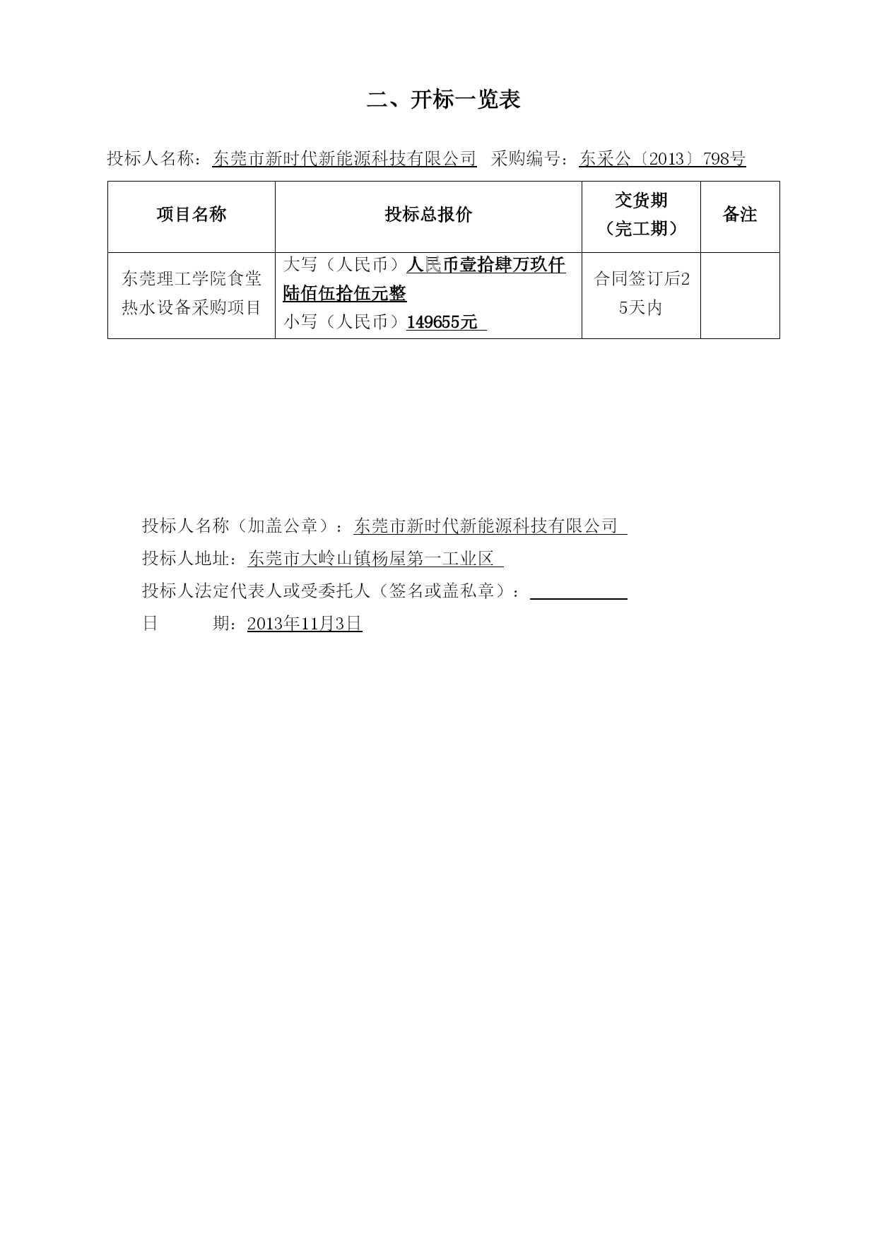 正本项目名称:东莞理工学院食堂热水设备采购项目采标编号:东采公〔2013〕798号投标文件招标人:东莞理工学院投标人:东莞市新时代新能源科技有限公司投标人地址:东莞市大岭山镇杨屋第一工业区二○一三年十一月目录一、投标函---------------------------------------------------------------3二、开标一览表-----------------------------------------------------------4三、报价明细表-----------------------------------------------------------5四、承诺书---------------------------------------------------------------7五、投标人资格证明文件---------------------------------------------------81、投标人资格声明-----------------------------------------------------92、投标人基本情况-----------------------------------------------------103、营业执照、税务登记证和组织机构代码证、法定代表人证明书及身份证复印件、法人代表授权委托书及身份证复印件---------------------------123.1、营业执照------------------------------------------------------123.2、税务登记证----------------------------------------------------133.3、组织机构代码证------------------------------------------------143.4、法定代表人证明书及身份证复印件--------------------------------153.5、法人代表授权委托书及身份证复印件------------------------------164、公司简介、获奖情况和招标文件中要求的有关资质证书-------------------17商标注册证---------------------------------------------------------18ISO9001:2008质量保证体系的认证书----------------------------------19ISO14001系列质量管理体系认证证书-----------------------------------20GB/T28001职业健康安全管理体系认证证书------------------------------21节能协会会员证书---------------------------------------------------22守合同重信用企业---------------------------------------------------23财务状况-----------------------------------------------------------245、业绩合同和验收报告等证明材料---------------------------------------676、招标文件要求的其他资格证明材料-------------------------------------84银行开户许可证-----------------------------------------------------847、投标人认为需要提交的其他资料---------------------------------------857.1、投标人技术力量------------------------------------------------857.2、投标人荣誉----------------------------------------------------877.3、产品专利------------------------------------------------------109六、售后服务方案---------------------------------------------------------143服务机构工商证明-------------------------------------------