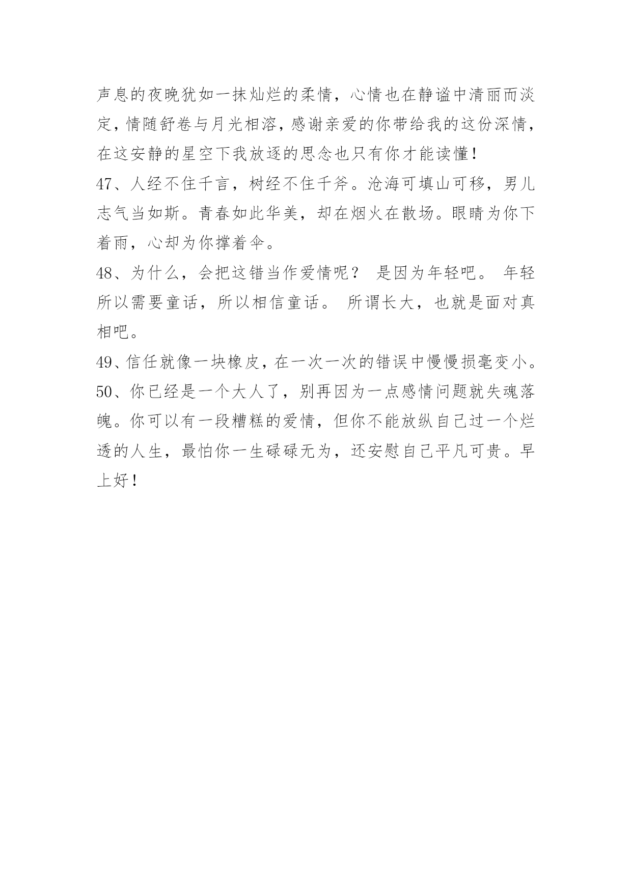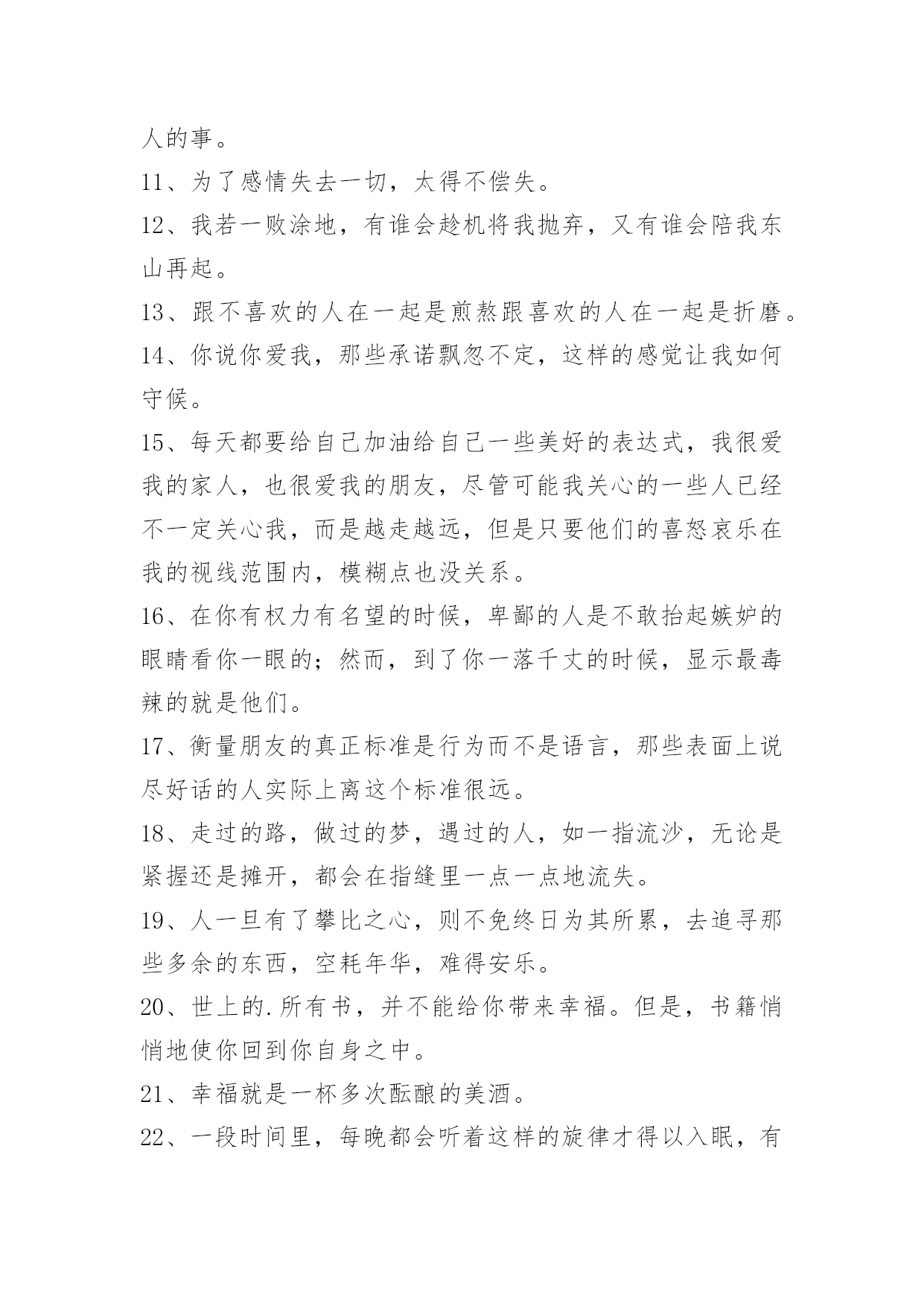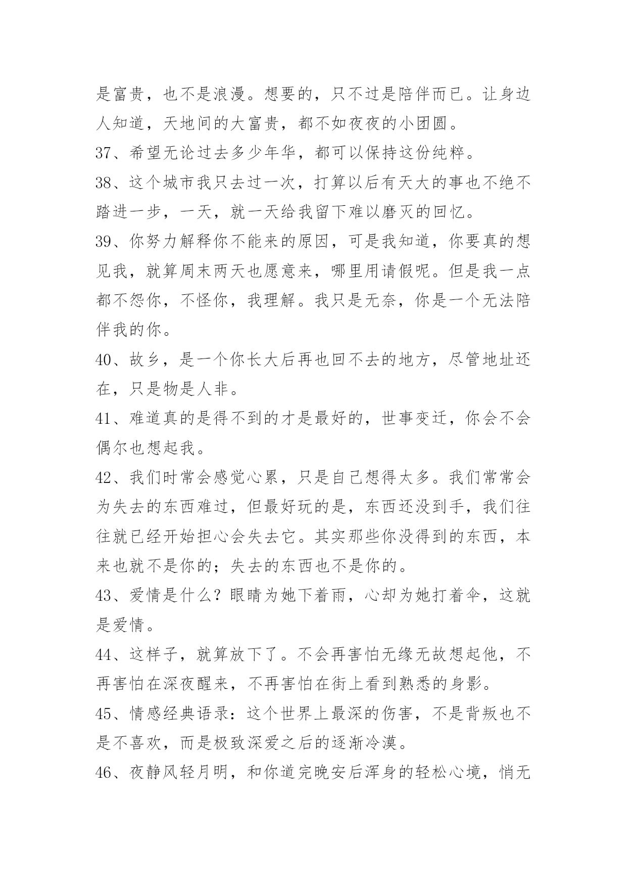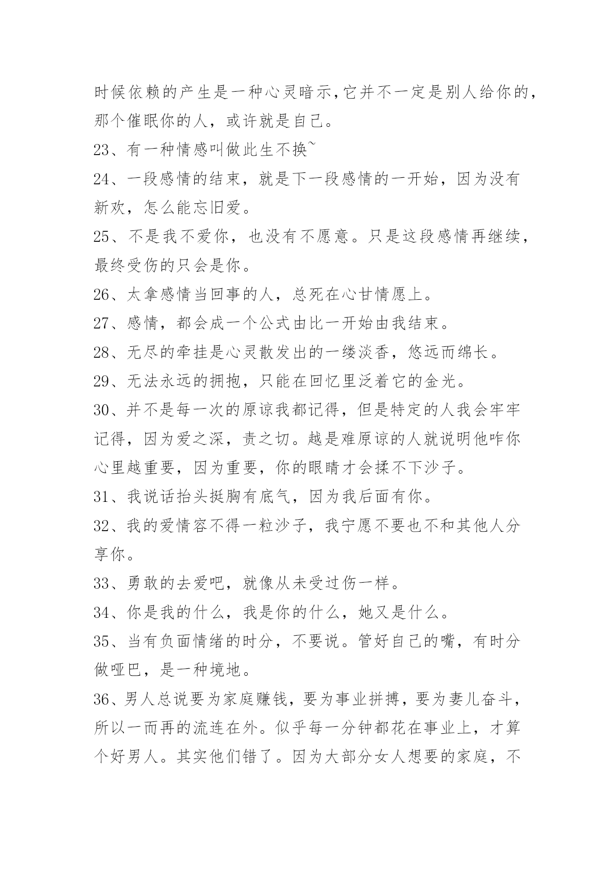 情感语录50条【热门】情感语录大合集50条在回忆里原件了一个跟你相似的身影,我确信那不是你。下面是小编为大家推荐的情感语录50条,希望能够帮助到大家。1、有时候,我并不是不想和你说话,只是在等你先开口。2、你曾经所说的永远就跟一瞬间一样,可我却相信了。3、记得曾经有人问我最喜欢哪颗星,举头望天一脸茫然。4、梦见了你那么多次,却也不敢完整的给你讲一个故事,是你让我终于明白了这句话,喜欢就会放肆,而爱就是克制。5、等你盼你很苦很累,想你爱你此心不变。6、贪心就是拿一颗扣子,让人家在上面缝一件衣服。7、真正的爱情,要懂得珍惜。一辈子只爱一个人,并不丢人。没有谁和谁是天生就注定在一起的。一辈子其实不长。能遇心爱的人,是多么幸运的事。为何不紧握着他的手呢。心里明明知道,除了他外还会有更优秀的人出现,可是一个人不能这么贪心的。一颗心需要另一颗心坦诚相待,这样才可以幸福。8、有时候,有时候,我会相信一切有尽头。9、我总是在猜测你到底爱不爱我,总是在猜测你什么时候会不会放弃我,这样真的好累。10、原来你已不爱我了,与我在一起,不过是怕我做出更伤人的事。11、为了感情失去一切,太得不偿失。12、我若一败涂地,有谁会趁机将我抛弃,又有谁会陪我东山再起。13、跟不喜欢的人在一起是煎熬跟喜欢的人在一起是折磨。14、你说你爱我,那些承诺飘忽不定,这样的感觉让我如何守候。15、每天都要给自己加油给自己一些美好的表达式,我很爱我的家人,也很爱我的朋友,尽管可能我关心的一些人已经不一定关心我,而是越走越远,但是只要他们的喜怒哀乐在我的视线范围内,模糊点也没关系。16、在你有权力有名望的时候,卑鄙的人是不敢抬起嫉妒的眼睛看你一眼的;然而,到了你一落千丈的时候,显示最毒辣的就是他们。17、衡量朋友的真正标准是行为而不是语言,那些表面上说尽好话的人实际上离这个标准很远。18、走过的路,做过的梦,遇过的人,如一指流沙,无论是紧握还是摊开,都会在指缝里一点一点地流失。19、人一旦有了攀比之心,则不免终日为其所累,去追寻那些多余的东西,空耗年华,难得安乐。20、世上的.所有书,并不能给你带来幸福。但是,书籍悄悄地使你回到你自身之中。21、幸福就是一杯多次酝酿的美酒。22、一段时间里,每晚都会听着这样的旋律才得以入眠,有时候依赖的产生是一种心灵暗示,它并不一定是别人给你的,那个催眠你的人,或许就是自己。23、有一种情感叫做此生不换~24、一段感情的结束,就是下一段感情的一开始,因为没有新欢,怎么能忘旧爱。25、不是我不爱你,也没有不愿意。只是这段感情再继续,最终受伤的只会是你。26、太拿感情当回事的人,总死在心甘情愿上。27、感情,都会成一个公式由比一开始由我结束。28、无尽的牵挂是心灵散发出的一缕淡香,悠远而绵长。29、无法永远的拥抱,只能在回忆里泛着它的金光。30、并不是每一次的原谅我都记得,但是特定的人我会牢牢记得,因为爱之深,责之切。越是难原谅的人就说明他咋你心里越重要,因为重要,你的眼睛才会揉不下沙子。31、我说话抬头挺胸有底气,因为我后面有你。32、我的爱情容不得一粒沙子,我宁愿不要也不和其他人分享你。33、勇敢的去爱吧,就像从未受过伤一样。34、你是我的什么,我是你的什么,她又是什么。35、当有负面情绪的时分,不要说。管好自己的嘴,有时分做哑巴,是一种境地。36、男人总说要为家庭赚钱,要为事业拼搏,要为妻儿奋斗,所以一而再的流连在外。似乎每一分钟都花在事业上,才算个好男人。其实他们错了。因为大部分女人想要的家庭,不是富贵,也不是浪漫。想要的,只不过是陪伴而已。让身边人知道,天地间的大富贵,都不如夜夜的小团圆。37、希望无论过去多少年华,都可以保持这份纯粹。38、这个城市我只去过一次,打算以后有天大的事也不绝不踏进一步,一天,就一天给我留下难以磨灭的回忆。39、你努力解释你不能来的原因,可是我知道,你要真的想见我,就算周末两天也愿意来,哪里用请假呢。但是我一点都不怨你,不怪你,我理解。我只是无奈,你是一个无法陪伴我的你。40、故乡,是一个你长大后再也回不去的地方,尽管地址还在,只是物是人非。41、难道真的是得不到的才是最好的,世事变迁,你会不会偶尔也想起我。42、我们时常会感觉心累,只是自己想得太多。我们常常会为失去的东西难过,但最好玩的是,东西还没到手,我们往往就已经开始担心会失去它。其实那些你没得到的东西,本来也就不是你的;失去的东西也不是你的。43、爱情是什么?眼睛为她下着雨,心却为她打着伞,这就是爱情。44、这样子,就算放下了。不会再害怕无缘无故想起他,不再害怕在深夜醒来,不再害怕在街上看到熟悉的身影。45、情感经典语录:这个世界上最深的伤害,不是背叛也不是不喜欢,而是极致深爱之后的逐渐冷漠。46、夜静风轻月明,和你道完晚安后浑身的轻松心境,悄无声