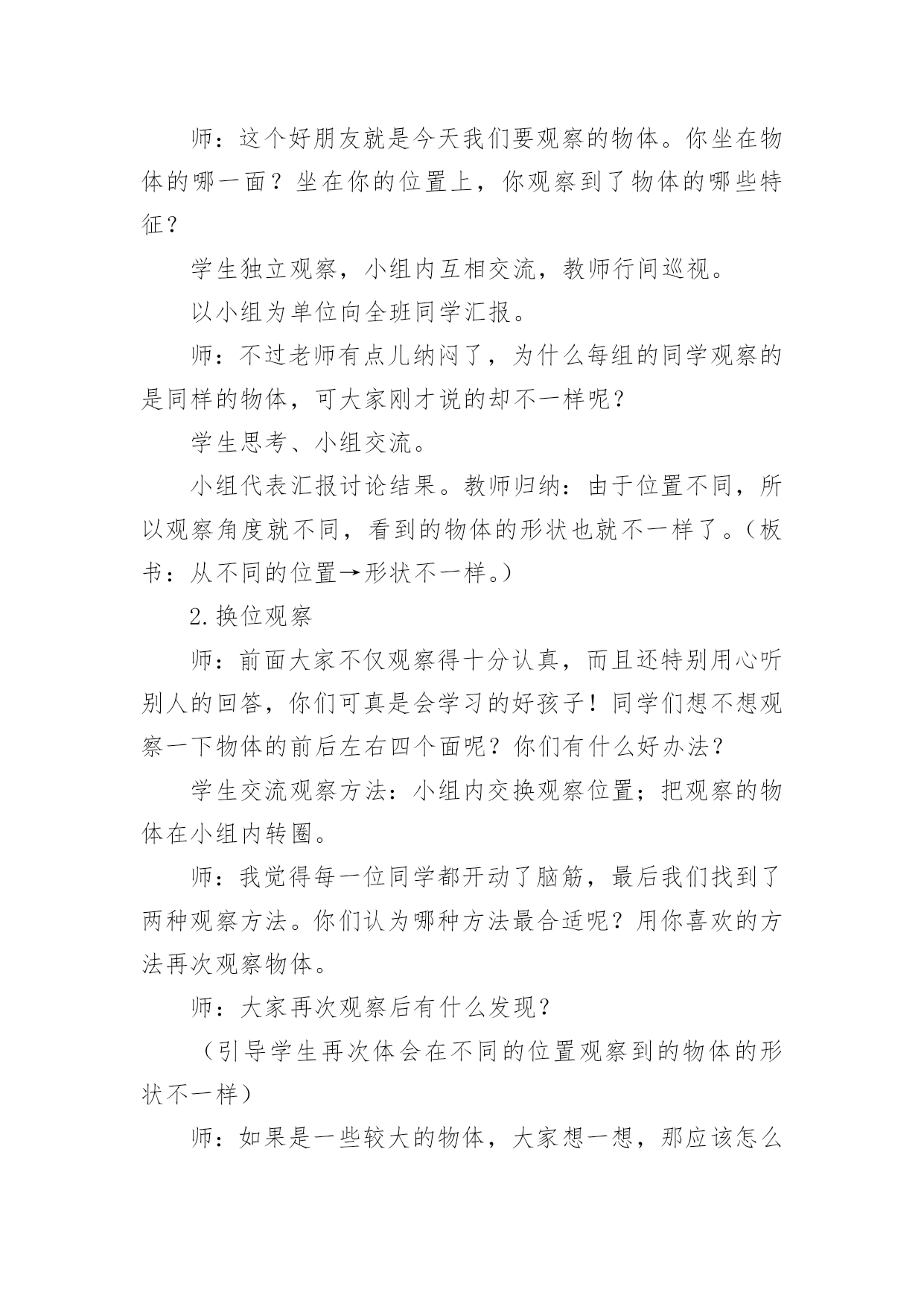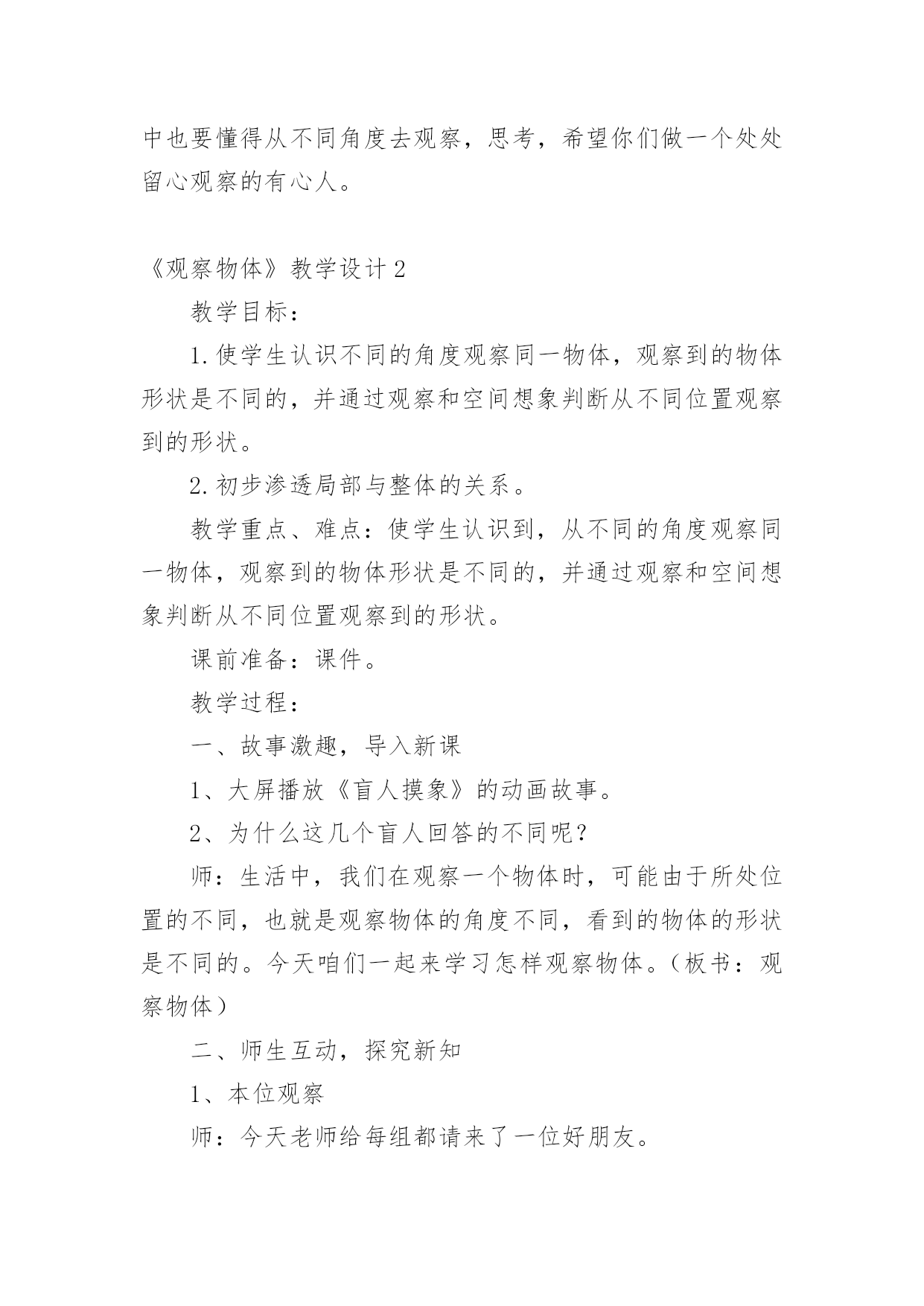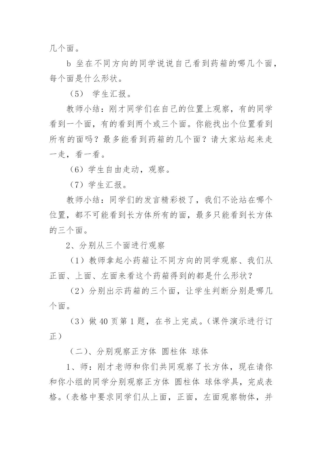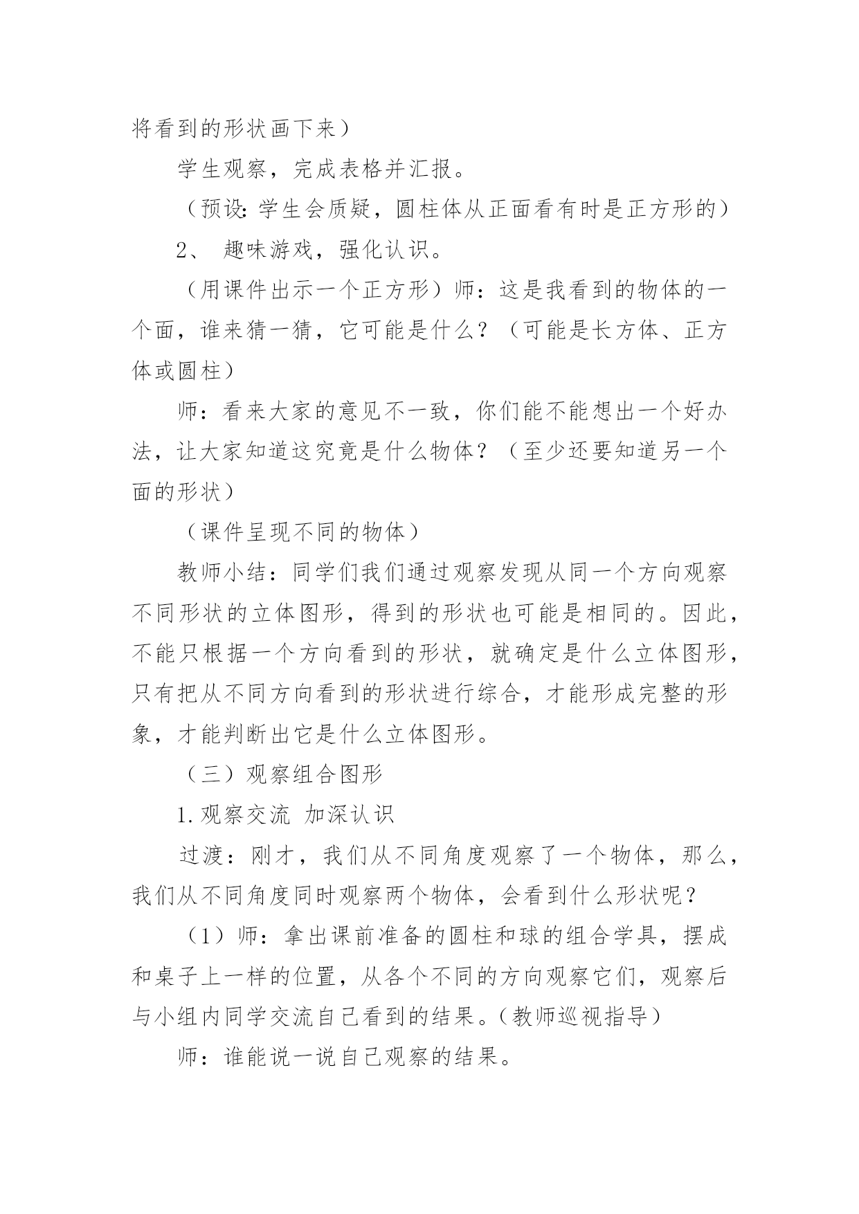 《观察物体》教学设计作为一名老师,通常需要用到教学设计来辅助教学,教学设计是一个系统设计并实现学习目标的过程,它遵循学习效果最优的原则吗,是课件开发质量高低的关键所在。那么优秀的教学设计是什么样的呢?以下是小编精心整理的《观察物体》教学设计,欢迎阅读与收藏。《观察物体》教学设计1教学内容:人教版义务教育课程标准实验教科书五年级数学上册第三单元38页---40页。教具、学具准备:长方体药箱、圆柱、球、长方体实物若干、圆柱和球的组合学具。教学目标:1、使学生经历观察的过程,让学生认识到从不同的位置观察物体,所看到的形状是不同的。2、通过观察实物,能正确辨认从正面、侧面、上面观察到的两个物体或一组立体图形的位置关系和形状。3、培养学生的空间想象力和思维能力。教学重点:能正确辨认从正面、侧面、上面观察到的两个物体或一组立体图形的位置关系和形状。教学难点:使学生明确从同一方向观察不同形状的立体图形,得到的形状也可能是相同的。教学流程:一、古诗导入激发情趣1、师:同学们,你们还记得宋代诗人苏轼的那首《题西林壁》吗?让我们共同来朗诵这首诗。(课件出示诗句和庐山不同景色)师:一座庐山,为什么诗人看到的却是“横看成岭侧成峰,远近高低各不同”的景色呢?2、其实,在我们的日常生活中也需要这样,从不同的位置观察一个物体,这节课我们就一起来观察物体。(板书:观察物体)二、观察物体探究新知(一)观察长方体1、整体观察(出示长方体小药箱)(1)师:同学们,我们先来观察这个长方体的药箱,谁来说说这个药箱有几个面?都是哪几个面?每个面的形状是什么样的?(2)生回答,师强调看到的面,是相对观察者说的。(3)师:请同学们按照活动要求观察这个小药箱请(课件出示观察要求)(4)学生观察。a同学在自己的座位上观察药箱,说一说自己看到了哪几个面。b坐在不同方向的同学说说自己看到药箱的哪几个面,每个面是什么形状。(5)学生汇报。教师小结:刚才同学们在自己的位置上观察,有的同学看到一个面,有的看到两个或三个面。你能找出个位置看到所有的面吗?最多能看到药箱的几个面?请大家站起来走一走,看一看。(6)学生自由走动,观察。(7)学生汇报。教师小结:同学们的发言精彩极了,我们不论站在哪个位置,都不可能看到长方体所有的面,最多只能看到长方体的三个面。2、分别从三个面进行观察(1)教师拿起小药箱让不同方向的同学观察、我们从正面、上面、左面来看这个药箱得到的都是什么形状?(2)分别出示药箱的三个面,让学生判断分别是哪几个面。(3)做40页第1题,在书上完成。(课件演示进行订正)(二)、分别观察正方体圆柱体球体1、师:刚才老师和你们共同观察了长方体,现在请你和你小组的同学分别观察正方体圆柱体球体学具,完成表格。(表格中要求同学们从上面,正面,左面观察物体,并将看到的形状画下来)学生观察,完成表格并汇报。(预设:学生会质疑,圆柱体从正面看有时是正方形的)2、趣味游戏,强化认识。(用课件出示一个正方形)师:这是我看到的物体的一个面,谁来猜一猜,它可能是什么?(可能是长方体、正方体或圆柱)师:看来大家的意见不一致,你们能不能想出一个好办法,让大家知道这究竟是什么物体?(至少还要知道另一个面的形状)(课件呈现不同的物体)教师小结:同学们我们通过观察发现从同一个方向观察不同形状的立体图形,得到的形状也可能是相同的。因此,不能只根据一个方向看到的形状,就确定是什么立体图形,只有把从不同方向看到的形状进行综合,才能形成完整的形象,才能判断出它是什么立体图形。(三)观察组合图形1.观察交流加深认识过渡:刚才,我们从不同角度观察了一个物体,那么,我们从不同角度同时观察两个物体,会看到什么形状呢?(1)师:拿出课前准备的圆柱和球的组合学具,摆成和桌子上一样的位置,从各个不同的方向观察它们,观察后与小组内同学交流自己看到的结果。(教师巡视指导)师:谁能说一说自己观察的结果。(2)学生汇报教师小结:同学们观察的很认真,说得非常清楚明白。老师这里有几组图形(例2图),你们能正确判断它们是从哪个方向上看到的吗?1、学生判断。2、做40页第3题。三、逆向练习训练思维师:刚才我们一同观察了单个物体以及立体组合图形,并猜测和判断了它们在不同方向上的形状和位置关系。如果反过来,给你出示一个物体或立体组合图形某一方向上看到的形状,你能不能猜测出它们什么呢?(师在黑板上画了一圆形和一个正方形)1、学生猜测,并畅所欲言。(师讲解,圆柱体当底面直径和高等长时,从正面和侧面观察到的形状是正方形)2、再次引导学生明确:(1)从同一方向观察,不同形状的立体图形,得到的形状也可能是相同的。(2)不能只根据一个方向看到的形状,就确定是什么立体图形,只有把从不同方向看到的形状进行综合,才能形成完整的形象,才能判断出它是什么立体图形。四、全课总