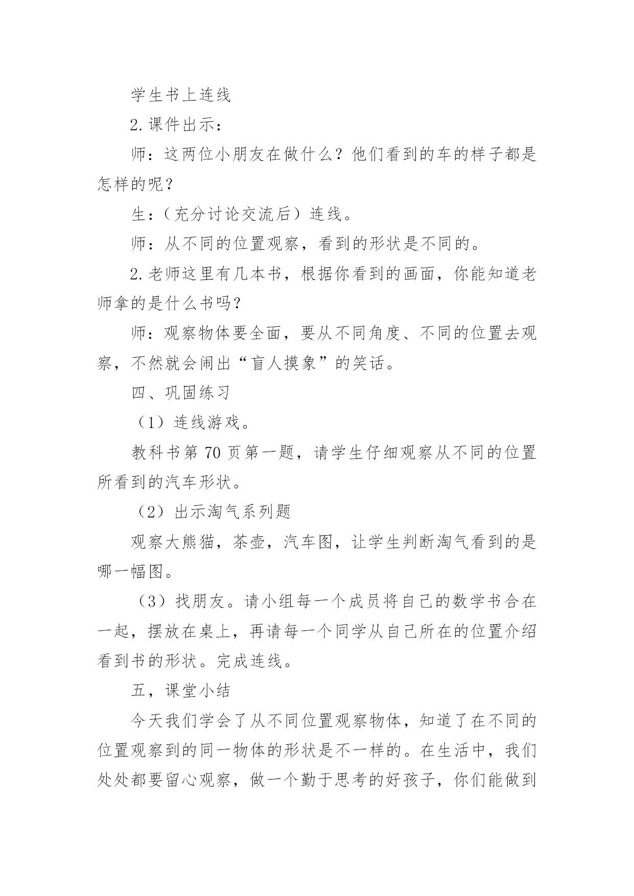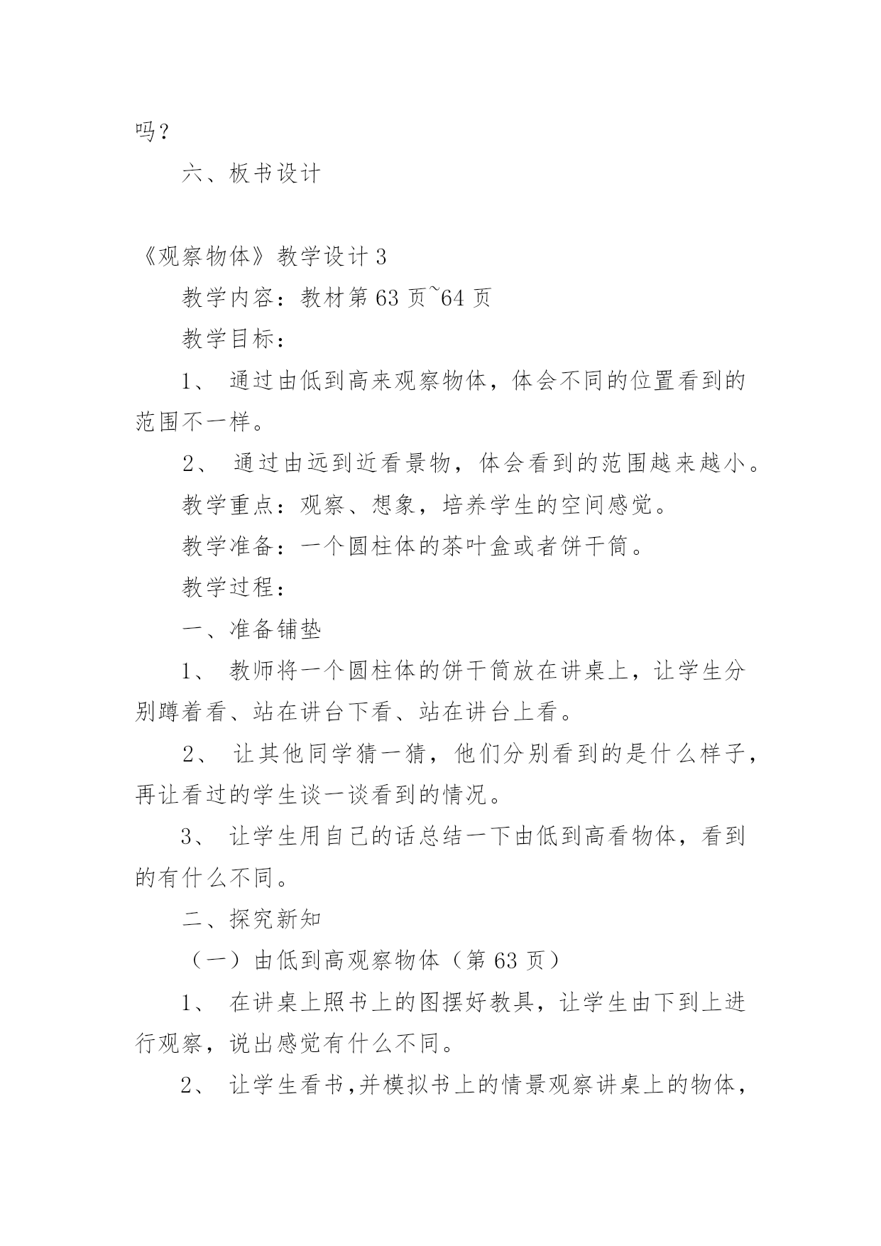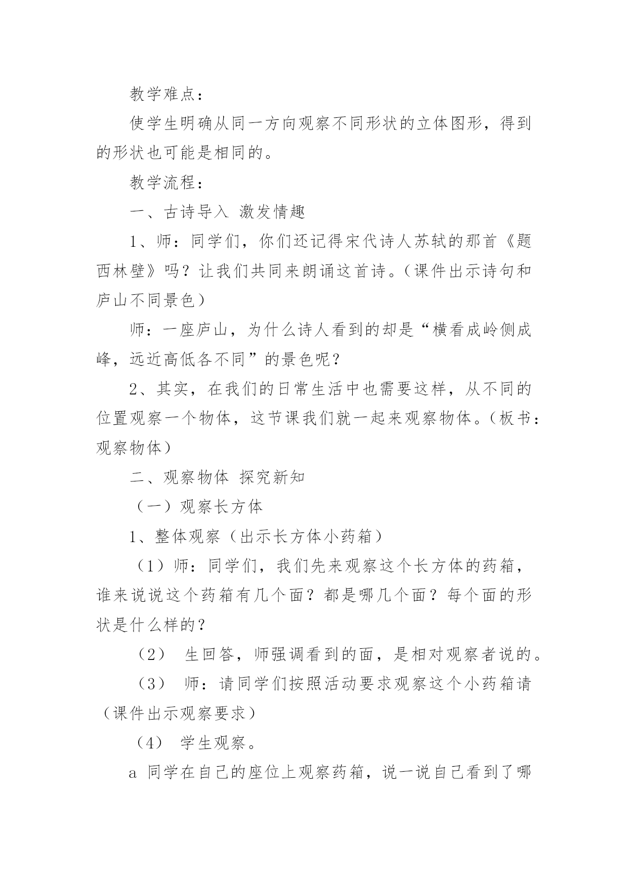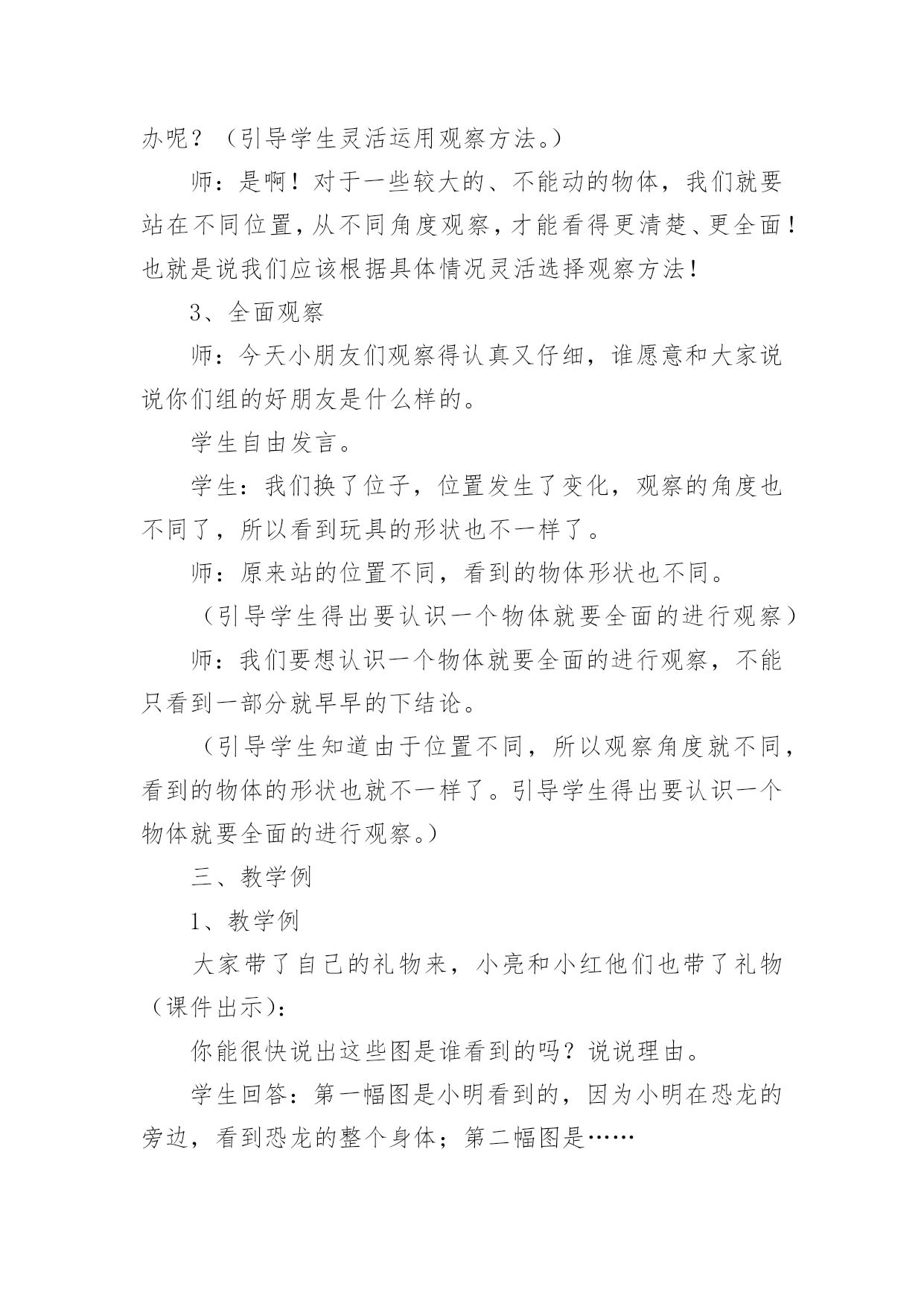 《观察物体》教学设计作为一名老师,通常需要用到教学设计来辅助教学,教学设计是一个系统设计并实现学习目标的过程,它遵循学习效果最优的原则吗,是课件开发质量高低的关键所在。那么优秀的教学设计是什么样的呢?以下是小编精心整理的《观察物体》教学设计,欢迎阅读与收藏。《观察物体》教学设计1教学内容:人教版义务教育课程标准实验教科书五年级数学上册第三单元38页---40页。教具、学具准备:长方体药箱、圆柱、球、长方体实物若干、圆柱和球的组合学具。教学目标:1、使学生经历观察的过程,让学生认识到从不同的位置观察物体,所看到的形状是不同的。2、通过观察实物,能正确辨认从正面、侧面、上面观察到的两个物体或一组立体图形的位置关系和形状。3、培养学生的空间想象力和思维能力。教学重点:能正确辨认从正面、侧面、上面观察到的两个物体或一组立体图形的位置关系和形状。教学难点:使学生明确从同一方向观察不同形状的立体图形,得到的形状也可能是相同的。教学流程:一、古诗导入激发情趣1、师:同学们,你们还记得宋代诗人苏轼的那首《题西林壁》吗?让我们共同来朗诵这首诗。(课件出示诗句和庐山不同景色)师:一座庐山,为什么诗人看到的却是“横看成岭侧成峰,远近高低各不同”的景色呢?2、其实,在我们的日常生活中也需要这样,从不同的位置观察一个物体,这节课我们就一起来观察物体。(板书:观察物体)二、观察物体探究新知(一)观察长方体1、整体观察(出示长方体小药箱)(1)师:同学们,我们先来观察这个长方体的药箱,谁来说说这个药箱有几个面?都是哪几个面?每个面的形状是什么样的?(2)生回答,师强调看到的面,是相对观察者说的。(3)师:请同学们按照活动要求观察这个小药箱请(课件出示观察要求)(4)学生观察。a同学在自己的座位上观察药箱,说一说自己看到了哪几个面。b坐在不同方向的同学说说自己看到药箱的哪几个面,每个面是什么形状。(5)学生汇报。教师小结:刚才同学们在自己的位置上观察,有的同学看到一个面,有的看到两个或三个面。你能找出个位置看到所有的面吗?最多能看到药箱的几个面?请大家站起来走一走,看一看。(6)学生自由走动,观察。(7)学生汇报。教师小结:同学们的发言精彩极了,我们不论站在哪个位置,都不可能看到长方体所有的面,最多只能看到长方体的三个面。2、分别从三个面进行观察(1)教师拿起小药箱让不同方向的同学观察、我们从正面、上面、左面来看这个药箱得到的都是什么形状?(2)分别出示药箱的三个面,让学生判断分别是哪几个面。(3)做40页第1题,在书上完成。(课件演示进行订正)(二)、分别观察正方体圆柱体球体1、师:刚才老师和你们共同观察了长方体,现在请你和你小组的同学分别观察正方体圆柱体球体学具,完成表格。(表格中要求同学们从上面,正面,左面观察物体,并将看到的形状画下来)学生观察,完成表格并汇报。(预设:学生会质疑,圆柱体从正面看有时是正方形的)2、趣味游戏,强化认识。(用课件出示一个正方形)师:这是我看到的物体的一个面,谁来猜一猜,它可能是什么?(可能是长方体、正方体或圆柱)师:看来大家的意见不一致,你们能不能想出一个好办法,让大家知道这究竟是什么物体?(至少还要知道另一个面的形状)(课件呈现不同的物体)教师小结:同学们我们通过观察发现从同一个方向观察不同形状的立体图形,得到的形状也可能是相同的。因此,不能只根据一个方向看到的形状,就确定是什么立体图形,只有把从不同方向看到的形状进行综合,才能形成完整的形象,才能判断出它是什么立体图形。(三)观察组合图形1.观察交流加深认识过渡:刚才,我们从不同角度观察了一个物体,那么,我们从不同角度同时观察两个物体,会看到什么形状呢?(1)师:拿出课前准备的圆柱和球的组合学具,摆成和桌子上一样的位置,从各个不同的方向观察它们,观察后与小组内同学交流自己看到的结果。(教师巡视指导)师:谁能说一说自己观察的结果。(2)学生汇报教师小结:同学们观察的很认真,说得非常清楚明白。老师这里有几组图形(例2图),你们能正确判断它们是从哪个方向上看到的吗?1、学生判断。2、做40页第3题。三、逆向练习训练思维师:刚才我们一同观察了单个物体以及立体组合图形,并猜测和判断了它们在不同方向上的形状和位置关系。如果反过来,给你出示一个物体或立体组合图形某一方向上看到的形状,你能不能猜测出它们什么呢?(师在黑板上画了一圆形和一个正方形)1、学生猜测,并畅所欲言。(师讲解,圆柱体当底面直径和高等长时,从正面和侧面观察到的形状是正方形)2、再次引导学生明确:(1)从同一方向观察,不同形状的立体图形,得到的形状也可能是相同的。(2)不能只根据一个方向看到的形状,就确定是什么立体图形,只有把从不同方向看到的形状进行综合,才能形成完整的形象,才能判断出它是什么立体图形。四、全课总