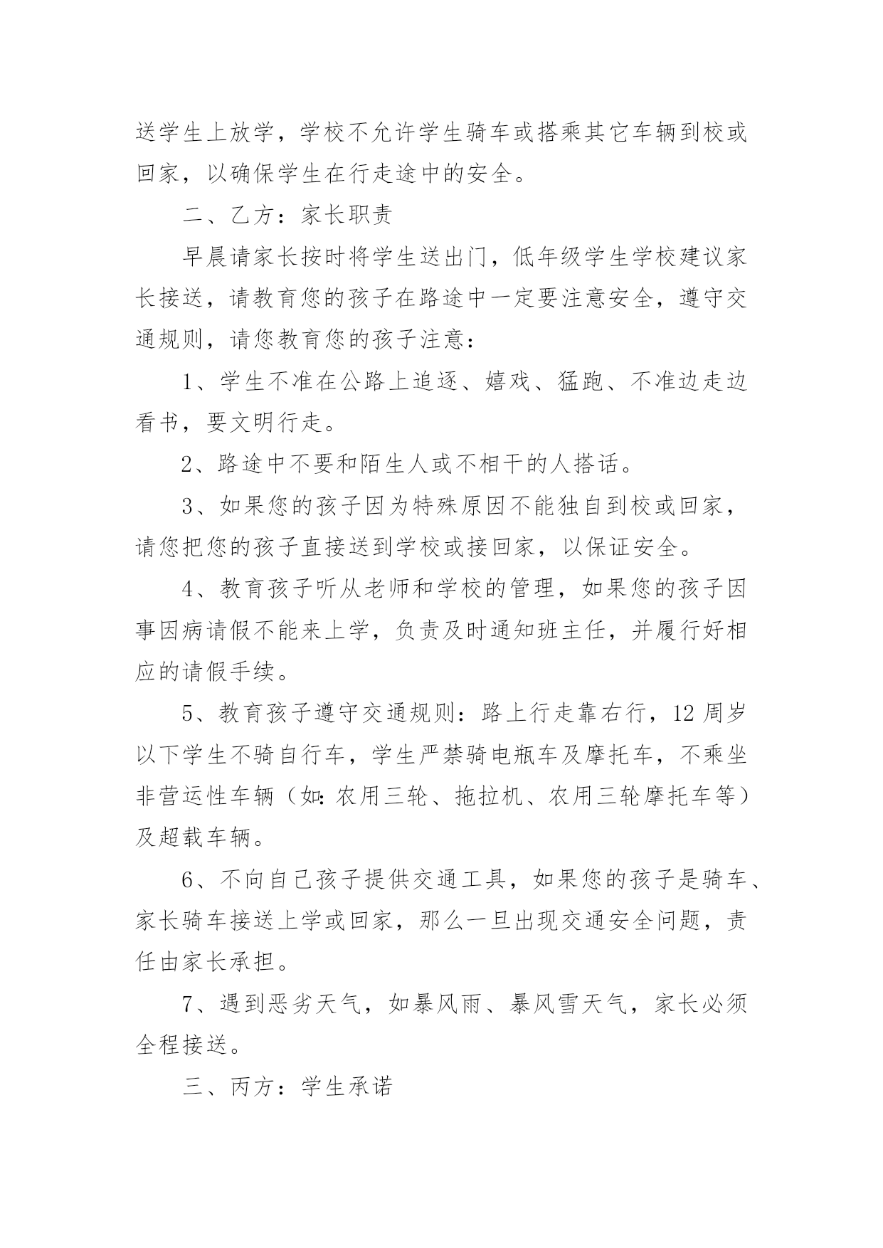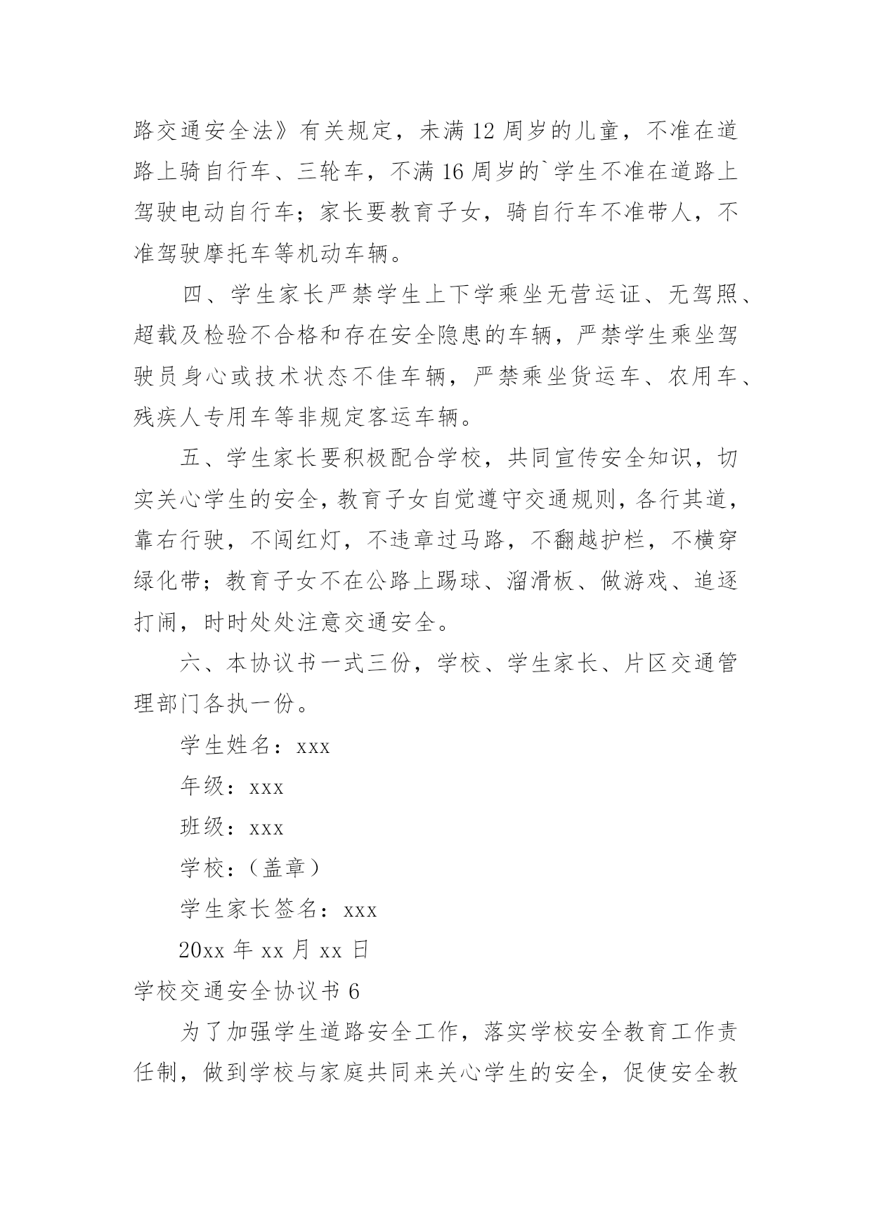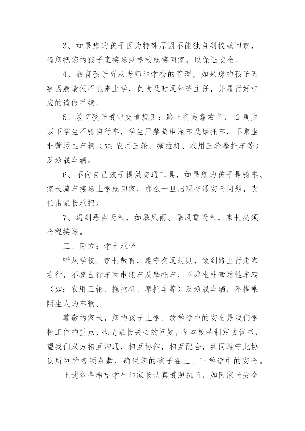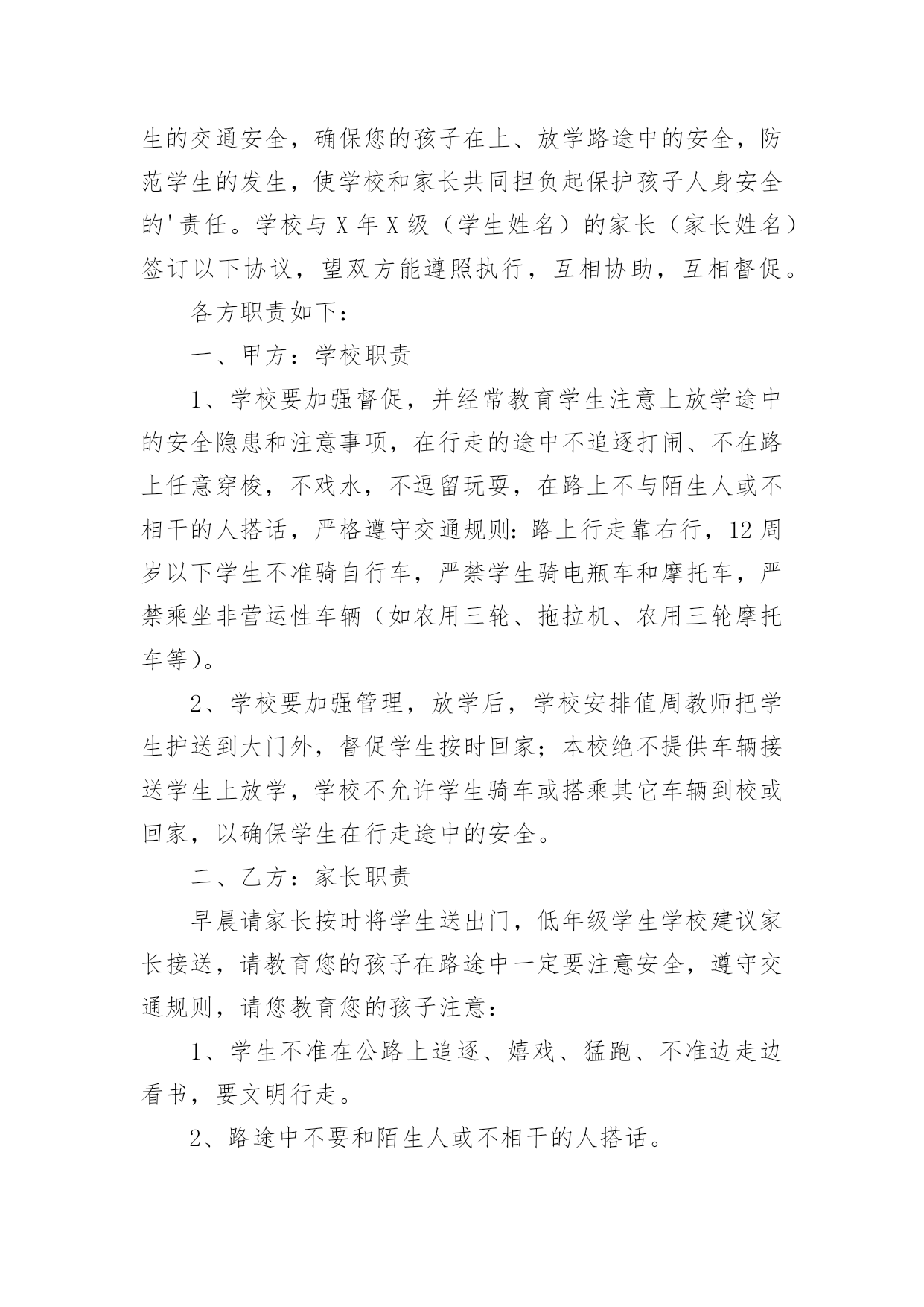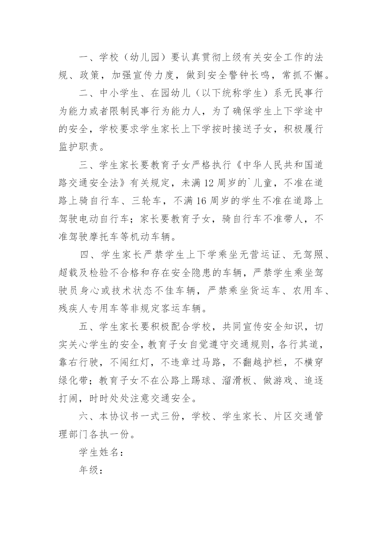 学校交通安全协议书学校交通安全协议书(11篇)在生活中,协议的使用成为日常生活的常态,签订了协议就有了法律依靠。想写协议却不知道该请教谁?以下是小编为大家整理的学校交通安全协议书,欢迎大家分享。学校交通安全协议书1甲方:双赢教育培训学校乙方(家长):XX少年儿童是祖国的未来和希望,青少年的健康成长事关民族前程,家庭幸福和社会稳定的大事。而保障他们健康安全的成长不仅要靠学校,还需要家长的积极配合,为了确保贵子女的安全健康成长,甲乙双方协商一致。特签订学生(走读生)安全责任协议,内容如下:一、甲方现有两种接送方式供乙方选择,请乙方选其一。在括号内打“√”在横线上签名:1、家长接送:学生由家长来校亲自接回家,如未被按时接者一律留校待接,超过放学时间30分钟,学生仍未被接须告知班主任事由,未通知的其留校待接期间所发生的安全事故由乙方负责。()XXXX2、学生自回:学生自行回家(走路或骑自行车回家)校外发生的安全事故由乙方负责,希望乙方长期对小孩进行安全教育。()XXXX二、其它安全要求:1、乙方应不准未满12周岁的子女骑自行车上路,学生骑自行车不准带人;禁止子女驾驶机动车辆;要求子女遵守交通规则,不闯红灯,不抢道,不搭肩行,拐弯十字路口要小心,过马路时要做到:一停,二看,三通过;不在公路上踢球、游玩、奔跑、嬉闹,时时处处注意交通安全。2、家长是未成年子女的'监护人,担负着教育子女成长的义务,请遵照上述协议内容要求执行,切实担负起对子女的监护责任。同时,甲方建议:你应充分利用各种机会过问子女在家、在校的表现,及时发现子女在学习、生活、思想上所遇到的困难,切实解决子女的后顾之忧,以便配合学校抓好教育工作。班主任老师联系电话XXXXXXXX家长联系电话XXXXXXXX甲方:星之升英语培训学校乙方:XX班主任签名:XX学生签名:XXXXXXX年XX月XX日学校交通安全协议书2为了加强学生道路安全工作,落实学校安全教育工作责任制,做到学校与家庭共同来关心学生的安全,促使安全教育工作管理制度化、规范化,经学校与学生家长的共同协商,特立如下协议:一、学校(幼儿园)要认真贯彻上级有关安全工作的法规、政策,加强宣传力度,做到安全警钟长鸣,常抓不懈。二、中小学生、在园幼儿(以下统称学生)系无民事行为能力或者限制民事行为能力人,为了确保学生上下学途中的安全,学校要求学生家长上下学按时接送子女,积极履行监护职责。三、学生家长要教育子女严格执行《中华人民共和国道路交通安全法》有关规定,未满12周岁的`儿童,不准在道路上骑自行车、三轮车,不满16周岁的学生不准在道路上驾驶电动自行车;家长要教育子女,骑自行车不准带人,不准驾驶摩托车等机动车辆。四、学生家长严禁学生上下学乘坐无营运证、无驾照、超载及检验不合格和存在安全隐患的车辆,严禁学生乘坐驾驶员身心或技术状态不佳车辆,严禁乘坐货运车、农用车、残疾人专用车等非规定客运车辆。五、学生家长要积极配合学校,共同宣传安全知识,切实关心学生的安全,教育子女自觉遵守交通规则,各行其道,靠右行驶,不闯红灯,不违章过马路,不翻越护栏,不横穿绿化带;教育子女不在公路上踢球、溜滑板、做游戏、追逐打闹,时时处处注意交通安全。六、本协议书一式三份,学校、学生家长、片区交通管理部门各执一份。学生姓名:年级:班级:学校:(盖章)学生家长签名:20xx年xx月xx日学校交通安全协议书3为了贯彻落实区教育局关于加强学生交通安全工作的精神,为提高家长和学生的责任意识,防范于未然,确实有效的做好学生交通安全工作,促使社会与家庭共同来关心学生的交通安全,确保您的孩子在上、放学路途中的安全,防范学生交通事故的发生,使学校和家长共同担负起保护孩子人身安全的责任。学校与年级(学生姓名)的家长(家长姓名)签订以下协议,望双方能遵照执行,互相协助,互相督促。各方职责如下:一、甲方:学校职责1、学校要加强督促,并经常教育学生注意上放学途中的安全隐患和注意事项,在行走的途中不追逐打闹、不在路上任意穿梭,不戏水,不逗留玩耍,在路上不与陌生人或不相干的'人搭话,严格遵守交通规则:路上行走靠右行,12周岁以下学生不准骑自行车,严禁学生骑电瓶车和摩托车,严禁乘坐非营运性车辆(如农用三轮、拖拉机、农用三轮摩托车等)。2、学校要加强管理,放学后,学校安排值周教师把学生护送到大门外,督促学生按时回家;本校绝不提供车辆接送学生上放学,学校不允许学生骑车或搭乘其它车辆到校或回家,以确保学生在行走途中的安全。二、乙方:家长职责早晨请家长按时将学生送出门,低年级学生学校建议家长接送,请教育您的孩子在路途中一定要注意安全,遵守交通规则,请您教育您的孩子注意:1、学生不准在公路上追逐、嬉戏、猛跑、不准边走边看书,要文明行走。2、路途中不要和陌生人或不相干的人搭话。3、如果您的孩子因为特殊
