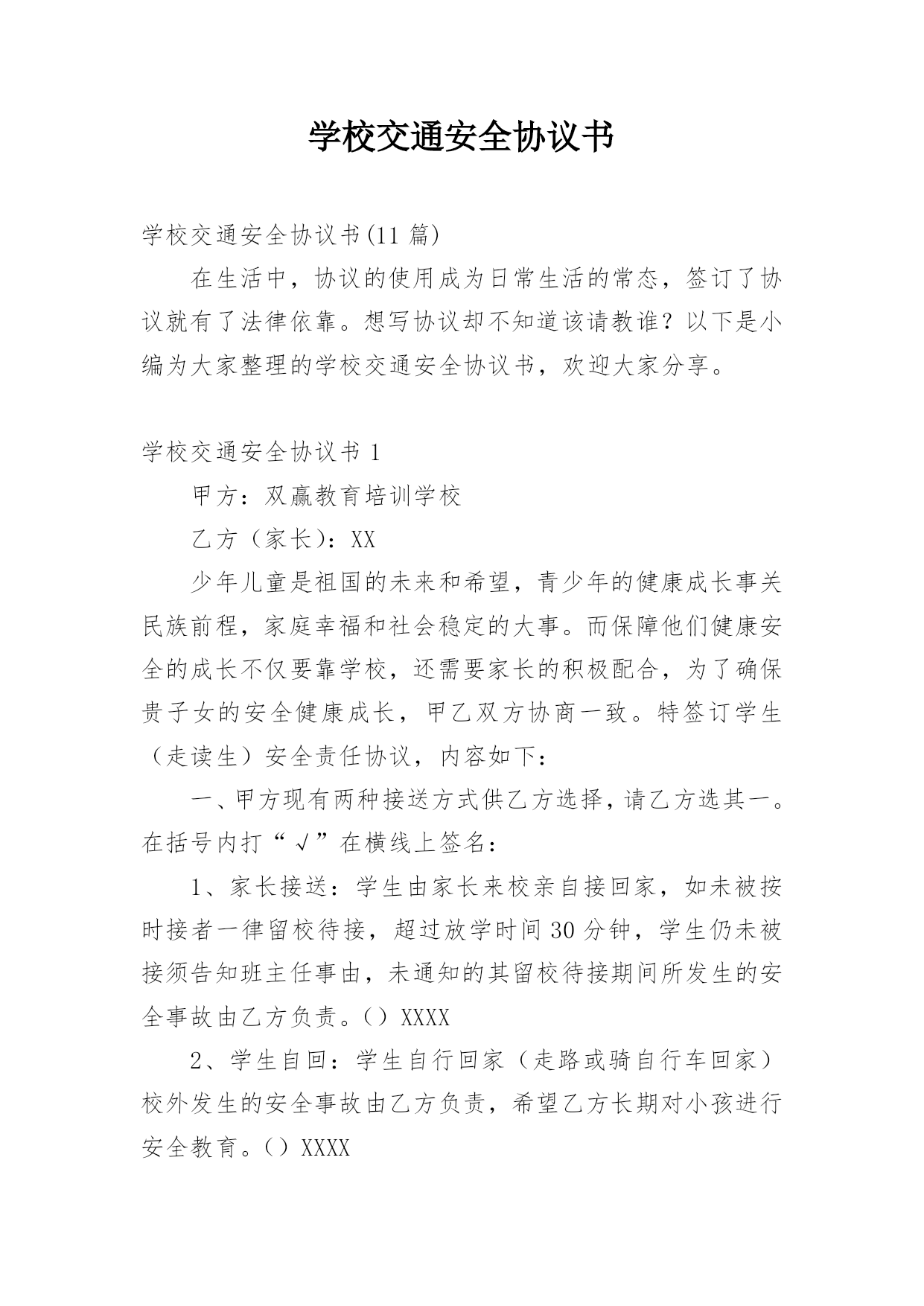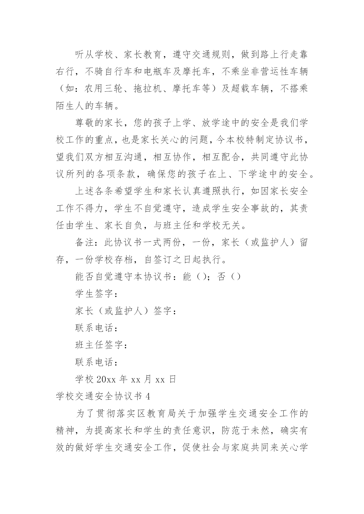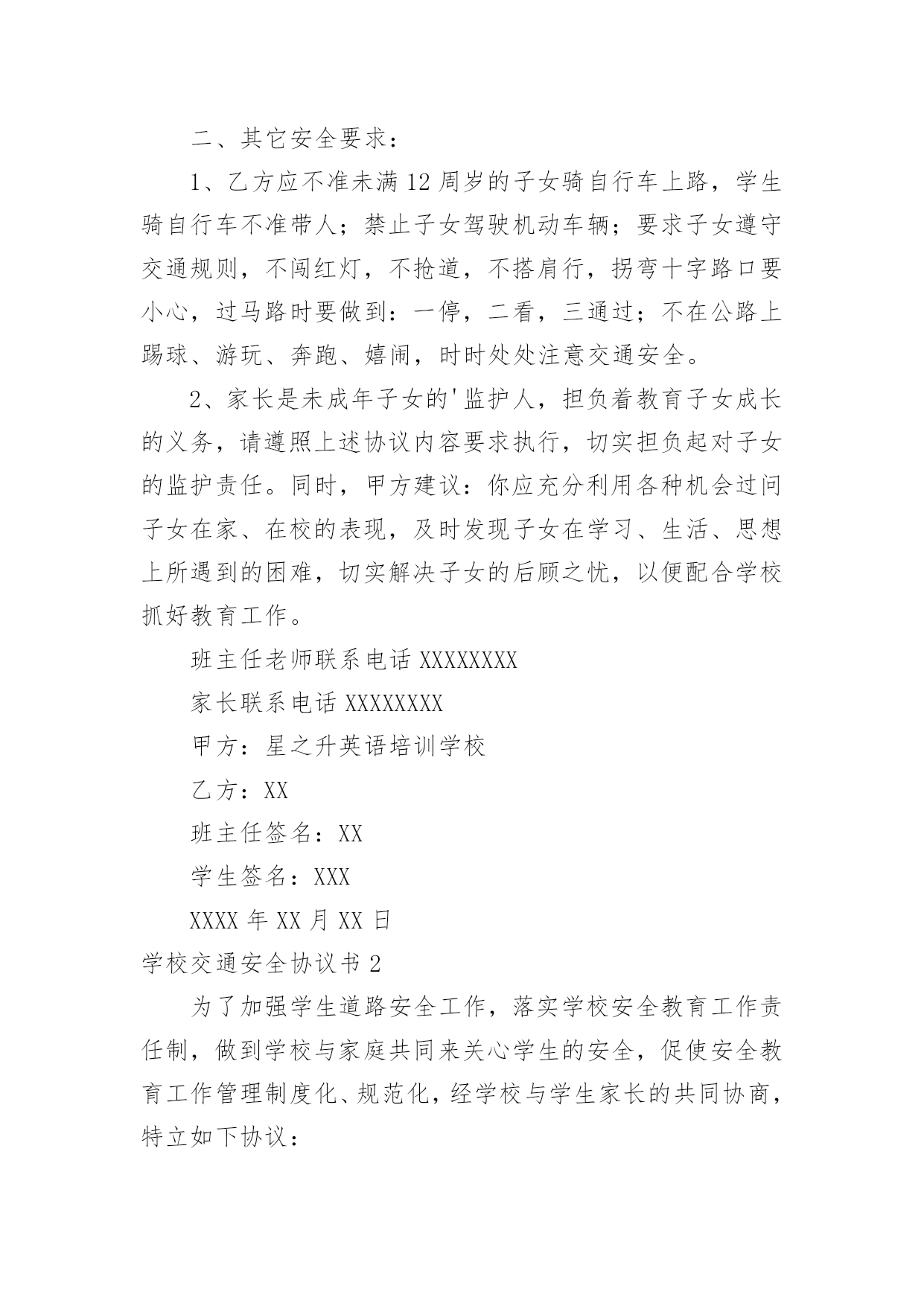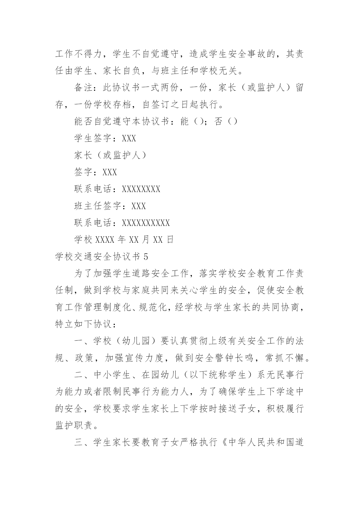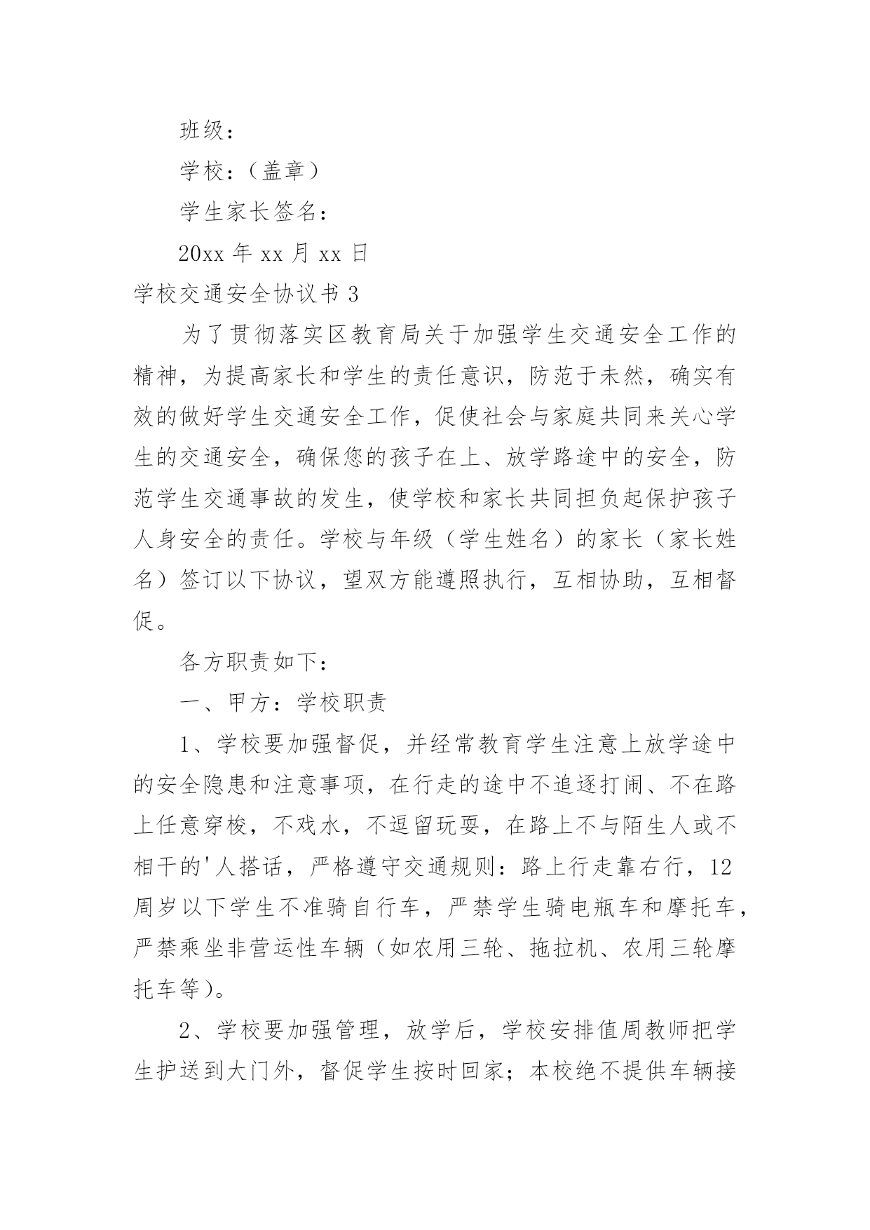 学校交通安全协议书学校交通安全协议书(11篇)在生活中,协议的使用成为日常生活的常态,签订了协议就有了法律依靠。想写协议却不知道该请教谁?以下是小编为大家整理的学校交通安全协议书,欢迎大家分享。学校交通安全协议书1甲方:双赢教育培训学校乙方(家长):XX少年儿童是祖国的未来和希望,青少年的健康成长事关民族前程,家庭幸福和社会稳定的大事。而保障他们健康安全的成长不仅要靠学校,还需要家长的积极配合,为了确保贵子女的安全健康成长,甲乙双方协商一致。特签订学生(走读生)安全责任协议,内容如下:一、甲方现有两种接送方式供乙方选择,请乙方选其一。在括号内打“√”在横线上签名:1、家长接送:学生由家长来校亲自接回家,如未被按时接者一律留校待接,超过放学时间30分钟,学生仍未被接须告知班主任事由,未通知的其留校待接期间所发生的安全事故由乙方负责。()XXXX2、学生自回:学生自行回家(走路或骑自行车回家)校外发生的安全事故由乙方负责,希望乙方长期对小孩进行安全教育。()XXXX二、其它安全要求:1、乙方应不准未满12周岁的子女骑自行车上路,学生骑自行车不准带人;禁止子女驾驶机动车辆;要求子女遵守交通规则,不闯红灯,不抢道,不搭肩行,拐弯十字路口要小心,过马路时要做到:一停,二看,三通过;不在公路上踢球、游玩、奔跑、嬉闹,时时处处注意交通安全。2、家长是未成年子女的'监护人,担负着教育子女成长的义务,请遵照上述协议内容要求执行,切实担负起对子女的监护责任。同时,甲方建议:你应充分利用各种机会过问子女在家、在校的表现,及时发现子女在学习、生活、思想上所遇到的困难,切实解决子女的后顾之忧,以便配合学校抓好教育工作。班主任老师联系电话XXXXXXXX家长联系电话XXXXXXXX甲方:星之升英语培训学校乙方:XX班主任签名:XX学生签名:XXXXXXX年XX月XX日学校交通安全协议书2为了加强学生道路安全工作,落实学校安全教育工作责任制,做到学校与家庭共同来关心学生的安全,促使安全教育工作管理制度化、规范化,经学校与学生家长的共同协商,特立如下协议:一、学校(幼儿园)要认真贯彻上级有关安全工作的法规、政策,加强宣传力度,做到安全警钟长鸣,常抓不懈。二、中小学生、在园幼儿(以下统称学生)系无民事行为能力或者限制民事行为能力人,为了确保学生上下学途中的安全,学校要求学生家长上下学按时接送子女,积极履行监护职责。三、学生家长要教育子女严格执行《中华人民共和国道路交通安全法》有关规定,未满12周岁的`儿童,不准在道路上骑自行车、三轮车,不满16周岁的学生不准在道路上驾驶电动自行车;家长要教育子女,骑自行车不准带人,不准驾驶摩托车等机动车辆。四、学生家长严禁学生上下学乘坐无营运证、无驾照、超载及检验不合格和存在安全隐患的车辆,严禁学生乘坐驾驶员身心或技术状态不佳车辆,严禁乘坐货运车、农用车、残疾人专用车等非规定客运车辆。五、学生家长要积极配合学校,共同宣传安全知识,切实关心学生的安全,教育子女自觉遵守交通规则,各行其道,靠右行驶,不闯红灯,不违章过马路,不翻越护栏,不横穿绿化带;教育子女不在公路上踢球、溜滑板、做游戏、追逐打闹,时时处处注意交通安全。六、本协议书一式三份,学校、学生家长、片区交通管理部门各执一份。学生姓名:年级:班级:学校:(盖章)学生家长签名:20xx年xx月xx日学校交通安全协议书3为了贯彻落实区教育局关于加强学生交通安全工作的精神,为提高家长和学生的责任意识,防范于未然,确实有效的做好学生交通安全工作,促使社会与家庭共同来关心学生的交通安全,确保您的孩子在上、放学路途中的安全,防范学生交通事故的发生,使学校和家长共同担负起保护孩子人身安全的责任。学校与年级(学生姓名)的家长(家长姓名)签订以下协议,望双方能遵照执行,互相协助,互相督促。各方职责如下:一、甲方:学校职责1、学校要加强督促,并经常教育学生注意上放学途中的安全隐患和注意事项,在行走的途中不追逐打闹、不在路上任意穿梭,不戏水,不逗留玩耍,在路上不与陌生人或不相干的'人搭话,严格遵守交通规则:路上行走靠右行,12周岁以下学生不准骑自行车,严禁学生骑电瓶车和摩托车,严禁乘坐非营运性车辆(如农用三轮、拖拉机、农用三轮摩托车等)。2、学校要加强管理,放学后,学校安排值周教师把学生护送到大门外,督促学生按时回家;本校绝不提供车辆接送学生上放学,学校不允许学生骑车或搭乘其它车辆到校或回家,以确保学生在行走途中的安全。二、乙方:家长职责早晨请家长按时将学生送出门,低年级学生学校建议家长接送,请教育您的孩子在路途中一定要注意安全,遵守交通规则,请您教育您的孩子注意:1、学生不准在公路上追逐、嬉戏、猛跑、不准边走边看书,要文明行走。2、路途中不要和陌生人或不相干的人搭话。3、如果您的孩子因为特殊