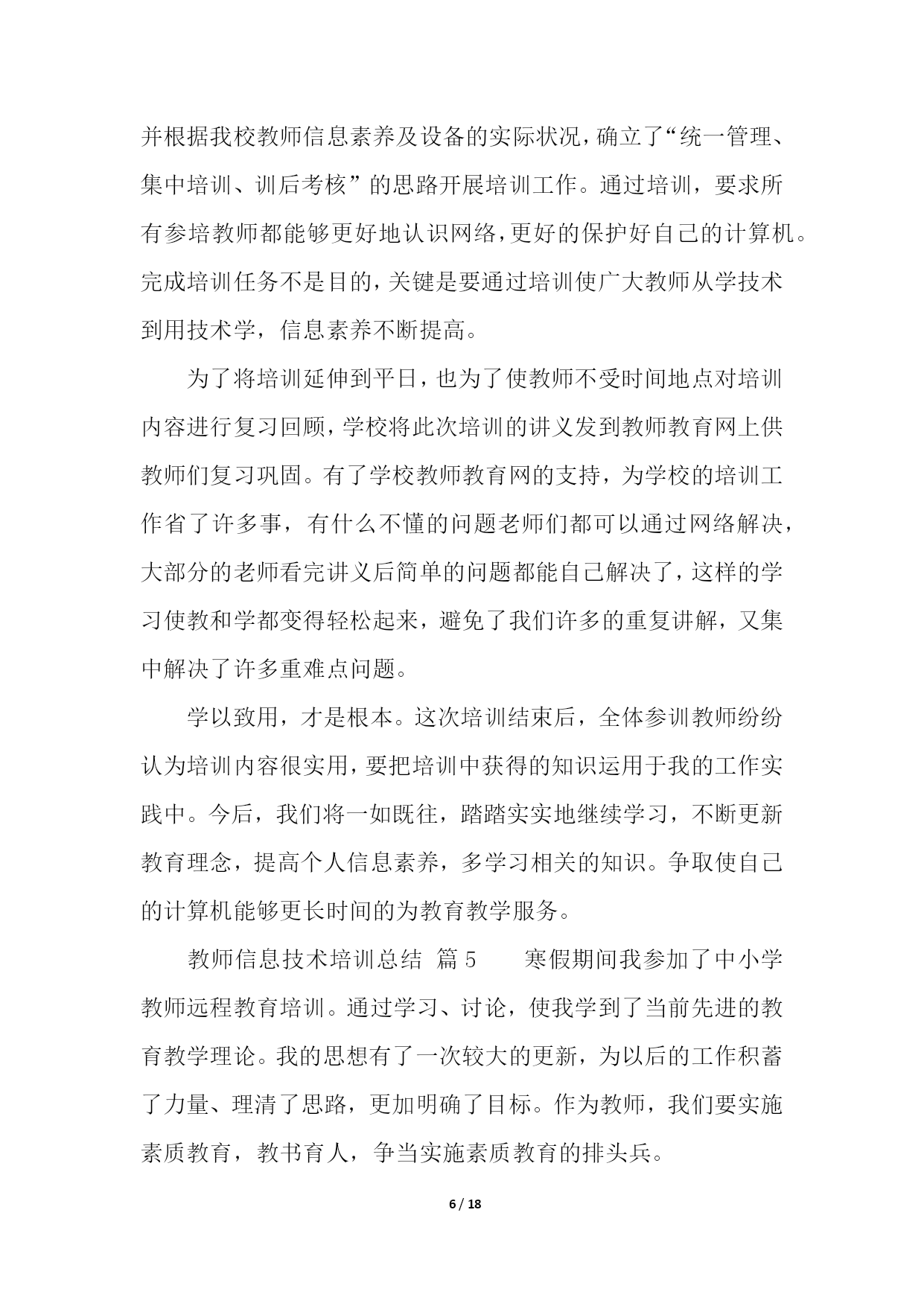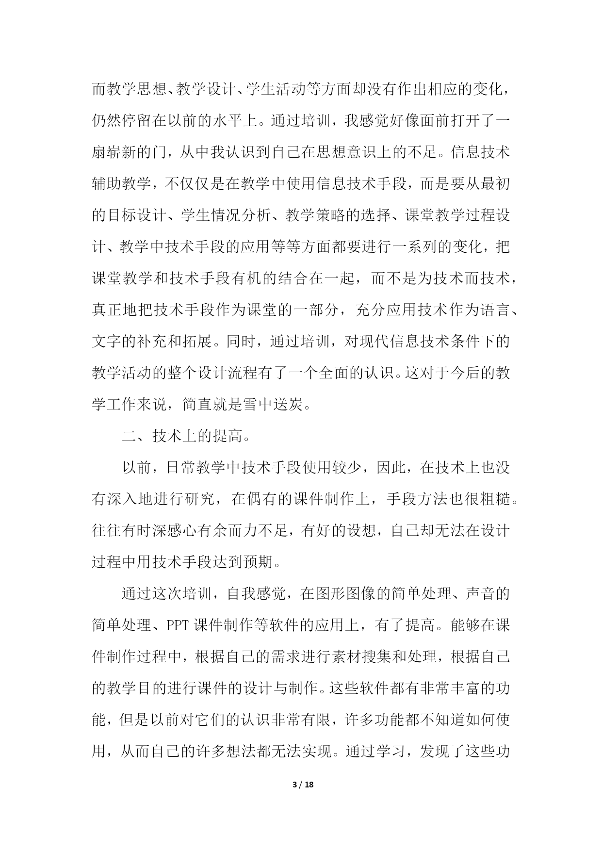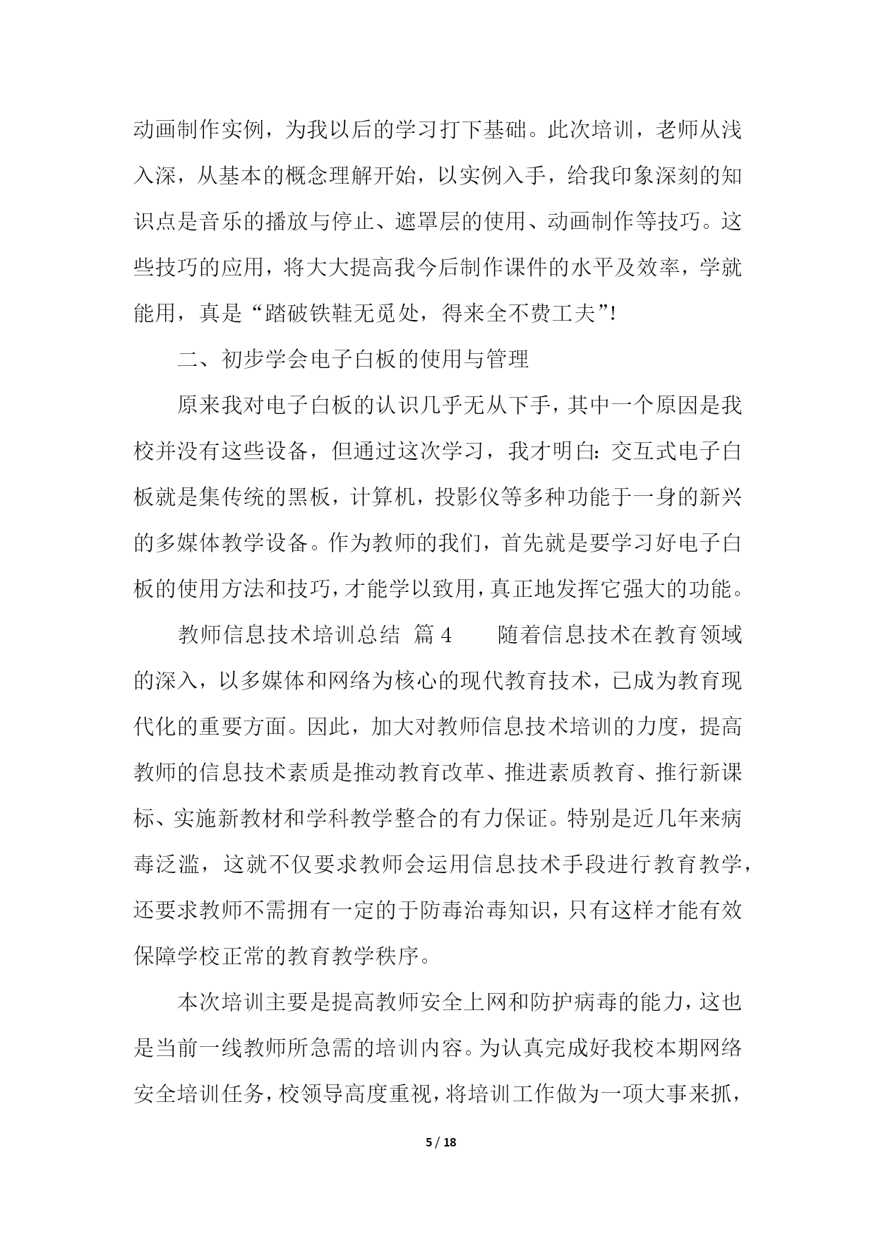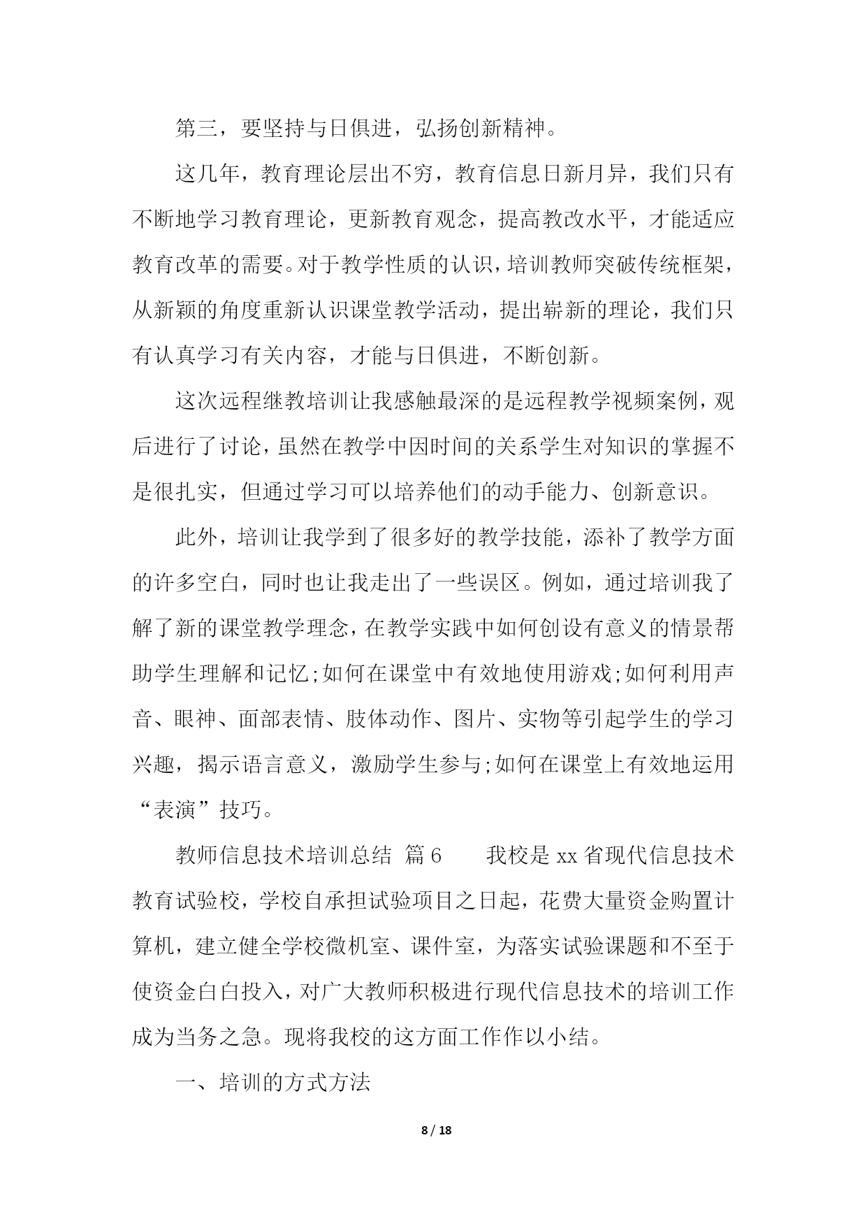 PAGE18/NUMPAGES18教师信息技术培训总结(精选10篇)教师信息技术培训总结篇1学校教师发展中心要求上交假期中市里组织的培训总结,于是简单写了一下。xx年8月20号下午至22号,xx市教科院组织的高中信息技术培训在xx实验中学如期举行。这次培训共有信息技术骨干教师100多人,他们来自于xx市各个地区的高中学校,其中有经验丰富的老教师,也有不少优秀的年轻教师。此次培训,主要突出“三步四环节五课型教学模式”课堂研究;此次培训,充分挖掘了骨干教师的经验和智慧,通过专家教师的主讲,系统总结骨干教师教学经验中的精华。并通过小组讨论的形式,最大程度地发挥骨干教师的作用,进一步提升以先进理念为核心的学科素养;全面推进我市素质教育的实施。在本次培训中,听了两节公开课,暑期中能组织起学生来上课,很是难得,课后xx市教研室主任对这两节课进行了精彩点评。这两堂课让在座的每位教师对“三步四环节五课型教学模式”有了初步的认识。在本次培训中,经验丰富的老教师xx老师作了报告“终日思考,不如须臾之学”,朴实的语言、切身的实践,让人听后受益非浅;xx老师提出的“生态课堂”让人耳目一新,其生动的语言、实实在在的课堂教学案例让我们对课堂教学有了新的看法。在本次培训中,教科院xx科长对高中信息技术“三步四环节五课型”教学模式进行了详细而精辟的解读,让在座的每位教师对“三步四环节五课型”教学模式有了比较深入的了解,让我们的课堂教学变得有章可循。短短两天半的培训结束了,可是培训的那种浓浓氛围却无时无刻不在影响着每一位参训教师。这次培训,给我们以后的信息技术教学指明了前进的道路,也给予我们强大的精神后备力量。教师信息技术培训总结篇220xx年x月x日到22日,我到成都武侯高中参加了成都市中小学教育信息技术培训。一个星期的紧张学习,让我感到收获颇多。总结一下,主要有两个方面的提高。一、意识上的提高。作为农村小学,以前硬件设备建设上相对落后于城市学校,在教学中,信息技术手段应用相对要少许多,日常教学中几乎不可能,只有偶尔参加赛课等活动时,才会有一点应用。地震之后,在全国人民的帮助下,我们学校的硬件建设有了极大提高,信息技术辅助教学在日常教学中成为可能。在平时的教学中,我也尝试使用。不过,自己感觉效果不是很好,达不到自己预想的要求,因此,时常感到困惑。经过这次培训,在思想意识上,自我感觉得到了提高。通过培训,我发现以前的教学中,信息技术手段的应用,几乎就是把电脑作为一种展示台,只是单纯的把书上的内容,呈现到电脑上,而教学思想、教学设计、学生活动等方面却没有作出相应的变化,仍然停留在以前的水平上。通过培训,我感觉好像面前打开了一扇崭新的门,从中我认识到自己在思想意识上的不足。信息技术辅助教学,不仅仅是在教学中使用信息技术手段,而是要从最初的目标设计、学生情况分析、教学策略的选择、课堂教学过程设计、教学中技术手段的应用等等方面都要进行一系列的变化,把课堂教学和技术手段有机的结合在一起,而不是为技术而技术,真正地把技术手段作为课堂的一部分,充分应用技术作为语言、文字的补充和拓展。同时,通过培训,对现代信息技术条件下的教学活动的整个设计流程有了一个全面的认识。这对于今后的教学工作来说,简直就是雪中送炭。二、技术上的提高。以前,日常教学中技术手段使用较少,因此,在技术上也没有深入地进行研究,在偶有的课件制作上,手段方法也很粗糙。往往有时深感心有余而力不足,有好的设想,自己却无法在设计过程中用技术手段达到预期。通过这次培训,自我感觉,在图形图像的简单处理、声音的简单处理、PPT课件制作等软件的应用上,有了提高。能够在课件制作过程中,根据自己的需求进行素材搜集和处理,根据自己的教学目的进行课件的设计与制作。这些软件都有非常丰富的功能,但是以前对它们的认识非常有限,许多功能都不知道如何使用,从而自己的许多想法都无法实现。通过学习,发现了这些功能的应用并不像自己想像中的那么困难,对这些软件有了全新的认知。相信在今后的教育教学实践中,我能够很好地运用这些软件来达到辅助教学的目的。教师信息技术培训总结篇3美好的时间总是过得很快,信息技术应用能力的提升活动已经结束。在这段时间里,我有幸成为本次教师信息技术应用能力提升小学语文2坊的一员,这也给我提供了这个再学习、再提高的机会。我克服了工作和学习之间的时间冲突,合理安排时间,按时登录平台学习,积极参加YY的答疑活动,感受省管老师工作的真诚,感受授课教师的风采,聆听他们耐心的解惑和真诚的传授,使我特别的感动。这次国培给我的感觉是全新的:足不出户,就能聆听专家的讲授,与同行交流讨论。这段研修的历程,有压力,更有收获。专家的教育教学理念、人格魅力和治学精神深深地印在我的心中。他们所讲内容深刻独到、旁征博引、通俗易懂、生动有趣、