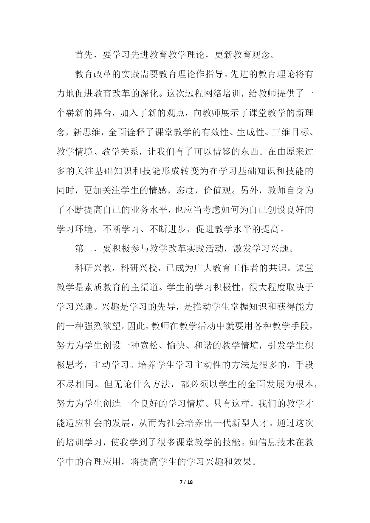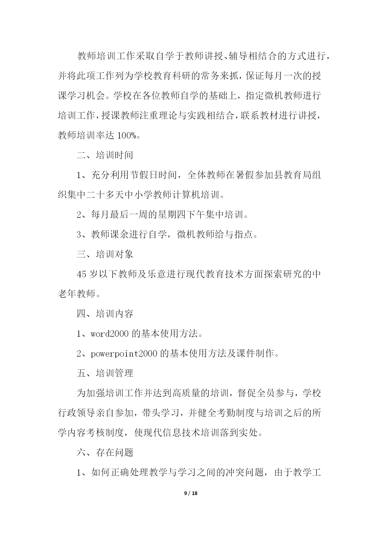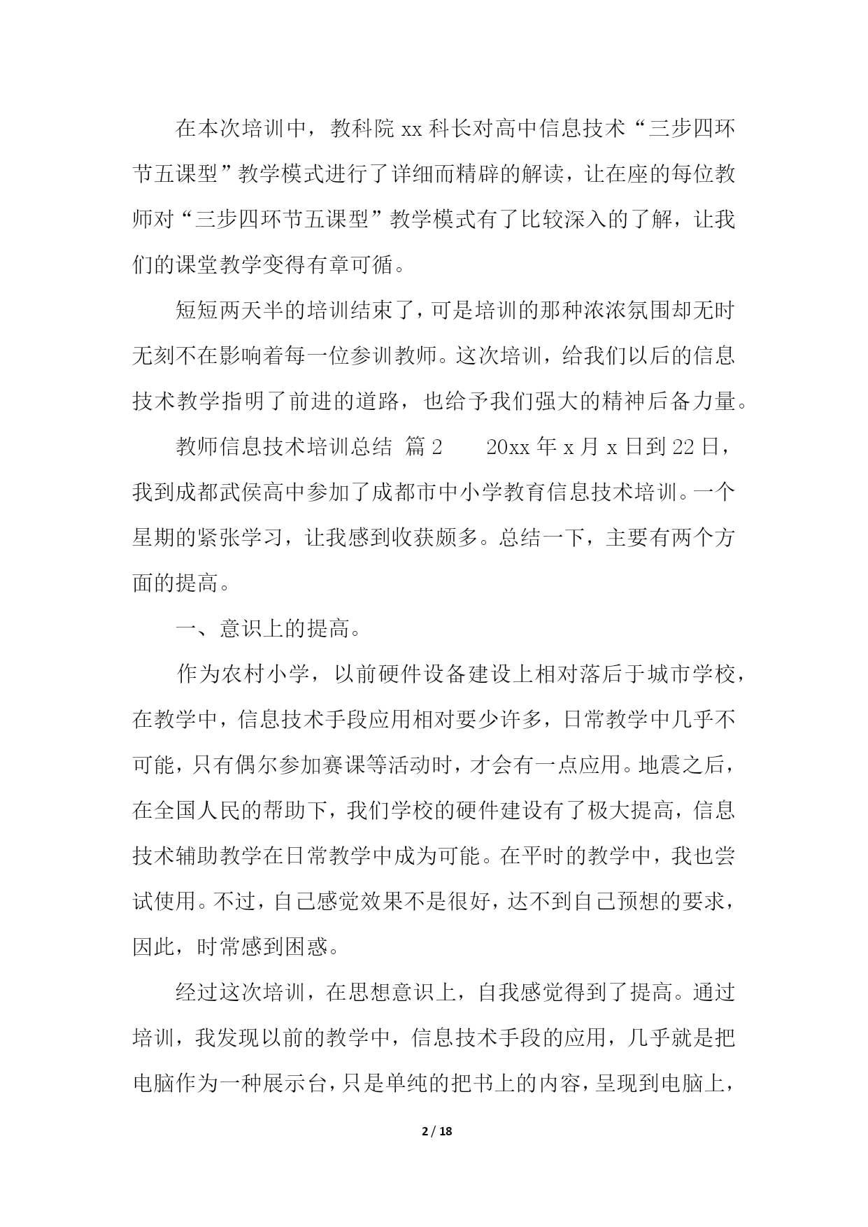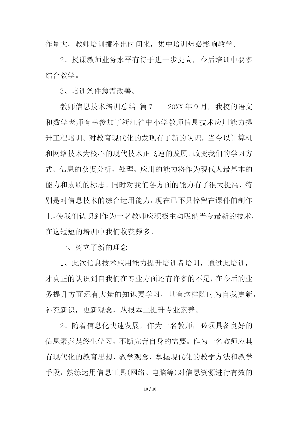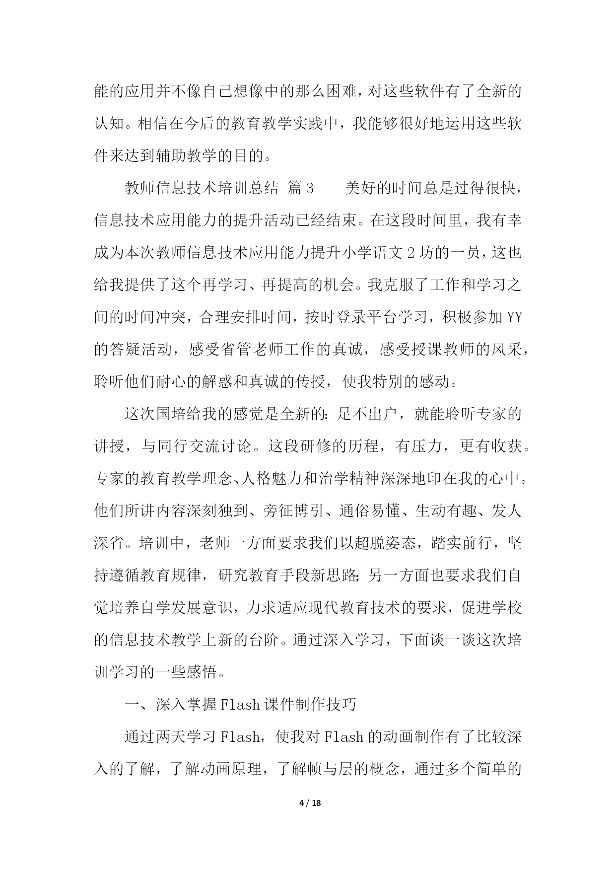 PAGE18/NUMPAGES18教师信息技术培训总结(精选10篇)教师信息技术培训总结篇1学校教师发展中心要求上交假期中市里组织的培训总结,于是简单写了一下。xx年8月20号下午至22号,xx市教科院组织的高中信息技术培训在xx实验中学如期举行。这次培训共有信息技术骨干教师100多人,他们来自于xx市各个地区的高中学校,其中有经验丰富的老教师,也有不少优秀的年轻教师。此次培训,主要突出“三步四环节五课型教学模式”课堂研究;此次培训,充分挖掘了骨干教师的经验和智慧,通过专家教师的主讲,系统总结骨干教师教学经验中的精华。并通过小组讨论的形式,最大程度地发挥骨干教师的作用,进一步提升以先进理念为核心的学科素养;全面推进我市素质教育的实施。在本次培训中,听了两节公开课,暑期中能组织起学生来上课,很是难得,课后xx市教研室主任对这两节课进行了精彩点评。这两堂课让在座的每位教师对“三步四环节五课型教学模式”有了初步的认识。在本次培训中,经验丰富的老教师xx老师作了报告“终日思考,不如须臾之学”,朴实的语言、切身的实践,让人听后受益非浅;xx老师提出的“生态课堂”让人耳目一新,其生动的语言、实实在在的课堂教学案例让我们对课堂教学有了新的看法。在本次培训中,教科院xx科长对高中信息技术“三步四环节五课型”教学模式进行了详细而精辟的解读,让在座的每位教师对“三步四环节五课型”教学模式有了比较深入的了解,让我们的课堂教学变得有章可循。短短两天半的培训结束了,可是培训的那种浓浓氛围却无时无刻不在影响着每一位参训教师。这次培训,给我们以后的信息技术教学指明了前进的道路,也给予我们强大的精神后备力量。教师信息技术培训总结篇220xx年x月x日到22日,我到成都武侯高中参加了成都市中小学教育信息技术培训。一个星期的紧张学习,让我感到收获颇多。总结一下,主要有两个方面的提高。一、意识上的提高。作为农村小学,以前硬件设备建设上相对落后于城市学校,在教学中,信息技术手段应用相对要少许多,日常教学中几乎不可能,只有偶尔参加赛课等活动时,才会有一点应用。地震之后,在全国人民的帮助下,我们学校的硬件建设有了极大提高,信息技术辅助教学在日常教学中成为可能。在平时的教学中,我也尝试使用。不过,自己感觉效果不是很好,达不到自己预想的要求,因此,时常感到困惑。经过这次培训,在思想意识上,自我感觉得到了提高。通过培训,我发现以前的教学中,信息技术手段的应用,几乎就是把电脑作为一种展示台,只是单纯的把书上的内容,呈现到电脑上,而教学思想、教学设计、学生活动等方面却没有作出相应的变化,仍然停留在以前的水平上。通过培训,我感觉好像面前打开了一扇崭新的门,从中我认识到自己在思想意识上的不足。信息技术辅助教学,不仅仅是在教学中使用信息技术手段,而是要从最初的目标设计、学生情况分析、教学策略的选择、课堂教学过程设计、教学中技术手段的应用等等方面都要进行一系列的变化,把课堂教学和技术手段有机的结合在一起,而不是为技术而技术,真正地把技术手段作为课堂的一部分,充分应用技术作为语言、文字的补充和拓展。同时,通过培训,对现代信息技术条件下的教学活动的整个设计流程有了一个全面的认识。这对于今后的教学工作来说,简直就是雪中送炭。二、技术上的提高。以前,日常教学中技术手段使用较少,因此,在技术上也没有深入地进行研究,在偶有的课件制作上,手段方法也很粗糙。往往有时深感心有余而力不足,有好的设想,自己却无法在设计过程中用技术手段达到预期。通过这次培训,自我感觉,在图形图像的简单处理、声音的简单处理、PPT课件制作等软件的应用上,有了提高。能够在课件制作过程中,根据自己的需求进行素材搜集和处理,根据自己的教学目的进行课件的设计与制作。这些软件都有非常丰富的功能,但是以前对它们的认识非常有限,许多功能都不知道如何使用,从而自己的许多想法都无法实现。通过学习,发现了这些功能的应用并不像自己想像中的那么困难,对这些软件有了全新的认知。相信在今后的教育教学实践中,我能够很好地运用这些软件来达到辅助教学的目的。教师信息技术培训总结篇3美好的时间总是过得很快,信息技术应用能力的提升活动已经结束。在这段时间里,我有幸成为本次教师信息技术应用能力提升小学语文2坊的一员,这也给我提供了这个再学习、再提高的机会。我克服了工作和学习之间的时间冲突,合理安排时间,按时登录平台学习,积极参加YY的答疑活动,感受省管老师工作的真诚,感受授课教师的风采,聆听他们耐心的解惑和真诚的传授,使我特别的感动。这次国培给我的感觉是全新的:足不出户,就能聆听专家的讲授,与同行交流讨论。这段研修的历程,有压力,更有收获。专家的教育教学理念、人格魅力和治学精神深深地印在我的心中。他们所讲内容深刻独到、旁征博引、通俗易懂、生动有趣、