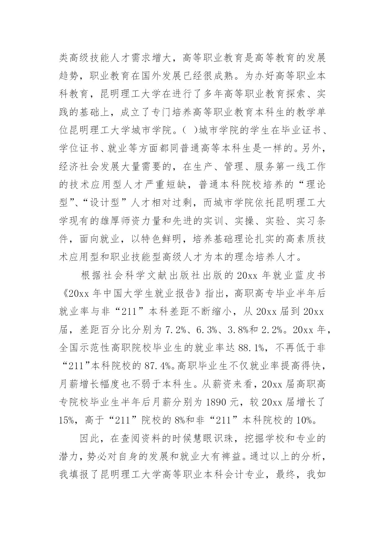 高考志愿填报技巧分析高考志愿填报技巧分析转眼一年,冬去春来,又将到寒窗苦读十二年的学子踏上“战场”之日,我也曾在这个“战场”上过,犹记得当年我还是个不谙世事,看到大学风景照片还激动万分的孩子,而现在却早已学会,学会沉稳。那年高考结束后,全家都在为我的大学志愿辗转,我的高考分只高出二本线十几分,只算是中等成绩的考生,但俗话说再酸的葡萄也有狐狸妒忌,所以只要你认真对待,也一定能与我一样选到合适的专业。填报志愿前我查阅了许多相关的材料,在一份资料中看到这样一个比喻:填报高考志愿,就好比去果园摘果子,而且你只能摘一个。不要弯下腰去捡(高分低报),也不要跃起去摘(低分高报),而是抬起手来拿你最喜欢的一个。通过多方比较,我最终选择了昆明理工大学高等职业本科会计专业。以下是我选择志愿的多方面考虑,希望对你也有所帮助。首先,昆明理工大学是云南省的一所重点院校,全国排名在百强之内,她虽是二本院校,但在全国许多省的最低录取线接近或超过一本线。昆明理工大学创办的高等职业本科于20xx年开始招生,许多考生和家长对高等职业本科的认识还需要一定的时间和过程,我填报昆明理工大学高等职业本科符合“抬起手”的原则不盲目自大,也不自卑屈就。其次,随着国家经济转型和经济增长方式的转变,对各类高级技能人才需求增大,高等职业教育是高等教育的发展趋势,职业教育在国外发展已经很成熟。为办好高等职业本科教育,昆明理工大学在进行了多年高等职业教育探索、实践的基础上,成立了专门培养高等职业教育本科生的教学单位昆明理工大学城市学院。()城市学院的学生在毕业证书、学位证书、就业等方面都同普通高等本科生是一样的。另外,经济社会发展大量需要的,在生产、管理、服务第一线工作的技术应用型人才严重短缺,普通本科院校培养的“理论型”、“设计型”人才相对过剩,而城市学院依托昆明理工大学现有的雄厚师资力量和先进的实训、实操、实验、实习条件,面向就业,以特色鲜明,培养基础理论扎实的高素质技术应用型和职业技能型高级人才为本的理念培养人才。根据社会科学文献出版社出版的20xx年就业蓝皮书《20xx年中国大学生就业报告》指出,高职高专毕业半年后就业率与非“211”本科差距不断缩小,从20xx届到20xx届,差距百分比分别为7.2%、6.3%、3.8%和2.2%。20xx年,全国示范性高职院校毕业生的就业率达88.1%,不再低于非“211”本科院校的87.4%。高职毕业生不仅就业率提高得快,月薪增长幅度也不弱于本科生。从薪资来看,20xx届高职高专院校毕业生半年后月薪分别为1890元,较20xx届增长了15%,高于“211”院校的8%和非“211”本科院校的10%。因此,在查阅资料的时候慧眼识珠,挖掘学校和专业的潜力,势必对自身的发展和就业大有裨益。通过以上的分析,我填报了昆明理工大学高等职业本科会计专业,最终,我如愿以偿!现在我对城市学院有了更深的了解,这里学校领导重视,管理严格,注重能力和技能的培养,采取工学结合、校企合作、顶岗实习的模式,一是使我们具备两种能力,即就业能力和继续学习能力。二是使我们获得两个证书,即学历毕业证书和职业资格证书。课外活动丰富,你可发展你的兴趣,参加你喜欢的社团,在这里,有许多和你志同道合的同学,你们可以彼此交流,学习。这里还有各种比赛:演讲赛,辩论赛,歌唱大赛,水火箭比赛……我们都可以踊跃参加。学院不仅重视学生夯实理论基础还根据不同的专业训练学生的动手实践能力,为今后学生考研着想,本学期开设了英语四级辅导班、高数辅导课等,周末还有实训。