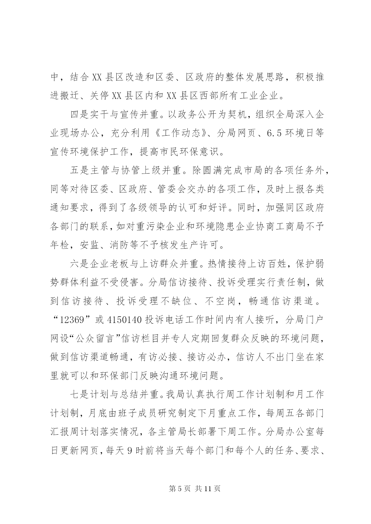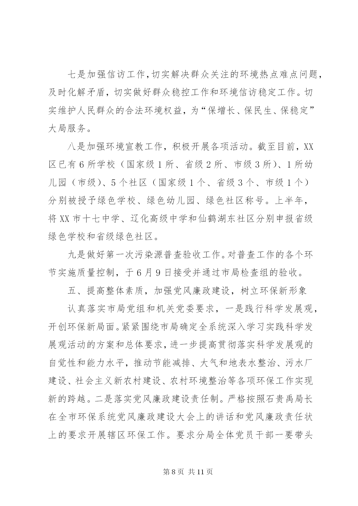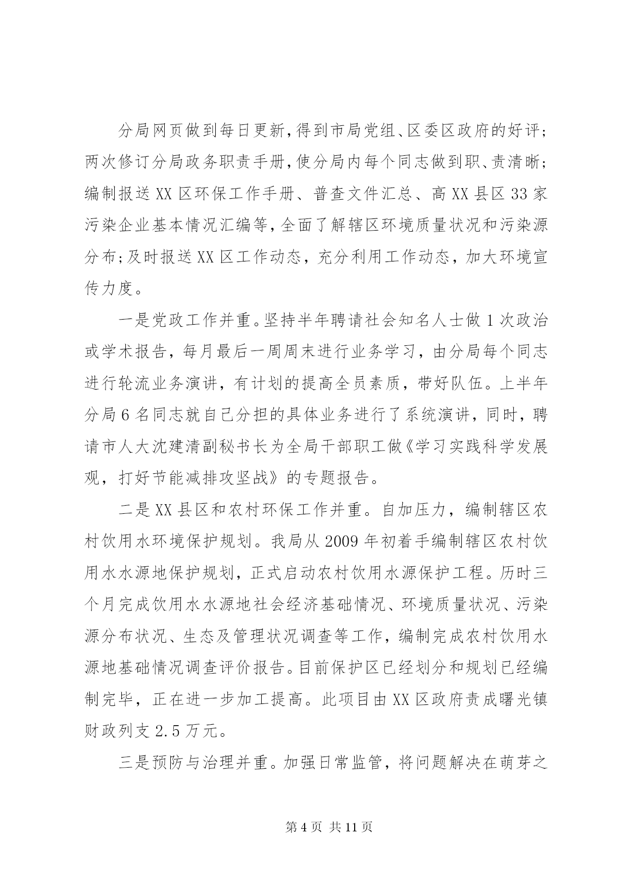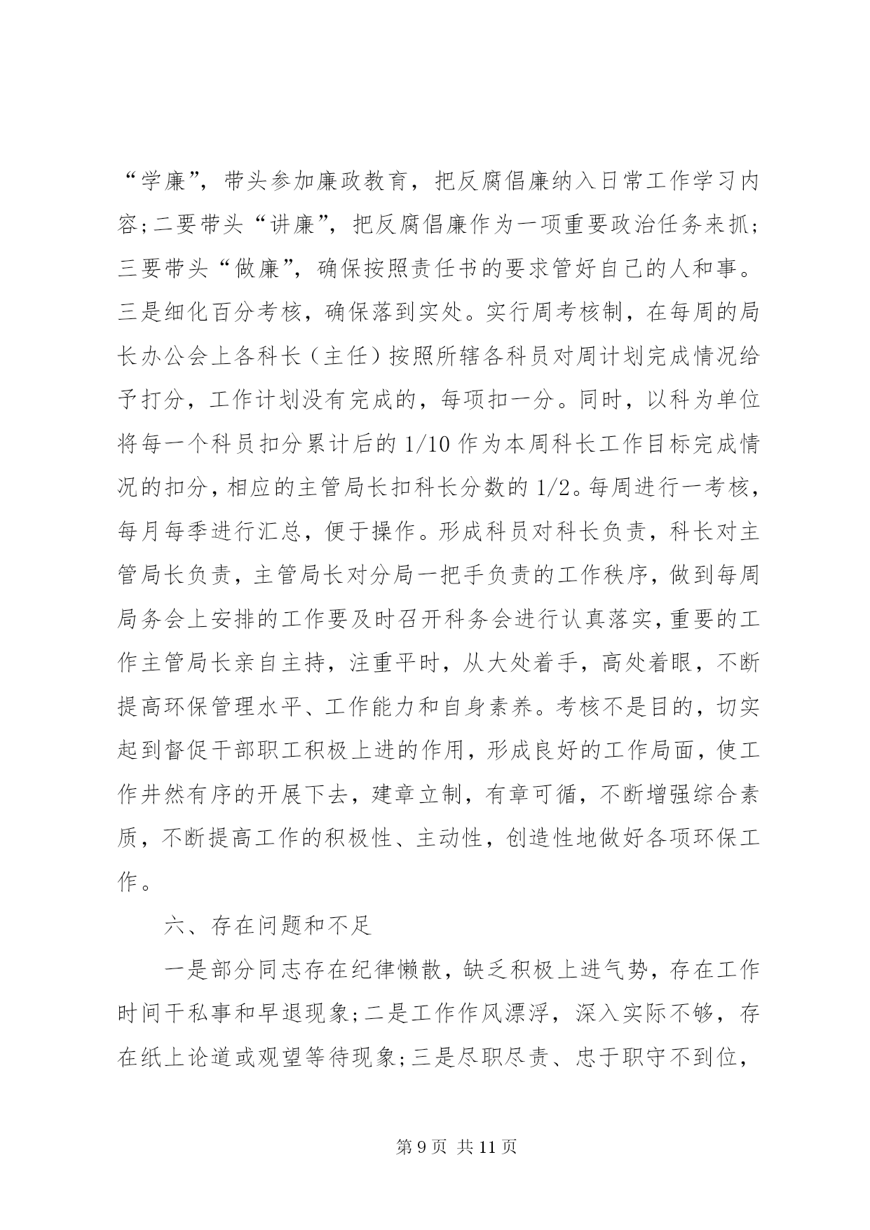 第PAGE\*Arabic\*MERGEFORMAT11页共NUMPAGES\*MERGEFORMAT11页环保分局述职述廉报告在市环保局党组和机关党委的正确领导下,XX分局始终与局党组保持高度一致的政治方向,牢固树立大局意识,不折不扣的落实和完成市环保局、区委、区政府和管委会的决议、要求,没有出现延误、不作为现象。分局一班人紧紧围绕芳烃基地建设、新开河综合治理和污水处理厂建设及农村环境综合整治工作,加强环境监管,切实削减主要污染物排放总量,深入开展区域流域环境整治,缜密落实市局年度工作计划和《2009年度XX区环境保护工作计划》,扎实推进XX区政府批准实施的地表水、大气、减排、农村环境综合整治四大实施方案,自觉履行市环保局党组年初对XX分局提出的“务实、开拓、创新、前瞻”八字要求,进一步提升环境管理水平,为XX区经济跨越式发展做出了积极的贡献。下面我代表XX分局领导班子做述职述廉报告。一、坚持科学决策,促进依法行政一是认真贯彻落实区政府批准实施的《XX市XX区农村环境保护工作实施方案》等4个整治计划要求,做到环境管理有依据、有组织、有目标、有完成时限。要求22家规模以上企业及8家燃煤大户淘汰落后燃烧工艺,使用低硫煤和清洁能源,耗煤情况实施月报制度,确保2009年燃煤使用量不高于2007年耗煤量,取缔11家1吨以下燃煤锅炉,强制推广使用清洁能源。对新开河、前进河、石场峪河实行“河长”制。新开河实施污水干管截流,截至目前已完成5720延长米,占计划的53.3%。切实开展农村环保工作,积极争取外资,实施农村环境综合整治,认真组织实施《XX市XX区农村环境保护工作实施方案》,环保“民生工程”取得实效。二是积极争取政策资金支持,改善辖区环境质量。1、省环保厅投资3200万元建设污水处理厂,6月30日试水调试,使工程减排落到实处,对完成减排任务起着重要作用。2、2008年中央农村环保专项资金90万元和省环保专项资金200万元用于前进村环境综合整治,重点支持河道清淤护砌绿化工程、生活污水、生活垃圾转运站工程、畜禽养殖粪便堆肥三大治理工程。前进村已被列为第二批“环保攻坚惠民”试点村,将继续开展下一步治理工作。3、市环保局投入350万元对新开河污染进行清淤等彻底整治。4、积极协调可口可乐公司、联合国开发计划署(undp)等部门出资为村民建设深井并提供技术支持解决村民吃难水问题,计划一期投入25万元,目前资金已经到位20万元,深井已经开工建设,新井建成后将改变以往的用水机制。此项目预计7月末竣工并接受项目相关方的验收。5、组织南八里村申报市级环保资金,启动生态村建设。对生活垃圾、生活污水、畜禽养殖粪便污染进行环境综合整。在项目实施的过程中,充分发挥技术监督、工程指导作用,会同区财政局按工程进度拨付资金,确保资金全部用于环境整治。三是加大对建设项目环境违法行为和企业违法排污行为等查处力度。对龙石风景旅游区内的生活污染源、工业污染源依法进行整治,确保景区环境质量。辖区内实施排污口规范化整治,目前已经完成全区40家企业排污口整治。加大XX县区噪声控制力度,加强建筑施工行业噪声监控,避免夜间扰民,对居民住宅区内产生噪声污染的企业,及时查处整改,圆满完成“两考”禁噪任务。在执法过程中,文明执法,严格执法程序,树立良好执法形象,今年我局认真开展法律“六进”活动,并将作为全市法制试点区。截至目前分局立案处罚违法排污企业20家,累计处罚额度12.5万元,案卷卷宗已经市局法规科检查验收。二、严格执行民主集中制,定期召开支部和班子会议一是定期召开支部会议研究解决重大事项,认真落实机关党委各项要求,不走过场,事事落到实处;二是定期召开党员大会,组织学习市局统一安排的政治学习计划和分局业务培训计划,提高全局整体素质,做到又红又专;三是每周充分征求各科长(主任)、主管局长意见制定下周工作计划,每月月末班子成员专题研究制定下月工作计划。各负其责,各司其职,自觉履行各自职责,落实分局各项工作任务。三、统筹协调、务实创新,充分体现“9个并重”原则分局网页做到每日更新,得到市局党组、区委区政府的好评;两次修订分局政务职责手册,使分局内每个同志做到职、责清晰;编制报送XX区环保工作手册、普查文件汇总、高XX县区33家污染企业基本情况汇编等,全面了解辖区环境质量状况和污染源分布;及时报送XX区工作动态,充分利用工作动态,加大环境宣传力度。一是党政工作并重。坚持半年聘请社会知名人士做1次政治或学术报告,每月最后一周周末进行业务学习,由分局每个同志进行轮流业务演讲,有计划的提高全员素质,带好队伍。上半年分局6名同志就自己分担的具体业务进行了系统演讲,同时,聘请市人大沈建清副秘书长为全局干部职工做《学习实践科学发展观,打好节能减排攻坚战》的专题报告。二是XX县区