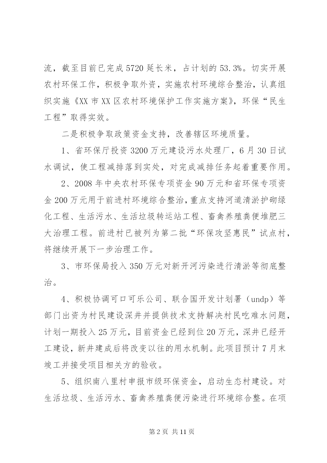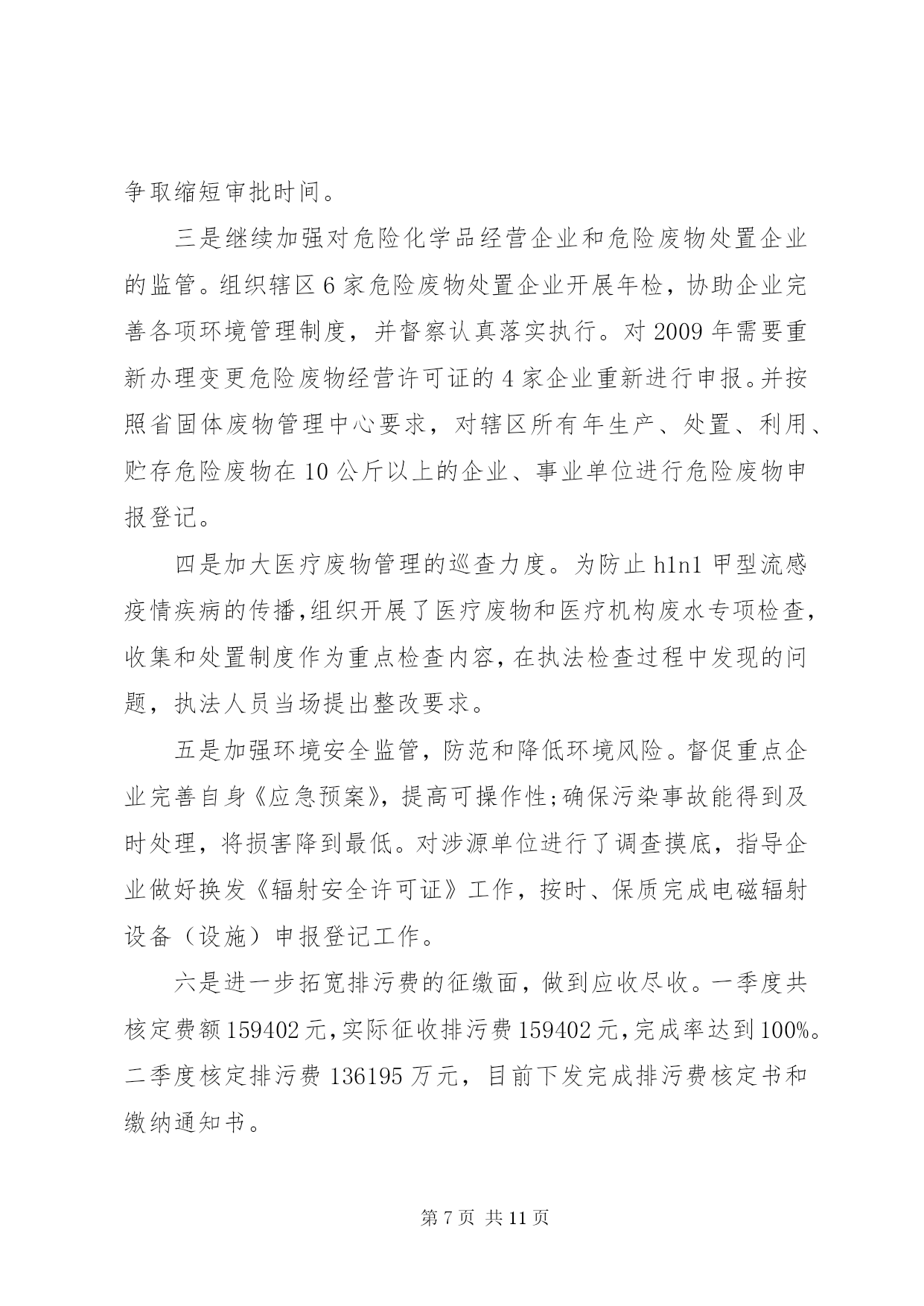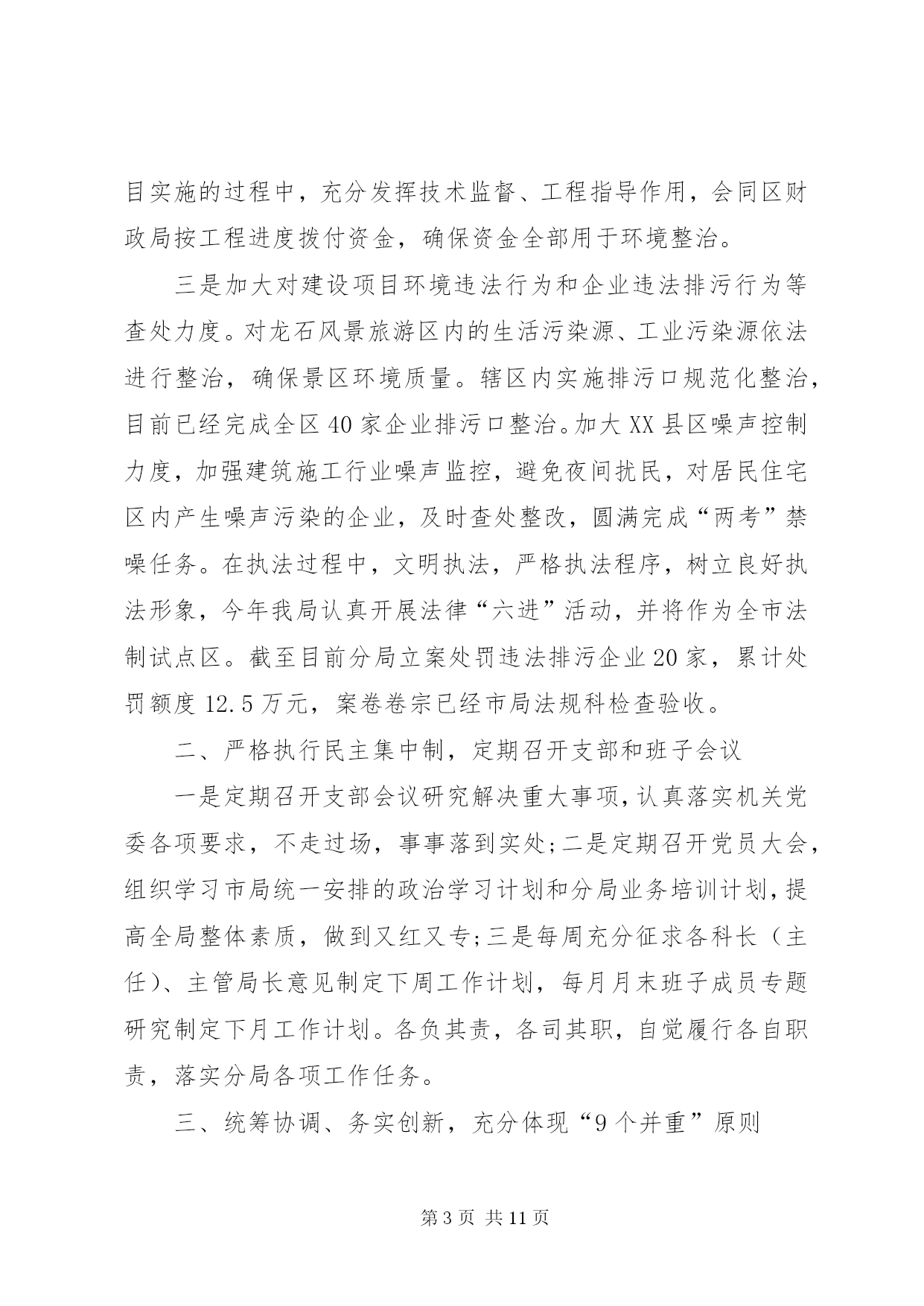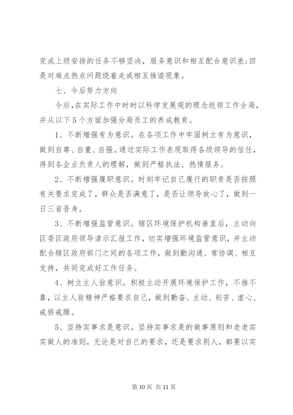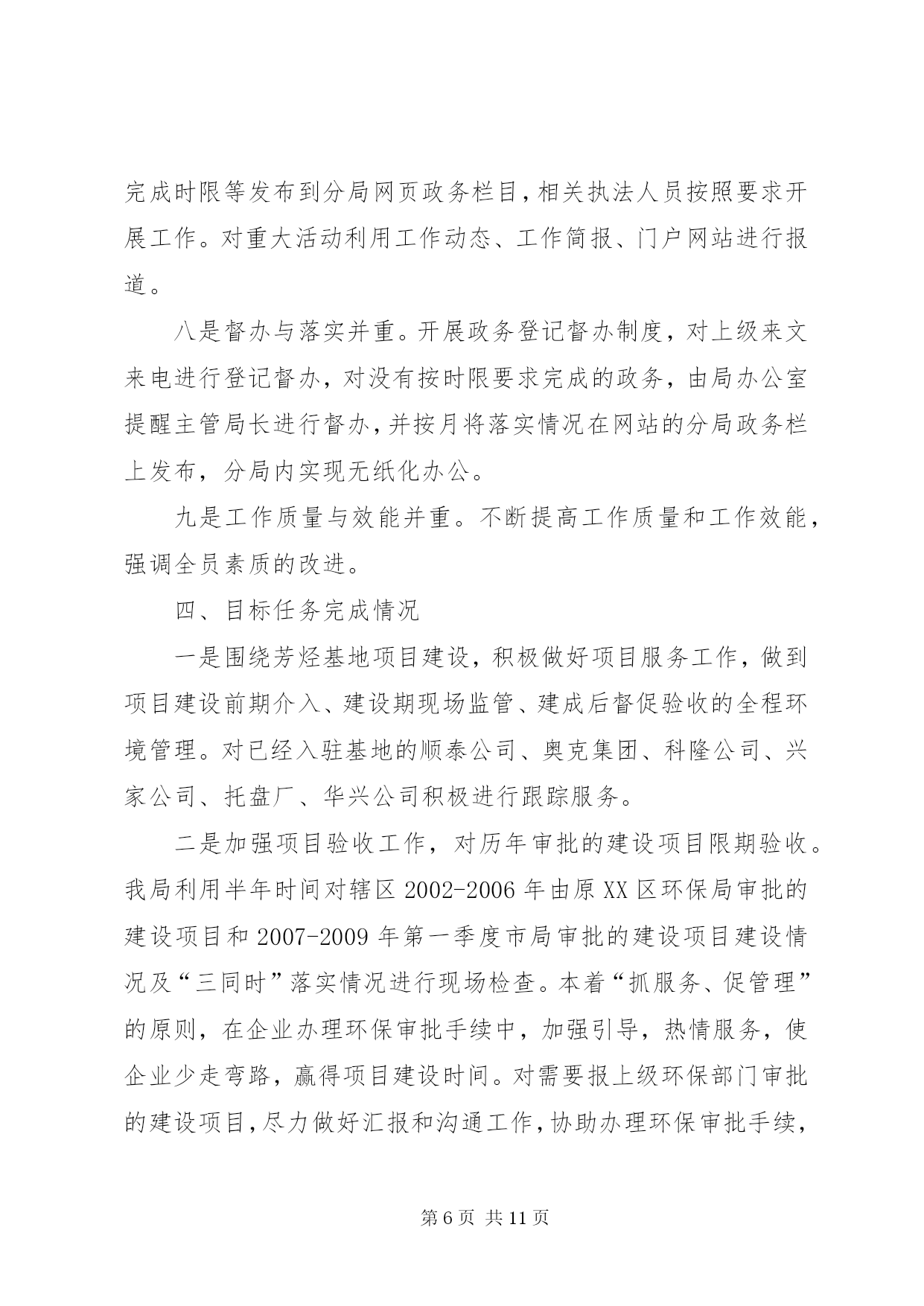第PAGE\*Arabic\*MERGEFORMAT11页共NUMPAGES\*MERGEFORMAT11页环保分局述职述廉报告在市环保局党组和机关党委的正确领导下,XX分局始终与局党组保持高度一致的政治方向,牢固树立大局意识,不折不扣的落实和完成市环保局、区委、区政府和管委会的决议、要求,没有出现延误、不作为现象。分局一班人紧紧围绕芳烃基地建设、新开河综合治理和污水处理厂建设及农村环境综合整治工作,加强环境监管,切实削减主要污染物排放总量,深入开展区域流域环境整治,缜密落实市局年度工作计划和《2009年度XX区环境保护工作计划》,扎实推进XX区政府批准实施的地表水、大气、减排、农村环境综合整治四大实施方案,自觉履行市环保局党组年初对XX分局提出的“务实、开拓、创新、前瞻”八字要求,进一步提升环境管理水平,为XX区经济跨越式发展做出了积极的贡献。下面我代表XX分局领导班子做述职述廉报告。一、坚持科学决策,促进依法行政一是认真贯彻落实区政府批准实施的《XX市XX区农村环境保护工作实施方案》等4个整治计划要求,做到环境管理有依据、有组织、有目标、有完成时限。要求22家规模以上企业及8家燃煤大户淘汰落后燃烧工艺,使用低硫煤和清洁能源,耗煤情况实施月报制度,确保2009年燃煤使用量不高于2007年耗煤量,取缔11家1吨以下燃煤锅炉,强制推广使用清洁能源。对新开河、前进河、石场峪河实行“河长”制。新开河实施污水干管截流,截至目前已完成5720延长米,占计划的53.3%。切实开展农村环保工作,积极争取外资,实施农村环境综合整治,认真组织实施《XX市XX区农村环境保护工作实施方案》,环保“民生工程”取得实效。二是积极争取政策资金支持,改善辖区环境质量。1、省环保厅投资3200万元建设污水处理厂,6月30日试水调试,使工程减排落到实处,对完成减排任务起着重要作用。2、2008年中央农村环保专项资金90万元和省环保专项资金200万元用于前进村环境综合整治,重点支持河道清淤护砌绿化工程、生活污水、生活垃圾转运站工程、畜禽养殖粪便堆肥三大治理工程。前进村已被列为第二批“环保攻坚惠民”试点村,将继续开展下一步治理工作。3、市环保局投入350万元对新开河污染进行清淤等彻底整治。4、积极协调可口可乐公司、联合国开发计划署(undp)等部门出资为村民建设深井并提供技术支持解决村民吃难水问题,计划一期投入25万元,目前资金已经到位20万元,深井已经开工建设,新井建成后将改变以往的用水机制。此项目预计7月末竣工并接受项目相关方的验收。5、组织南八里村申报市级环保资金,启动生态村建设。对生活垃圾、生活污水、畜禽养殖粪便污染进行环境综合整。在项目实施的过程中,充分发挥技术监督、工程指导作用,会同区财政局按工程进度拨付资金,确保资金全部用于环境整治。三是加大对建设项目环境违法行为和企业违法排污行为等查处力度。对龙石风景旅游区内的生活污染源、工业污染源依法进行整治,确保景区环境质量。辖区内实施排污口规范化整治,目前已经完成全区40家企业排污口整治。加大XX县区噪声控制力度,加强建筑施工行业噪声监控,避免夜间扰民,对居民住宅区内产生噪声污染的企业,及时查处整改,圆满完成“两考”禁噪任务。在执法过程中,文明执法,严格执法程序,树立良好执法形象,今年我局认真开展法律“六进”活动,并将作为全市法制试点区。截至目前分局立案处罚违法排污企业20家,累计处罚额度12.5万元,案卷卷宗已经市局法规科检查验收。二、严格执行民主集中制,定期召开支部和班子会议一是定期召开支部会议研究解决重大事项,认真落实机关党委各项要求,不走过场,事事落到实处;二是定期召开党员大会,组织学习市局统一安排的政治学习计划和分局业务培训计划,提高全局整体素质,做到又红又专;三是每周充分征求各科长(主任)、主管局长意见制定下周工作计划,每月月末班子成员专题研究制定下月工作计划。各负其责,各司其职,自觉履行各自职责,落实分局各项工作任务。三、统筹协调、务实创新,充分体现“9个并重”原则分局网页做到每日更新,得到市局党组、区委区政府的好评;两次修订分局政务职责手册,使分局内每个同志做到职、责清晰;编制报送XX区环保工作手册、普查文件汇总、高XX县区33家污染企业基本情况汇编等,全面了解辖区环境质量状况和污染源分布;及时报送XX区工作动态,充分利用工作动态,加大环境宣传力度。一是党政工作并重。坚持半年聘请社会知名人士做1次政治或学术报告,每月最后一周周末进行业务学习,由分局每个同志进行轮流业务演讲,有计划的提高全员素质,带好队伍。上半年分局6名同志就自己分担的具体业务进行了系统演讲,同时,聘请市人大沈建清副秘书长为全局干部职工做《学习实践科学发展观,打好节能减排攻坚战》的专题报告。二是XX县区