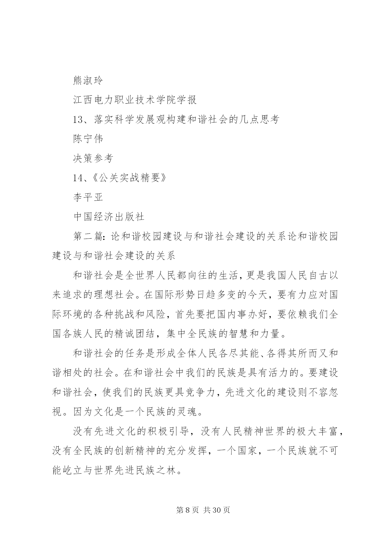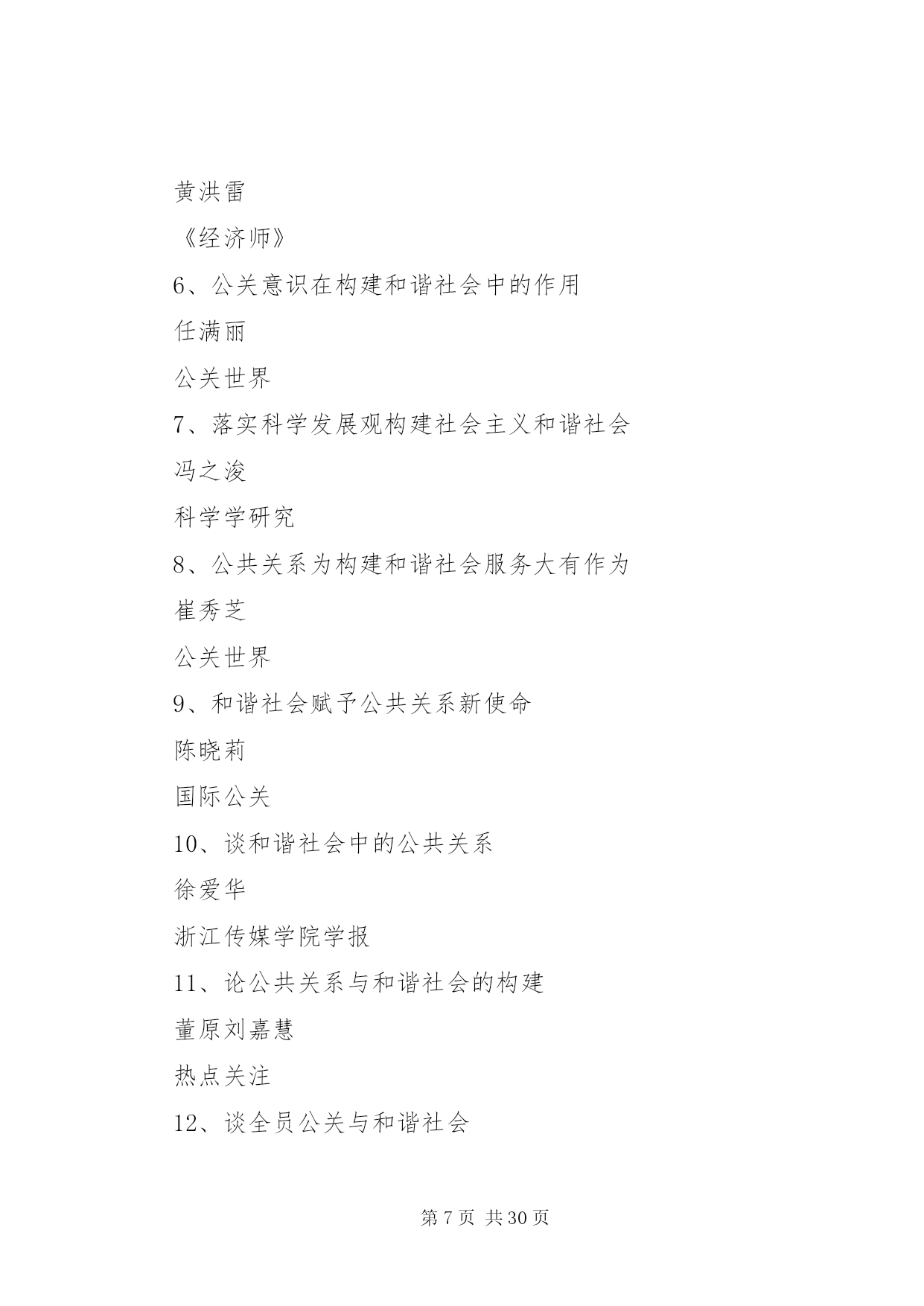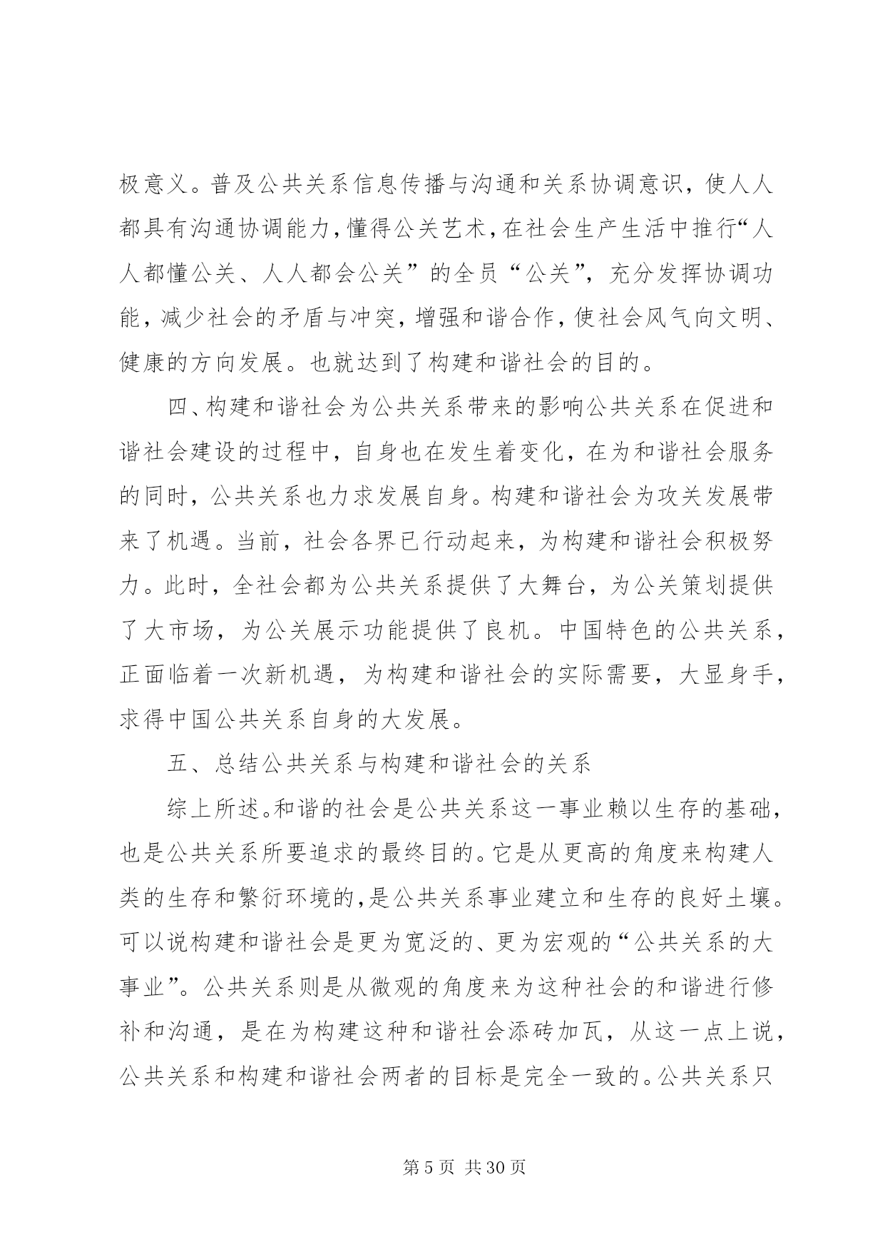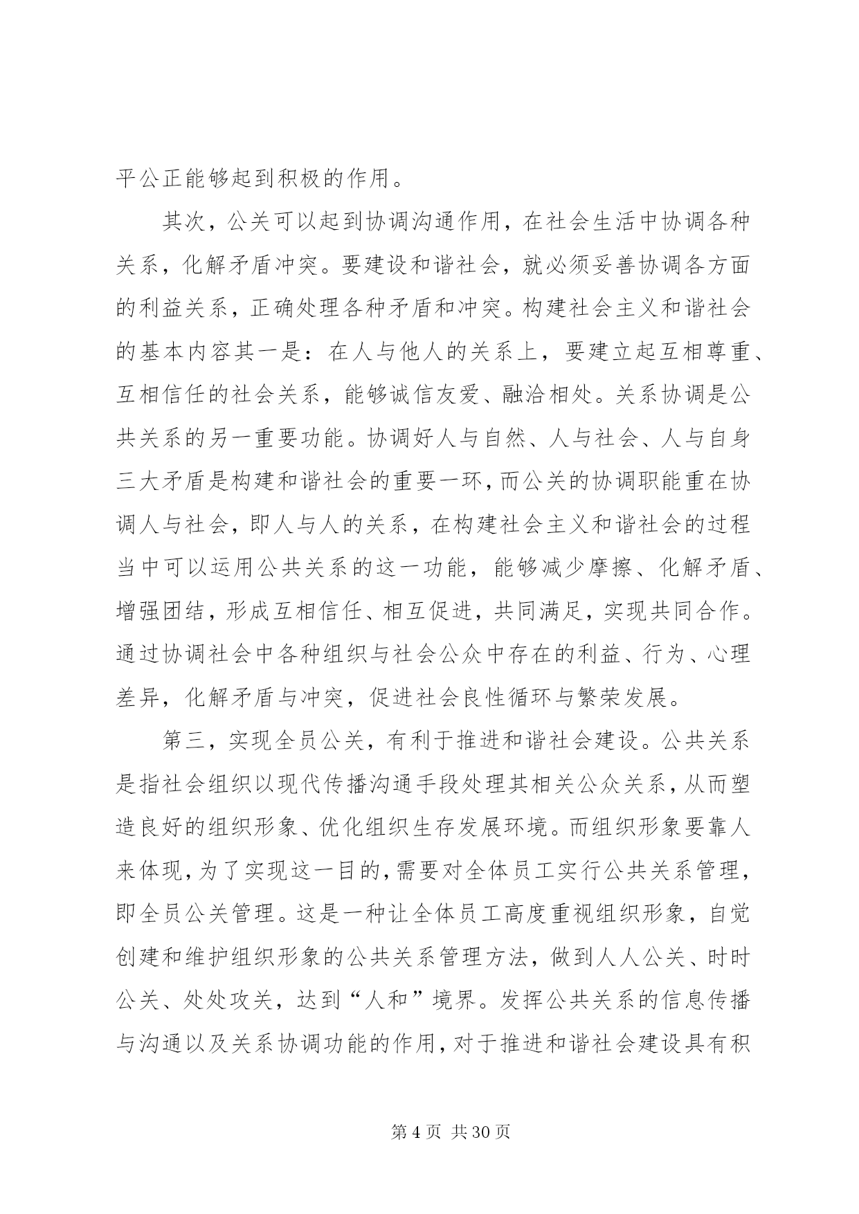 第PAGE\*Arabic\*MERGEFORMAT30页共NUMPAGES\*MERGEFORMAT30页论公共关系与和谐社会建设摘要。构建社会主义和谐社会,是我国全面建设小康社会、开创中国特色社会主义事业新局面的一项重大任务,适应了我国改革发展进入关键时期的客观要求,体现了广大人民群众的根本利益和共同愿望。公共关系作为组织内求团结、外求合作的传播沟通艺术,正是一种追求和谐发展的艺术。本文从公共关系与和谐社会构件的关系出发,通过分析二者之间的联系,阐述了公共关系在和谐社会的建设中所发挥的作用以及和谐社会的建设给公共关系事业带来的影响。关键词:公共关系和谐社会建设作用影响关系一、公关的涵义、特征、职能要了解公共关系与社会主义和谐社会之间的关系必须大概了解公共关系到底是研究什么的科学,它的特征和职能是什么,才能了解它对于构建社会主义和谐社会有何意义,以及构建社会主义和谐社会对它的发展有何影响。公共关系学产生于西方工业发达国家,它虽然没有悠久的历史,但由于它具有促进经济、政治、文化发展的独特功能,越来越广泛地被应用于社会生活的各个领域,成为风靡世界的现代思潮。但是到目前为止,还没有一个公认的公共关系的定义,只能对其涵义进行大概的表述,公共关系是一个社会组织在运行中,为使自己与公众相互了解、相互合作,采取传播、沟通手段争取公众的科学与艺术。公共关系的特征大概有以下几个方面。以公众为对象、以美誉为目标、以互惠为原则、以长远为方针、以真诚为信条、以沟通为手段。公共关系的职能广泛而复杂,是公共关系对社会组织所发挥的独特的、积极的作用,具体可归纳为以下几个方面:1、搜集信息,组织宣传2、监测环境,咨询决策3、协调沟通,处理危机4、创建文化,树立形象。二、构建和谐社会的涵义和谐社会的构建需要达到一个目标,而在我们研究如何构建和谐社会之前,必须明确和谐社会要达到的目标是什么,才能开展具体的建设工作。和谐社会的基本内涵以及理想目标可以概括为:从根本意义上讲,和谐社会是指人与自然、人与社会、人与自身三大矛盾的全面和谐的社会。和谐社会是一个多元的社会,一个宽容的社会,一个秩序化的社会,是公民、社会和政府相互支持配合的社会。构建社会主义和谐社会,是党中央在全面建设小康社会的新的历史时期,明确提出的重大任务,要求全党同志要建设具有中国特色的社会主义和谐社会,使社会主义物质文明、政治文明、文化建设与社会建设全面发展,贯彻落实科学发展观,又快又好地推进社会主义全面可持续发展。实现这一理想目标可以借助公共关系事业加以促进和改善。三、公共关系在构建和谐社会中发挥的作用从某种意义上说,创建和谐社会的过程就是不断寻求、建立、完善一套能够不断解决社会矛盾和化解社会冲突的有效管理机制的过程。公共关系的信息传播沟通和关系协调功能,不仅对营造组织与相关公众的和谐关系能够起到良好的作用,而且可以对构建整个社会主义和谐社会发挥积极的作用。公共关系对于构建和谐社会发挥的积极作用可以从以下几个方面进行阐述:首先,公关有助于信息传播,实现公平公正。在构建社会主义和谐社会的过程中,实现信息真实、有效、及时地传播与沟通,对于促进各种自然和社会资源的合理分配与可持续利用;对于建立符合和谐社会目标要求的,以权力公平、机会公平、规则公平、分配公平和人道主义公平为主要内容的社会公平保障机制,具有重要的意义。而信息的传播与沟通正是贯穿整个公共关系活动的一条主线,是公共关系的重要功能,对于消除“信息不对称”,实现信息公开、畅通传播,进而促进社会的公平公正能够起到积极的作用。其次,公关可以起到协调沟通作用,在社会生活中协调各种关系,化解矛盾冲突。要建设和谐社会,就必须妥善协调各方面的利益关系,正确处理各种矛盾和冲突。构建社会主义和谐社会的基本内容其一是:在人与他人的关系上,要建立起互相尊重、互相信任的社会关系,能够诚信友爱、融洽相处。关系协调是公共关系的另一重要功能。协调好人与自然、人与社会、人与自身三大矛盾是构建和谐社会的重要一环,而公关的协调职能重在协调人与社会,即人与人的关系,在构建社会主义和谐社会的过程当中可以运用公共关系的这一功能,能够减少摩擦、化解矛盾、增强团结,形成互相信任、相互促进,共同满足,实现共同合作。通过协调社会中各种组织与社会公众中存在的利益、行为、心理差异,化解矛盾与冲突,促进社会良性循环与繁荣发展。第三,实现全员公关,有利于推进和谐社会建设。公共关系是指社会组织以现代传播沟通手段处理其相关公众关系,从而塑造良好的组织形象、优化组织生存发展环境。而组织形象要靠人来体现,为了实现这一目的,需要对全体员工实行公共关系管理,即全员公关管理。这是一种让全体员工高度重视组织形象,自觉创建和维护组织形象的公共关系管理方法,做到人人公关、时时公关、处处攻关,达到“