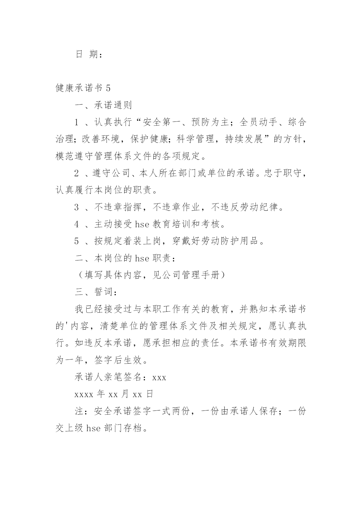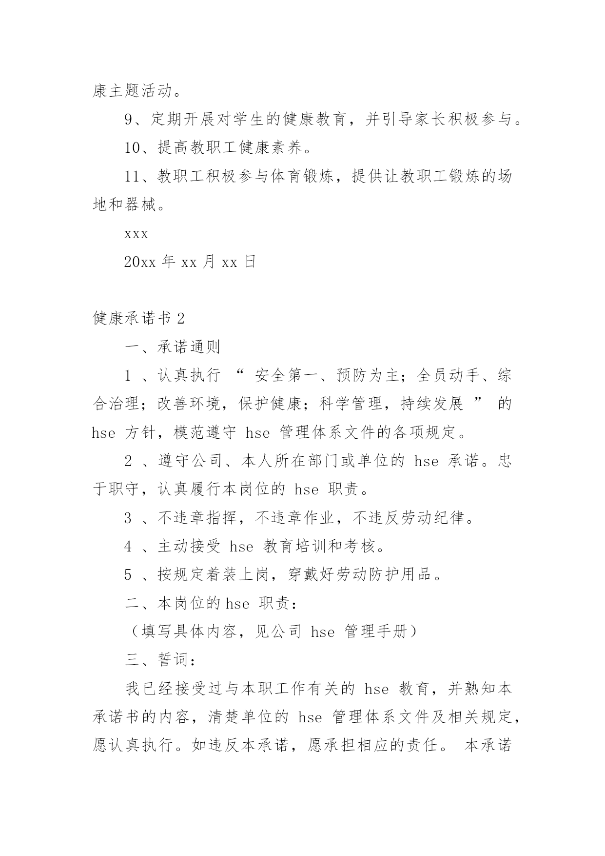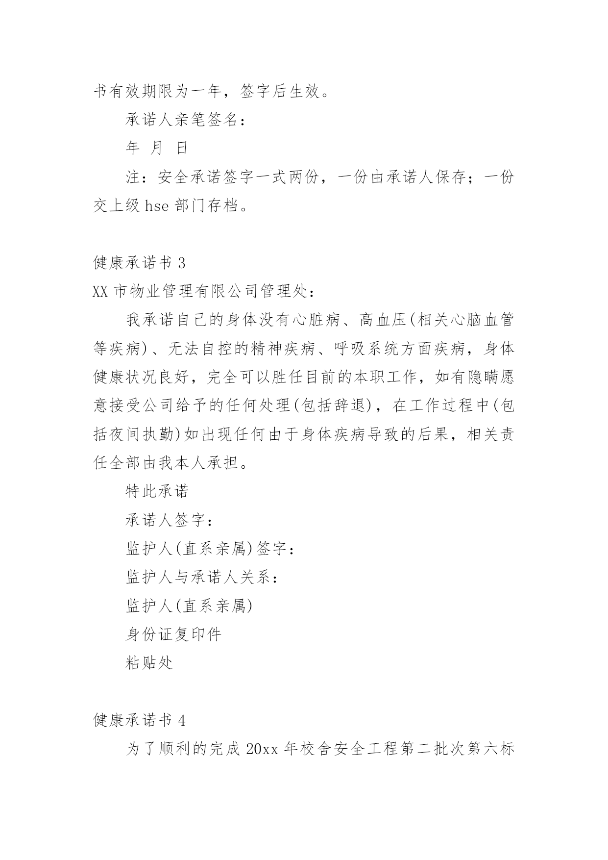 健康承诺书在日常生活和工作中,承诺书在我们的视野里出现的频率越来越高,承诺书是单方意思表示,不具有合同效力。那么一般承诺书是怎么写的呢?以下是小编为大家收集的健康承诺书,欢迎阅读,希望大家能够喜欢。健康承诺书1上海市青浦区淀山湖小学公开承诺创建“健康促进学校”,承诺如下:1、我校倡导全体师生参与健康学校建设,积极引导家长共同参与。2、成立“健康促进学校领导小组”,由校长、工会主席、总务处、德育处、少先队大队部、各班班主任组成。明确职责分工,定期召开例会。3、将健康学校建设纳入学校发展规划,制定促进居民健康的规章制度和相关措施。4、由校长负责健康学校工作,有工作计划和总结,健康活动有记录。5、建设无烟环境。6、保持自然环境整洁,营造促进健康的社会人文环境。7、基层医疗卫生机构深入学校,为幼儿提供体检、视力检测、龋齿检查等基本服务。8、学校组织教职工参加各类健康讲座和多种形式的健康主题活动。9、定期开展对学生的健康教育,并引导家长积极参与。10、提高教职工健康素养。11、教职工积极参与体育锻炼,提供让教职工锻炼的场地和器械。xxx20xx年xx月xx日健康承诺书2一、承诺通则1、认真执行“安全第一、预防为主;全员动手、综合治理;改善环境,保护健康;科学管理,持续发展”的hse方针,模范遵守hse管理体系文件的各项规定。2、遵守公司、本人所在部门或单位的hse承诺。忠于职守,认真履行本岗位的hse职责。3、不违章指挥,不违章作业,不违反劳动纪律。4、主动接受hse教育培训和考核。5、按规定着装上岗,穿戴好劳动防护用品。二、本岗位的hse职责:(填写具体内容,见公司hse管理手册)三、誓词:我已经接受过与本职工作有关的hse教育,并熟知本承诺书的内容,清楚单位的hse管理体系文件及相关规定,愿认真执行。如违反本承诺,愿承担相应的责任。本承诺书有效期限为一年,签字后生效。承诺人亲笔签名:年月日注:安全承诺签字一式两份,一份由承诺人保存;一份交上级hse部门存档。健康承诺书3XX市物业管理有限公司管理处:我承诺自己的身体没有心脏病、高血压(相关心脑血管等疾病)、无法自控的精神疾病、呼吸系统方面疾病,身体健康状况良好,完全可以胜任目前的本职工作,如有隐瞒愿意接受公司给予的任何处理(包括辞退),在工作过程中(包括夜间执勤)如出现任何由于身体疾病导致的后果,相关责任全部由我本人承担。特此承诺承诺人签字:监护人(直系亲属)签字:监护人与承诺人关系:监护人(直系亲属)身份证复印件粘贴处健康承诺书4为了顺利的完成20xx年校舍安全工程第二批次第六标段(丰台八中)的施工任务,特承诺保证如下:第一条施工现场应围挡整齐,沿街及重要部位须按建设单位要求设置,并保证安全美观,施工标语内容须征得建设单位认可;现场布局合理整洁,无杂草、积水、异味,场内道路必须保证畅通;各种材料应堆放整齐,施工垃圾须定点堆放,及时清运,严禁在施工现场以外堆放材料、垃圾。第二条施工现场布局及工序安排应考虑噪声、照明控制,严格按照北京市有关规定执行,避免扰民;施工现场必须设置专用厕所,并有专人管理,严禁随意大小便;生活、生产废水及施工废水未处理合格,不得排入学校下水道;不得破坏校园里的树木、绿地;土方外运过程,严格按程序操作,不得在校内外遗洒,同时应有避免扬尘的措施。第三条外地施工人员必须办理相关证件,禁止非施工单位人员在工地留宿,施工现场禁止聚众打牌、饮酒闹事、传阅淫秽物品;禁止施工人员在非施工区随意走动,严禁和学生、教职工发生冲突。第四条施工车辆进出丰台八中时注意校园交通安全,必须缓速行驶,大型机械进出场应提前和建设单位协商,避开校园交通高峰期,必须封路施工时,须征得建设单位同意,并在路口设置明显的提示标志。第五条施工现场临时用电必须符合《施工现场临时用电安全技术规范》,固定式配电箱应设置围栏并有明显的安全警示标,严禁非专业人员接拆电线,防止发生触电事故,严禁使用电炉子等妨碍现场安全的用电设备。第六条现场消火栓及其他消防器材配备齐全、位置合理,应有明显的警示标志,严禁挪用,保证消防道路畅通;施工现场严禁吸烟,剧毒、易燃易爆物品及施工动火必须有专人负责管理。第七条现场施工人员须统一着装、佩带胸卡,严禁闲杂人员进入施工现场;进入施工现场必须佩带安全帽(红色为业主专用颜色),高空作业必须系好安全带,严禁工人酒后上岗,严禁攀爬脚手架,高处作业严禁向下抛掷物品。第八条脚手架搭设、基坑支护及塔吊、升降梯等大型机械安装必须有上级主管安全部门审批的施工方案,各种施工机械的合格证、检测证及安全防护装置齐全,杜绝发生高空坠物、土方坍塌等一切施工安全事故。第九条工人食堂必须干净整洁,无蝇无鼠,操作人员证件齐全,认真执行食品卫生安全的有关规定,严防工人食物中毒;施工人员宿舍要求卫生整洁,严禁随意拉扯电