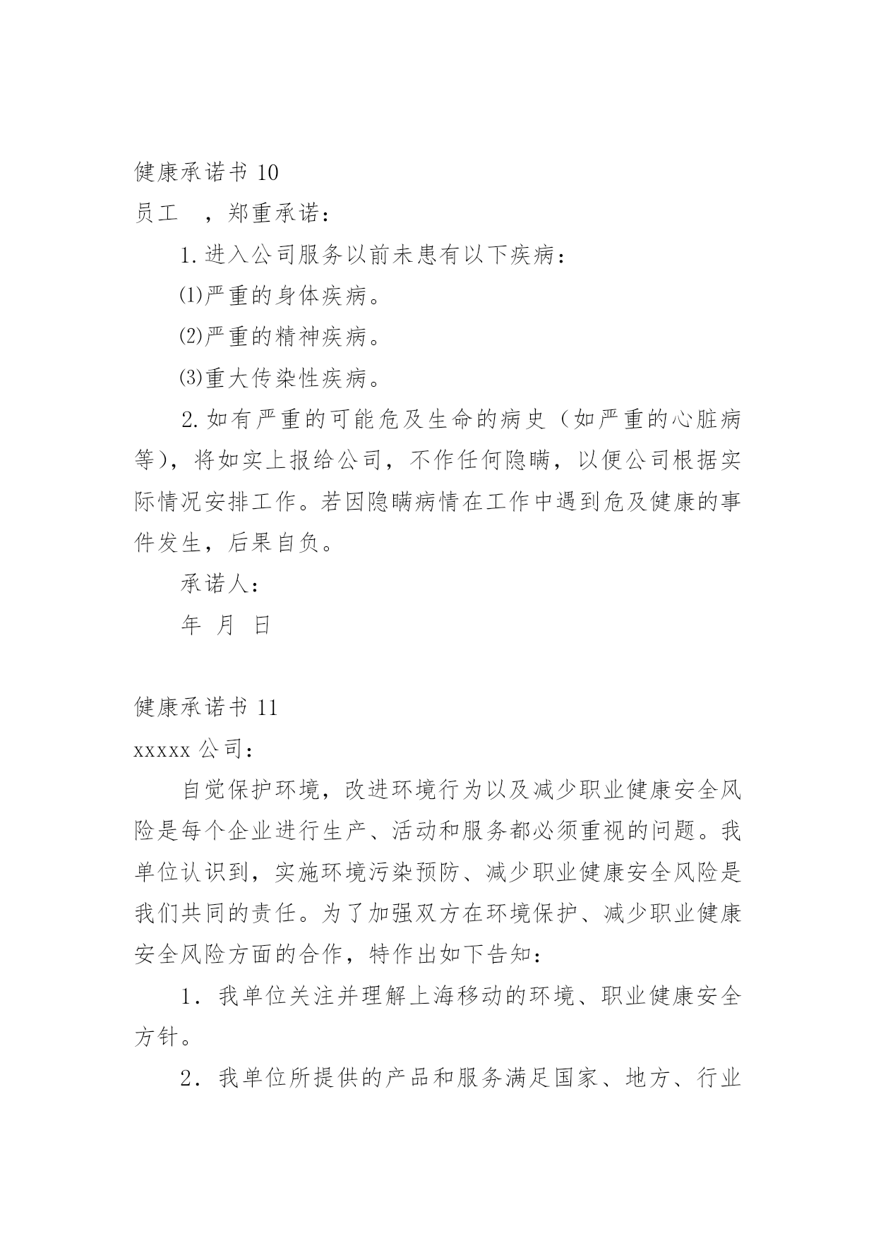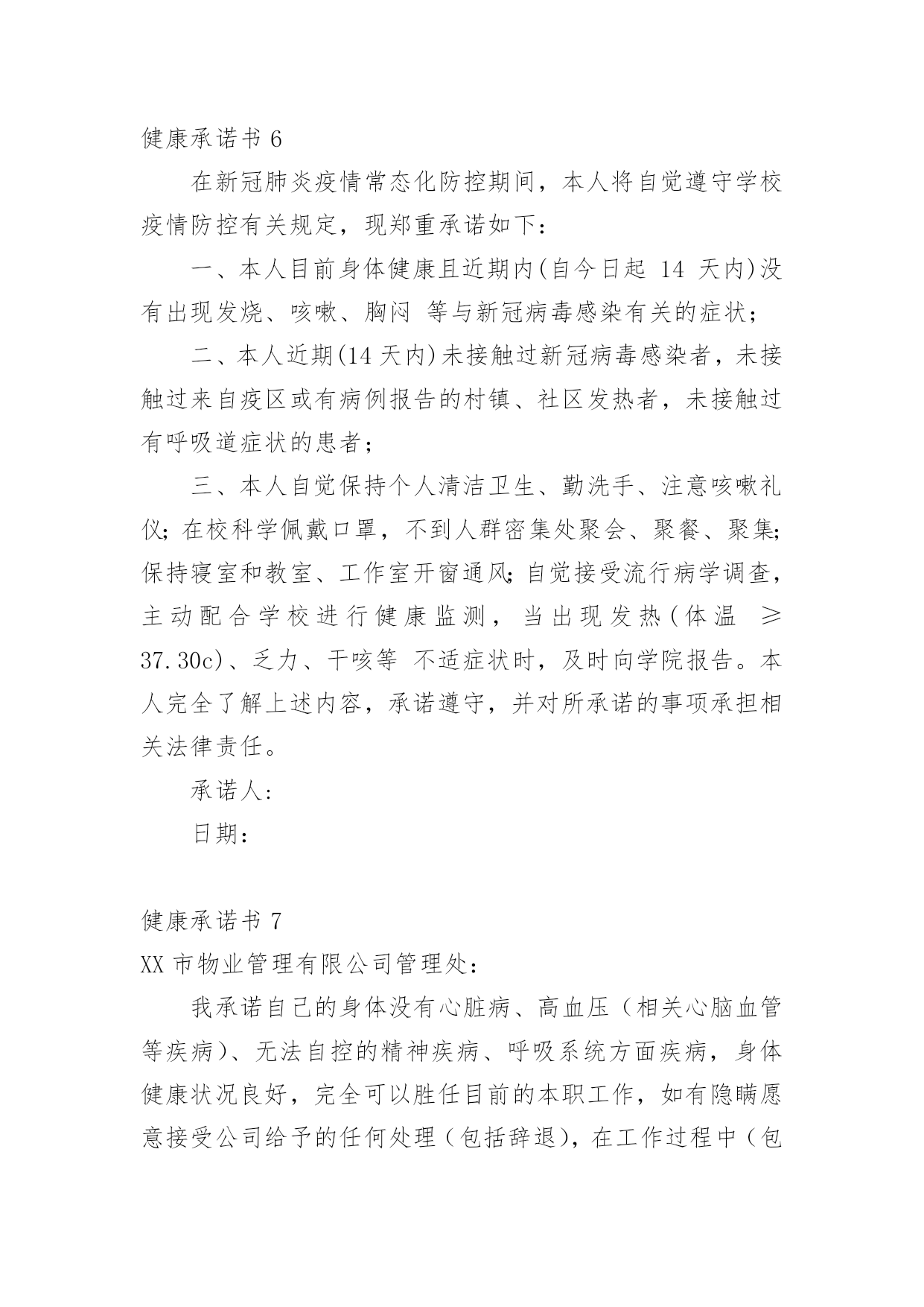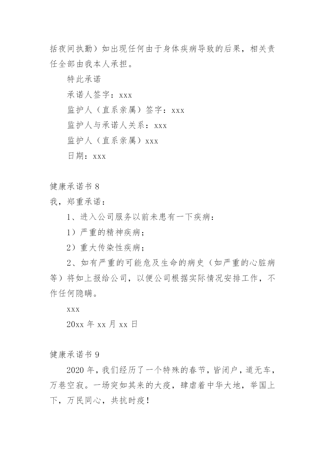 健康承诺书在日常生活和工作中,承诺书在我们的视野里出现的频率越来越高,承诺书是单方意思表示,不具有合同效力。那么一般承诺书是怎么写的呢?以下是小编为大家收集的健康承诺书,欢迎阅读,希望大家能够喜欢。健康承诺书1上海市青浦区淀山湖小学公开承诺创建“健康促进学校”,承诺如下:1、我校倡导全体师生参与健康学校建设,积极引导家长共同参与。2、成立“健康促进学校领导小组”,由校长、工会主席、总务处、德育处、少先队大队部、各班班主任组成。明确职责分工,定期召开例会。3、将健康学校建设纳入学校发展规划,制定促进居民健康的规章制度和相关措施。4、由校长负责健康学校工作,有工作计划和总结,健康活动有记录。5、建设无烟环境。6、保持自然环境整洁,营造促进健康的社会人文环境。7、基层医疗卫生机构深入学校,为幼儿提供体检、视力检测、龋齿检查等基本服务。8、学校组织教职工参加各类健康讲座和多种形式的健康主题活动。9、定期开展对学生的健康教育,并引导家长积极参与。10、提高教职工健康素养。11、教职工积极参与体育锻炼,提供让教职工锻炼的场地和器械。xxx20xx年xx月xx日健康承诺书2一、承诺通则1、认真执行“安全第一、预防为主;全员动手、综合治理;改善环境,保护健康;科学管理,持续发展”的hse方针,模范遵守hse管理体系文件的各项规定。2、遵守公司、本人所在部门或单位的hse承诺。忠于职守,认真履行本岗位的hse职责。3、不违章指挥,不违章作业,不违反劳动纪律。4、主动接受hse教育培训和考核。5、按规定着装上岗,穿戴好劳动防护用品。二、本岗位的hse职责:(填写具体内容,见公司hse管理手册)三、誓词:我已经接受过与本职工作有关的hse教育,并熟知本承诺书的内容,清楚单位的hse管理体系文件及相关规定,愿认真执行。如违反本承诺,愿承担相应的责任。本承诺书有效期限为一年,签字后生效。承诺人亲笔签名:年月日注:安全承诺签字一式两份,一份由承诺人保存;一份交上级hse部门存档。健康承诺书3XX市物业管理有限公司管理处:我承诺自己的身体没有心脏病、高血压(相关心脑血管等疾病)、无法自控的精神疾病、呼吸系统方面疾病,身体健康状况良好,完全可以胜任目前的本职工作,如有隐瞒愿意接受公司给予的任何处理(包括辞退),在工作过程中(包括夜间执勤)如出现任何由于身体疾病导致的后果,相关责任全部由我本人承担。特此承诺承诺人签字:监护人(直系亲属)签字:监护人与承诺人关系:监护人(直系亲属)身份证复印件粘贴处健康承诺书4为了顺利的完成20xx年校舍安全工程第二批次第六标段(丰台八中)的施工任务,特承诺保证如下:第一条施工现场应围挡整齐,沿街及重要部位须按建设单位要求设置,并保证安全美观,施工标语内容须征得建设单位认可;现场布局合理整洁,无杂草、积水、异味,场内道路必须保证畅通;各种材料应堆放整齐,施工垃圾须定点堆放,及时清运,严禁在施工现场以外堆放材料、垃圾。第二条施工现场布局及工序安排应考虑噪声、照明控制,严格按照北京市有关规定执行,避免扰民;施工现场必须设置专用厕所,并有专人管理,严禁随意大小便;生活、生产废水及施工废水未处理合格,不得排入学校下水道;不得破坏校园里的树木、绿地;土方外运过程,严格按程序操作,不得在校内外遗洒,同时应有避免扬尘的措施。第三条外地施工人员必须办理相关证件,禁止非施工单位人员在工地留宿,施工现场禁止聚众打牌、饮酒闹事、传阅淫秽物品;禁止施工人员在非施工区随意走动,严禁和学生、教职工发生冲突。第四条施工车辆进出丰台八中时注意校园交通安全,必须缓速行驶,大型机械进出场应提前和建设单位协商,避开校园交通高峰期,必须封路施工时,须征得建设单位同意,并在路口设置明显的提示标志。第五条施工现场临时用电必须符合《施工现场临时用电安全技术规范》,固定式配电箱应设置围栏并有明显的安全警示标,严禁非专业人员接拆电线,防止发生触电事故,严禁使用电炉子等妨碍现场安全的用电设备。第六条现场消火栓及其他消防器材配备齐全、位置合理,应有明显的警示标志,严禁挪用,保证消防道路畅通;施工现场严禁吸烟,剧毒、易燃易爆物品及施工动火必须有专人负责管理。第七条现场施工人员须统一着装、佩带胸卡,严禁闲杂人员进入施工现场;进入施工现场必须佩带安全帽(红色为业主专用颜色),高空作业必须系好安全带,严禁工人酒后上岗,严禁攀爬脚手架,高处作业严禁向下抛掷物品。第八条脚手架搭设、基坑支护及塔吊、升降梯等大型机械安装必须有上级主管安全部门审批的施工方案,各种施工机械的合格证、检测证及安全防护装置齐全,杜绝发生高空坠物、土方坍塌等一切施工安全事故。第九条工人食堂必须干净整洁,无蝇无鼠,操作人员证件齐全,认真执行食品卫生安全的有关规定,严防工人食物中毒;施工人员宿舍要求卫生整洁,严禁随意拉扯电
