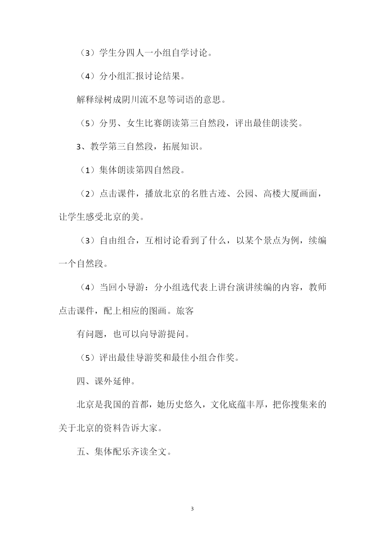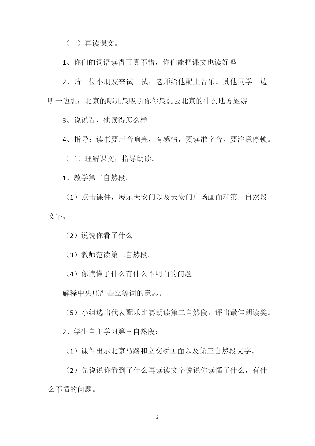 PAGEPAGE4《北京》教学设计2教学目标:1、认识央、瓦等13个生字。会写央、交等字。2、激发学生热爱首都北京的情感。3、能正确、有感情地朗读课文,背诵自己喜欢部分。教学准备CAI课件、课前布置学生生搜集关于北京的资料。教学过程:一、谈话导入。1、课件出示北京行政图。今天老师就要带同学们到北京去旅游一番。2、板书课题,齐读课题。二、初读课文,学习生字。1、同学们把课文试着读一遍,并划出生字。2、读准生字的字音,再将生字连成词读一读。(出示词语)3、轮流当小老师带大家读词语,愿意读哪个就读哪个。4、全体齐读词语。三、再读课文,理解新知,指导朗读。(一)再读课文。1、你们的词语读得可真不错,你们能把课文也读好吗2、请一位小朋友来试一试,老师给他配上音乐。其他同学一边听一边想:北京的哪儿最吸引你你最想去北京的什么地方旅游3、说说看,他读得怎么样4、指导:读书要声音响亮,有感情,要读准字音,要注意停顿。(二)理解课文,指导朗读。1、教学第二自然段:(1)点击课件,展示天安门以及天安门广场画面和第二自然段文字。(2)说说你看了什么(3)教师范读第二自然段。(4)你读懂了什么有什么不明白的问题解释中央庄严矗立等词的意思。(5)小组选出代表配乐比赛朗读第二自然段,评出最佳朗读奖。2、学生自主学习第三自然段:(1)课件出示北京马路和立交桥画面以及第三自然段文字。(2)先说说你看到了什么再读读文字说说你读懂了什么,有什么不懂的问题。(3)学生分四人一小组自学讨论。(4)分小组汇报讨论结果。解释绿树成阴川流不息等词语的意思。(5)分男、女生比赛朗读第三自然段,评出最佳朗读奖。3、教学第三自然段,拓展知识。(1)集体朗读第四自然段。(2)点击课件,播放北京的名胜古迹、公园、高楼大厦画面,让学生感受北京的美。(3)自由组合,互相讨论看到了什么,以某个景点为例,续编一个自然段。(4)当回小导游:分小组选代表上讲台演讲续编的内容,教师点击课件,配上相应的图画。旅客有问题,也可以向导游提问。(5)评出最佳导游奖和最佳小组合作奖。四、课外延伸。北京是我国的首都,她历史悠久,文化底蕴丰厚,把你搜集来的关于北京的资料告诉大家。五、集体配乐齐读全文。