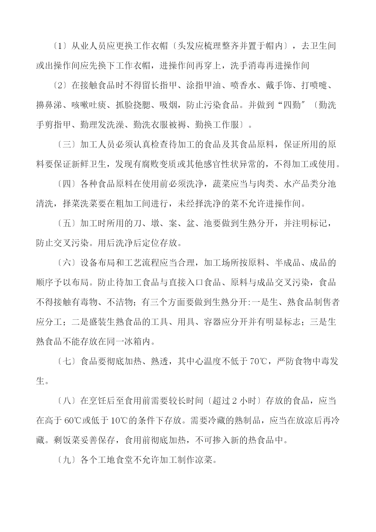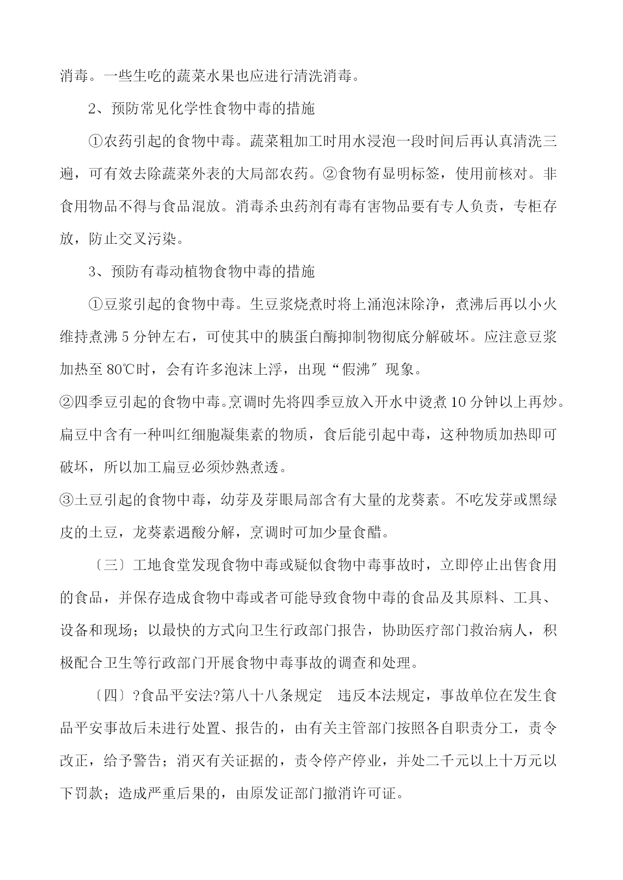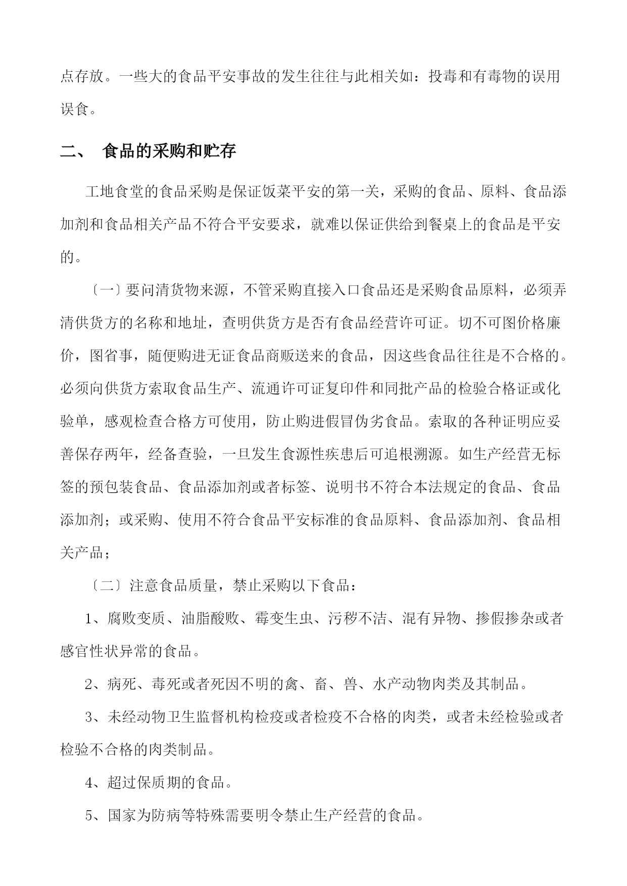 工地食堂食品安全知识培训讲义解析【完整版】(文档可以直接使用,也可根据实际需要修订后使用,可编辑放心下载)******(集体宿舍)工程食堂食品平安知识培讲义*********工程工程部工地食堂食品平安知识培训讲义TOC\o"1-1"\h\uHYPERLINK\l_Toc16209一、食品平安管理PAGEREF_Toc162091HYPERLINK\l_Toc23022二、食品的采购和贮存PAGEREF_Toc230222HYPERLINK\l_Toc16092三、食品加工的卫生要求PAGEREF_Toc160923HYPERLINK\l_Toc1782四、餐饮具的卫生PAGEREF_Toc17825HYPERLINK\l_Toc19047五、食物中毒相关知识及预防PAGEREF_Toc190475HYPERLINK\l_Toc27524六、关键环节PAGEREF_Toc275248工地食堂食品平安知识培训讲义一、食品平安管理〔一〕工地食堂必须先取得餐饮效劳许可证前方可营业,未取得餐饮效劳许可证的不得从事餐饮效劳经营活动。如果未取得餐饮效劳许可证擅自开业就违反了?食品平安法?第29条规定,依据?食品平安法?第84条,:违反本法规定,未经许可从事食品生产经营活动,没收违法所得、违法生产经营的食品、食品添加剂和用于违法生产经营的工具、设备、原料等物品;违法生产经营的食品、食品添加剂货值金额缺乏一万元的,并处二千元以上五万元以下罚款;货值金额一万元以上的,并处货值金额五倍以上十倍以下罚款。被撤消餐饮效劳许可证的单位,根据第九十二条规定其直接负责的主管人员自处分决定作出之日起五年内不得从事食品生产经营管理工作。〔二〕食品生产经营者应当建立并执行从业人员健康管理制度。食品生产经营人员每年应当进行健康检查,取得健康证明前方可从事接触食品的工作。患有痢疾、伤寒、病毒性肝炎〔甲肝、戊肝〕等消化道传染病的人员,以及患有活动性肺结核、化脓性或者渗出性皮肤病等有碍食品平安的疾病的人员,不得从事接触直接入口食品的工作。〔三〕工地食堂加工经营场所应当保持内外环境整洁,采取有效措施,消除老鼠、蟑螂、苍蝇和其它有害昆虫及其孳生条件。与有毒、有害场所保持规定的距离,。〔四〕成立食品平安管理组织,建立健全各项食品平安管理制度,配备专职或者兼职的食品平安管理人员。非工作人员不得进入操作间,消杀用品专人定点存放。一些大的食品平安事故的发生往往与此相关如:投毒和有毒物的误用误食。二、食品的采购和贮存工地食堂的食品采购是保证饭菜平安的第一关,采购的食品、原料、食品添加剂和食品相关产品不符合平安要求,就难以保证供给到餐桌上的食品是平安的。〔一〕要问清货物来源,不管采购直接入口食品还是采购食品原料,必须弄清供货方的名称和地址,查明供货方是否有食品经营许可证。切不可图价格廉价,图省事,随便购进无证食品商贩送来的食品,因这些食品往往是不合格的。必须向供货方索取食品生产、流通许可证复印件和同批产品的检验合格证或化验单,感观检查合格方可使用,防止购进假冒伪劣食品。索取的各种证明应妥善保存两年,经备查验,一旦发生食源性疾患后可追根溯源。如生产经营无标签的预包装食品、食品添加剂或者标签、说明书不符合本法规定的食品、食品添加剂;或采购、使用不符合食品平安标准的食品原料、食品添加剂、食品相关产品;〔二〕注意食品质量,禁止采购以下食品:1、腐败变质、油脂酸败、霉变生虫、污秽不洁、混有异物、掺假掺杂或者感官性状异常的食品。2、病死、毒死或者死因不明的禽、畜、兽、水产动物肉类及其制品。3、未经动物卫生监督机构检疫或者检疫不合格的肉类,或者未经检验或者检验不合格的肉类制品。4、超过保质期的食品。5、国家为防病等特殊需要明令禁止生产经营的食品。7、其他不符合食品平安标准或者要求的食品。〔三〕食品在入库或使用前应有专人验收,查验产品包装是否破损、漏气、胀气,商标标识〔品名、厂名、产地、生产日期、批号或者代号、规格、配方或者主要成分、保质期限、食用或使用方法〕是否符合要求,核查所购产品与索取的有效凭证是否一致,并建立台帐如实记录食品名称、规格、数量、供货商及其联系方式、进货时间等内容。采购食品应遵循以销定购〔用多少定多少〕的原那么,以保证新鲜和卫生质量,防止不必要的损失。〔四〕贮存食品应做到四防“防尘、防蝇、防鼠、防潮〞,仓库应当通风良好。禁止存放有毒、有害物品及个人生活物品。食品应当按入库时间先后分类、分架、隔墙、离地存放,做到先进先出,尽量缩短贮存的时
