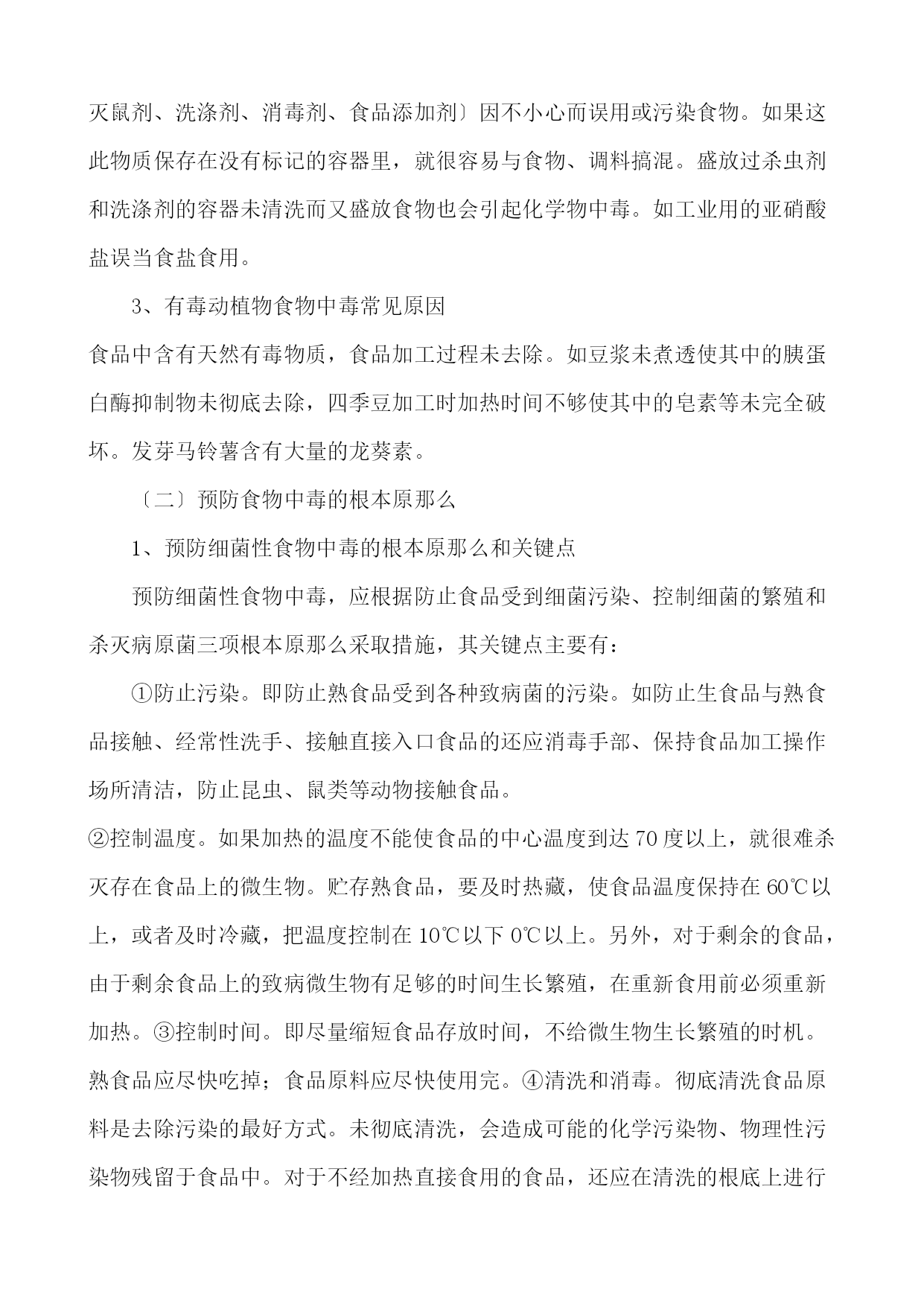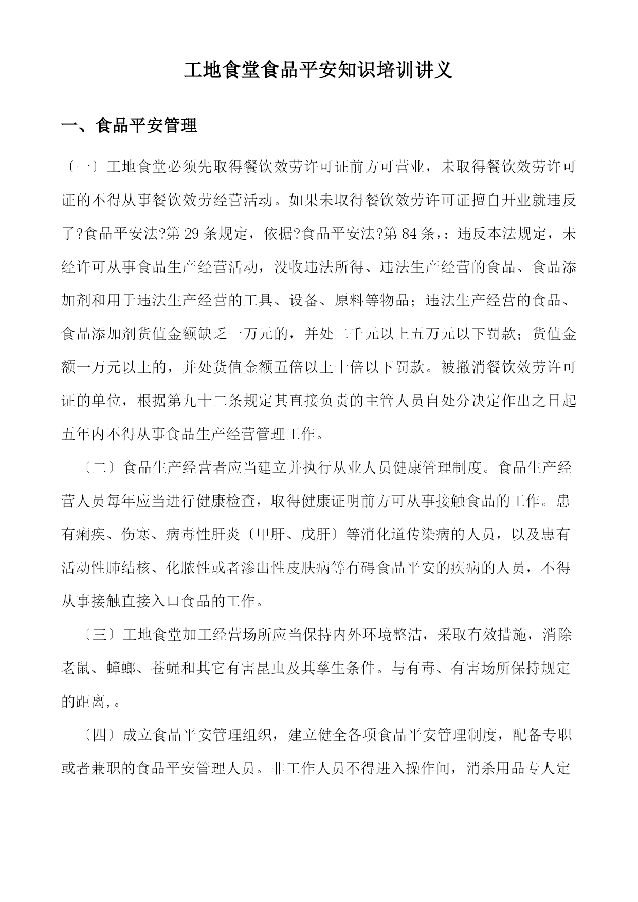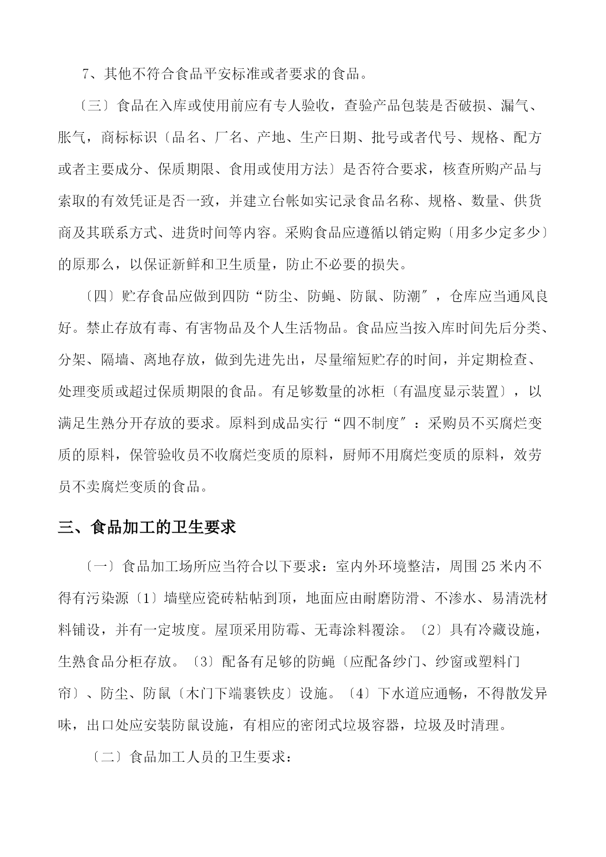 工地食堂食品安全知识培训讲义解析【完整版】(文档可以直接使用,也可根据实际需要修订后使用,可编辑放心下载)******(集体宿舍)工程食堂食品平安知识培讲义*********工程工程部工地食堂食品平安知识培训讲义TOC\o"1-1"\h\uHYPERLINK\l_Toc16209一、食品平安管理PAGEREF_Toc162091HYPERLINK\l_Toc23022二、食品的采购和贮存PAGEREF_Toc230222HYPERLINK\l_Toc16092三、食品加工的卫生要求PAGEREF_Toc160923HYPERLINK\l_Toc1782四、餐饮具的卫生PAGEREF_Toc17825HYPERLINK\l_Toc19047五、食物中毒相关知识及预防PAGEREF_Toc190475HYPERLINK\l_Toc27524六、关键环节PAGEREF_Toc275248工地食堂食品平安知识培训讲义一、食品平安管理〔一〕工地食堂必须先取得餐饮效劳许可证前方可营业,未取得餐饮效劳许可证的不得从事餐饮效劳经营活动。如果未取得餐饮效劳许可证擅自开业就违反了?食品平安法?第29条规定,依据?食品平安法?第84条,:违反本法规定,未经许可从事食品生产经营活动,没收违法所得、违法生产经营的食品、食品添加剂和用于违法生产经营的工具、设备、原料等物品;违法生产经营的食品、食品添加剂货值金额缺乏一万元的,并处二千元以上五万元以下罚款;货值金额一万元以上的,并处货值金额五倍以上十倍以下罚款。被撤消餐饮效劳许可证的单位,根据第九十二条规定其直接负责的主管人员自处分决定作出之日起五年内不得从事食品生产经营管理工作。〔二〕食品生产经营者应当建立并执行从业人员健康管理制度。食品生产经营人员每年应当进行健康检查,取得健康证明前方可从事接触食品的工作。患有痢疾、伤寒、病毒性肝炎〔甲肝、戊肝〕等消化道传染病的人员,以及患有活动性肺结核、化脓性或者渗出性皮肤病等有碍食品平安的疾病的人员,不得从事接触直接入口食品的工作。〔三〕工地食堂加工经营场所应当保持内外环境整洁,采取有效措施,消除老鼠、蟑螂、苍蝇和其它有害昆虫及其孳生条件。与有毒、有害场所保持规定的距离,。〔四〕成立食品平安管理组织,建立健全各项食品平安管理制度,配备专职或者兼职的食品平安管理人员。非工作人员不得进入操作间,消杀用品专人定点存放。一些大的食品平安事故的发生往往与此相关如:投毒和有毒物的误用误食。二、食品的采购和贮存工地食堂的食品采购是保证饭菜平安的第一关,采购的食品、原料、食品添加剂和食品相关产品不符合平安要求,就难以保证供给到餐桌上的食品是平安的。〔一〕要问清货物来源,不管采购直接入口食品还是采购食品原料,必须弄清供货方的名称和地址,查明供货方是否有食品经营许可证。切不可图价格廉价,图省事,随便购进无证食品商贩送来的食品,因这些食品往往是不合格的。必须向供货方索取食品生产、流通许可证复印件和同批产品的检验合格证或化验单,感观检查合格方可使用,防止购进假冒伪劣食品。索取的各种证明应妥善保存两年,经备查验,一旦发生食源性疾患后可追根溯源。如生产经营无标签的预包装食品、食品添加剂或者标签、说明书不符合本法规定的食品、食品添加剂;或采购、使用不符合食品平安标准的食品原料、食品添加剂、食品相关产品;〔二〕注意食品质量,禁止采购以下食品:1、腐败变质、油脂酸败、霉变生虫、污秽不洁、混有异物、掺假掺杂或者感官性状异常的食品。2、病死、毒死或者死因不明的禽、畜、兽、水产动物肉类及其制品。3、未经动物卫生监督机构检疫或者检疫不合格的肉类,或者未经检验或者检验不合格的肉类制品。4、超过保质期的食品。5、国家为防病等特殊需要明令禁止生产经营的食品。7、其他不符合食品平安标准或者要求的食品。〔三〕食品在入库或使用前应有专人验收,查验产品包装是否破损、漏气、胀气,商标标识〔品名、厂名、产地、生产日期、批号或者代号、规格、配方或者主要成分、保质期限、食用或使用方法〕是否符合要求,核查所购产品与索取的有效凭证是否一致,并建立台帐如实记录食品名称、规格、数量、供货商及其联系方式、进货时间等内容。采购食品应遵循以销定购〔用多少定多少〕的原那么,以保证新鲜和卫生质量,防止不必要的损失。〔四〕贮存食品应做到四防“防尘、防蝇、防鼠、防潮〞,仓库应当通风良好。禁止存放有毒、有害物品及个人生活物品。食品应当按入库时间先后分类、分架、隔墙、离地存放,做到先进先出,尽量缩短贮存的时