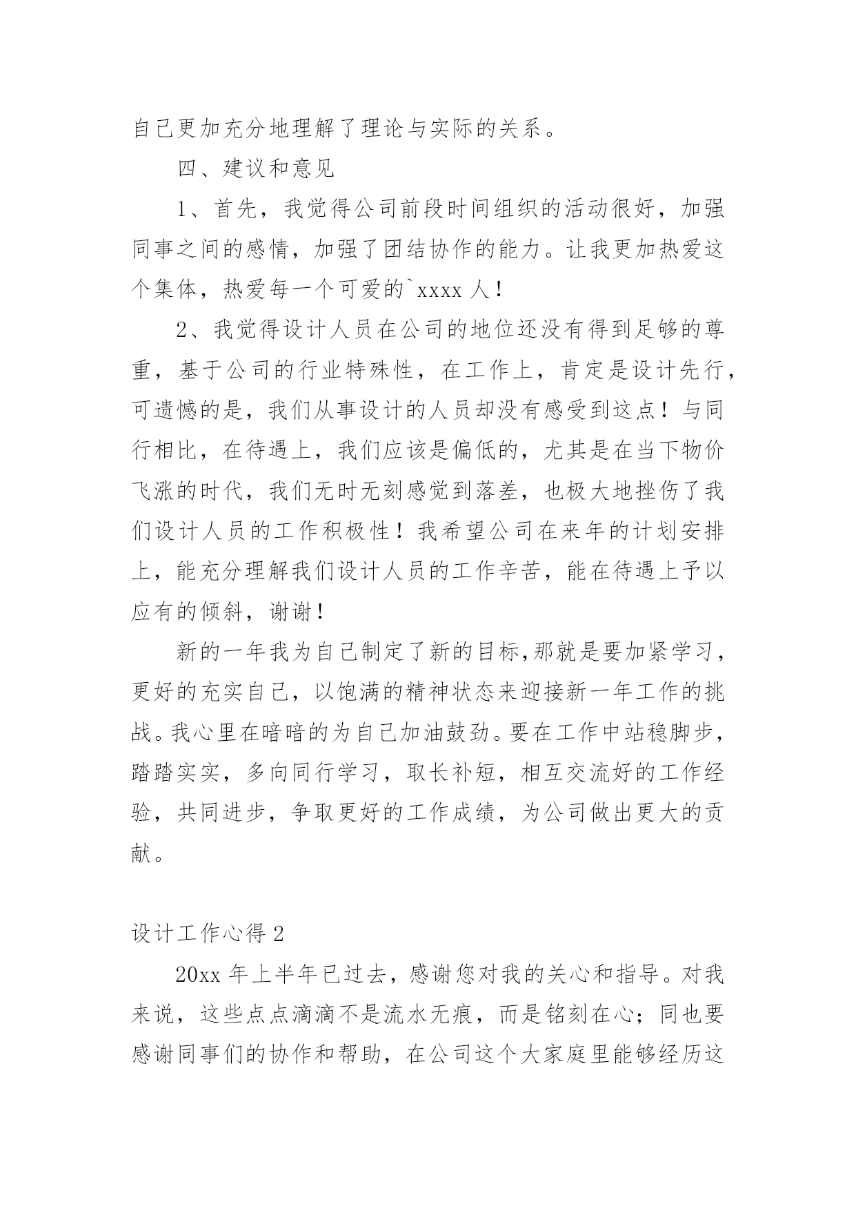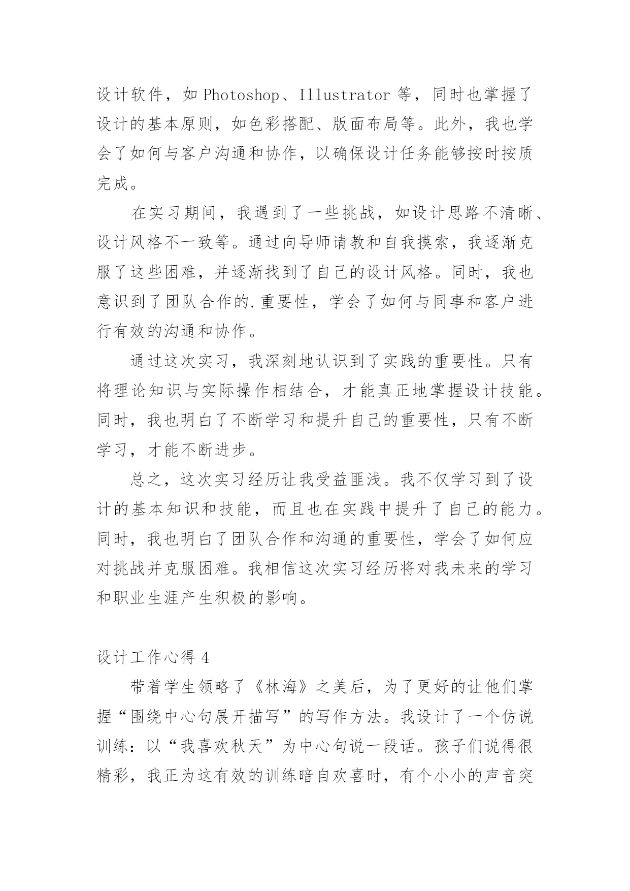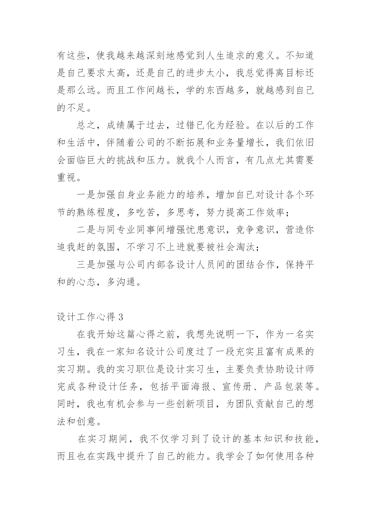 设计工作心得当我们有一些感想时,不如来好好地做个总结,写一篇心得体会,这样能够培养人思考的习惯。那么好的心得体会是什么样的呢?以下是小编精心整理的设计工作心得,欢迎大家借鉴与参考,希望对大家有所帮助。设计工作心得1时光飞逝,20xx年即将疾驰而去,内心不禁感慨万千,新的一年又开始了,在期待与向往未来的同时,在这里对我一年以来的工作情况进行简要的总结,算是对公司也是对个人这段时间的工作的一个交代。一、个人工作总结我是20xx年x月被公司录用的,之前一直从事广告平面设计方面的工作,也经历过不少公司平台,积累了不少经验,来到xxxx,对我来说即是新的机遇也是新的挑战,我很喜欢设计,我也不知道为什么,所以,我想证明自己,证明自己的能力和一颗真诚而执著的心。明天会怎么样,谁也不知道。至少今天我要对得起自己。很多时候,日常的工作是繁琐的,我们只有自己从中找到乐趣,才不会觉得枯燥;在工作中,我学到了很多东西,从不懂,到有点懂,再到熟悉。这中间的过程,只有我自己最清楚。任务大小不一,处理时间有长有短,但我都是认认真真保质保量,按时完成。掐指一算,在xxxx不知不觉也快过去两年了,在工作上,与刚进公司的去年相比,我越来越感觉得心应手,自身的素质与才能也得到了一定的提高,尤为难得的是,内心深处我也愿意做到与公司荣辱与共。公司的平台很大,让我在从事设计工作以外,还能参与客户的交流,开阔了眼界,另一方面也拓宽了设计思路,使我的作品更能契合公司和客户的需要,非常感谢公司给我这个成长的平台。二、与同事相处到了xxxx以后,要感谢的人真的很多,首先感谢公司的各位领导给于我的信任和支持,在平台上工作的时候,感谢总监一直教导我,要不断提高自己的设计能力;感谢xxxx和xxxx从我进公司的第一天起,就耐心的教给我很多我不懂的东西,让我能快速的适应公司的工作;感谢xxxx,始终如一对我的热心帮助。感谢有在平台上磨练的那段时光,正是那段时间激发了我的斗志和工作热情!感谢每一个人对我的帮助和支持,感谢大家那么喜欢我!我会继续努力的,让我们前进的步伐越走越坚定!三、与客户沟通对于广告业来说,与客户的沟通是尤其重要的环节,在xxxx的这两年,我也接触不少的客户,有蛮不讲理的,也有和蔼可亲的,不过我能始终保持原则,在不违背公司的利益下,与客户充分沟通交流,和客户在意见上发生分歧时,大部分我可以很轻易的用我的设计专业方面的知识说服客户,甚至可以现场做出效果来改变他们的主意。感谢公司!让我从客观上对自己在以前所学的知识有了更加感性的认识,使自己更加充分地理解了理论与实际的关系。四、建议和意见1、首先,我觉得公司前段时间组织的活动很好,加强同事之间的感情,加强了团结协作的能力。让我更加热爱这个集体,热爱每一个可爱的`xxxx人!2、我觉得设计人员在公司的地位还没有得到足够的尊重,基于公司的行业特殊性,在工作上,肯定是设计先行,可遗憾的是,我们从事设计的人员却没有感受到这点!与同行相比,在待遇上,我们应该是偏低的,尤其是在当下物价飞涨的时代,我们无时无刻感觉到落差,也极大地挫伤了我们设计人员的工作积极性!我希望公司在来年的计划安排上,能充分理解我们设计人员的工作辛苦,能在待遇上予以应有的倾斜,谢谢!新的一年我为自己制定了新的目标,那就是要加紧学习,更好的充实自己,以饱满的精神状态来迎接新一年工作的挑战。我心里在暗暗的为自己加油鼓劲。要在工作中站稳脚步,踏踏实实,多向同行学习,取长补短,相互交流好的工作经验,共同进步,争取更好的工作成绩,为公司做出更大的贡献。设计工作心得220xx年上半年已过去,感谢您对我的关心和指导。对我来说,这些点点滴滴不是流水无痕,而是铭刻在心;同也要感谢同事们的协作和帮助,在公司这个大家庭里能够经历这半年的分分秒秒,我深感幸运!我们公司的有着独特企业文化,既有规章制度严格的一面,又有人性化关怀的一面,它能磨练人的意志,淡泊人的心灵,能让员工业务素质能得到快速提高,人的心理也能快速成熟起来,这无不凝结着每位领导的英名决策和正确指导。这半年来,是我规划人生中重要的关键期,一定要走的稳健。通过多个项目的设计工作推进及完成,我对室内设计工作的流程和方法等有了更深的认识,对各类装修风格也有了更进一步的了解。今年年初,我给自己制定的目标是按按质和高效的完成公司拟定的一、二级结点工作计划,主要工作任务是(个人理解),产品7研发、设计单位管理、后续施工阶段的跟踪管理。重点,或者说最能体现你专业水平的就是产品研发,也是设计管理团队的核心价值。提高产品附加值,对项目进行价值提升,从而提高项目成本的承受能力。好的产品虽然不一定都需要高成本,好的概念设计可以为项目寻找到全新的突破口。半年来,我按照自己既定的目标一步一步地下来,有些可能达到了,而有些可能离目标还有一定地差距,具体