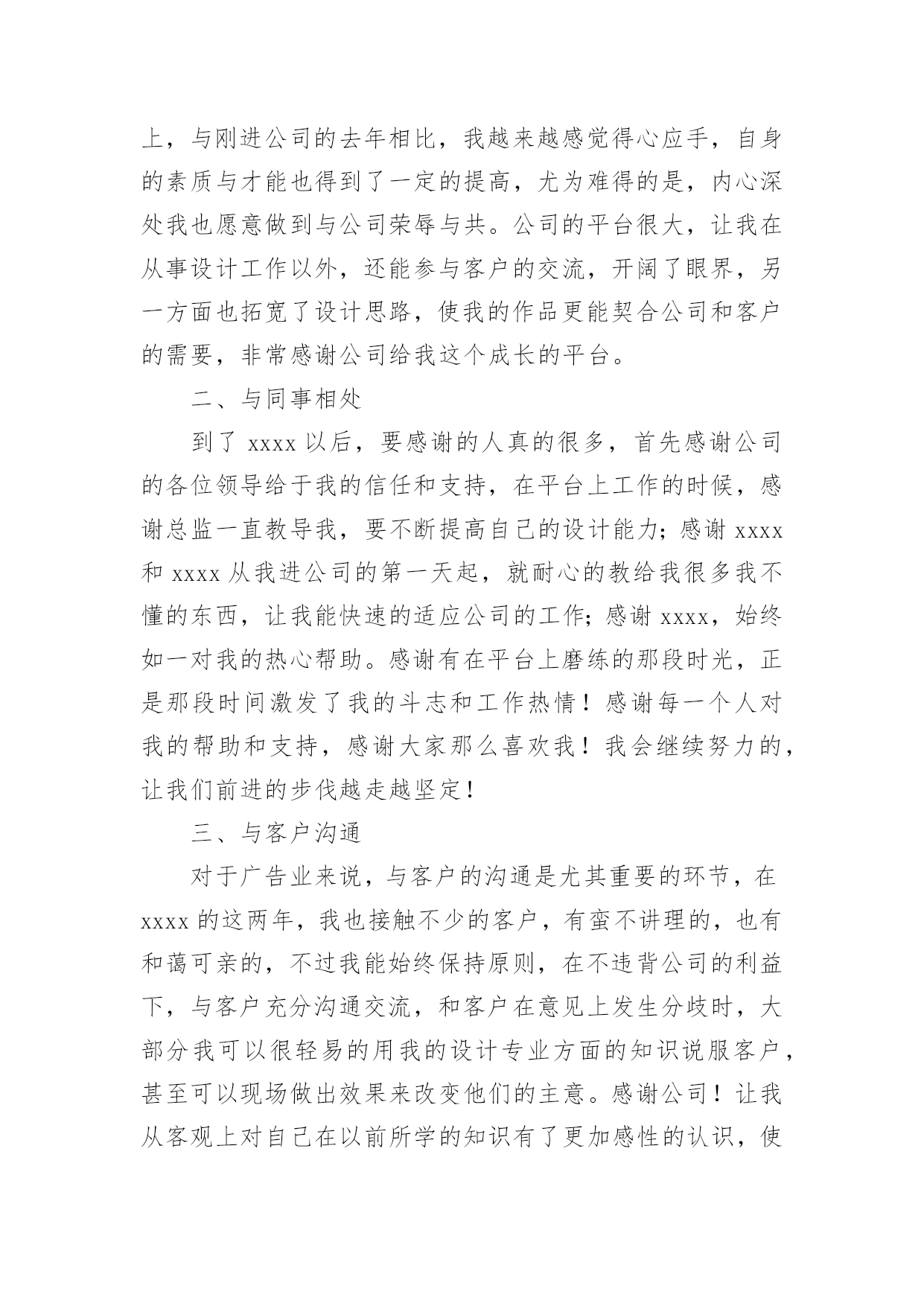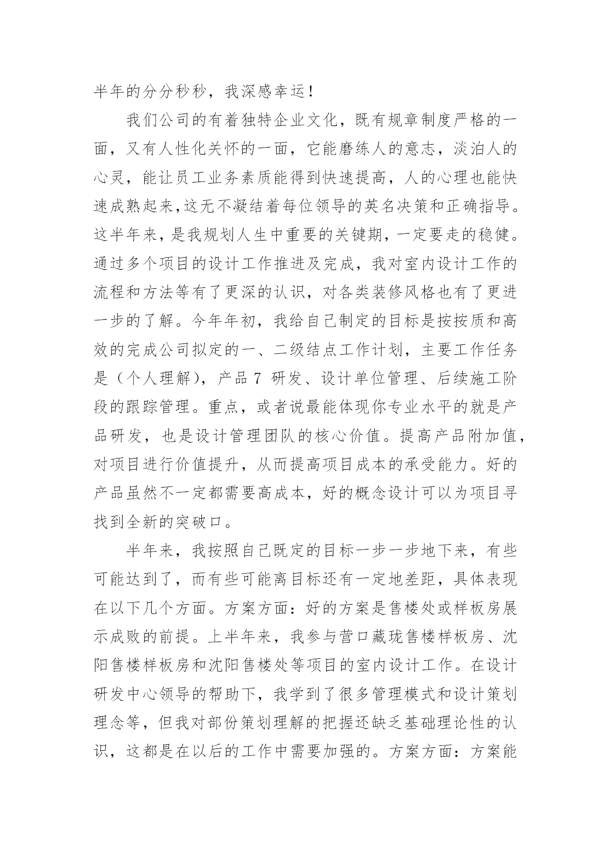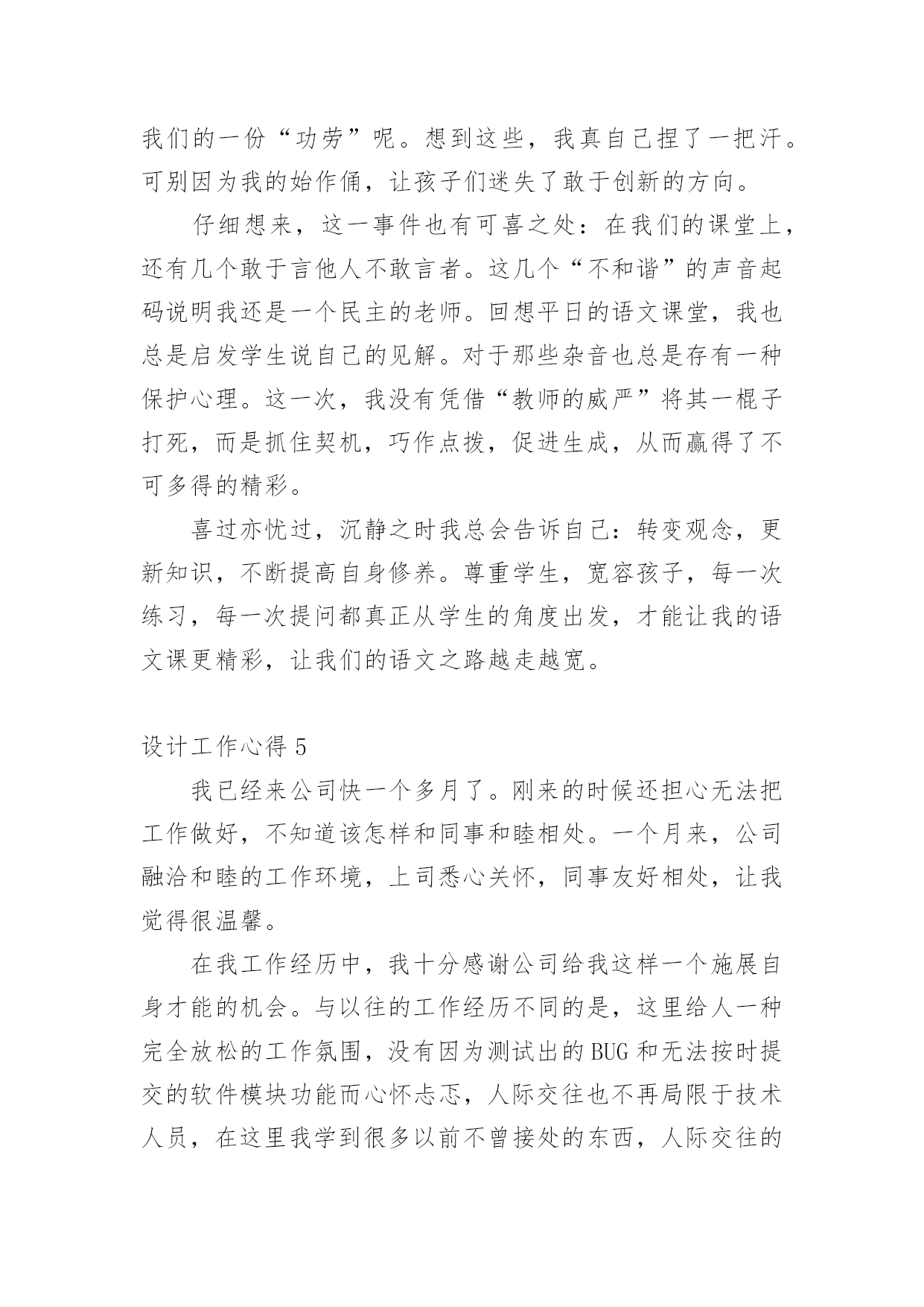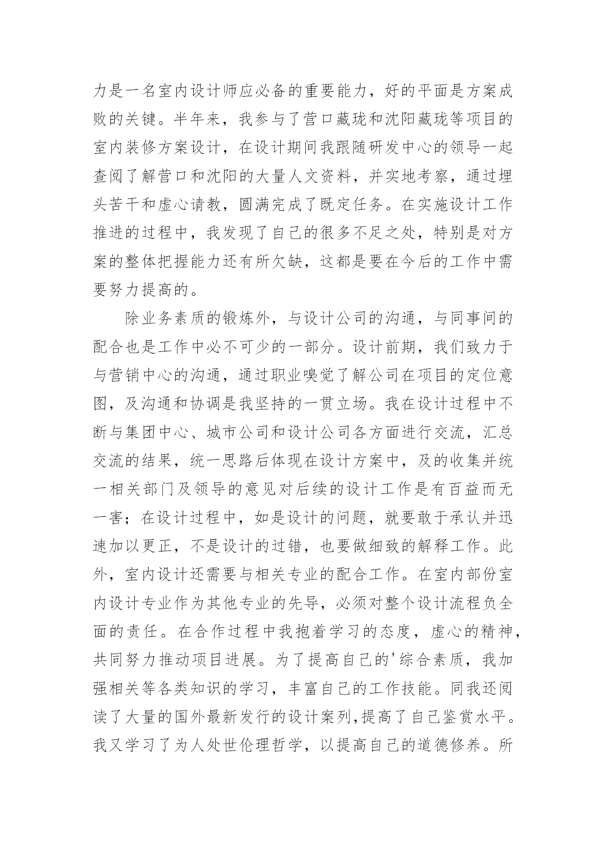 设计工作心得当我们有一些感想时,不如来好好地做个总结,写一篇心得体会,这样能够培养人思考的习惯。那么好的心得体会是什么样的呢?以下是小编精心整理的设计工作心得,欢迎大家借鉴与参考,希望对大家有所帮助。设计工作心得1时光飞逝,20xx年即将疾驰而去,内心不禁感慨万千,新的一年又开始了,在期待与向往未来的同时,在这里对我一年以来的工作情况进行简要的总结,算是对公司也是对个人这段时间的工作的一个交代。一、个人工作总结我是20xx年x月被公司录用的,之前一直从事广告平面设计方面的工作,也经历过不少公司平台,积累了不少经验,来到xxxx,对我来说即是新的机遇也是新的挑战,我很喜欢设计,我也不知道为什么,所以,我想证明自己,证明自己的能力和一颗真诚而执著的心。明天会怎么样,谁也不知道。至少今天我要对得起自己。很多时候,日常的工作是繁琐的,我们只有自己从中找到乐趣,才不会觉得枯燥;在工作中,我学到了很多东西,从不懂,到有点懂,再到熟悉。这中间的过程,只有我自己最清楚。任务大小不一,处理时间有长有短,但我都是认认真真保质保量,按时完成。掐指一算,在xxxx不知不觉也快过去两年了,在工作上,与刚进公司的去年相比,我越来越感觉得心应手,自身的素质与才能也得到了一定的提高,尤为难得的是,内心深处我也愿意做到与公司荣辱与共。公司的平台很大,让我在从事设计工作以外,还能参与客户的交流,开阔了眼界,另一方面也拓宽了设计思路,使我的作品更能契合公司和客户的需要,非常感谢公司给我这个成长的平台。二、与同事相处到了xxxx以后,要感谢的人真的很多,首先感谢公司的各位领导给于我的信任和支持,在平台上工作的时候,感谢总监一直教导我,要不断提高自己的设计能力;感谢xxxx和xxxx从我进公司的第一天起,就耐心的教给我很多我不懂的东西,让我能快速的适应公司的工作;感谢xxxx,始终如一对我的热心帮助。感谢有在平台上磨练的那段时光,正是那段时间激发了我的斗志和工作热情!感谢每一个人对我的帮助和支持,感谢大家那么喜欢我!我会继续努力的,让我们前进的步伐越走越坚定!三、与客户沟通对于广告业来说,与客户的沟通是尤其重要的环节,在xxxx的这两年,我也接触不少的客户,有蛮不讲理的,也有和蔼可亲的,不过我能始终保持原则,在不违背公司的利益下,与客户充分沟通交流,和客户在意见上发生分歧时,大部分我可以很轻易的用我的设计专业方面的知识说服客户,甚至可以现场做出效果来改变他们的主意。感谢公司!让我从客观上对自己在以前所学的知识有了更加感性的认识,使自己更加充分地理解了理论与实际的关系。四、建议和意见1、首先,我觉得公司前段时间组织的活动很好,加强同事之间的感情,加强了团结协作的能力。让我更加热爱这个集体,热爱每一个可爱的`xxxx人!2、我觉得设计人员在公司的地位还没有得到足够的尊重,基于公司的行业特殊性,在工作上,肯定是设计先行,可遗憾的是,我们从事设计的人员却没有感受到这点!与同行相比,在待遇上,我们应该是偏低的,尤其是在当下物价飞涨的时代,我们无时无刻感觉到落差,也极大地挫伤了我们设计人员的工作积极性!我希望公司在来年的计划安排上,能充分理解我们设计人员的工作辛苦,能在待遇上予以应有的倾斜,谢谢!新的一年我为自己制定了新的目标,那就是要加紧学习,更好的充实自己,以饱满的精神状态来迎接新一年工作的挑战。我心里在暗暗的为自己加油鼓劲。要在工作中站稳脚步,踏踏实实,多向同行学习,取长补短,相互交流好的工作经验,共同进步,争取更好的工作成绩,为公司做出更大的贡献。设计工作心得220xx年上半年已过去,感谢您对我的关心和指导。对我来说,这些点点滴滴不是流水无痕,而是铭刻在心;同也要感谢同事们的协作和帮助,在公司这个大家庭里能够经历这半年的分分秒秒,我深感幸运!我们公司的有着独特企业文化,既有规章制度严格的一面,又有人性化关怀的一面,它能磨练人的意志,淡泊人的心灵,能让员工业务素质能得到快速提高,人的心理也能快速成熟起来,这无不凝结着每位领导的英名决策和正确指导。这半年来,是我规划人生中重要的关键期,一定要走的稳健。通过多个项目的设计工作推进及完成,我对室内设计工作的流程和方法等有了更深的认识,对各类装修风格也有了更进一步的了解。今年年初,我给自己制定的目标是按按质和高效的完成公司拟定的一、二级结点工作计划,主要工作任务是(个人理解),产品7研发、设计单位管理、后续施工阶段的跟踪管理。重点,或者说最能体现你专业水平的就是产品研发,也是设计管理团队的核心价值。提高产品附加值,对项目进行价值提升,从而提高项目成本的承受能力。好的产品虽然不一定都需要高成本,好的概念设计可以为项目寻找到全新的突破口。半年来,我按照自己既定的目标一步一步地下来,有些可能达到了,而有些可能离目标还有一定地差距,具体