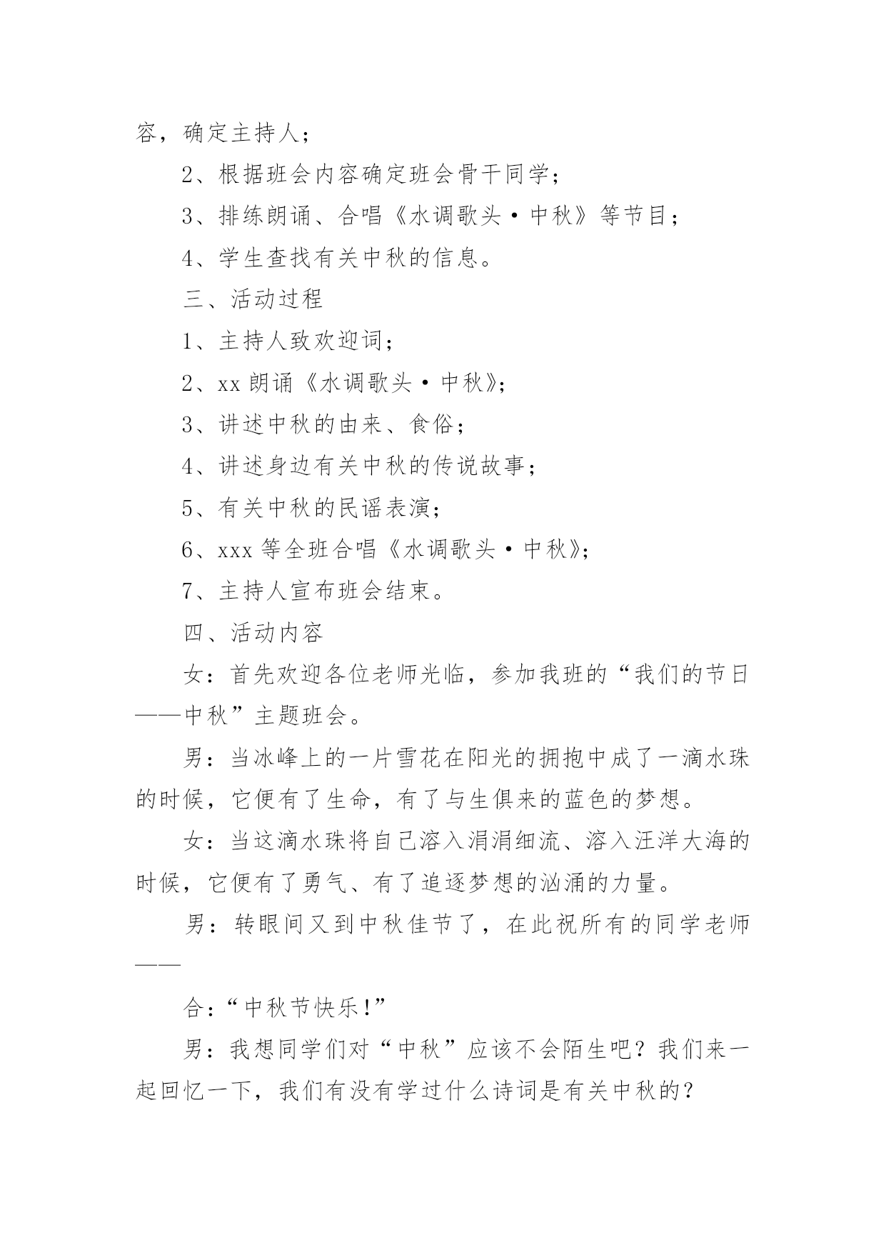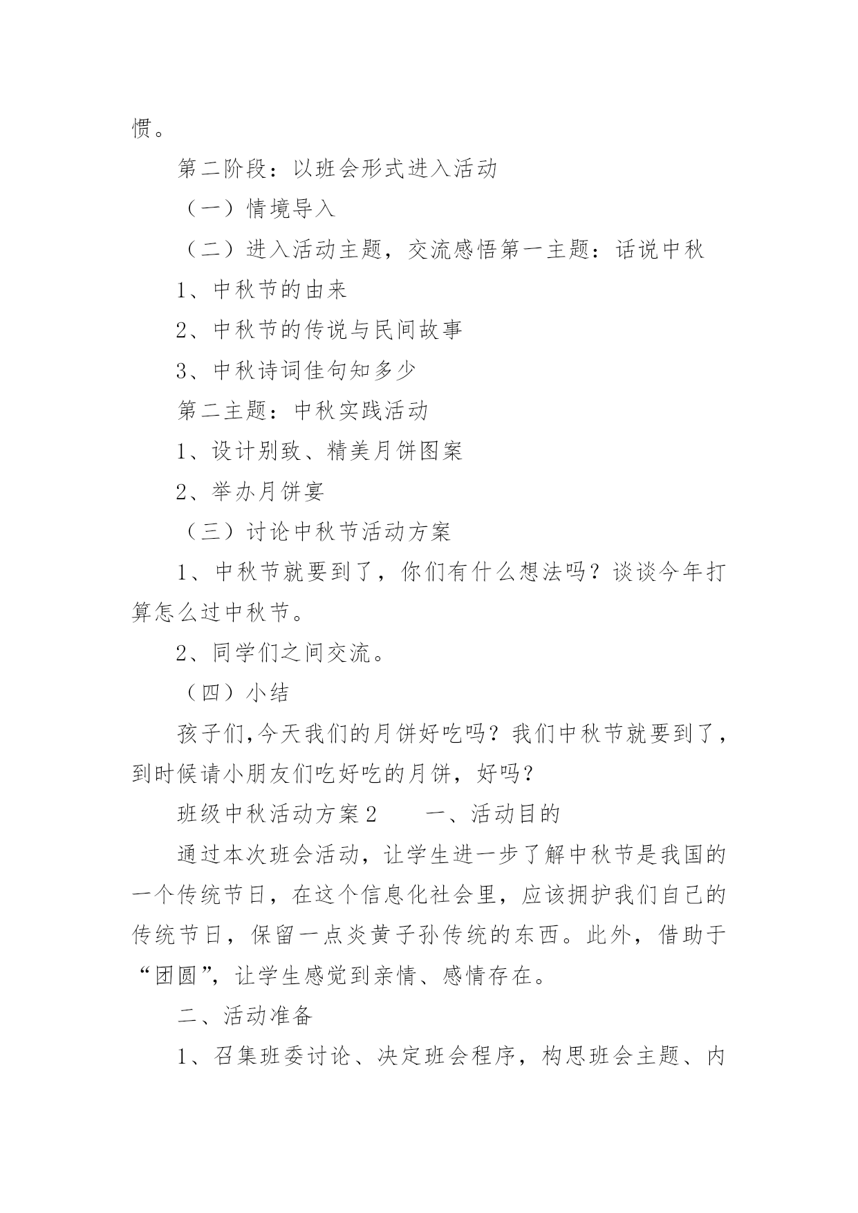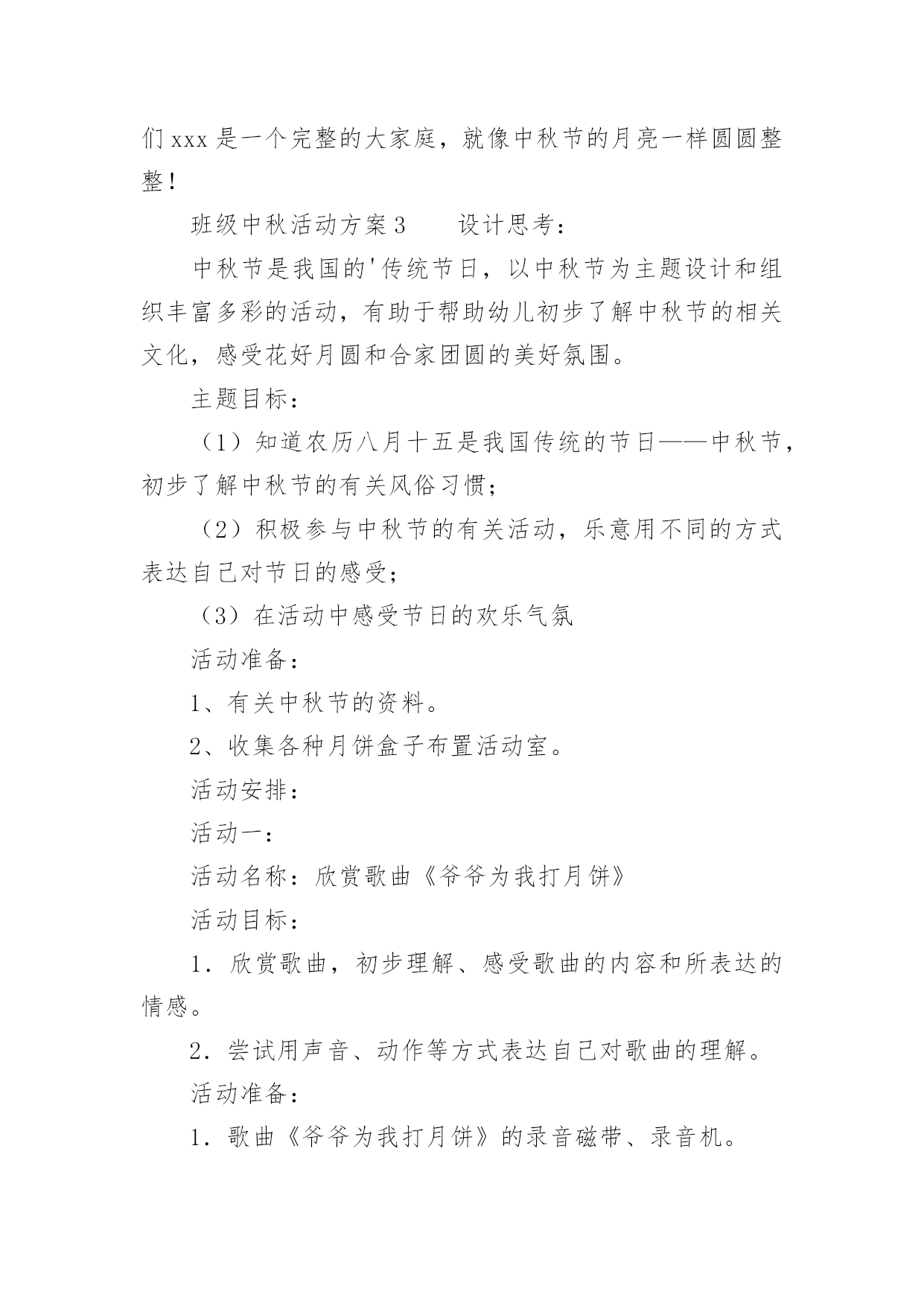 班级中秋活动方案班级中秋活动方案为了确定活动的圆满进行,通常会被要求事先制定活动方案,活动方案是为某一活动所制定的具体行动实施办法细则、步骤和安排等。那要怎么制定科学的活动方案呢?以下是小编为大家整理的班级中秋活动方案,仅供参考,希望能够帮助到大家。班级中秋活动方案1一、活动时间:快到中秋的前两天二、活动目的:1、深入了解中秋节名称的来源和风俗习惯。2、了解自己的故乡过中秋的时候有什么习俗。3、培养学生对中华民族文化的热爱。4、培养学生搜集,整理,比较,分析和运用资料的能力以及语言概括和表达能力。三、活动准备:将学生分为四组,让他们各自收集全国各地中秋节的风俗和习惯,以及中秋的相关资料。四、活动过程第一阶段:活动准备1、搜集有关中秋节的名称、由来、中秋灯谜和中秋节的传说故事等等。2、调查访问身边的长辈,了解家乡过中秋节的风俗习惯。第二阶段:以班会形式进入活动(一)情境导入(二)进入活动主题,交流感悟第一主题:话说中秋1、中秋节的由来2、中秋节的传说与民间故事3、中秋诗词佳句知多少第二主题:中秋实践活动1、设计别致、精美月饼图案2、举办月饼宴(三)讨论中秋节活动方案1、中秋节就要到了,你们有什么想法吗?谈谈今年打算怎么过中秋节。2、同学们之间交流。(四)小结孩子们,今天我们的月饼好吃吗?我们中秋节就要到了,到时候请小朋友们吃好吃的月饼,好吗?班级中秋活动方案2一、活动目的通过本次班会活动,让学生进一步了解中秋节是我国的一个传统节日,在这个信息化社会里,应该拥护我们自己的传统节日,保留一点炎黄子孙传统的东西。此外,借助于“团圆”,让学生感觉到亲情、感情存在。二、活动准备1、召集班委讨论、决定班会程序,构思班会主题、内容,确定主持人;2、根据班会内容确定班会骨干同学;3、排练朗诵、合唱《水调歌头·中秋》等节目;4、学生查找有关中秋的信息。三、活动过程1、主持人致欢迎词;2、xx朗诵《水调歌头·中秋》;3、讲述中秋的由来、食俗;4、讲述身边有关中秋的传说故事;5、有关中秋的民谣表演;6、xxx等全班合唱《水调歌头·中秋》;7、主持人宣布班会结束。四、活动内容女:首先欢迎各位老师光临,参加我班的“我们的节日——中秋”主题班会。男:当冰峰上的一片雪花在阳光的拥抱中成了一滴水珠的时候,它便有了生命,有了与生俱来的蓝色的梦想。女:当这滴水珠将自己溶入涓涓细流、溶入汪洋大海的时候,它便有了勇气、有了追逐梦想的汹涌的力量。男:转眼间又到中秋佳节了,在此祝所有的同学老师——合:“中秋节快乐!”男:我想同学们对“中秋”应该不会陌生吧?我们来一起回忆一下,我们有没有学过什么诗词是有关中秋的?女:下面请欣赏周想朗诵《水调歌头·中秋》五、各地月饼的传说月饼象征团圆,是中秋祭月和拜土地公的必备祭品。而中秋节吃月饼的习俗,是由元朝末年流传下来的。元朝末年,汉人打算起来反抗蒙古人的统治,却苦于无从传递消息。后来刘伯温想出一条计策,到处散布流言,说有冬瘟流行,除非家家户户都在中秋节买月饼来吃,才能避免。人们买了月饼回到家中,发觉里面藏着纸条,上面写着:“中秋夜,杀鞑子,迎义军!”于是众人纷纷起义反抗统治者,中秋节吃月饼的习俗就是这样留下来的。中秋早晨一般都吃红烧玫瑰糖芋头,据说也与此有关。相传蒙古灭宋之后,民族压迫深重,汉人时刻都想反抗。有一年,大家约好中秋之夜一齐动手。为了厌胜,人们要吃红烧芋头,象征“鞑子”人头落地,这就是现在中秋节吃糖芋头的来历。这个传说在各地则变异为:当时元朝统治者规定,每户潮人家都要住一个蒙古兵,受汉人供养,监视汉人的行动,并且只允许三家共用一把菜刀。老百姓恨极了,便趁着中秋节吃月饼的机会,把相约举事的纸条,放在月饼馅子里。取芋头与“胡头”谐音,且形似人头,因此每至中秋,则以芋头来祭奠祖先,历代相传,至今犹存。六、宣布结束这堂课同学们了解了很多关于中秋节的知识,同学们的表演也非常精彩,中秋月圆之月每个人心中有个共同的最美好、最传统的愿望,那就是:花常开!月常圆!人常在!我们xxx是一个完整的大家庭,就像中秋节的月亮一样圆圆整整!班级中秋活动方案3设计思考:中秋节是我国的'传统节日,以中秋节为主题设计和组织丰富多彩的活动,有助于帮助幼儿初步了解中秋节的相关文化,感受花好月圆和合家团圆的美好氛围。主题目标:(1)知道农历八月十五是我国传统的节日——中秋节,初步了解中秋节的有关风俗习惯;(2)积极参与中秋节的有关活动,乐意用不同的方式表达自己对节日的感受;(3)在活动中感受节日的欢乐气氛活动准备:1、有关中秋节的资料。2、收集各种月饼盒子布置活动室。活动安排:活动一:活动名称:欣赏歌曲《爷爷为我打月饼》活动目标:1.欣赏歌曲,初步理解、感受歌曲的内容和所表达的情感。2.尝试用声音、动作等方式表达自己对歌曲的理解。活动准备:1.歌曲《爷爷为我