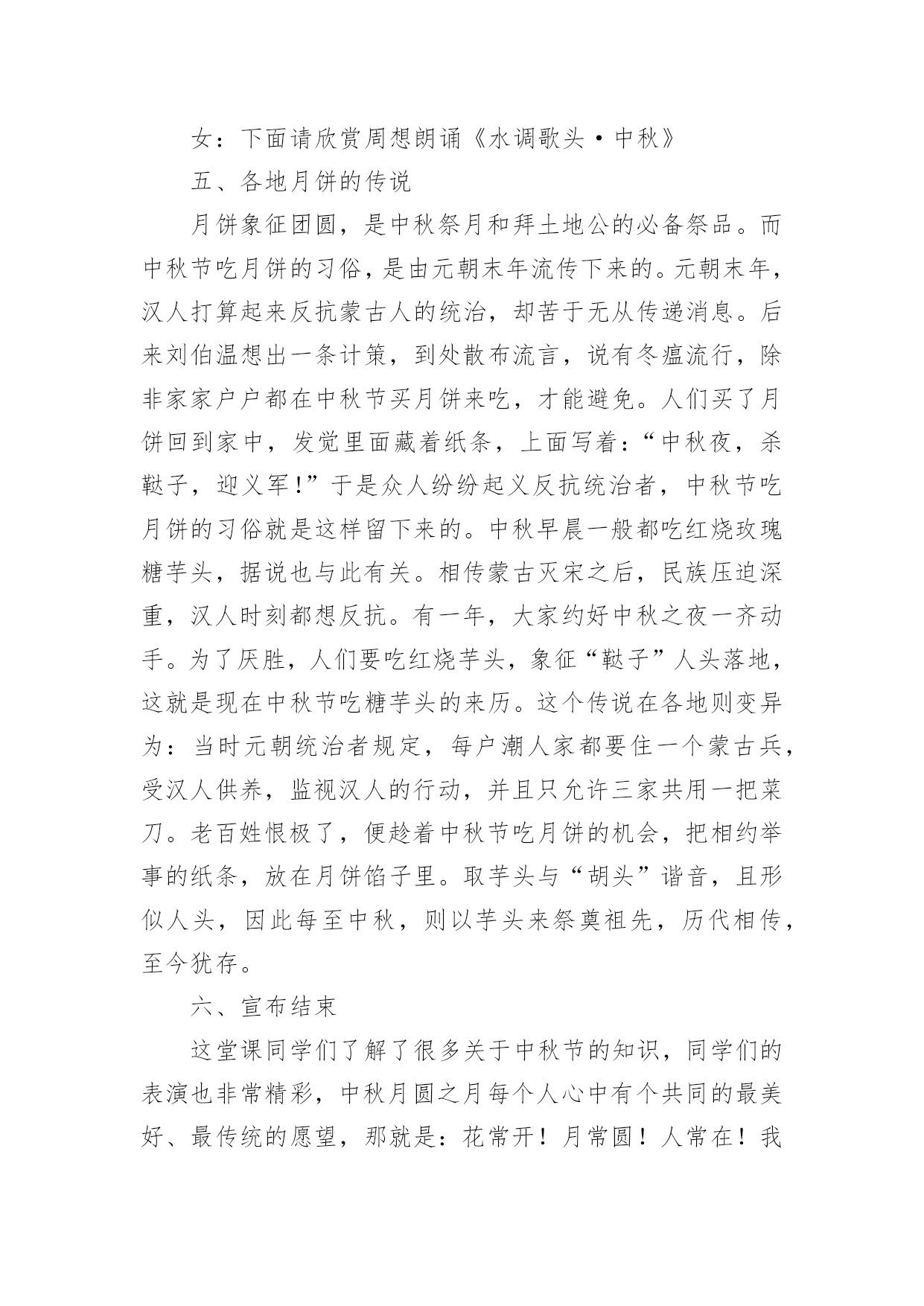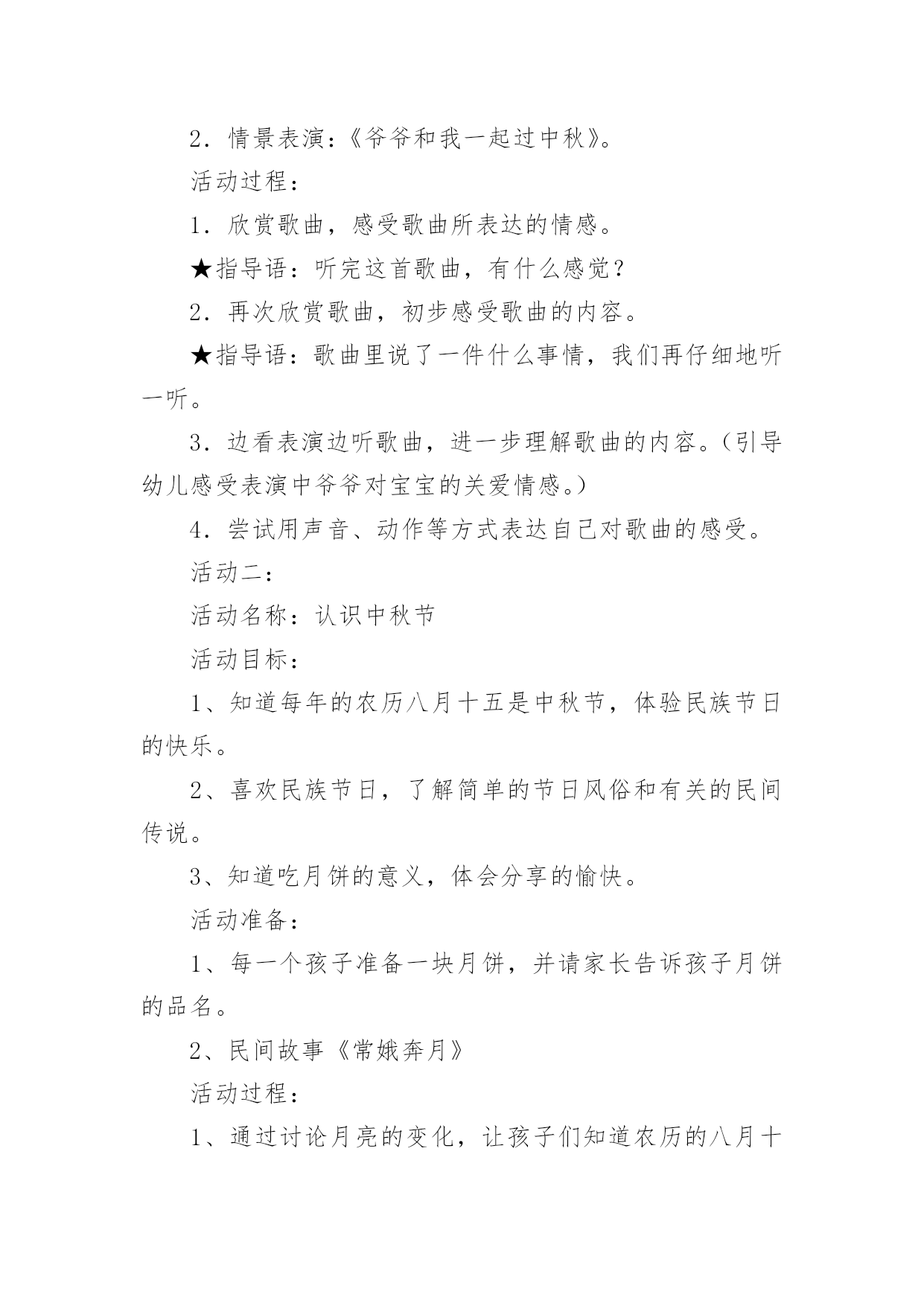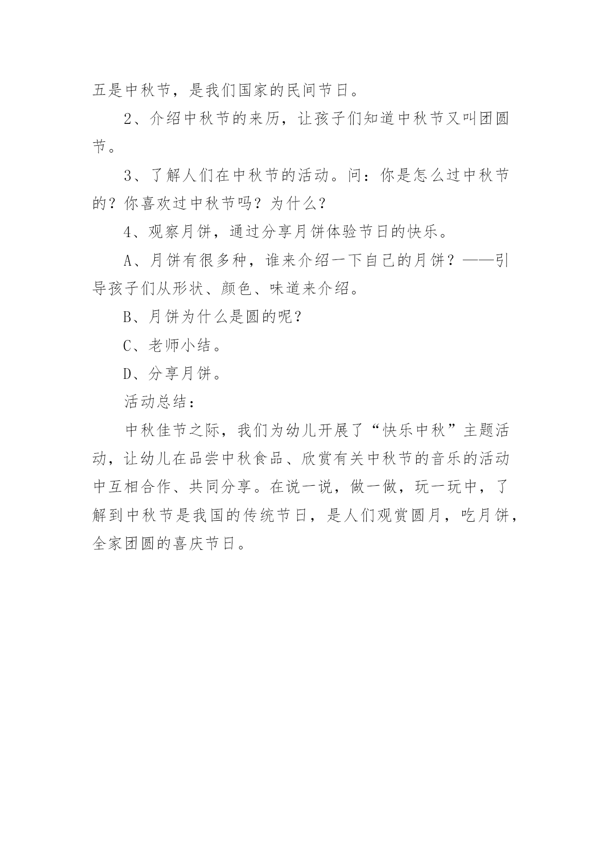 班级中秋活动方案班级中秋活动方案为了确定活动的圆满进行,通常会被要求事先制定活动方案,活动方案是为某一活动所制定的具体行动实施办法细则、步骤和安排等。那要怎么制定科学的活动方案呢?以下是小编为大家整理的班级中秋活动方案,仅供参考,希望能够帮助到大家。班级中秋活动方案1一、活动时间:快到中秋的前两天二、活动目的:1、深入了解中秋节名称的来源和风俗习惯。2、了解自己的故乡过中秋的时候有什么习俗。3、培养学生对中华民族文化的热爱。4、培养学生搜集,整理,比较,分析和运用资料的能力以及语言概括和表达能力。三、活动准备:将学生分为四组,让他们各自收集全国各地中秋节的风俗和习惯,以及中秋的相关资料。四、活动过程第一阶段:活动准备1、搜集有关中秋节的名称、由来、中秋灯谜和中秋节的传说故事等等。2、调查访问身边的长辈,了解家乡过中秋节的风俗习惯。第二阶段:以班会形式进入活动(一)情境导入(二)进入活动主题,交流感悟第一主题:话说中秋1、中秋节的由来2、中秋节的传说与民间故事3、中秋诗词佳句知多少第二主题:中秋实践活动1、设计别致、精美月饼图案2、举办月饼宴(三)讨论中秋节活动方案1、中秋节就要到了,你们有什么想法吗?谈谈今年打算怎么过中秋节。2、同学们之间交流。(四)小结孩子们,今天我们的月饼好吃吗?我们中秋节就要到了,到时候请小朋友们吃好吃的月饼,好吗?班级中秋活动方案2一、活动目的通过本次班会活动,让学生进一步了解中秋节是我国的一个传统节日,在这个信息化社会里,应该拥护我们自己的传统节日,保留一点炎黄子孙传统的东西。此外,借助于“团圆”,让学生感觉到亲情、感情存在。二、活动准备1、召集班委讨论、决定班会程序,构思班会主题、内容,确定主持人;2、根据班会内容确定班会骨干同学;3、排练朗诵、合唱《水调歌头·中秋》等节目;4、学生查找有关中秋的信息。三、活动过程1、主持人致欢迎词;2、xx朗诵《水调歌头·中秋》;3、讲述中秋的由来、食俗;4、讲述身边有关中秋的传说故事;5、有关中秋的民谣表演;6、xxx等全班合唱《水调歌头·中秋》;7、主持人宣布班会结束。四、活动内容女:首先欢迎各位老师光临,参加我班的“我们的节日——中秋”主题班会。男:当冰峰上的一片雪花在阳光的拥抱中成了一滴水珠的时候,它便有了生命,有了与生俱来的蓝色的梦想。女:当这滴水珠将自己溶入涓涓细流、溶入汪洋大海的时候,它便有了勇气、有了追逐梦想的汹涌的力量。男:转眼间又到中秋佳节了,在此祝所有的同学老师——合:“中秋节快乐!”男:我想同学们对“中秋”应该不会陌生吧?我们来一起回忆一下,我们有没有学过什么诗词是有关中秋的?女:下面请欣赏周想朗诵《水调歌头·中秋》五、各地月饼的传说月饼象征团圆,是中秋祭月和拜土地公的必备祭品。而中秋节吃月饼的习俗,是由元朝末年流传下来的。元朝末年,汉人打算起来反抗蒙古人的统治,却苦于无从传递消息。后来刘伯温想出一条计策,到处散布流言,说有冬瘟流行,除非家家户户都在中秋节买月饼来吃,才能避免。人们买了月饼回到家中,发觉里面藏着纸条,上面写着:“中秋夜,杀鞑子,迎义军!”于是众人纷纷起义反抗统治者,中秋节吃月饼的习俗就是这样留下来的。中秋早晨一般都吃红烧玫瑰糖芋头,据说也与此有关。相传蒙古灭宋之后,民族压迫深重,汉人时刻都想反抗。有一年,大家约好中秋之夜一齐动手。为了厌胜,人们要吃红烧芋头,象征“鞑子”人头落地,这就是现在中秋节吃糖芋头的来历。这个传说在各地则变异为:当时元朝统治者规定,每户潮人家都要住一个蒙古兵,受汉人供养,监视汉人的行动,并且只允许三家共用一把菜刀。老百姓恨极了,便趁着中秋节吃月饼的机会,把相约举事的纸条,放在月饼馅子里。取芋头与“胡头”谐音,且形似人头,因此每至中秋,则以芋头来祭奠祖先,历代相传,至今犹存。六、宣布结束这堂课同学们了解了很多关于中秋节的知识,同学们的表演也非常精彩,中秋月圆之月每个人心中有个共同的最美好、最传统的愿望,那就是:花常开!月常圆!人常在!我们xxx是一个完整的大家庭,就像中秋节的月亮一样圆圆整整!班级中秋活动方案3设计思考:中秋节是我国的'传统节日,以中秋节为主题设计和组织丰富多彩的活动,有助于帮助幼儿初步了解中秋节的相关文化,感受花好月圆和合家团圆的美好氛围。主题目标:(1)知道农历八月十五是我国传统的节日——中秋节,初步了解中秋节的有关风俗习惯;(2)积极参与中秋节的有关活动,乐意用不同的方式表达自己对节日的感受;(3)在活动中感受节日的欢乐气氛活动准备:1、有关中秋节的资料。2、收集各种月饼盒子布置活动室。活动安排:活动一:活动名称:欣赏歌曲《爷爷为我打月饼》活动目标:1.欣赏歌曲,初步理解、感受歌曲的内容和所表达的情感。2.尝试用声音、动作等方式表达自己对歌曲的理解。活动准备:1.歌曲《爷爷为我