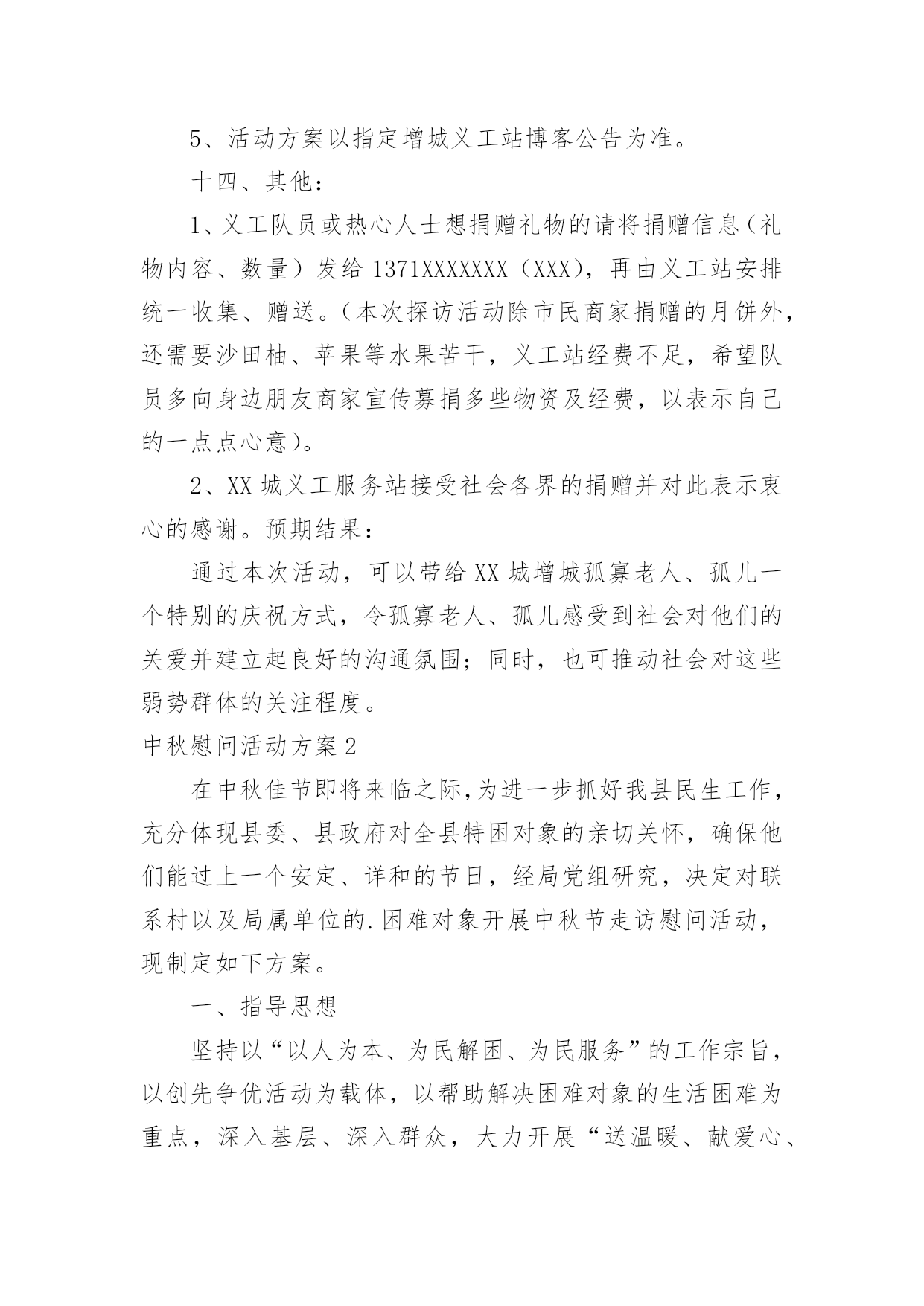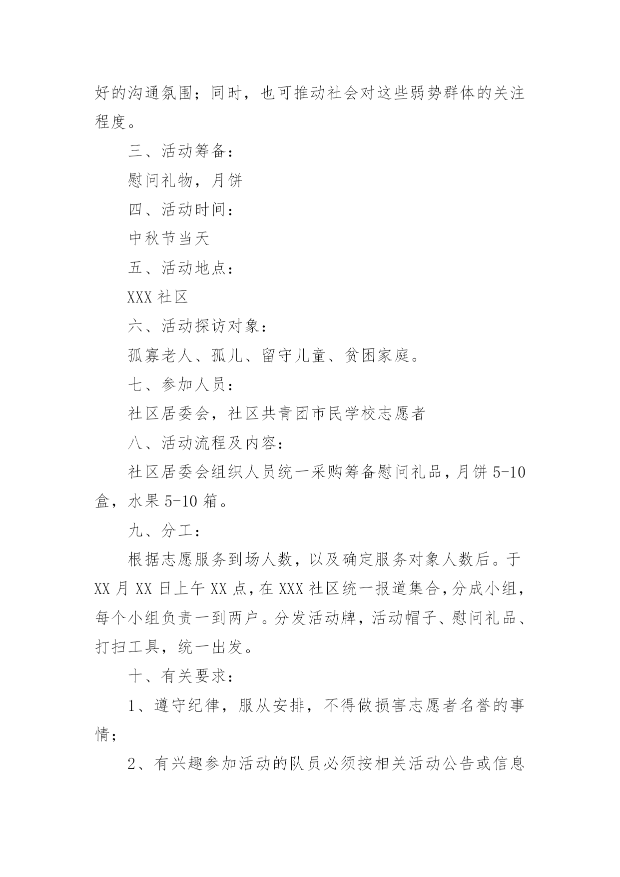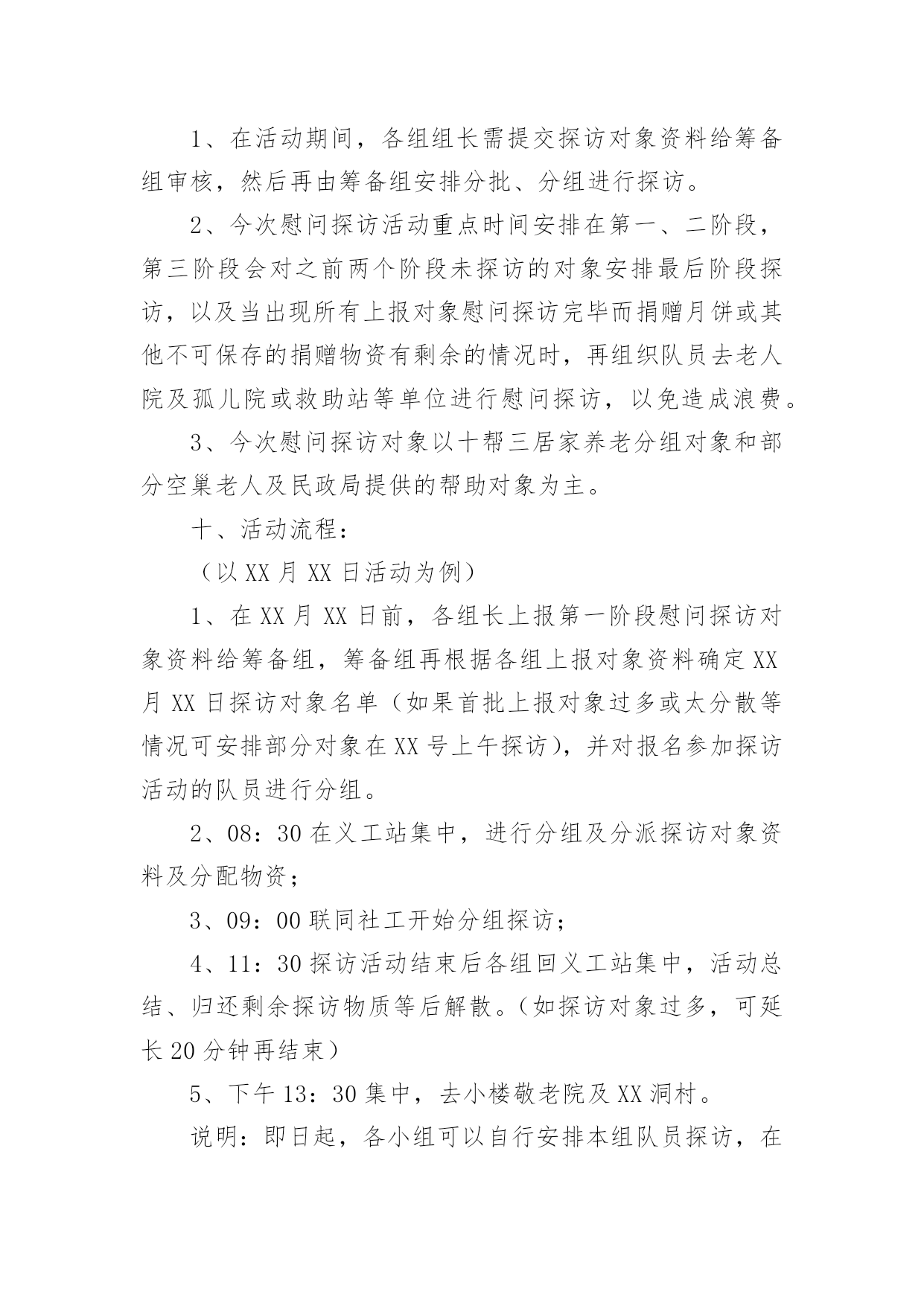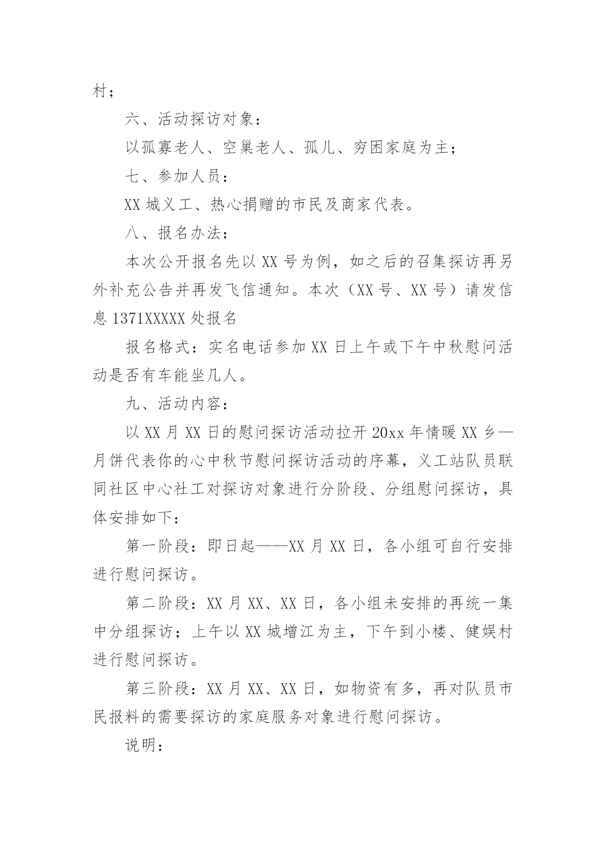 中秋慰问活动方案为了确保工作或事情有序地进行,我们需要提前开始方案制定工作,方案一般包括指导思想、主要目标、工作重点、实施步骤、政策措施、具体要求等项目。方案要怎么制定呢?以下是小编精心整理的中秋慰问活动方案,供大家参考借鉴,希望可以帮助到有需要的朋友。中秋慰问活动方案1一、活动主题:情暖荔乡—月饼代表你的心二、活动目的:给XX城的孤寡老人、低保困难户及孤儿送去一份节日的慰问,让这些不受关注的弱势群体感受到社会对他们的关心和关爱;三、活动筹备:主办方:XX城市义工协会XX城义工服务站月饼赞助:热心市民、队员、清一色水果行、XX广场以及其他商家。媒体支持:XX城日报社、XX城市电视台;四、活动时间:20xx年XX月XX日—XX日五、活动地点:XX城街、XX街、及其他周边地区、小楼敬老院、健娱村;六、活动探访对象:以孤寡老人、空巢老人、孤儿、穷困家庭为主;七、参加人员:XX城义工、热心捐赠的市民及商家代表。八、报名办法:本次公开报名先以XX号为例,如之后的召集探访再另外补充公告并再发飞信通知。本次(XX号、XX号)请发信息1371XXXXX处报名报名格式:实名电话参加XX日上午或下午中秋慰问活动是否有车能坐几人。九、活动内容:以XX月XX日的慰问探访活动拉开20xx年情暖XX乡—月饼代表你的心中秋节慰问探访活动的序幕,义工站队员联同社区中心社工对探访对象进行分阶段、分组慰问探访,具体安排如下:第一阶段:即日起——XX月XX日,各小组可自行安排进行慰问探访。第二阶段:XX月XX、XX日,各小组未安排的再统一集中分组探访;上午以XX城增江为主,下午到小楼、健娱村进行慰问探访。第三阶段:XX月XX、XX日,如物资有多,再对队员市民报料的需要探访的家庭服务对象进行慰问探访。说明:1、在活动期间,各组组长需提交探访对象资料给筹备组审核,然后再由筹备组安排分批、分组进行探访。2、今次慰问探访活动重点时间安排在第一、二阶段,第三阶段会对之前两个阶段未探访的对象安排最后阶段探访,以及当出现所有上报对象慰问探访完毕而捐赠月饼或其他不可保存的捐赠物资有剩余的情况时,再组织队员去老人院及孤儿院或救助站等单位进行慰问探访,以免造成浪费。3、今次慰问探访对象以十帮三居家养老分组对象和部分空巢老人及民政局提供的帮助对象为主。十、活动流程:(以XX月XX日活动为例)1、在XX月XX日前,各组长上报第一阶段慰问探访对象资料给筹备组,筹备组再根据各组上报对象资料确定XX月XX日探访对象名单(如果首批上报对象过多或太分散等情况可安排部分对象在XX号上午探访),并对报名参加探访活动的队员进行分组。2、08:30在义工站集中,进行分组及分派探访对象资料及分配物资;3、09:00联同社工开始分组探访;4、11:30探访活动结束后各组回义工站集中,活动总结、归还剩余探访物质等后解散。(如探访对象过多,可延长20分钟再结束)5、下午13:30集中,去小楼敬老院及XX洞村。说明:即日起,各小组可以自行安排本组队员探访,在每次探访前须向筹备组提交一份探访计划,计划内容包括:探访时间、探访地点、探访对象资料、探访队员资料、所需物资申请等,筹备组审核批准后便可按计划进行探访,并在每次活动结束后及时提交活动总结(活动总结内容包括活动情况总结、活动中出现的问题、建议、活动心得及活动照片等)给筹备组。十一、分工:(请有时间的队员报名参与工作组工作)1、筹备组:负责策划活动,协调、安排整个活动期间的探访对象及分组,并对整个活动进行跟踪,以便在活动期间及时调整。成员:XXX2、执行组:负责协助筹备组组织整个探访活动,包括收集探访对象资料,组织、带队进行第二阶段探访,提交第二阶段探访计划及探访后总结等具体实施工作。成员:各组组长及其他队员3、后勤组:负责收集、采购、分发探访物资,以及提供活动中所需物质支持(例如出借队服,活动表格提供等)。成员:XXX等4、宣传组:负责整个活动相关宣传,包括摄影、拍摄,网络、媒体宣传安排等工作。成员:XXX等十二、有关要求:1、遵守纪律,服从安排。义工们必须遵守增城义工服务站守则,高度重视此次活动,不得做损害义工名誉的事情;2、活动期间必须统一穿着队服、队帽,有义工证的.须戴上。3、讲文明、讲礼貌、维护增城市义工服务站的声誉;4、活动期间不得单独行动,请假、迟到、早退等须向带队组长及时说明。5、注意服务对象及个人安全,遇到突发事件不要擅自处理,应及时向带队组长或筹备组成员反映。6、特别提醒:由于今次慰问探访活动中有赠送月饼的内容,请各位组长在提交探访对象资料时一定要考虑到老人对象的身体健康状况是否能食用月饼,如知道有对象是不能食用月饼的情况一定要注明并向筹备组特别说明,另活动中各位分组组长亦要在赠送前再次询问确认老人对象的健康状况后再赠送月饼,并给予老人对象食