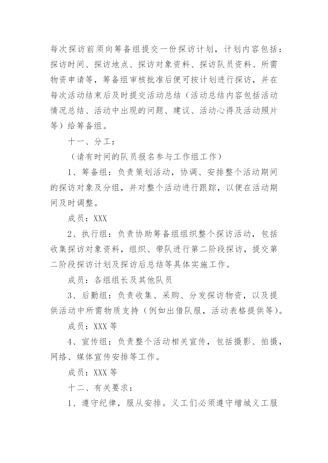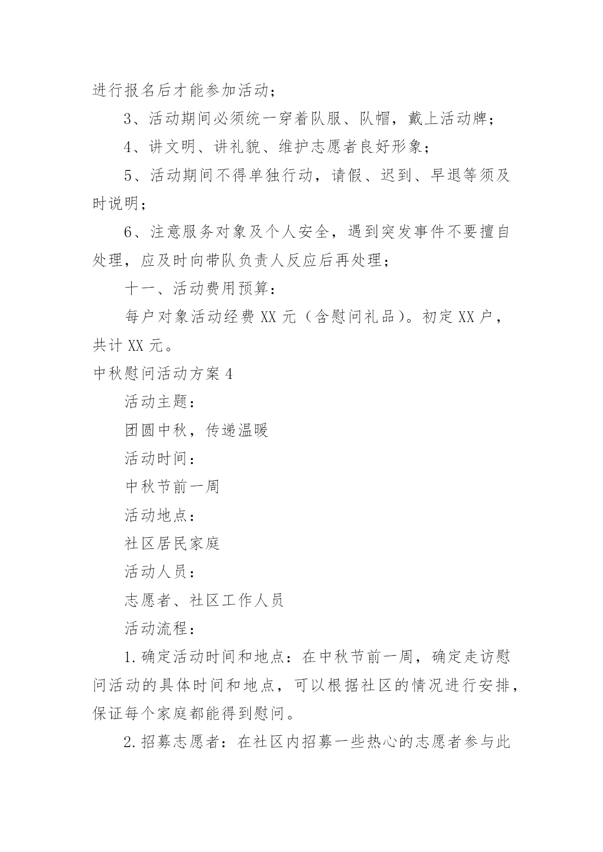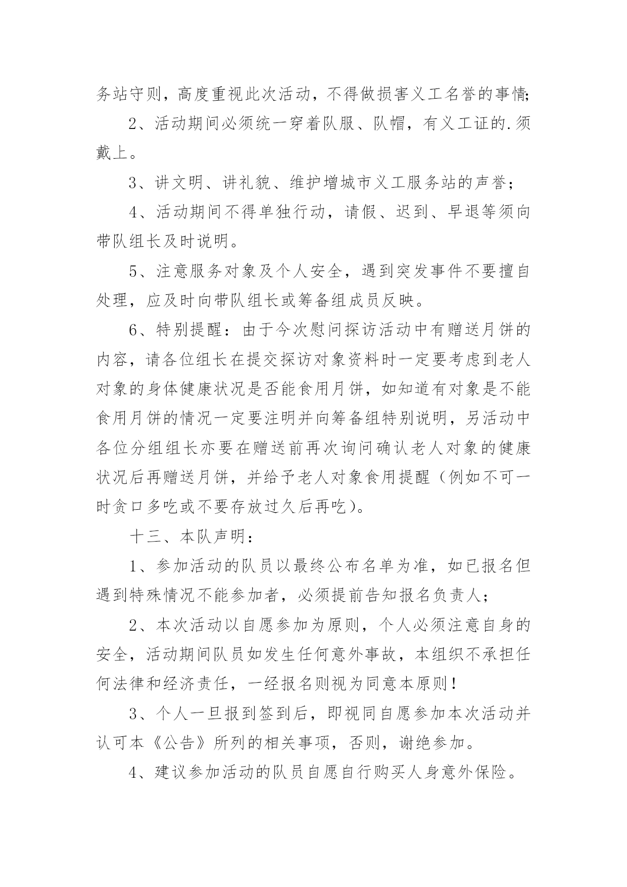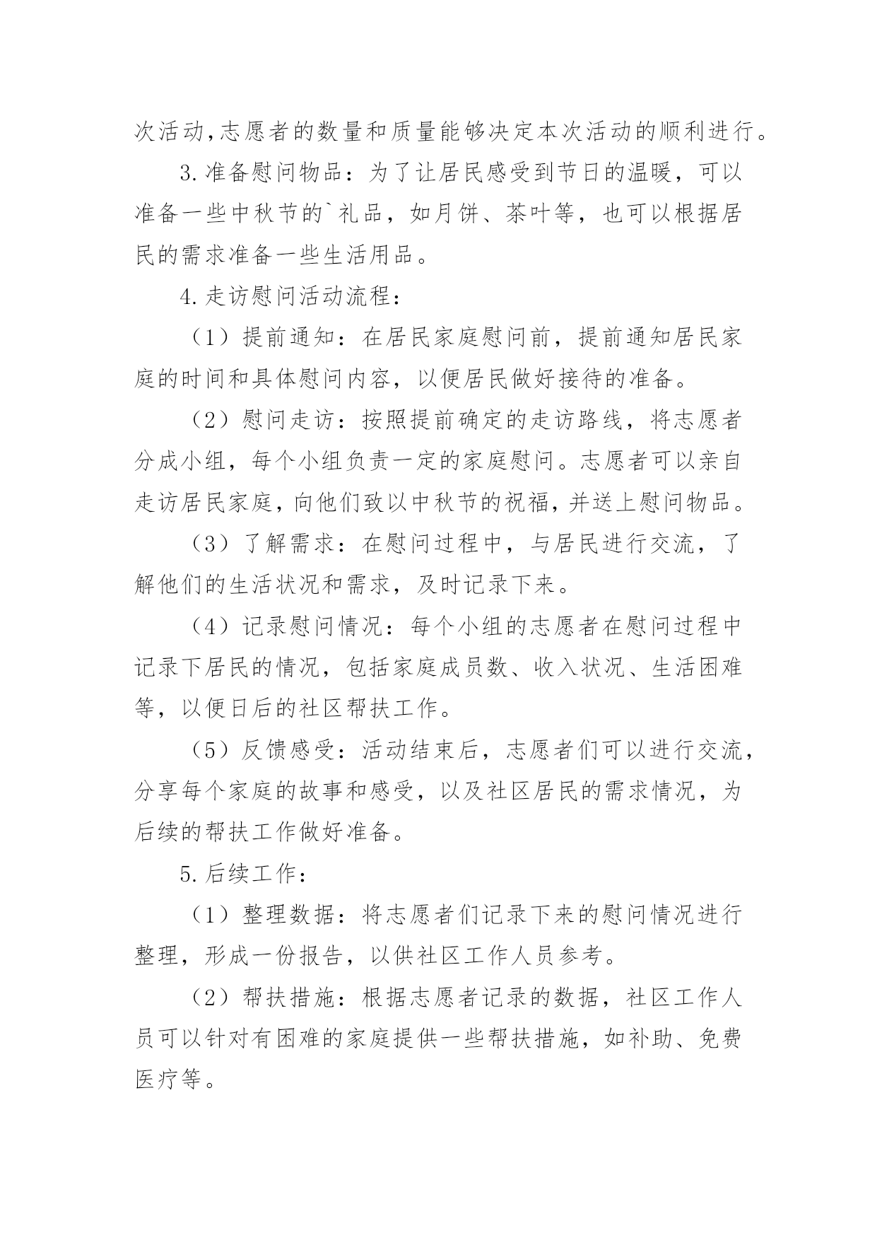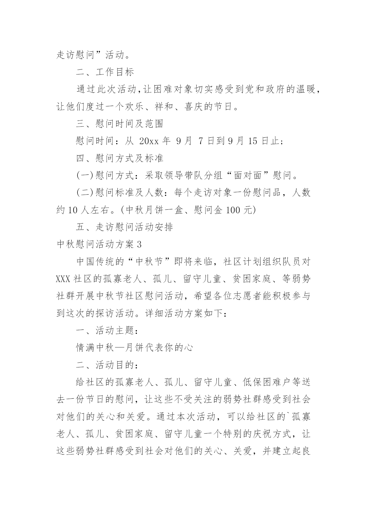 中秋慰问活动方案为了确保工作或事情有序地进行,我们需要提前开始方案制定工作,方案一般包括指导思想、主要目标、工作重点、实施步骤、政策措施、具体要求等项目。方案要怎么制定呢?以下是小编精心整理的中秋慰问活动方案,供大家参考借鉴,希望可以帮助到有需要的朋友。中秋慰问活动方案1一、活动主题:情暖荔乡—月饼代表你的心二、活动目的:给XX城的孤寡老人、低保困难户及孤儿送去一份节日的慰问,让这些不受关注的弱势群体感受到社会对他们的关心和关爱;三、活动筹备:主办方:XX城市义工协会XX城义工服务站月饼赞助:热心市民、队员、清一色水果行、XX广场以及其他商家。媒体支持:XX城日报社、XX城市电视台;四、活动时间:20xx年XX月XX日—XX日五、活动地点:XX城街、XX街、及其他周边地区、小楼敬老院、健娱村;六、活动探访对象:以孤寡老人、空巢老人、孤儿、穷困家庭为主;七、参加人员:XX城义工、热心捐赠的市民及商家代表。八、报名办法:本次公开报名先以XX号为例,如之后的召集探访再另外补充公告并再发飞信通知。本次(XX号、XX号)请发信息1371XXXXX处报名报名格式:实名电话参加XX日上午或下午中秋慰问活动是否有车能坐几人。九、活动内容:以XX月XX日的慰问探访活动拉开20xx年情暖XX乡—月饼代表你的心中秋节慰问探访活动的序幕,义工站队员联同社区中心社工对探访对象进行分阶段、分组慰问探访,具体安排如下:第一阶段:即日起——XX月XX日,各小组可自行安排进行慰问探访。第二阶段:XX月XX、XX日,各小组未安排的再统一集中分组探访;上午以XX城增江为主,下午到小楼、健娱村进行慰问探访。第三阶段:XX月XX、XX日,如物资有多,再对队员市民报料的需要探访的家庭服务对象进行慰问探访。说明:1、在活动期间,各组组长需提交探访对象资料给筹备组审核,然后再由筹备组安排分批、分组进行探访。2、今次慰问探访活动重点时间安排在第一、二阶段,第三阶段会对之前两个阶段未探访的对象安排最后阶段探访,以及当出现所有上报对象慰问探访完毕而捐赠月饼或其他不可保存的捐赠物资有剩余的情况时,再组织队员去老人院及孤儿院或救助站等单位进行慰问探访,以免造成浪费。3、今次慰问探访对象以十帮三居家养老分组对象和部分空巢老人及民政局提供的帮助对象为主。十、活动流程:(以XX月XX日活动为例)1、在XX月XX日前,各组长上报第一阶段慰问探访对象资料给筹备组,筹备组再根据各组上报对象资料确定XX月XX日探访对象名单(如果首批上报对象过多或太分散等情况可安排部分对象在XX号上午探访),并对报名参加探访活动的队员进行分组。2、08:30在义工站集中,进行分组及分派探访对象资料及分配物资;3、09:00联同社工开始分组探访;4、11:30探访活动结束后各组回义工站集中,活动总结、归还剩余探访物质等后解散。(如探访对象过多,可延长20分钟再结束)5、下午13:30集中,去小楼敬老院及XX洞村。说明:即日起,各小组可以自行安排本组队员探访,在每次探访前须向筹备组提交一份探访计划,计划内容包括:探访时间、探访地点、探访对象资料、探访队员资料、所需物资申请等,筹备组审核批准后便可按计划进行探访,并在每次活动结束后及时提交活动总结(活动总结内容包括活动情况总结、活动中出现的问题、建议、活动心得及活动照片等)给筹备组。十一、分工:(请有时间的队员报名参与工作组工作)1、筹备组:负责策划活动,协调、安排整个活动期间的探访对象及分组,并对整个活动进行跟踪,以便在活动期间及时调整。成员:XXX2、执行组:负责协助筹备组组织整个探访活动,包括收集探访对象资料,组织、带队进行第二阶段探访,提交第二阶段探访计划及探访后总结等具体实施工作。成员:各组组长及其他队员3、后勤组:负责收集、采购、分发探访物资,以及提供活动中所需物质支持(例如出借队服,活动表格提供等)。成员:XXX等4、宣传组:负责整个活动相关宣传,包括摄影、拍摄,网络、媒体宣传安排等工作。成员:XXX等十二、有关要求:1、遵守纪律,服从安排。义工们必须遵守增城义工服务站守则,高度重视此次活动,不得做损害义工名誉的事情;2、活动期间必须统一穿着队服、队帽,有义工证的.须戴上。3、讲文明、讲礼貌、维护增城市义工服务站的声誉;4、活动期间不得单独行动,请假、迟到、早退等须向带队组长及时说明。5、注意服务对象及个人安全,遇到突发事件不要擅自处理,应及时向带队组长或筹备组成员反映。6、特别提醒:由于今次慰问探访活动中有赠送月饼的内容,请各位组长在提交探访对象资料时一定要考虑到老人对象的身体健康状况是否能食用月饼,如知道有对象是不能食用月饼的情况一定要注明并向筹备组特别说明,另活动中各位分组组长亦要在赠送前再次询问确认老人对象的健康状况后再赠送月饼,并给予老人对象食