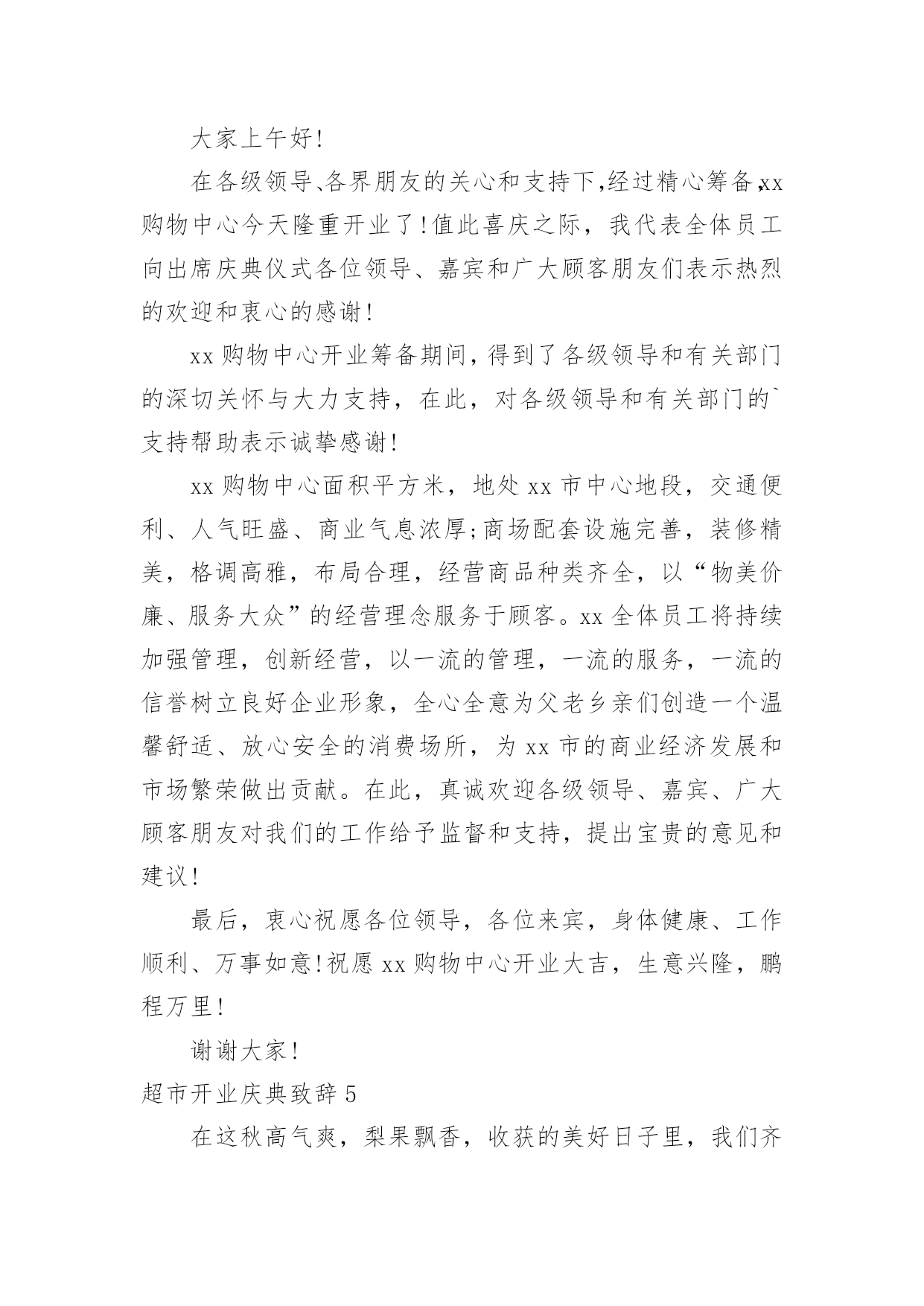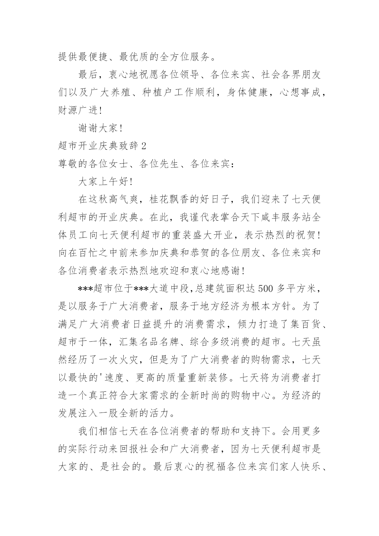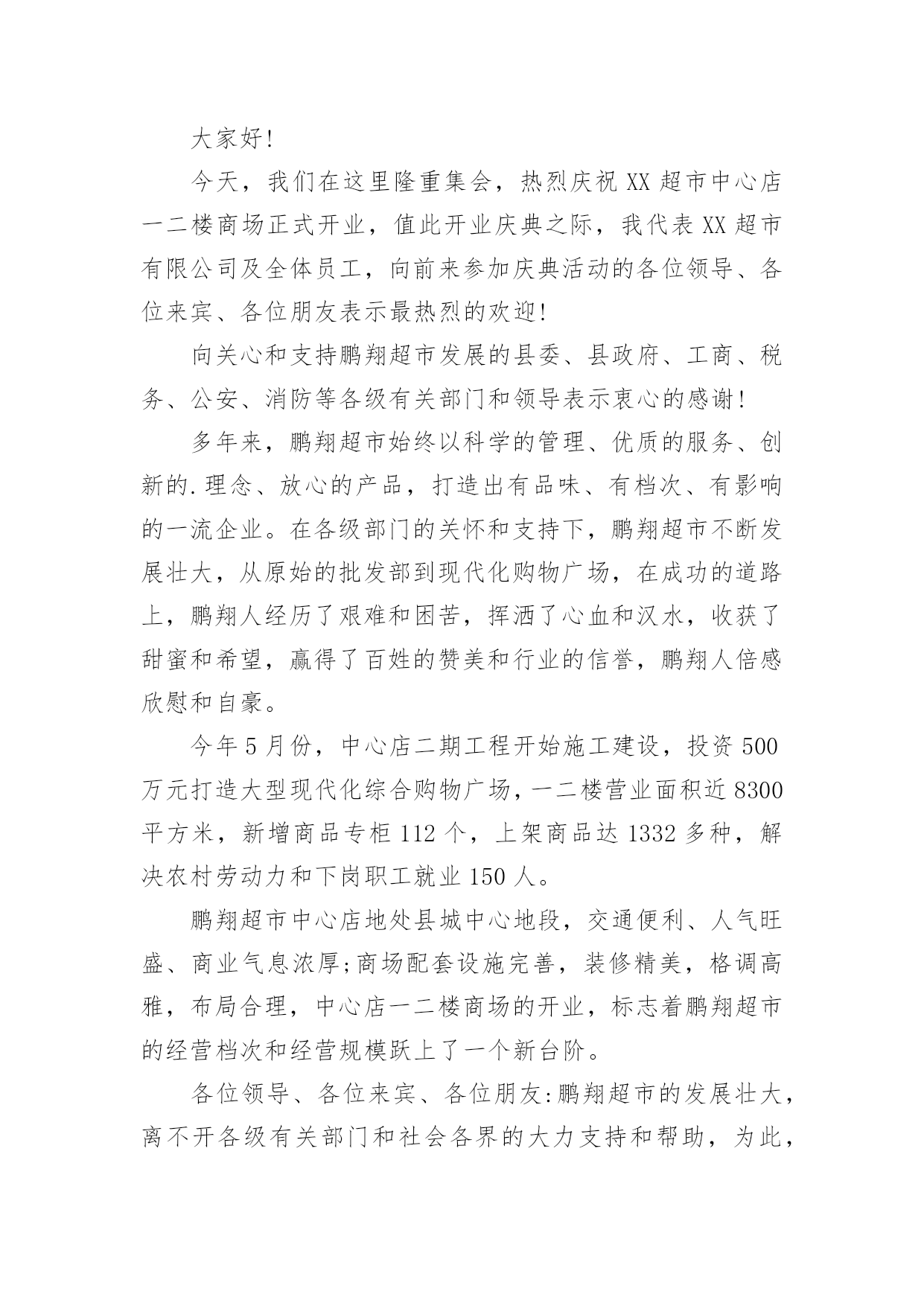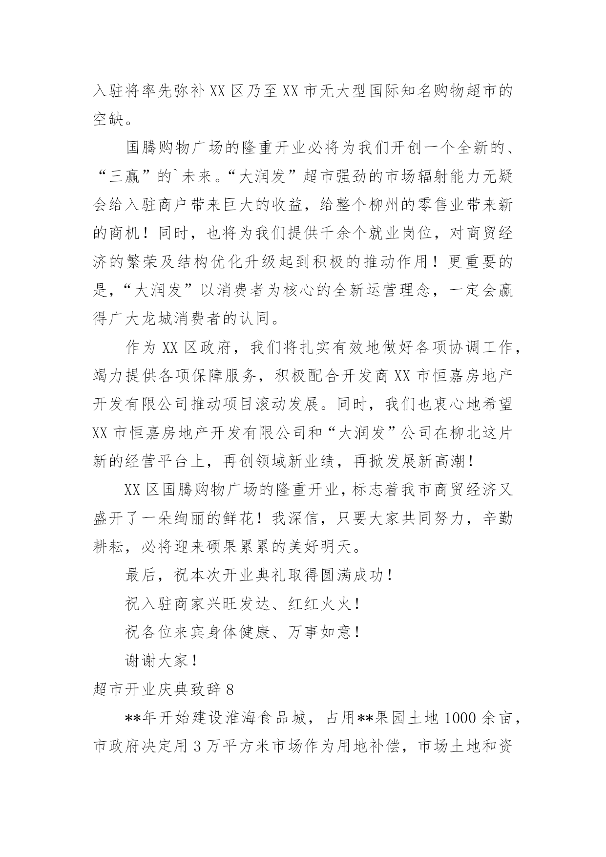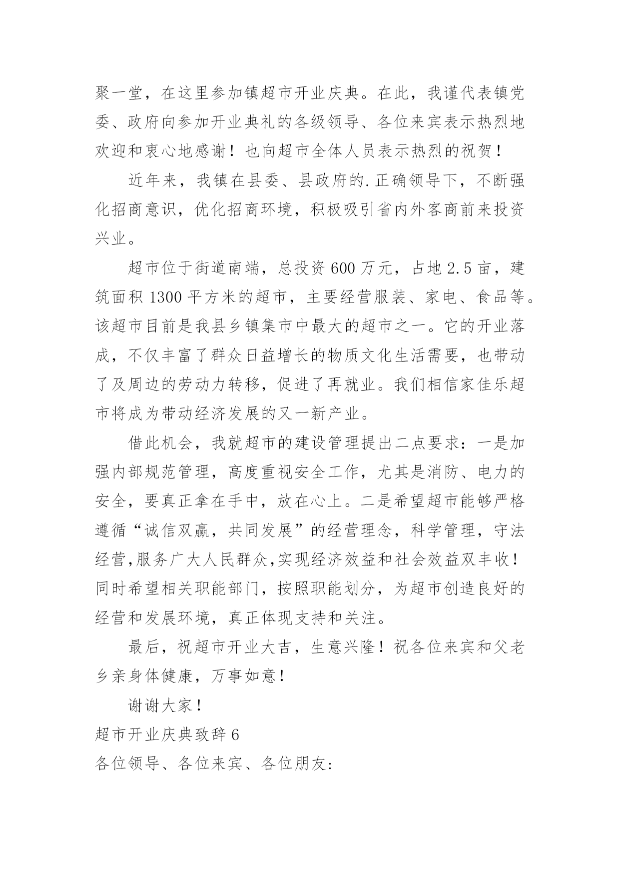 超市开业庆典致辞超市开业庆典致辞在生活、工作和学习中,要用到致辞的地方还是很多的,致辞讲求文辞不能过于口语化。致辞的类型多样,你所见过的致辞是什么样的呢?以下是小编收集整理的超市开业庆典致辞,仅供参考,希望能够帮助到大家。超市开业庆典致辞1尊敬的各位领导、各位来宾、社会各界朋友们:***饲料超市经过一段时间的紧张筹备,迎着桃红柳绿的美好时节,今天正式开业了!首先,我代表*氏家族、代表**饲料超市的'全体员工向曾经关心、支持以及帮助过我们的各位领导、各位来宾以及社会各界朋友们致以最崇高敬意和最衷心地感谢!**饲料超市是***地区第一家以经营畜禽饲料、兽药、种猪等为主的具有高科技技术产品的饲料超市,我们的经营理念为面向农村,服务农业,造福农民!值此开业庆典之际,我代表**饲料超市郑重地向各位领导、各位来宾、社会各界朋友承诺:绝不辜负大家的厚爱,坚持以质量求生存,以信誉求发展,以品牌求壮大。真正做到:以最优质的产品让农民笑,以最优良的服务让农民满意,以最优惠的价格让利于广大用户,以最诚挚守信为广大用户提供最便捷、最优质的全方位服务。最后,衷心地祝愿各位领导、各位来宾、社会各界朋友们以及广大养殖、种植户工作顺利,身体健康,心想事成,财源广进!谢谢大家!超市开业庆典致辞2尊敬的各位女士、各位先生、各位来宾:大家上午好!在这秋高气爽,桂花飘香的好日子,我们迎来了七天便利超市的开业庆典。在此,我谨代表掌合天下咸丰服务站全体员工向七天便利超市的重装盛大开业,表示热烈的祝贺!向在百忙之中前来参加庆典和恭贺的各位朋友、各位来宾和各位消费者表示热烈地欢迎和衷心地感谢!***超市位于***大道中段,总建筑面积达500多平方米,是以服务于广大消费者,服务于地方经济为根本方针。为了满足广大消费者日益提升的消费需求,倾力打造了集百货、超市于一体,汇集名品名牌、综合多级消费的超市。七天虽然经历了一次火灾,但是为了广大消费者的购物需求,七天以最快的'速度、更高的质量重新装修。七天将为消费者打造一个真正符合大家需求的全新时尚的购物中心。为经济的发展注入一股全新的活力。我们相信七天在各位消费者的帮助和支持下。会用更多的实际行动来回报社会和广大消费者,因为七天便利超市是大家的、是社会的。最后衷心的祝福各位来宾们家人快乐、幸福安康!祝七天便利超市开业大吉、生意兴隆!谢谢大家!超市开业庆典致辞3在今天春光明媚、春意融融的大好日子里,超市隆重开业了,作为*****超市,经过二个月的紧张筹备工作,今天正式投入使用了,这是高速实业自营服务区的一个重要里程碑,同时也是高速实业的一件盛事、喜事。值此,谨让我代表向家服务区的全体员工向向家服务区超市的顺利开业表示热烈的'祝贺!向各位领导、各位嘉宾到来表示热烈的欢迎!xxx超市是在徐总的指导和局领导的大力支持下,秉承“以人为本,为民解困”的服务宗旨,由省高速实业负责筹备的。在筹备过程中,得到了社会各界热心人士的鼎力支持,使超市能在这么短的时间内筹备完工,在此向大力支持以及一直以来关心和支持我向家服务区超市发展的热心人士表示衷心的感谢!向家服务区超市是一家以经营副食、日化为主,经营门类齐全、购物环境优雅、管理水平一流的购物超市。向家服务区超市的开业,必将对进一步满足外地游客的消费需求,促进高速实业的发展起到积极的作用。助超市能越办越好,希望向家服务区超市能发挥作用,为广大高速群体带来福音,让我们大家为这一共同目标而不懈努力,谢谢!超市开业庆典致辞4尊敬的各位领导,各位嘉宾,朋友们:大家上午好!在各级领导、各界朋友的关心和支持下,经过精心筹备,xx购物中心今天隆重开业了!值此喜庆之际,我代表全体员工向出席庆典仪式各位领导、嘉宾和广大顾客朋友们表示热烈的欢迎和衷心的感谢!xx购物中心开业筹备期间,得到了各级领导和有关部门的深切关怀与大力支持,在此,对各级领导和有关部门的`支持帮助表示诚挚感谢!xx购物中心面积平方米,地处xx市中心地段,交通便利、人气旺盛、商业气息浓厚;商场配套设施完善,装修精美,格调高雅,布局合理,经营商品种类齐全,以“物美价廉、服务大众”的经营理念服务于顾客。xx全体员工将持续加强管理,创新经营,以一流的管理,一流的服务,一流的信誉树立良好企业形象,全心全意为父老乡亲们创造一个温馨舒适、放心安全的消费场所,为xx市的商业经济发展和市场繁荣做出贡献。在此,真诚欢迎各级领导、嘉宾、广大顾客朋友对我们的工作给予监督和支持,提出宝贵的意见和建议!最后,衷心祝愿各位领导,各位来宾,身体健康、工作顺利、万事如意!祝愿xx购物中心开业大吉,生意兴隆,鹏程万里!谢谢大家!超市开业庆典致辞5在这秋高气爽,梨果飘香,收获的美好日子里,我们齐聚一堂,在这里参加镇超市开业庆典。在此,我谨代表镇党委、政府向参加开业典礼的各级领导、各位来宾表示
