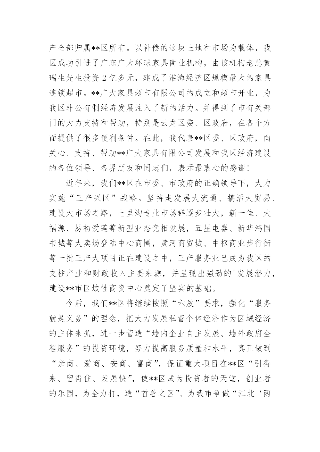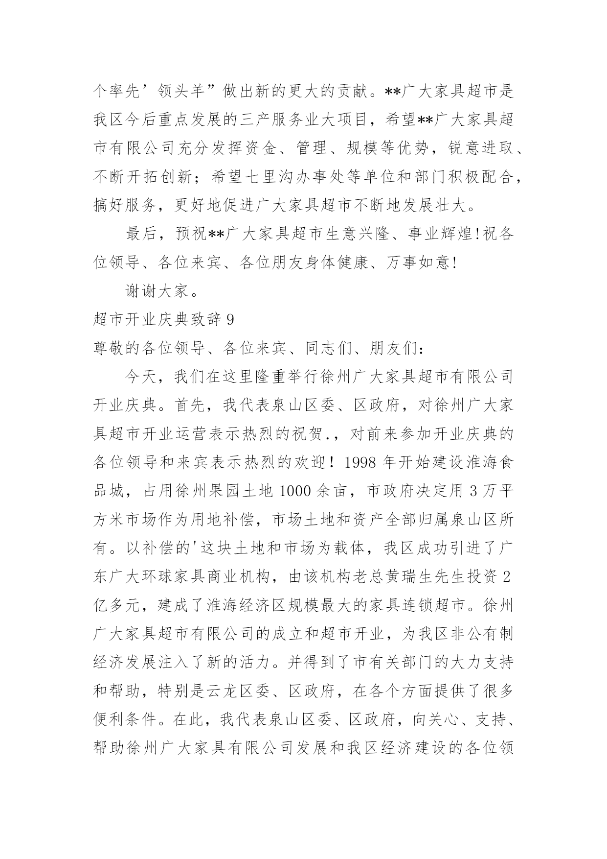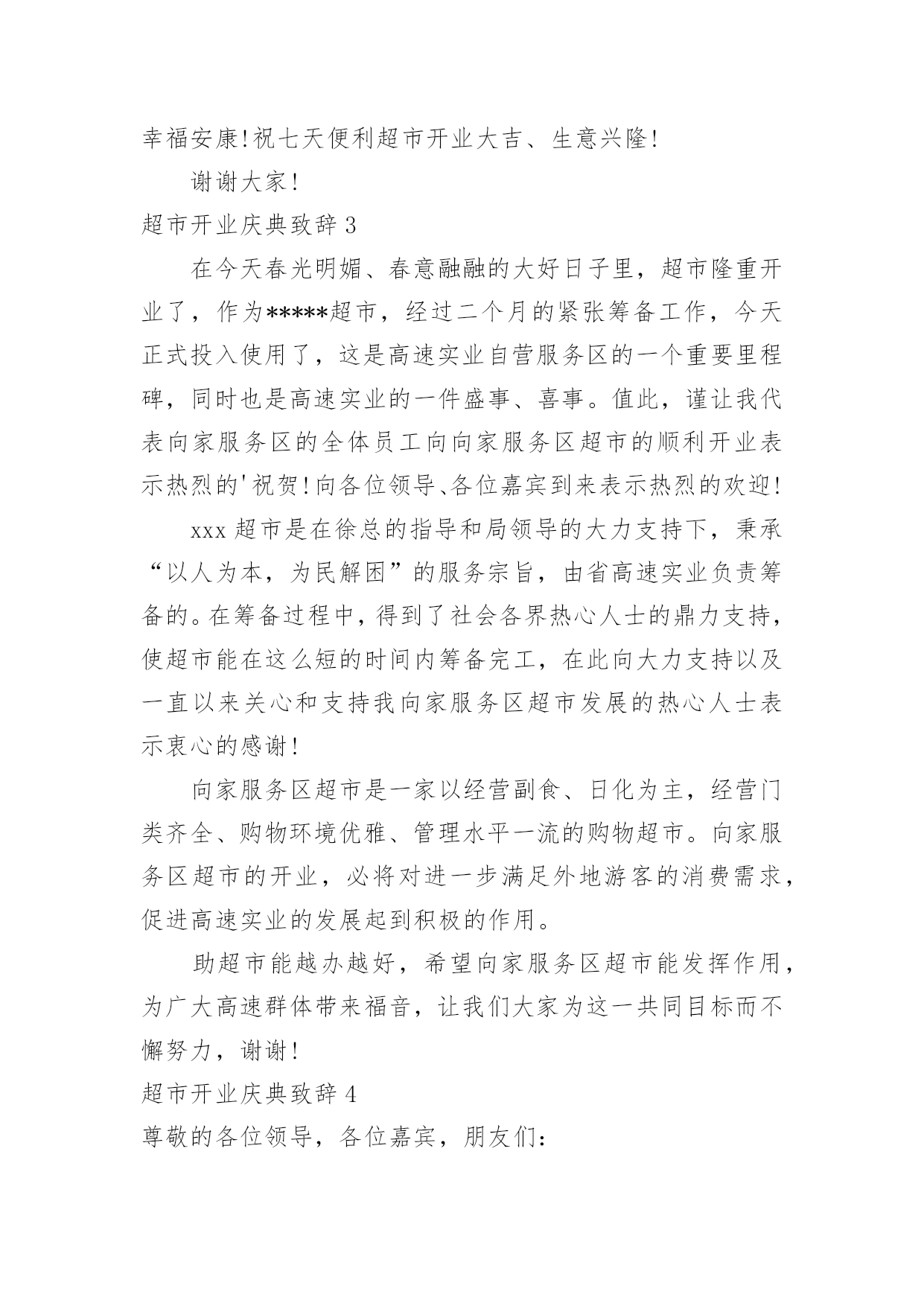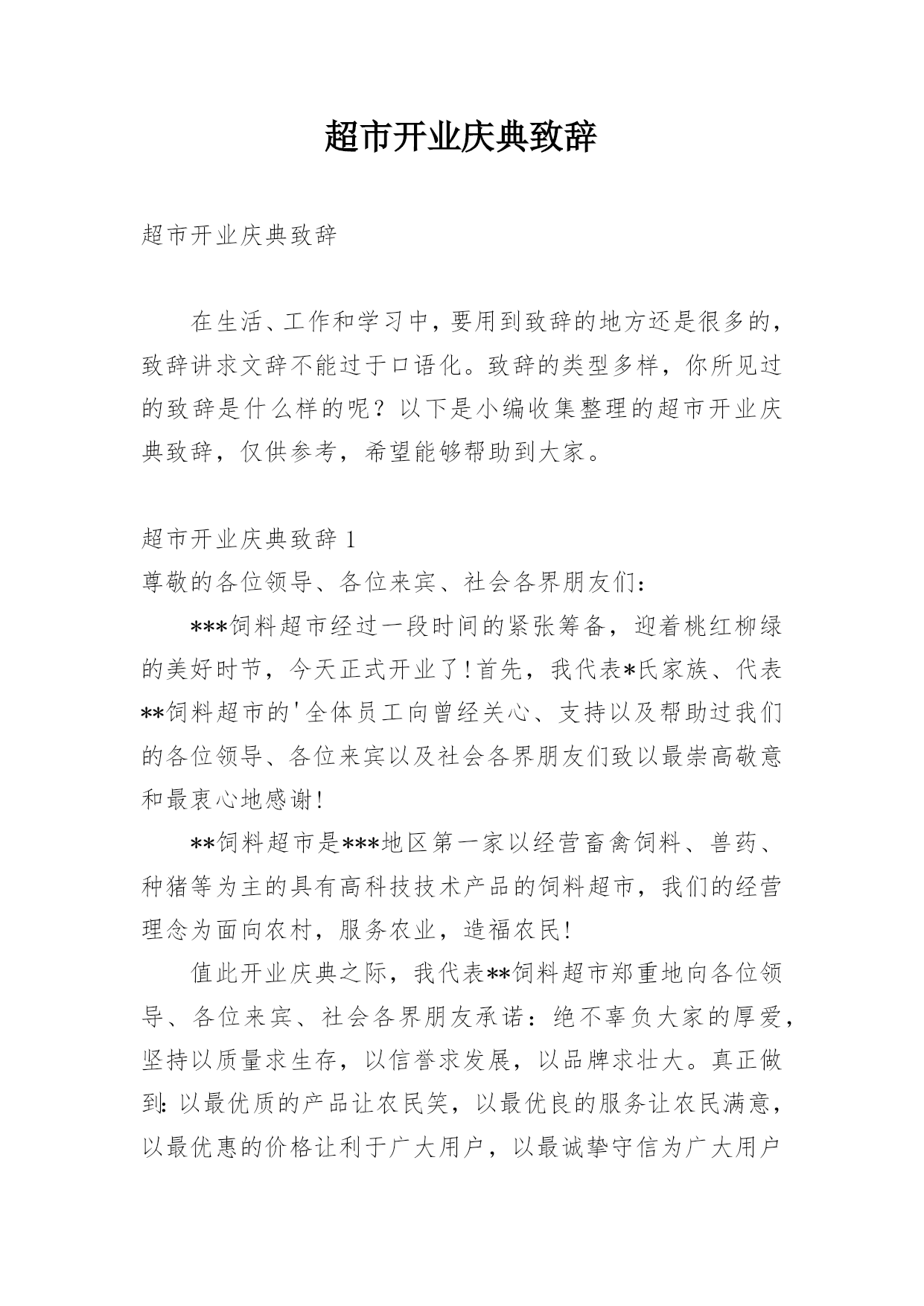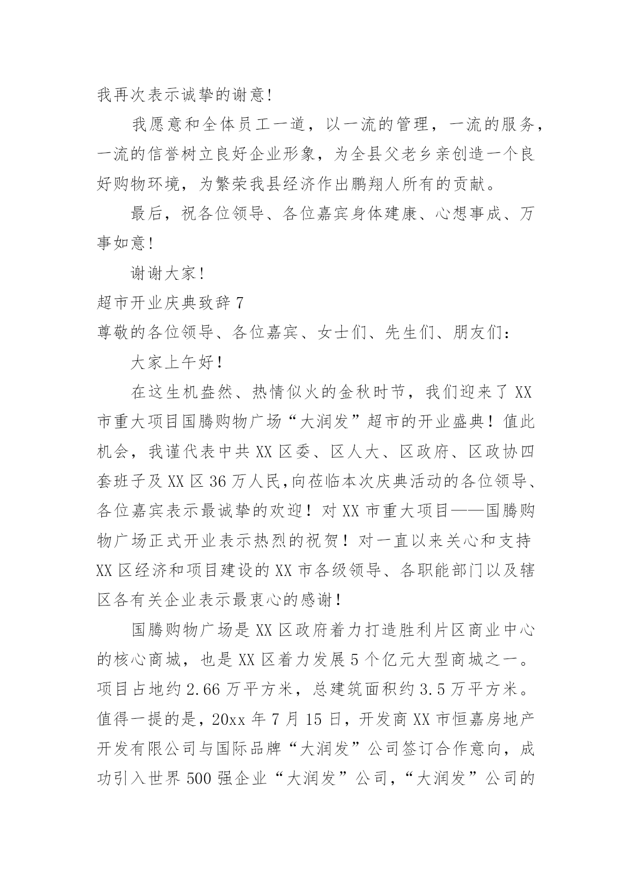 超市开业庆典致辞超市开业庆典致辞在生活、工作和学习中,要用到致辞的地方还是很多的,致辞讲求文辞不能过于口语化。致辞的类型多样,你所见过的致辞是什么样的呢?以下是小编收集整理的超市开业庆典致辞,仅供参考,希望能够帮助到大家。超市开业庆典致辞1尊敬的各位领导、各位来宾、社会各界朋友们:***饲料超市经过一段时间的紧张筹备,迎着桃红柳绿的美好时节,今天正式开业了!首先,我代表*氏家族、代表**饲料超市的'全体员工向曾经关心、支持以及帮助过我们的各位领导、各位来宾以及社会各界朋友们致以最崇高敬意和最衷心地感谢!**饲料超市是***地区第一家以经营畜禽饲料、兽药、种猪等为主的具有高科技技术产品的饲料超市,我们的经营理念为面向农村,服务农业,造福农民!值此开业庆典之际,我代表**饲料超市郑重地向各位领导、各位来宾、社会各界朋友承诺:绝不辜负大家的厚爱,坚持以质量求生存,以信誉求发展,以品牌求壮大。真正做到:以最优质的产品让农民笑,以最优良的服务让农民满意,以最优惠的价格让利于广大用户,以最诚挚守信为广大用户提供最便捷、最优质的全方位服务。最后,衷心地祝愿各位领导、各位来宾、社会各界朋友们以及广大养殖、种植户工作顺利,身体健康,心想事成,财源广进!谢谢大家!超市开业庆典致辞2尊敬的各位女士、各位先生、各位来宾:大家上午好!在这秋高气爽,桂花飘香的好日子,我们迎来了七天便利超市的开业庆典。在此,我谨代表掌合天下咸丰服务站全体员工向七天便利超市的重装盛大开业,表示热烈的祝贺!向在百忙之中前来参加庆典和恭贺的各位朋友、各位来宾和各位消费者表示热烈地欢迎和衷心地感谢!***超市位于***大道中段,总建筑面积达500多平方米,是以服务于广大消费者,服务于地方经济为根本方针。为了满足广大消费者日益提升的消费需求,倾力打造了集百货、超市于一体,汇集名品名牌、综合多级消费的超市。七天虽然经历了一次火灾,但是为了广大消费者的购物需求,七天以最快的'速度、更高的质量重新装修。七天将为消费者打造一个真正符合大家需求的全新时尚的购物中心。为经济的发展注入一股全新的活力。我们相信七天在各位消费者的帮助和支持下。会用更多的实际行动来回报社会和广大消费者,因为七天便利超市是大家的、是社会的。最后衷心的祝福各位来宾们家人快乐、幸福安康!祝七天便利超市开业大吉、生意兴隆!谢谢大家!超市开业庆典致辞3在今天春光明媚、春意融融的大好日子里,超市隆重开业了,作为*****超市,经过二个月的紧张筹备工作,今天正式投入使用了,这是高速实业自营服务区的一个重要里程碑,同时也是高速实业的一件盛事、喜事。值此,谨让我代表向家服务区的全体员工向向家服务区超市的顺利开业表示热烈的'祝贺!向各位领导、各位嘉宾到来表示热烈的欢迎!xxx超市是在徐总的指导和局领导的大力支持下,秉承“以人为本,为民解困”的服务宗旨,由省高速实业负责筹备的。在筹备过程中,得到了社会各界热心人士的鼎力支持,使超市能在这么短的时间内筹备完工,在此向大力支持以及一直以来关心和支持我向家服务区超市发展的热心人士表示衷心的感谢!向家服务区超市是一家以经营副食、日化为主,经营门类齐全、购物环境优雅、管理水平一流的购物超市。向家服务区超市的开业,必将对进一步满足外地游客的消费需求,促进高速实业的发展起到积极的作用。助超市能越办越好,希望向家服务区超市能发挥作用,为广大高速群体带来福音,让我们大家为这一共同目标而不懈努力,谢谢!超市开业庆典致辞4尊敬的各位领导,各位嘉宾,朋友们:大家上午好!在各级领导、各界朋友的关心和支持下,经过精心筹备,xx购物中心今天隆重开业了!值此喜庆之际,我代表全体员工向出席庆典仪式各位领导、嘉宾和广大顾客朋友们表示热烈的欢迎和衷心的感谢!xx购物中心开业筹备期间,得到了各级领导和有关部门的深切关怀与大力支持,在此,对各级领导和有关部门的`支持帮助表示诚挚感谢!xx购物中心面积平方米,地处xx市中心地段,交通便利、人气旺盛、商业气息浓厚;商场配套设施完善,装修精美,格调高雅,布局合理,经营商品种类齐全,以“物美价廉、服务大众”的经营理念服务于顾客。xx全体员工将持续加强管理,创新经营,以一流的管理,一流的服务,一流的信誉树立良好企业形象,全心全意为父老乡亲们创造一个温馨舒适、放心安全的消费场所,为xx市的商业经济发展和市场繁荣做出贡献。在此,真诚欢迎各级领导、嘉宾、广大顾客朋友对我们的工作给予监督和支持,提出宝贵的意见和建议!最后,衷心祝愿各位领导,各位来宾,身体健康、工作顺利、万事如意!祝愿xx购物中心开业大吉,生意兴隆,鹏程万里!谢谢大家!超市开业庆典致辞5在这秋高气爽,梨果飘香,收获的美好日子里,我们齐聚一堂,在这里参加镇超市开业庆典。在此,我谨代表镇党委、政府向参加开业典礼的各级领导、各位来宾表示
