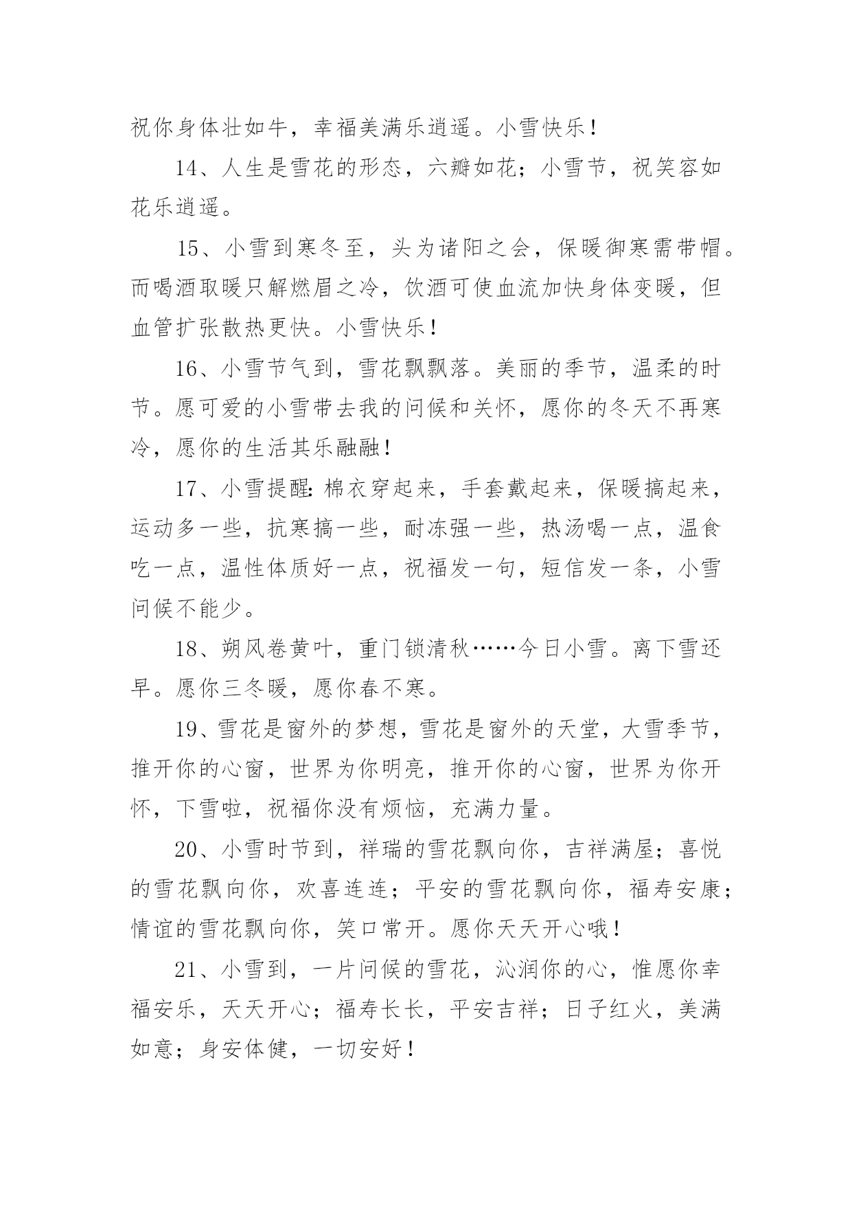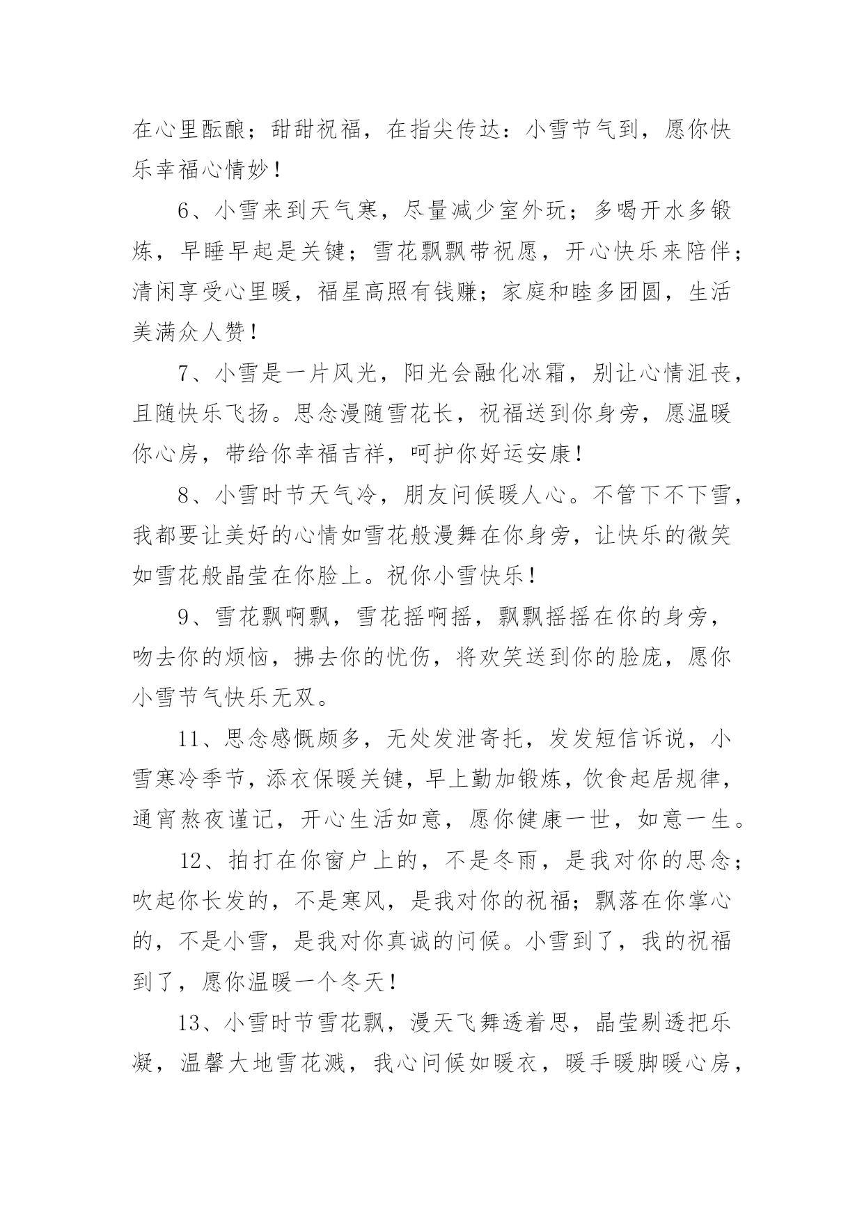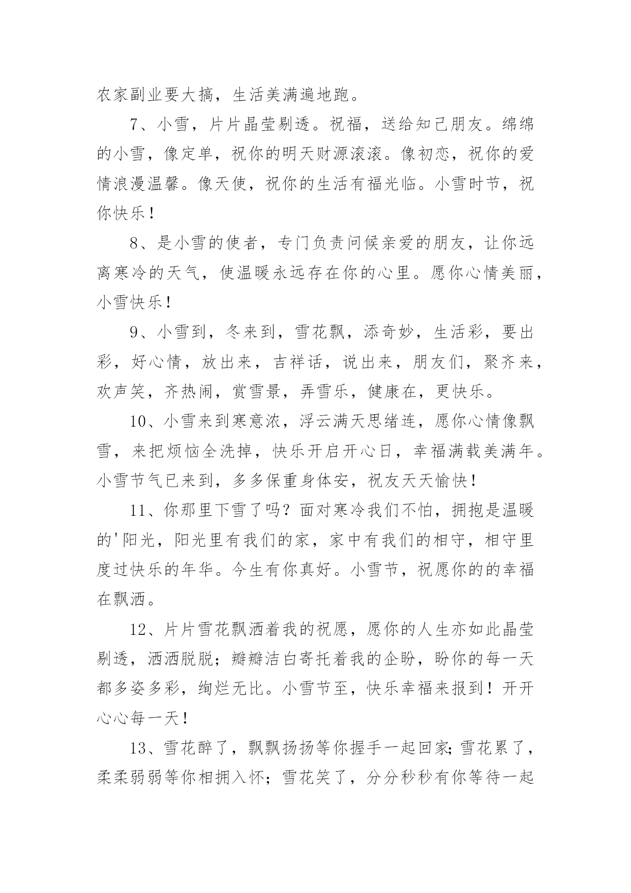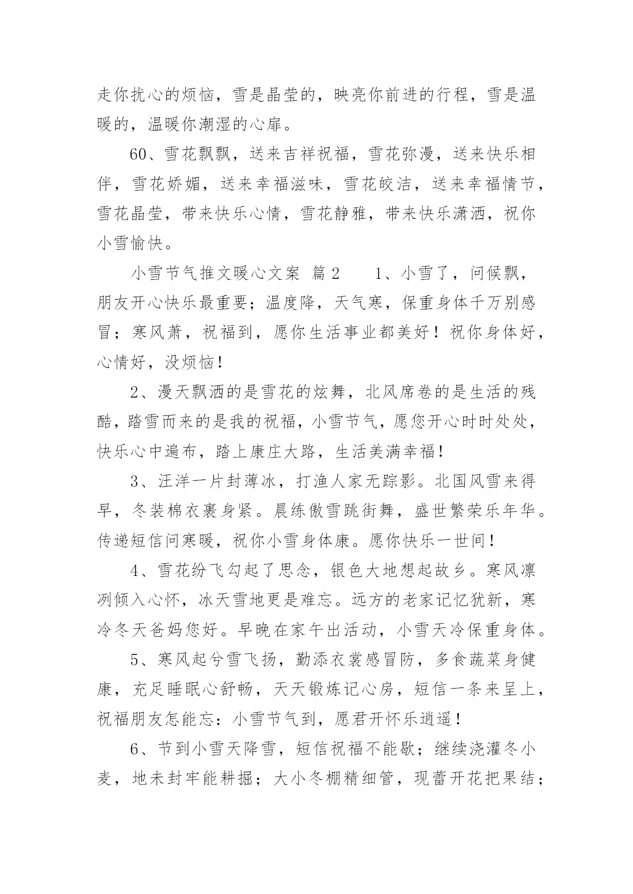 小雪节气推文暖心文案小雪节气推文暖心文案大全随着社交网络和信息技术的飞速发展,越来越多人会在朋友圈发布文案,文案对人们的思维是有一定的感性作用的。那什么样的文案才是经典的呢?以下是小编帮大家整理的小雪节气推文暖心文案,希望对大家有所帮助。小雪节气推文暖心文案篇11、裹着洁白的祝福,我从快乐天堂飘然而至,为你带来最冰清玉洁的祝福,愿你在这个寒冷的时节感受到幸福的温暖。请记住,我的名字叫“小雪”。2、用热情将冰雪融化,用真心将北风拦下。岁月如沙,小雪似花,我将幸福的阳光裹进电波里,让快乐的祝福钻进你心里,温暖你的冬季,美丽你的心情。3、抬头看天空,雪花们正在空中翩翩起舞。我踩在雪地上,一个人置身于这一片白茫茫的景象当中,仿佛来到了天堂,脚下是软软的白云,身边是可爱而纯洁的小精灵。我用我在学校学的舞蹈跟这些小精灵们跳起了舞。4、冬天是这样来的,踏雪而至;雪是这样下的,纷纷扬扬;短信是这样发的,雪中送炭;情意是这样深的,地久天长。朋友,下雪了,注意防寒。5、朵朵白云,在空中悠荡;阵阵寒风,在身边徜徉;片片雪花,在风中飞扬;浓浓情谊,在心底珍藏;绵绵思念,在心里酝酿;甜甜祝福,在指尖传达:小雪节气到,愿你快乐幸福心情妙!6、小雪来到天气寒,尽量减少室外玩;多喝开水多锻炼,早睡早起是关键;雪花飘飘带祝愿,开心快乐来陪伴;清闲享受心里暖,福星高照有钱赚;家庭和睦多团圆,生活美满众人赞!7、小雪是一片风光,阳光会融化冰霜,别让心情沮丧,且随快乐飞扬。思念漫随雪花长,祝福送到你身旁,愿温暖你心房,带给你幸福吉祥,呵护你好运安康!8、小雪时节天气冷,朋友问候暖人心。不管下不下雪,我都要让美好的心情如雪花般漫舞在你身旁,让快乐的微笑如雪花般晶莹在你脸上。祝你小雪快乐!9、雪花飘啊飘,雪花摇啊摇,飘飘摇摇在你的身旁,吻去你的烦恼,拂去你的忧伤,将欢笑送到你的脸庞,愿你小雪节气快乐无双。11、思念感慨颇多,无处发泄寄托,发发短信诉说,小雪寒冷季节,添衣保暖关键,早上勤加锻炼,饮食起居规律,通宵熬夜谨记,开心生活如意,愿你健康一世,如意一生。12、拍打在你窗户上的,不是冬雨,是我对你的思念;吹起你长发的,不是寒风,是我对你的祝福;飘落在你掌心的,不是小雪,是我对你真诚的问候。小雪到了,我的祝福到了,愿你温暖一个冬天!13、小雪时节雪花飘,漫天飞舞透着思,晶莹剔透把乐凝,温馨大地雪花溅,我心问候如暖衣,暖手暖脚暖心房,祝你身体壮如牛,幸福美满乐逍遥。小雪快乐!14、人生是雪花的形态,六瓣如花;小雪节,祝笑容如花乐逍遥。15、小雪到寒冬至,头为诸阳之会,保暖御寒需带帽。而喝酒取暖只解燃眉之冷,饮酒可使血流加快身体变暖,但血管扩张散热更快。小雪快乐!16、小雪节气到,雪花飘飘落。美丽的季节,温柔的时节。愿可爱的小雪带去我的问候和关怀,愿你的冬天不再寒冷,愿你的生活其乐融融!17、小雪提醒:棉衣穿起来,手套戴起来,保暖搞起来,运动多一些,抗寒搞一些,耐冻强一些,热汤喝一点,温食吃一点,温性体质好一点,祝福发一句,短信发一条,小雪问候不能少。18、朔风卷黄叶,重门锁清秋……今日小雪。离下雪还早。愿你三冬暖,愿你春不寒。19、雪花是窗外的梦想,雪花是窗外的天堂,大雪季节,推开你的心窗,世界为你明亮,推开你的心窗,世界为你开怀,下雪啦,祝福你没有烦恼,充满力量。20、小雪时节到,祥瑞的雪花飘向你,吉祥满屋;喜悦的雪花飘向你,欢喜连连;平安的雪花飘向你,福寿安康;情谊的雪花飘向你,笑口常开。愿你天天开心哦!21、小雪到,一片问候的雪花,沁润你的心,惟愿你幸福安乐,天天开心;福寿长长,平安吉祥;日子红火,美满如意;身安体健,一切安好!22、小雪轻轻飘呀飘,捎来祝福一串串:一祝你身体倍棒能耐寒,二祝你工作顺利能力升,三祝你夫妻恩爱能性福,四祝你家庭和睦暖融融,五祝你高朋满座乐开怀!23、小雪北风寒,棉粮油料快收完,收完回家暖一暖。油菜定植麦续播,贮足饲料莫迟延,迟延寒风影无踪。合家幸福喜来充,生活美满乐其中。24、每一份祝福我都塞得满满的,每一个祝愿我都添得实实的,每一句问候我都烘得暖暖的,小雪到了,给你最暖的问候,望你如意相随,给你最实的祝愿,盼你幸福相伴,送你最满的祝福,愿你小雪快乐。25、山顶上积雪未融,如白银宫阙;向阳的山头上冒着乳白色的烟雾,缭绕,蒸腾,汇集成云朵,澹澹的几朵白云,一半镶在天空中,一半粘在山峰上,似乎是个安琪儿,展开了一幅冰绡,更替这山加冕。26、冰冷时节不冰冷,雪花飘飘送温情,北风时节情不北,温暖祝福来相随,随雪快乐随雪喜,幸福弄雪乐无极,雪花飘飘好生活,幸福快乐无限多,祝你小雪快乐,幸福无敌。27、当雪花飘满人间,当世界皎洁一片,当纯洁填满心田,当激动溢出容颜,当思念再次飘远,祝福你已成必然,幸福的味道,快乐的口号,愿你小雪万事美好。28、