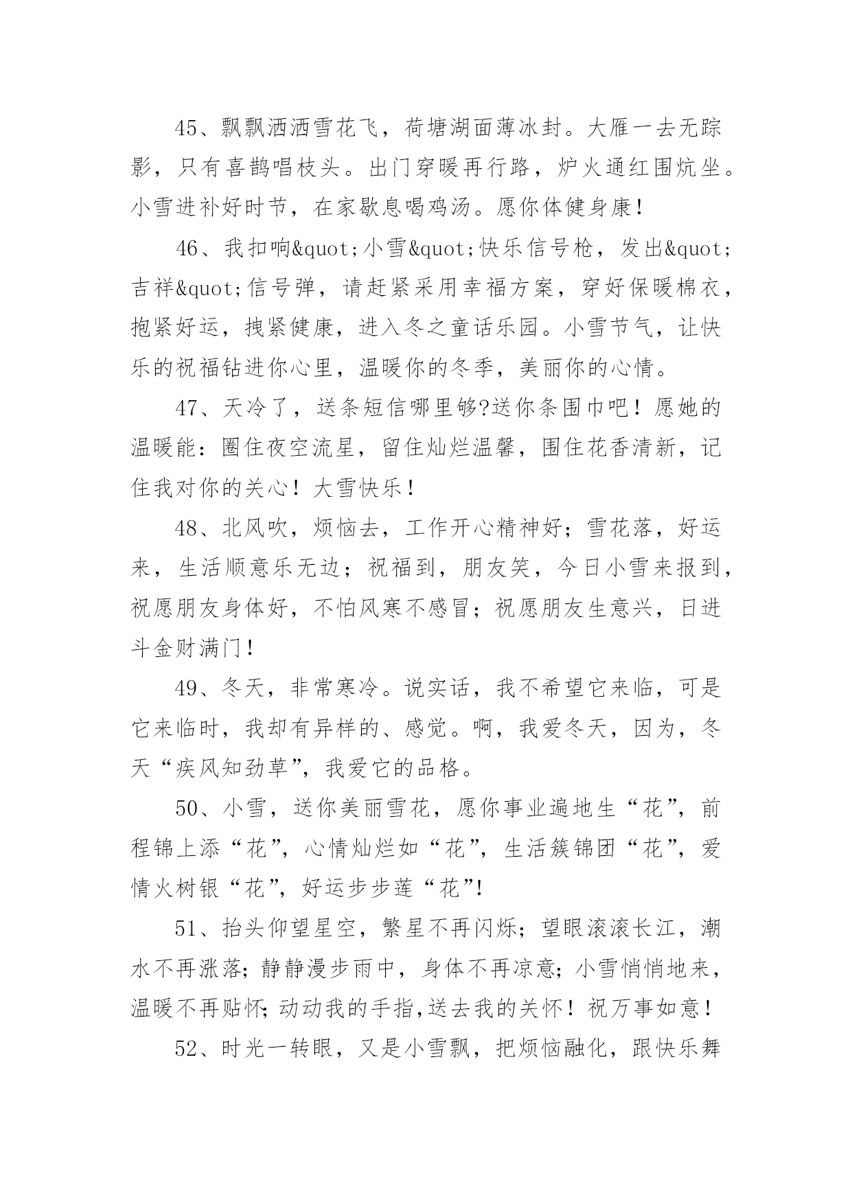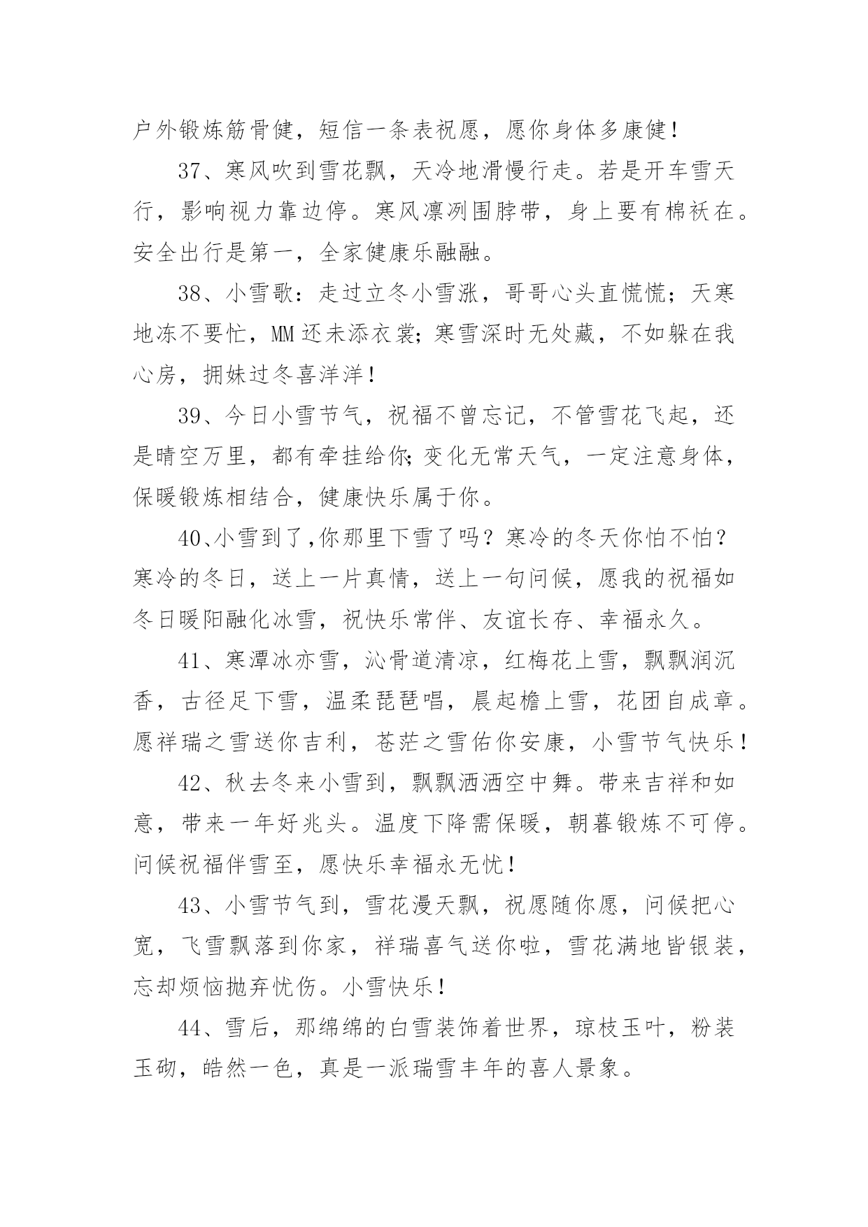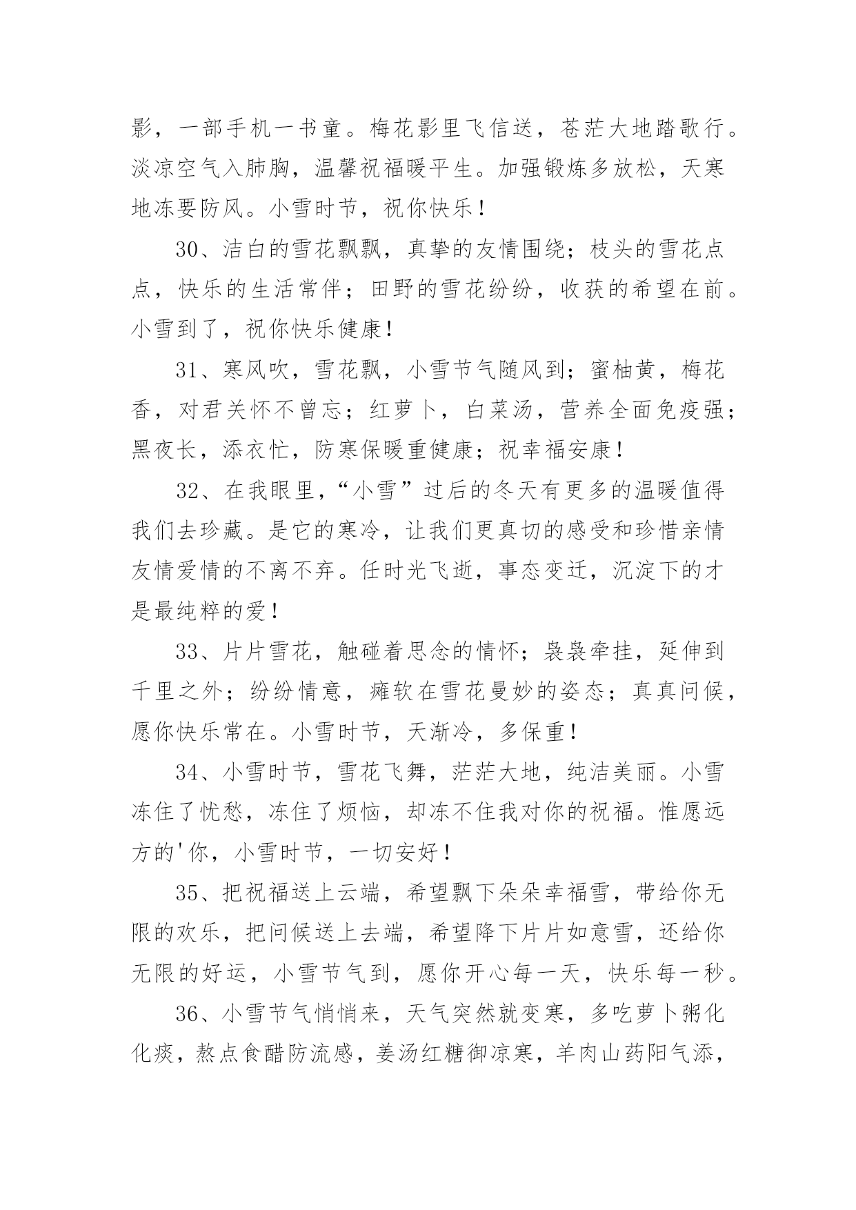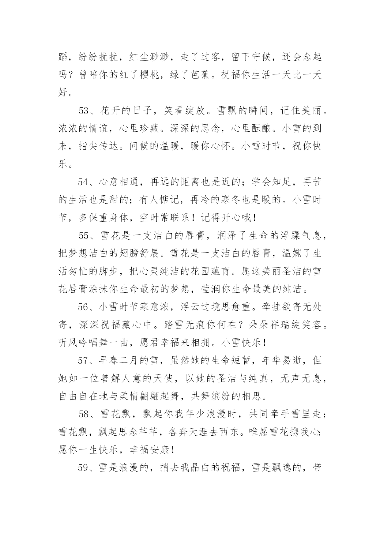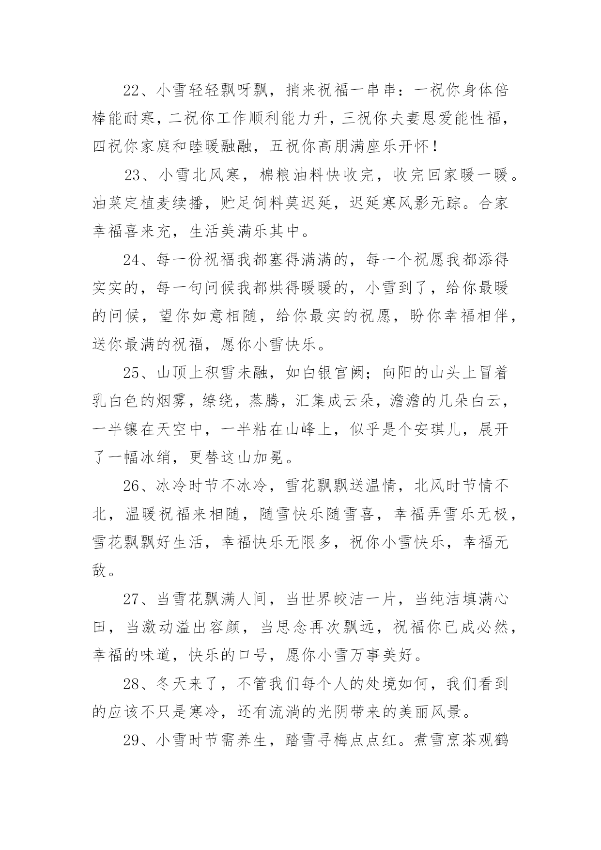 小雪节气推文暖心文案小雪节气推文暖心文案大全随着社交网络和信息技术的飞速发展,越来越多人会在朋友圈发布文案,文案对人们的思维是有一定的感性作用的。那什么样的文案才是经典的呢?以下是小编帮大家整理的小雪节气推文暖心文案,希望对大家有所帮助。小雪节气推文暖心文案篇11、裹着洁白的祝福,我从快乐天堂飘然而至,为你带来最冰清玉洁的祝福,愿你在这个寒冷的时节感受到幸福的温暖。请记住,我的名字叫“小雪”。2、用热情将冰雪融化,用真心将北风拦下。岁月如沙,小雪似花,我将幸福的阳光裹进电波里,让快乐的祝福钻进你心里,温暖你的冬季,美丽你的心情。3、抬头看天空,雪花们正在空中翩翩起舞。我踩在雪地上,一个人置身于这一片白茫茫的景象当中,仿佛来到了天堂,脚下是软软的白云,身边是可爱而纯洁的小精灵。我用我在学校学的舞蹈跟这些小精灵们跳起了舞。4、冬天是这样来的,踏雪而至;雪是这样下的,纷纷扬扬;短信是这样发的,雪中送炭;情意是这样深的,地久天长。朋友,下雪了,注意防寒。5、朵朵白云,在空中悠荡;阵阵寒风,在身边徜徉;片片雪花,在风中飞扬;浓浓情谊,在心底珍藏;绵绵思念,在心里酝酿;甜甜祝福,在指尖传达:小雪节气到,愿你快乐幸福心情妙!6、小雪来到天气寒,尽量减少室外玩;多喝开水多锻炼,早睡早起是关键;雪花飘飘带祝愿,开心快乐来陪伴;清闲享受心里暖,福星高照有钱赚;家庭和睦多团圆,生活美满众人赞!7、小雪是一片风光,阳光会融化冰霜,别让心情沮丧,且随快乐飞扬。思念漫随雪花长,祝福送到你身旁,愿温暖你心房,带给你幸福吉祥,呵护你好运安康!8、小雪时节天气冷,朋友问候暖人心。不管下不下雪,我都要让美好的心情如雪花般漫舞在你身旁,让快乐的微笑如雪花般晶莹在你脸上。祝你小雪快乐!9、雪花飘啊飘,雪花摇啊摇,飘飘摇摇在你的身旁,吻去你的烦恼,拂去你的忧伤,将欢笑送到你的脸庞,愿你小雪节气快乐无双。11、思念感慨颇多,无处发泄寄托,发发短信诉说,小雪寒冷季节,添衣保暖关键,早上勤加锻炼,饮食起居规律,通宵熬夜谨记,开心生活如意,愿你健康一世,如意一生。12、拍打在你窗户上的,不是冬雨,是我对你的思念;吹起你长发的,不是寒风,是我对你的祝福;飘落在你掌心的,不是小雪,是我对你真诚的问候。小雪到了,我的祝福到了,愿你温暖一个冬天!13、小雪时节雪花飘,漫天飞舞透着思,晶莹剔透把乐凝,温馨大地雪花溅,我心问候如暖衣,暖手暖脚暖心房,祝你身体壮如牛,幸福美满乐逍遥。小雪快乐!14、人生是雪花的形态,六瓣如花;小雪节,祝笑容如花乐逍遥。15、小雪到寒冬至,头为诸阳之会,保暖御寒需带帽。而喝酒取暖只解燃眉之冷,饮酒可使血流加快身体变暖,但血管扩张散热更快。小雪快乐!16、小雪节气到,雪花飘飘落。美丽的季节,温柔的时节。愿可爱的小雪带去我的问候和关怀,愿你的冬天不再寒冷,愿你的生活其乐融融!17、小雪提醒:棉衣穿起来,手套戴起来,保暖搞起来,运动多一些,抗寒搞一些,耐冻强一些,热汤喝一点,温食吃一点,温性体质好一点,祝福发一句,短信发一条,小雪问候不能少。18、朔风卷黄叶,重门锁清秋……今日小雪。离下雪还早。愿你三冬暖,愿你春不寒。19、雪花是窗外的梦想,雪花是窗外的天堂,大雪季节,推开你的心窗,世界为你明亮,推开你的心窗,世界为你开怀,下雪啦,祝福你没有烦恼,充满力量。20、小雪时节到,祥瑞的雪花飘向你,吉祥满屋;喜悦的雪花飘向你,欢喜连连;平安的雪花飘向你,福寿安康;情谊的雪花飘向你,笑口常开。愿你天天开心哦!21、小雪到,一片问候的雪花,沁润你的心,惟愿你幸福安乐,天天开心;福寿长长,平安吉祥;日子红火,美满如意;身安体健,一切安好!22、小雪轻轻飘呀飘,捎来祝福一串串:一祝你身体倍棒能耐寒,二祝你工作顺利能力升,三祝你夫妻恩爱能性福,四祝你家庭和睦暖融融,五祝你高朋满座乐开怀!23、小雪北风寒,棉粮油料快收完,收完回家暖一暖。油菜定植麦续播,贮足饲料莫迟延,迟延寒风影无踪。合家幸福喜来充,生活美满乐其中。24、每一份祝福我都塞得满满的,每一个祝愿我都添得实实的,每一句问候我都烘得暖暖的,小雪到了,给你最暖的问候,望你如意相随,给你最实的祝愿,盼你幸福相伴,送你最满的祝福,愿你小雪快乐。25、山顶上积雪未融,如白银宫阙;向阳的山头上冒着乳白色的烟雾,缭绕,蒸腾,汇集成云朵,澹澹的几朵白云,一半镶在天空中,一半粘在山峰上,似乎是个安琪儿,展开了一幅冰绡,更替这山加冕。26、冰冷时节不冰冷,雪花飘飘送温情,北风时节情不北,温暖祝福来相随,随雪快乐随雪喜,幸福弄雪乐无极,雪花飘飘好生活,幸福快乐无限多,祝你小雪快乐,幸福无敌。27、当雪花飘满人间,当世界皎洁一片,当纯洁填满心田,当激动溢出容颜,当思念再次飘远,祝福你已成必然,幸福的味道,快乐的口号,愿你小雪万事美好。28、