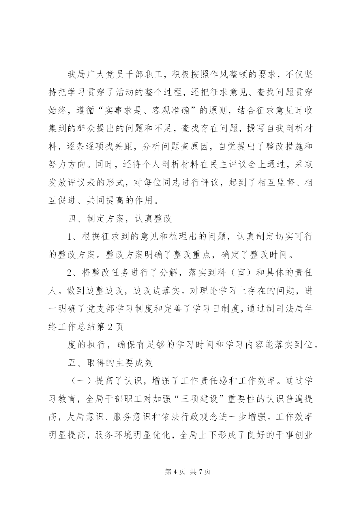第PAGE\*Arabic\*MERGEFORMAT7页共NUMPAGES\*MERGEFORMAT7页司法局年终工作总结司法局年终工作总结:我局认真贯彻落实中共县委、县人民政府《关于在全县开展“三项建设”专项教育活动的意见》(泸发〔〕23号)和《县交通局“三项建设”专项教育活动实施方案》的文件精神。按文件要求,我局开展的“三项建设”活动进展顺利,并取得了显著的成效,现根据县纪律检查委员会、县委组织部、县监察局、县人事局《关于对全县机关纪律作风建设情况进行专项检查的通知》(泸纪发14号)要求,结合我局工作实际,就我局机关纪律作风建设情况总结如下:一、导高度重视,行动积极2月,在全局开展以“业务建设、作风建设、环境建设”为主要内容的县“三项建设”学习活动。局领导高度重视,积极行动,认真落实“三项建设”活动的各项任务。我局认真贯彻落实科学发展观,以新一轮思想大解放推动我局工作发展,全力加强“三项”建设。一是成立了以王江民局长为组长,副局长杨礼清、主任科员董庆云为副组长,各部门负责人为成员的县“三项建设”活动领导小组,领导小组下设办公室,具体负责日常工作。二是制定实施方案,结合本单位实际,我局制定了具体实施方案,深刻领会开展“三项建设”活动的重大意义;明确目的,端正作风,切实把握“三项建设”活动的指导思想、基本原则和目标要求;精心安排,形成一把手负总责,一级抓一级,层层落实的工作格局。“三项建设”活动分四个阶段进行:1、学习提高阶段;2、分析检查阶段;3、整改落实阶段;4、总结考评阶段。二、及时召开动员大会,认真学习,营造良好学习氛围。1、及时召开动员大会。我局党支部于2月27日召XX县区交通局全局党员干部职工会议。会上局长王江民同志首先传XX县区委、县政府《关于在全县开展“三项建设”专项教育活动的意见》(泸发〔〕23号)和《县交通局“三项建设”专项教育活动实施方案》精神,指出我局今年将解放思想学习讨论活动和“三项建设”活动有机结合起来,全面增强全体党员干部职工的发展意识、开放意识、服务意识;切实转变工作作风、提高业务水平;营造良好环境,实现我县交通率先发展。局长王江民动员全体党员、干部要充分发挥先锋模范带头作用,在活动中要坚持工作学习两不误。并要求全局干部职工结合当前实际,进一步强化对开展作风整顿的重要性和必要性的认识,增强全局抓作风建设和效能建设的责任感和紧迫感。动员全体干部职工进一步昂扬精神状态,提升精气神,在本职岗位上干好事、干成事、不出事,在推进全县交通事业又好又快发展上发挥积极作用。2、认真学习,营造良好学习氛围。运用多种形式广泛发动干部群众积极投身学习讨论活动,利用县交通局宣传栏、横额标语等广泛宣传,提高大家的对活动的认识,营造良好学习氛围。组织干部学习党的大和届三中全会会议精神,省第八次党代会、州第六次党代会XX县区委十届六次全会精神及有关交通法律、法规和各种业务知识。通过学习,不断拓展广大党员干部的工作思路,提高工作能力,增强落实科学发展观的本领和才干。三、征求意见,认真查摆。局机关结合实践科学发展观活动的开展,紧密联系思想和工作实际,认真查找并深刻剖析领导班子成员在思想政治建设、党性党风、效能建设和对所属基层单位监管等方面存在的突出问题,认真查找局机关工作人员是否存在纪律松懈、作风飘浮等方面存在的问题。通过发放征求意见表、座谈会和谈心活动等方式,找出了理论学习系统性、深入性不够、工作作风不够深、创新意识不够强等问题,针对存在问题,局党委召开了专题会议制定了整改措施予以改进。并设立举报电话和意见箱,召开座谈会,广泛征求该所在组织纪律、依法行政、服务办事、廉洁自律等方面存在的问题意见和建议,制定出初步的整改措施,把作风整顿工作落到实处。我局力求通过整顿、整改,努力把交通队伍建设成为一支思想素质好、纪律严明、作风正派、业务过硬,能够让党和政府放心,群众满意,更好地适应交通事业发展需要的高素质队伍。我局广大党员干部职工,积极按照作风整顿的要求,不仅坚持把学习贯穿了活动的整个过程,还把征求意见、查找问题贯穿始终,遵循“实事求是、客观准确”的原则,结合征求意见时收集到的群众提出的问题和不足,查找存在问题,撰写自我剖析材料,逐条逐项找差距,分析问题查原因,自觉提出了整改措施和努力方向。同时,还将个人剖析材料在民主评议会上通过,采取发放评议表的形式,对每位同志进行评议,起到了相互监督、相互促进、共同提高的作用。四、制定方案,认真整改1、根据征求到的意见和梳理出的问题,认真制定切实可行的整改方案。整改方案明确了整改重点,确定了整改时间。2、将整改任务进行了分解,落实到科(室)和具体的责任人。做到边整边改,边改边落实。对理论学习上存在的问题,进一明确了党支部学习制度和完善了学习日制度,通过制司法局年终工作总