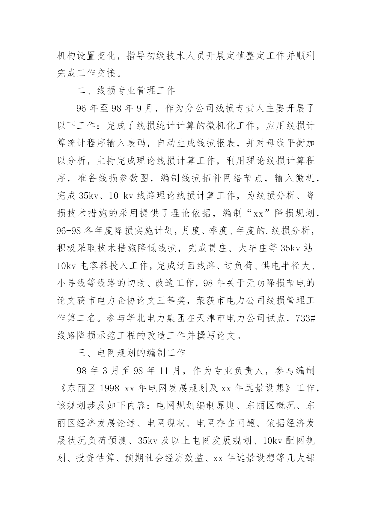 电力专业技术年度个人工作总结电力专业技术年度个人工作总结总结就是把一个时段的学习、工作或其完成情况进行一次全面系统的总结,它可以给我们下一阶段的学习和工作生活做指导,不妨让我们认真地完成总结吧。我们该怎么去写总结呢?下面是小编整理的电力专业技术年度个人工作总结,欢迎大家分享。电力专业技术年度个人工作总结1一、电网规划的编制、修编工作作为生产技术部人员,参与《农村配电网“xx”规划滚动修编》、《配电网“xx”规划报告编制大纲》的编制、修编工作,该规划涉及如下内容:电网规划编制总则、农村配电网现状及存在问题分析、经济发展论述、电网现状、电网存在问题、依据经济发展状况负荷预测、35kv电网发展规划、10kv配网规划、一次系统规划方案、二次系统规划方案、无功补偿规划方案、投资估算等几大部分。为电网的'建设与改造提供了依据,较好地指导了电网的建设与改造工作。二、电网建设与改造工作20xx年至20xx年,对10kv、35kv线路进行基础数据勘测和录入,随着对工作的熟悉先后参加了220kv输变电工程配套切改的110kv、35kv线路数据勘测及35kv宋台站、宋村站的新建工程,和化线、和津线、和召线、郝史线等4条35kv线路新建改造工作、农网10kv线路改造工程,参与设计、施工、验收xx年、xx年农网完善工程,在工作中逐步熟悉设备和工作程序,完成工程项目的立项、亲自对线路进行勘测,参与设计改造方案,参加设计审核工作,参加10kv配变增容工程的勘测、设计、验收工作,参加工程质量验收及资料整理工作,制定工程网络计划图,工程流程图,所有建设改造工程均质量合格,提高了供电能力,满足经济运行的需要,降低线损。电力专业技术年度个人工作总结2本人95年7月毕业于xxx,所学专业为电力系统及自动化。96年8月取得助理工程师资格。几年来在身边师傅同事做了一些专业技术工作,下面是为大家准备的电力专业技术年终个人工作总结。一、继电保护定值整定工作(10kv及以下)96年9月至97年担负分公司10kv配电线路(含电容器)、10kv用户站继电保护定值整定工作,由于分公司原来没有整定人员,但自从开展工作以来建立了继电保护整定档案资料,如系统阻抗表、分线路阻抗图、系统站定值单汇总(分线路)用户站定值单汇总(分线路),并将定值单用微机打印以规范管理,还包括各重新整定定值的计算依据和计算过程,形成较为完善的定值整定计算的管理资料。近两年时间内完成新建贯庄35kv变电站出线定值整定工作和审核工作。未出现误整定现象,且通过对系统短路容量的计算为配电线路开关等设备的选择提供了依据。97年底由于机构设置变化,指导初级技术人员开展定值整定工作并顺利完成工作交接。二、线损专业管理工作96年至98年9月,作为分公司线损专责人主要开展了以下工作:完成了线损统计计算的微机化工作,应用线损计算统计程序输入表码,自动生成线损报表,并对母线平衡加以分析,主持完成理论线损计算工作,利用理论线损计算程序,准备线损参数图,编制线损拓补网络节点,输入微机,完成35kv、10kv线路理论线损计算工作,为线损分析、降损技术措施的采用提供了理论依据,编制“xx”降损规划,96-98各年度降损实施计划,月度、季度、年度的.线损分析,积极采取技术措施降低线损,完成贯庄、大毕庄等35kv站10kv电容器投入工作,完成迂回线路、过负荷、供电半径大、小导线等线路的切改、改造工作,98年关于无功降损节电的论文获市电力企协论文三等奖,荣获市电力公司线损管理工作第二名。参与华北电力集团在天津市电力公司试点,733#线路降损示范工程的改造工作并撰写论文。三、电网规划的编制工作98年3月至98年11月,作为专业负责人,参与编制《东丽区1998-xx年电网发展规划及xx年远景设想》工作,该规划涉及如下内容:电网规划编制原则、东丽区概况、东丽区经济发展论述、电网现状、电网存在问题、依据经济发展状况负荷预测、35kv及以上电网发展规划、10kv配网规划、投资估算、预期社会经济效益、xx年远景设想等几大部分。为电网的建设与改造提供了依据,较好地指导了电网的建设与改造工作。规划利用微机制成演示片加以演示,获得了市电力公司专业部室的好评。