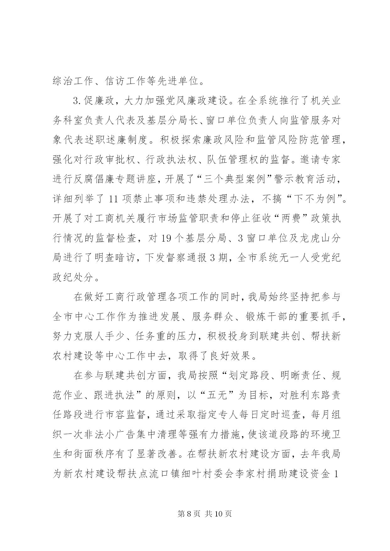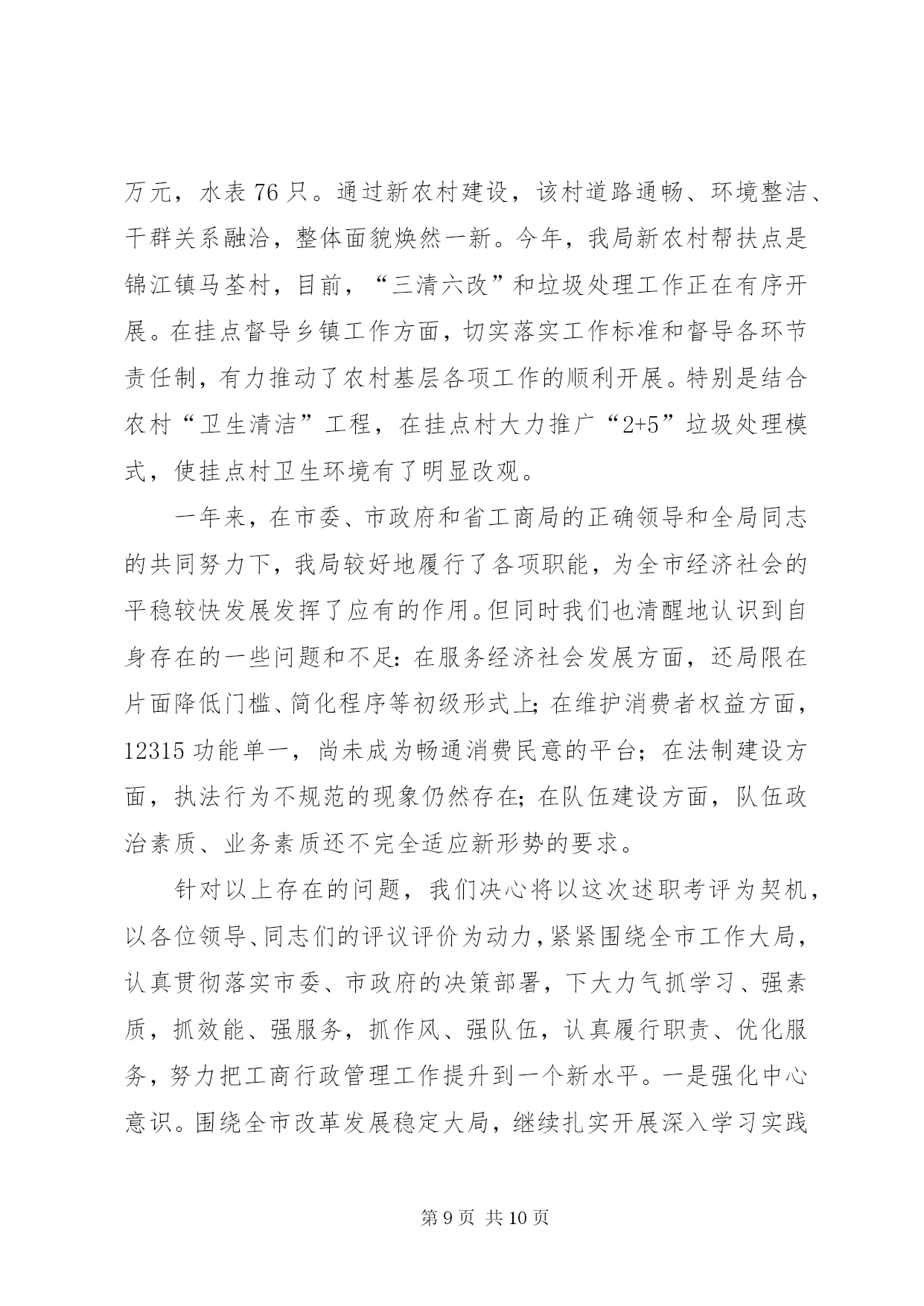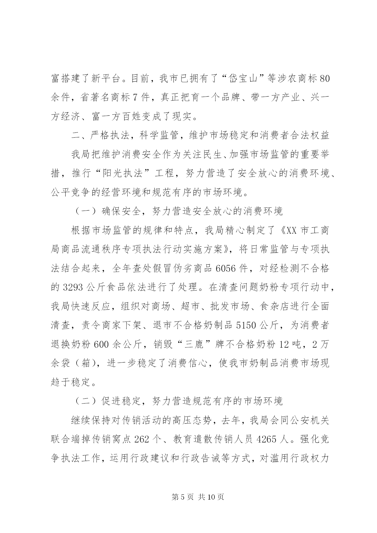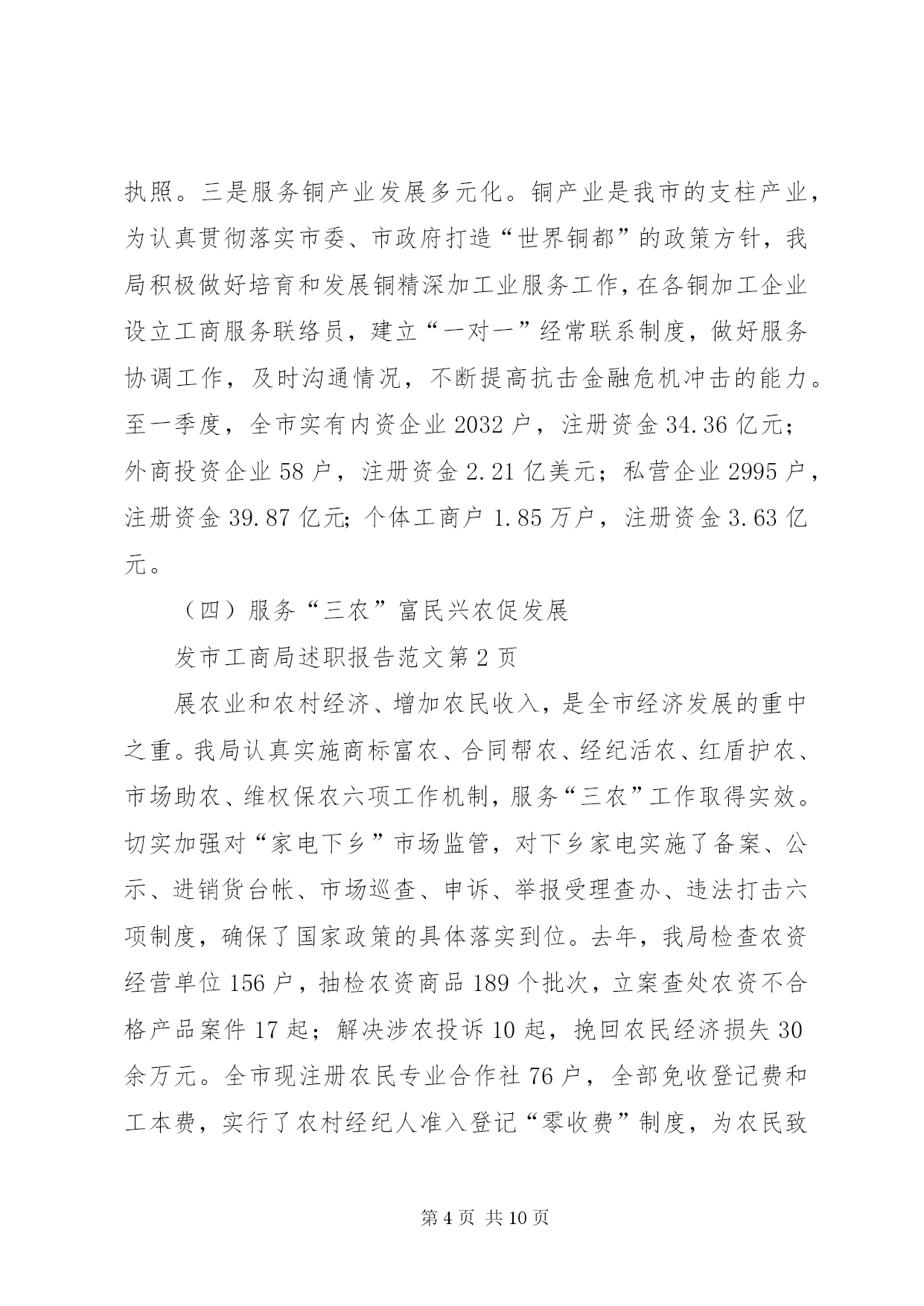 第PAGE\*Arabic\*MERGEFORMAT10页共NUMPAGES\*MERGEFORMAT10页市工商局述职报告范文去年以来,在市委、市政府和省工商局的正确领导下,市工商局班子团结带领全局干部职工,深入贯彻实践科学发展观,努力做到“四个统一”,积极创新体制机制、服务经济发展、加强队伍建设,较好地完成了所承担的各项工作任务。现报告如下:一、着眼大局,强化服务,促进经济平稳发展一年来,市工商局领导班子紧紧围绕打造独具鹰潭特色经济“小巨人”的总体目标,努力做到创新机制“想在先、谋在前”,扶持创业“强措施、求实效”,优化环境“抓重点、促发展”,为服务我市经济社会发展发挥了积极的市场引导、培育促进作用。(一)创新机制增强信心谋发展当前经济危机尚未见底,为帮助企业增强克服困难的信心,我局由局领导及科(室)负责人带队深入全市150余家企业走访座谈,召开负责人座谈会12次,深入了解企业发展面临的困难,分析研究应对措施,帮助企业在危机中抢抓发展机遇。为应对停征“两费”后工作职能的调整,我局创新机制,努力实现由粗放监管的“收费”型工商向注重事前规范、事中指导、事后监管相结合的服务型工商转变,就企业注册、私营经济发展、消费维权等方面出台了促进经济又好又快发展的15条措施。服务“旅游发展年”主题,我局出台了《促进旅游产业大发展十二条服务措施》,为就近服务景区旅游业发展,在龙虎山工商分局开通了服务旅游相关产业发展“五个便民通道”。(二)强化措施排忧解难助发展我局认真落实市委、市政府和省局应对金融危机,促进经济社会平稳较快发展的工作部署,紧紧围绕项目投资、工业园区建设,采取成立服务团,全程跟踪、零距离服务等方式,千方百计助发展。一是围绕保民生,促进创业再就业。为申办个体营业执照提供申请、审批、发照“一站式”服务,在半个工作日内完成办照手续。按省局统一规定,从1月1日开始,我局两年内对所有新开业的个体工商户,一律免收开业登记费及工本费。年初,针对受金融危机影响我市出现的农民工返乡潮,我局出台了《服务新农村建设,促进返乡农民工创业再就业16项措施》,积极开展农民工创业再就业指导培训班8期,培训农民工728人次。一季度,我局帮助1800多农民工成功创业或在“家门口”再就业。二是围绕保市场,推动商标带动战略。去年,我局指导“三川”商标被国家工商总局认定为“中国驰名商标”;培育“塔桥”等12件商标继展并认定为XX省著名商标;依照《XX市知名商标认定和保护规定》,组织认定了“塘湾”、“小英”等10件“XX市知名商标”,为产品提升市场占有量,争创品牌企业奠定了基础。目前,我市注册商标达520余件,其中中国驰名商标2件,省著名商标22件,驰名、著名商标占有比例在全省领先。三是围绕保生存,搬除发展“绊脚石”。,我局共查处各类经济违法违章案件519起,先后协助三川(集团)水表公司、鸽鸽食品公司等企业开展跨省、市(区)维权打假行动13次,有力的维护了企业的合法权益。去年底,针对部分中小企业融资困难的现状,我局发挥职能作用,为企业办理动产抵押登记12件,帮助融资2640万元。年初,江西世茂铜业公司因工商营业执照未年检,客户拒绝签约。我局了解此情况后,立即备齐资料上门为企业服务,指导该公司于当日顺利通过年检,成功签署了合同。(三)转变作风优化环境为发展我局牢固树立发展第一、服务为本的理念,在全市率先实行行政许可“一审一核制”、“首办负责制”,公开办事项目、流程、时限及收费标准,在窗口单位实行无节假日上班制度,24小时电话接受企业咨询,方便企业办事。一是推行提前介入服务。我局遵循“提前介入、参与论证、政策引导、完善方案”的原则,对拟落户我市企业,了解企业投资意向,提供法律咨询,对提交材料所需文件进行指导,经营范围需要办理前置审批的项目,提前告知企业到相关部门办理前置审批,使企业到窗口登记第一时间就能领取营业执照。二是实行提速限时服务。凡申请登记注册的企业,在手续齐全的情况下,注册程序简化为受理、核准两个步骤,开业、变更登记由法定30天提速为5个工作日内完成,名称核准当场办理完毕。在受理沃尔玛集团(鹰潭)有限公司登记注册中,我局窗口人员加班加点审核材料,当天就办好了营业执照。三是服务铜产业发展多元化。铜产业是我市的支柱产业,为认真贯彻落实市委、市政府打造“世界铜都”的政策方针,我局积极做好培育和发展铜精深加工业服务工作,在各铜加工企业设立工商服务联络员,建立“一对一”经常联系制度,做好服务协调工作,及时沟通情况,不断提高抗击金融危机冲击的能力。至一季度,全市实有内资企业2032户,注册资金34.36亿元;外商投资企业58户,注册资金2.21亿美元;私营企业2995户,注册资金39.87亿元;个体工商户1.85万户,注册资金3.63亿元。(四)服务