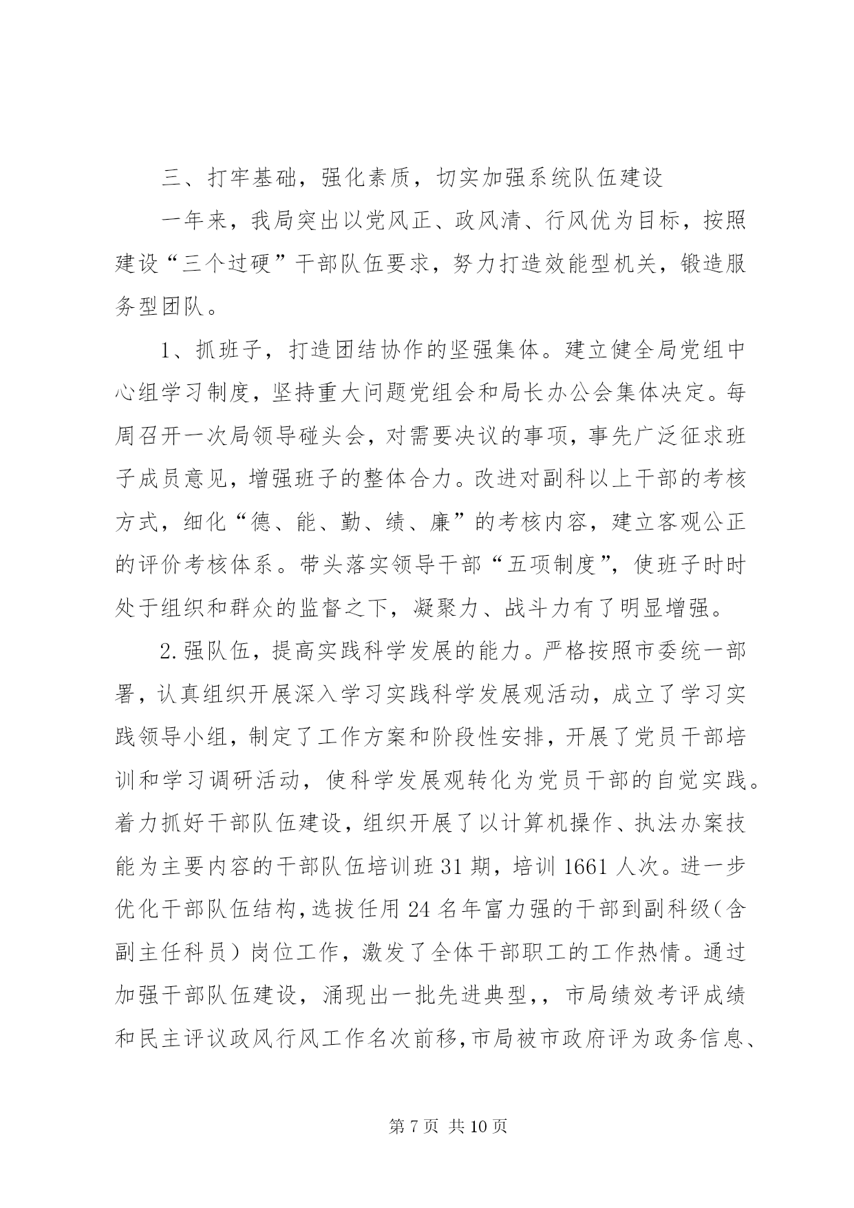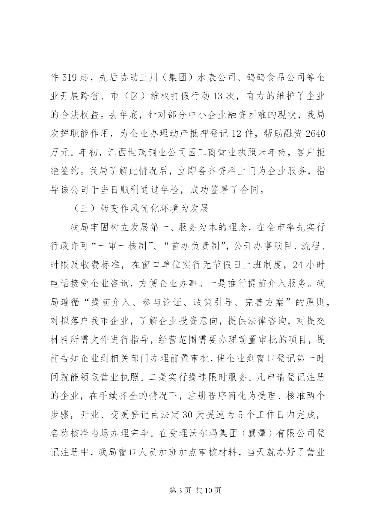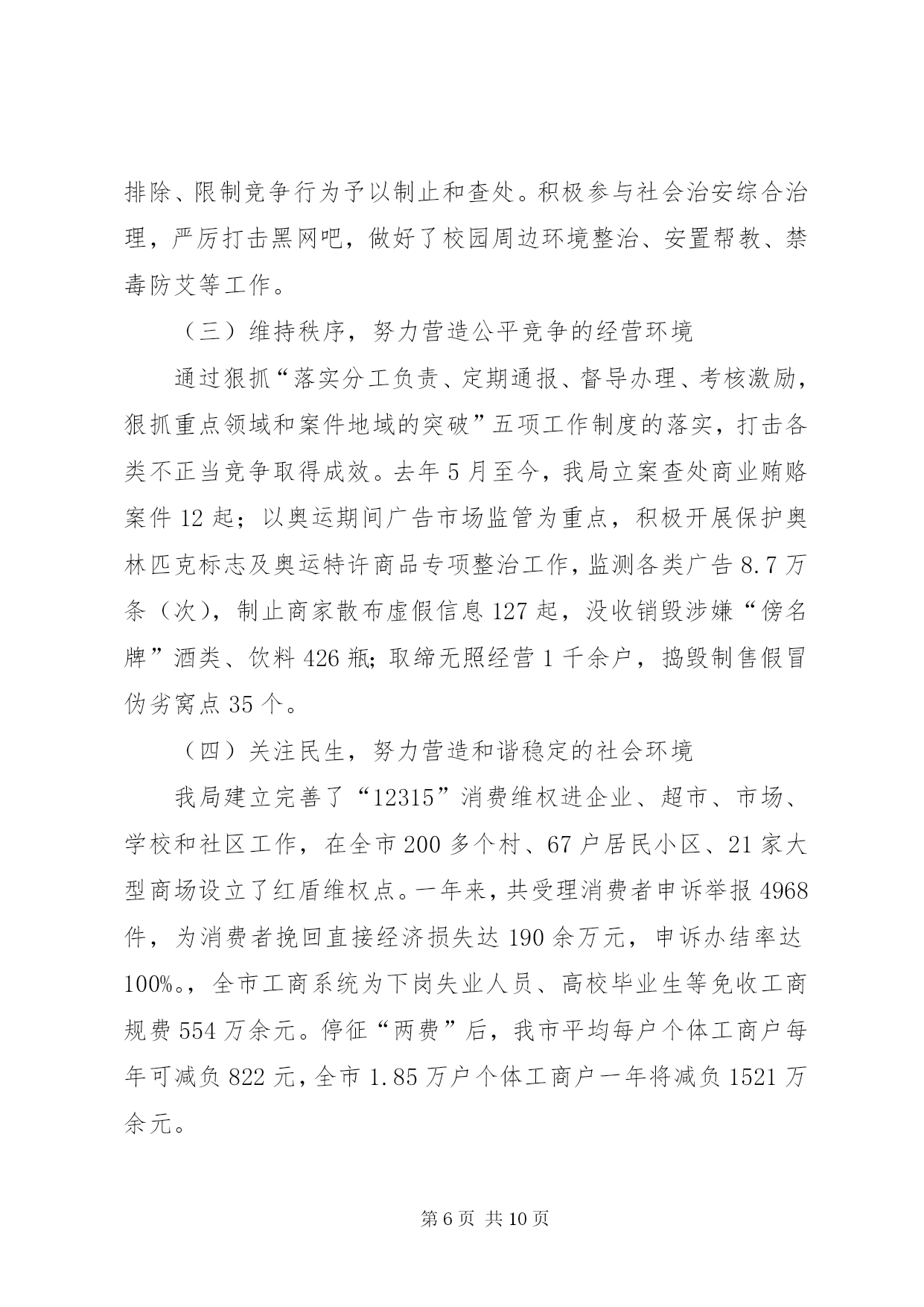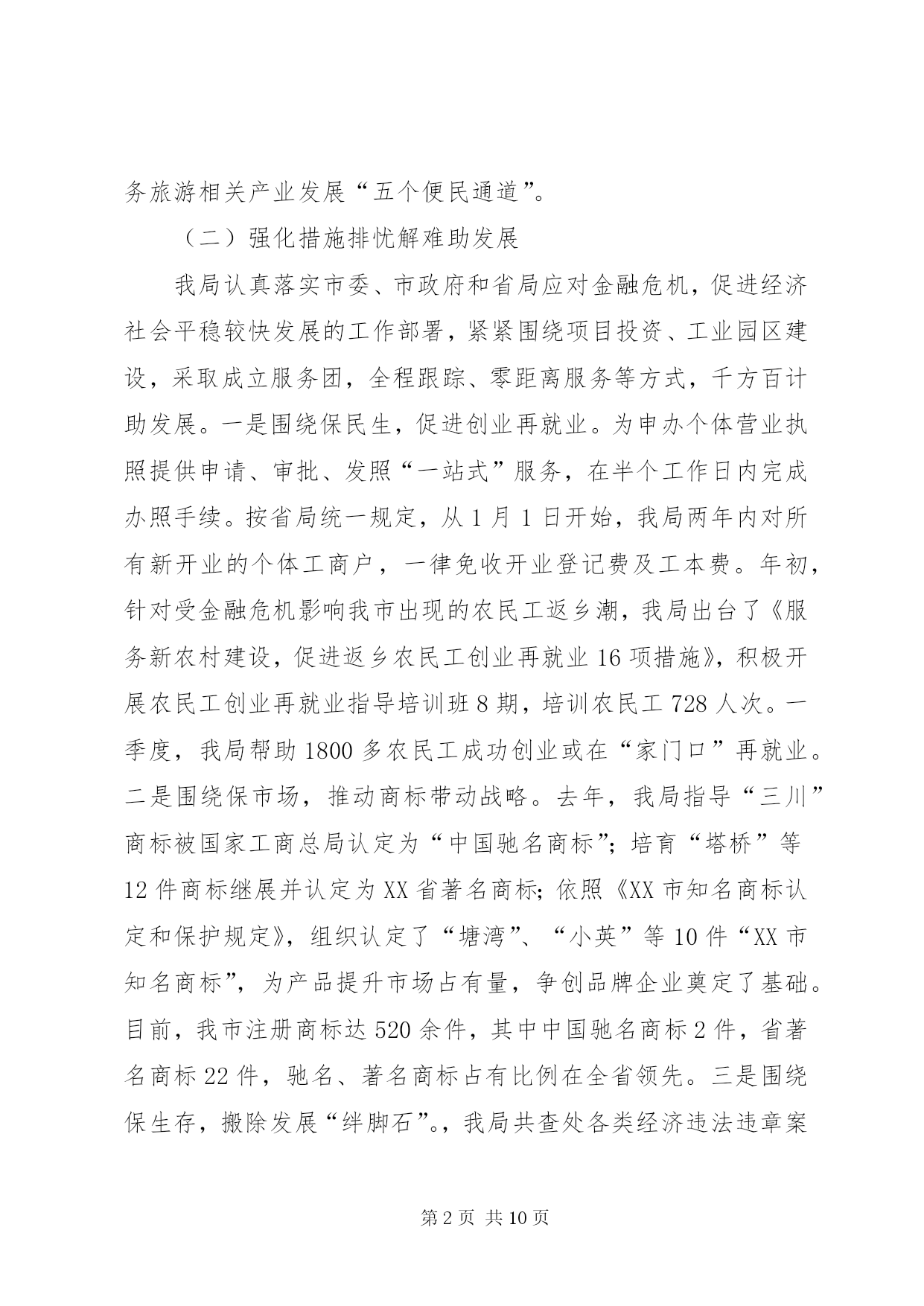 第PAGE\*Arabic\*MERGEFORMAT10页共NUMPAGES\*MERGEFORMAT10页市工商局述职报告范文去年以来,在市委、市政府和省工商局的正确领导下,市工商局班子团结带领全局干部职工,深入贯彻实践科学发展观,努力做到“四个统一”,积极创新体制机制、服务经济发展、加强队伍建设,较好地完成了所承担的各项工作任务。现报告如下:一、着眼大局,强化服务,促进经济平稳发展一年来,市工商局领导班子紧紧围绕打造独具鹰潭特色经济“小巨人”的总体目标,努力做到创新机制“想在先、谋在前”,扶持创业“强措施、求实效”,优化环境“抓重点、促发展”,为服务我市经济社会发展发挥了积极的市场引导、培育促进作用。(一)创新机制增强信心谋发展当前经济危机尚未见底,为帮助企业增强克服困难的信心,我局由局领导及科(室)负责人带队深入全市150余家企业走访座谈,召开负责人座谈会12次,深入了解企业发展面临的困难,分析研究应对措施,帮助企业在危机中抢抓发展机遇。为应对停征“两费”后工作职能的调整,我局创新机制,努力实现由粗放监管的“收费”型工商向注重事前规范、事中指导、事后监管相结合的服务型工商转变,就企业注册、私营经济发展、消费维权等方面出台了促进经济又好又快发展的15条措施。服务“旅游发展年”主题,我局出台了《促进旅游产业大发展十二条服务措施》,为就近服务景区旅游业发展,在龙虎山工商分局开通了服务旅游相关产业发展“五个便民通道”。(二)强化措施排忧解难助发展我局认真落实市委、市政府和省局应对金融危机,促进经济社会平稳较快发展的工作部署,紧紧围绕项目投资、工业园区建设,采取成立服务团,全程跟踪、零距离服务等方式,千方百计助发展。一是围绕保民生,促进创业再就业。为申办个体营业执照提供申请、审批、发照“一站式”服务,在半个工作日内完成办照手续。按省局统一规定,从1月1日开始,我局两年内对所有新开业的个体工商户,一律免收开业登记费及工本费。年初,针对受金融危机影响我市出现的农民工返乡潮,我局出台了《服务新农村建设,促进返乡农民工创业再就业16项措施》,积极开展农民工创业再就业指导培训班8期,培训农民工728人次。一季度,我局帮助1800多农民工成功创业或在“家门口”再就业。二是围绕保市场,推动商标带动战略。去年,我局指导“三川”商标被国家工商总局认定为“中国驰名商标”;培育“塔桥”等12件商标继展并认定为XX省著名商标;依照《XX市知名商标认定和保护规定》,组织认定了“塘湾”、“小英”等10件“XX市知名商标”,为产品提升市场占有量,争创品牌企业奠定了基础。目前,我市注册商标达520余件,其中中国驰名商标2件,省著名商标22件,驰名、著名商标占有比例在全省领先。三是围绕保生存,搬除发展“绊脚石”。,我局共查处各类经济违法违章案件519起,先后协助三川(集团)水表公司、鸽鸽食品公司等企业开展跨省、市(区)维权打假行动13次,有力的维护了企业的合法权益。去年底,针对部分中小企业融资困难的现状,我局发挥职能作用,为企业办理动产抵押登记12件,帮助融资2640万元。年初,江西世茂铜业公司因工商营业执照未年检,客户拒绝签约。我局了解此情况后,立即备齐资料上门为企业服务,指导该公司于当日顺利通过年检,成功签署了合同。(三)转变作风优化环境为发展我局牢固树立发展第一、服务为本的理念,在全市率先实行行政许可“一审一核制”、“首办负责制”,公开办事项目、流程、时限及收费标准,在窗口单位实行无节假日上班制度,24小时电话接受企业咨询,方便企业办事。一是推行提前介入服务。我局遵循“提前介入、参与论证、政策引导、完善方案”的原则,对拟落户我市企业,了解企业投资意向,提供法律咨询,对提交材料所需文件进行指导,经营范围需要办理前置审批的项目,提前告知企业到相关部门办理前置审批,使企业到窗口登记第一时间就能领取营业执照。二是实行提速限时服务。凡申请登记注册的企业,在手续齐全的情况下,注册程序简化为受理、核准两个步骤,开业、变更登记由法定30天提速为5个工作日内完成,名称核准当场办理完毕。在受理沃尔玛集团(鹰潭)有限公司登记注册中,我局窗口人员加班加点审核材料,当天就办好了营业执照。三是服务铜产业发展多元化。铜产业是我市的支柱产业,为认真贯彻落实市委、市政府打造“世界铜都”的政策方针,我局积极做好培育和发展铜精深加工业服务工作,在各铜加工企业设立工商服务联络员,建立“一对一”经常联系制度,做好服务协调工作,及时沟通情况,不断提高抗击金融危机冲击的能力。至一季度,全市实有内资企业2032户,注册资金34.36亿元;外商投资企业58户,注册资金2.21亿美元;私营企业2995户,注册资金39.87亿元;个体工商户1.85万户,注册资金3.63亿元。(四)服务