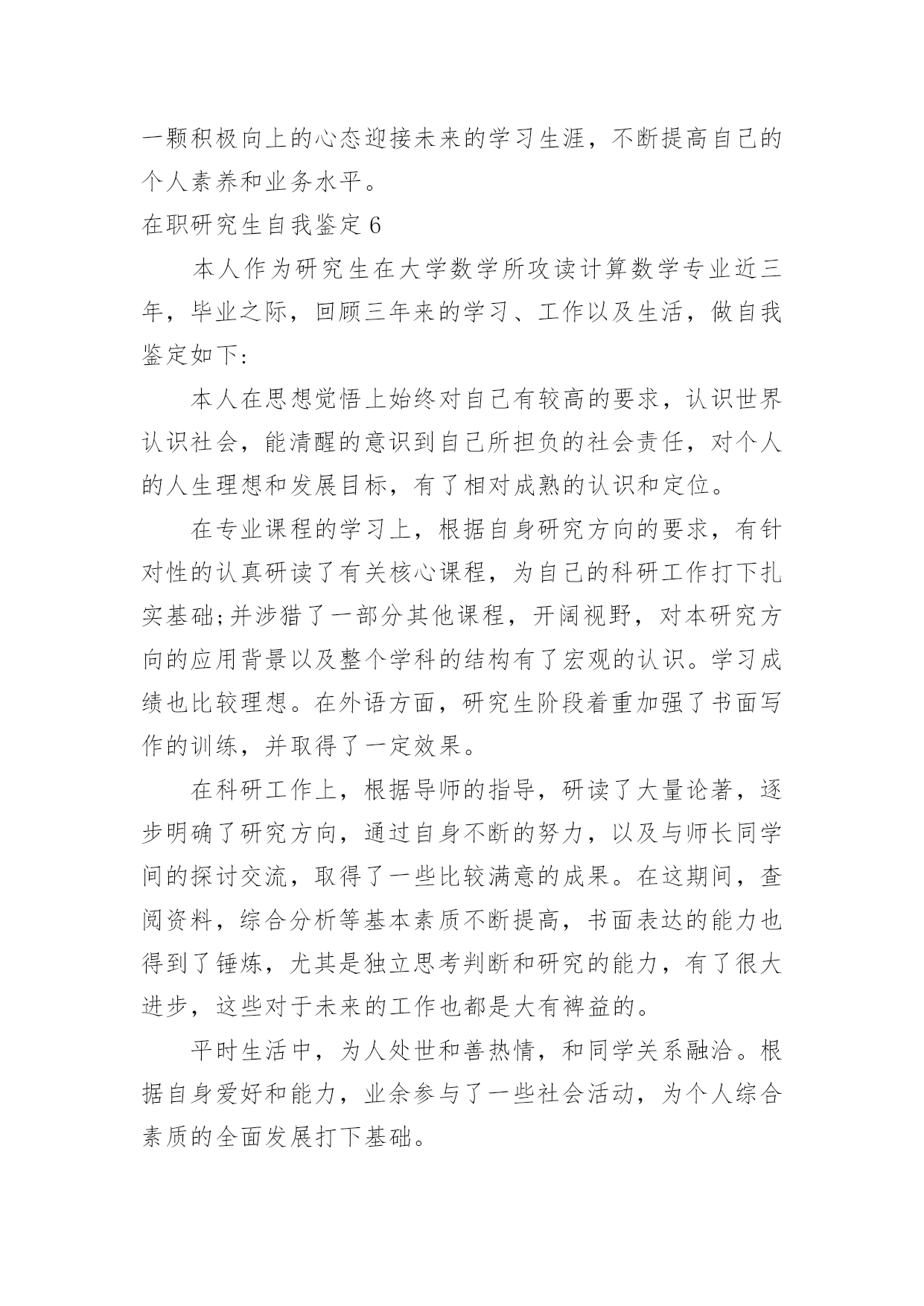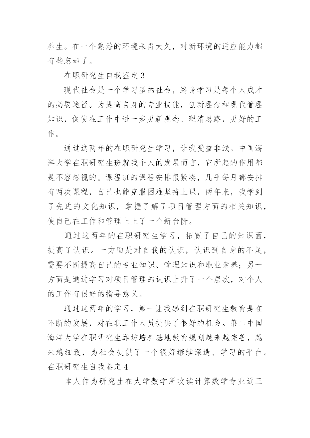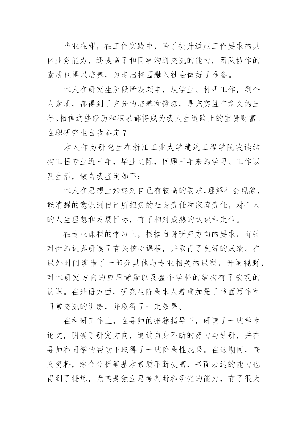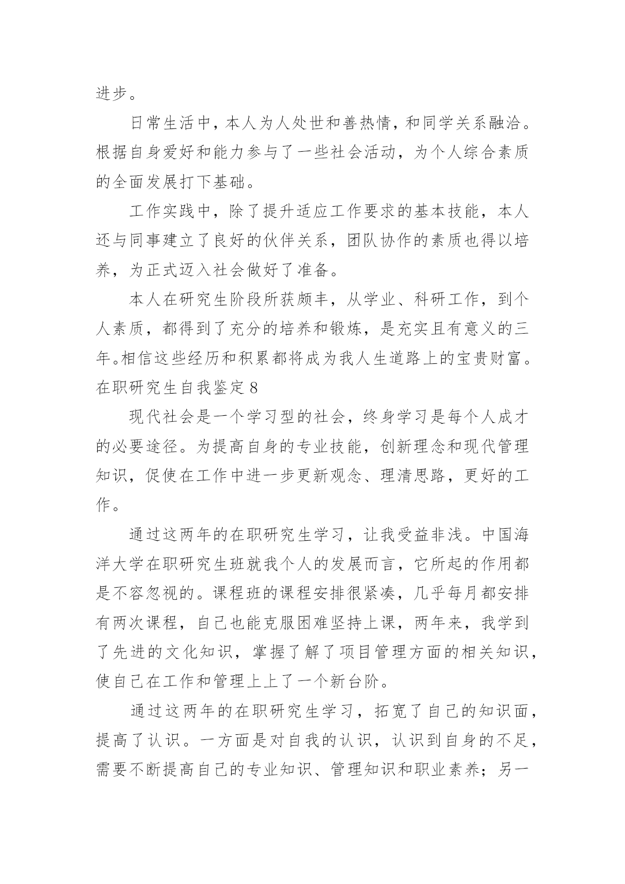 在职研究生自我鉴定在职研究生自我鉴定自我鉴定是个人在一个时期的自我总结,写自我鉴定可以帮助我们正确地认识自我,快快来写一份自我鉴定吧。你所见过的自我鉴定应该是什么样的?以下是小编为大家收集的在职研究生自我鉴定,供大家参考借鉴,希望可以帮助到有需要的朋友。在职研究生自我鉴定1作为一名硕士研究生,在即将离开母校之际,回顾一下我这两年半在校的点点滴滴。都说学习是一名学生的基本工作。研究生阶段的课堂学习只有一年,课程的安排较本科也少了许多。学得少但不见得轻松。在这段学习生活中,我学会了有所取舍,快速学习。相对投入的精力和时间,我比较满意取得的学习成绩。当然学习还包括课外的部分。我喜欢去包图逛逛,在书架旁站定,随手拿起一本来读一读。这两年多我看了一些好书,也算是一种收获。如果要问我研究生和本科最大的不同,我一定会说在研究两字上。我的研究生涯可以分为3个阶段,第一个阶段是参与具体应用项目,主要是和领导讨论接口,然后就默默地编码实现,测试。这个阶段就里,我主要就是踏实做好自己的模块。第二阶段是参与科研项目,和师姐一起从白手起家,搜集论文,整理思路,模拟仿真,加以改进,总结成果,这个阶段需要更多的积极性,更多的思考,更多的实践。第三阶段是指导科研项目,把自己科研的方法和经验与后来者分享,在他们遇阻时,给予提示和鼓励,这个角色中最重要的是团结最大的力量,给予别人热情和希望。应该说,我很幸运,进入了一个科研氛围很浓的实验室,留下一段纯正的科研体验。研究生的生活要比本科时候丰富一些。期间我有一份勤工俭学的工作,工作内容是去宿舍区检查卫生。这份工作我做了一年半,既锻炼了身体,赚取了收入(完成了经济独立),也从和上一代人相处中学习怎样去和他们沟通。我也做过一年的助教,自认为做到了对同学,对老师认真负责。我也参与过AIESEC社团,第一次和大家一起跳舞,第一次和外国同龄人进行尴尬而奇妙的交流。每周三,我几乎都去桌球房,和同学们打上两个小时,虽然球技提高缓慢,但我喜欢打球时的专注以及“越打越失,越失越打”的执着。结束意味着新的开始。过去的风景再美丽,终将成为记忆的一角。将这篇文体呆板、内容干涩的文章放于此,只为再翻开时嘲笑自己曾经的幼稚和纯真。在职研究生自我鉴定2又是一个新的学年,将在华中农业大学度过的第七个年头。现实是历史的延续,现将硕士二年级进行总结。总体来说,这一学年,是一个富有挑战性的、转折性的一年。于学业、于个人人生发展来说。这一年,也就是硕士二年级,我们结束了长达15年的教师教授学生自学的学习模式,开始了科研的初步探索。这是一种与单纯汲取知识完全不同的模式,需要很多的主观能动性的创新。这种转变是一个痛苦的过程,唯有经历过这种痛苦,才会渐渐成长起来。我们渐渐地对搞科研入了门,却马上面临着毕业了。说实话,很是不舍。不舍自己破茧重生后积累的经验迅速的贬值,封尘于人生的藏宝箱。幸好,做学问,学业亦或科研,上升到哲学的角度,与做其他事情都是有共性的。在这一年之中,我更大的收获是对自己性格方面、处理事情方面的历练。科研是需要独立完成的。从最初的无所适从,到现在的渐渐地适应自己给自己提出一个思路,然后当机立断的执行,并对自己的创意、自己的执行力负责。这种独立性的培养,这种责任心的培养,对整个人生是大有裨益的。另外,科研极大的磨练了我的心智。除却培养了我的独立性以外,大大提升了我的执行力。渐渐地明白,有些事情是逃不掉的,无论早晚,自己去做并且做好,没有人可以代劳,早执行早得出结果,而且无论再繁杂,都要一步一步按部就班地执行,急躁不得。这一年的磨练让我的行动力和耐力得到极大的提升。这一年,我离开了从20岁到25岁待久了习惯了它的美丽、它的亲切的.校园。来到了天津的这个研究所做联合培养生。在一个熟悉的环境呆得太久,对新环境的适应能力都有些忘却了。在职研究生自我鉴定3现代社会是一个学习型的社会,终身学习是每个人成才的必要途径。为提高自身的专业技能,创新理念和现代管理知识,促使在工作中进一步更新观念、理清思路,更好的工作。通过这两年的在职研究生学习,让我受益非浅。中国海洋大学在职研究生班就我个人的发展而言,它所起的作用都是不容忽视的。课程班的课程安排很紧凑,几乎每月都安排有两次课程,自己也能克服困难坚持上课,两年来,我学到了先进的文化知识,掌握了解了项目管理方面的相关知识,使自己在工作和管理上上了一个新台阶。通过这两年的在职研究生学习,拓宽了自己的知识面,提高了认识。一方面是对自我的认识,认识到自身的不足,需要不断提高自己的专业知识、管理知识和职业素养;另一方面是通过学习对项目管理的认识上升了一个层次,对个人的工作有很好的指导意义。通过这两年的学习,第一让我感到在职研究生教育是在不断的发展,对在职工作人员提供了很好的机会。第二中国海洋大学在职研究生潍坊培养基地教育