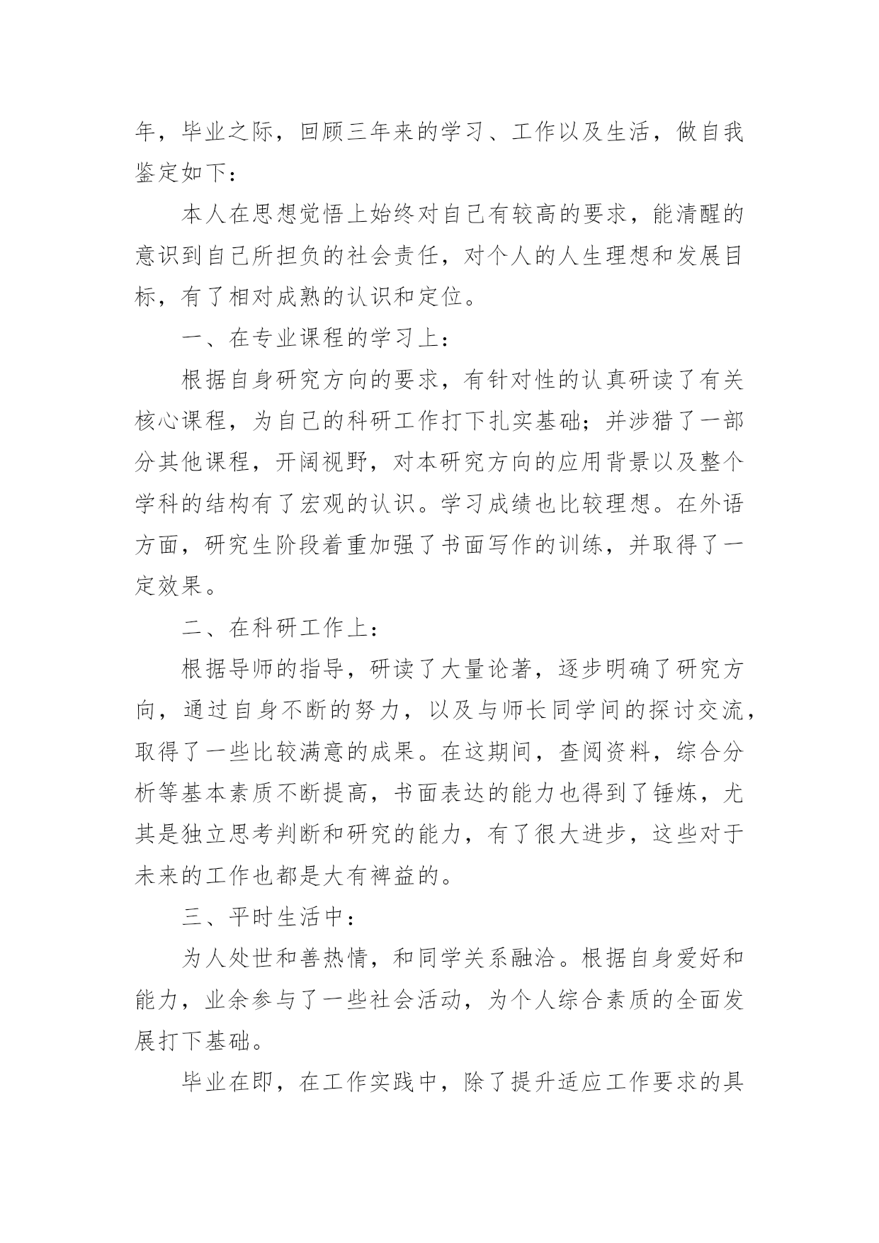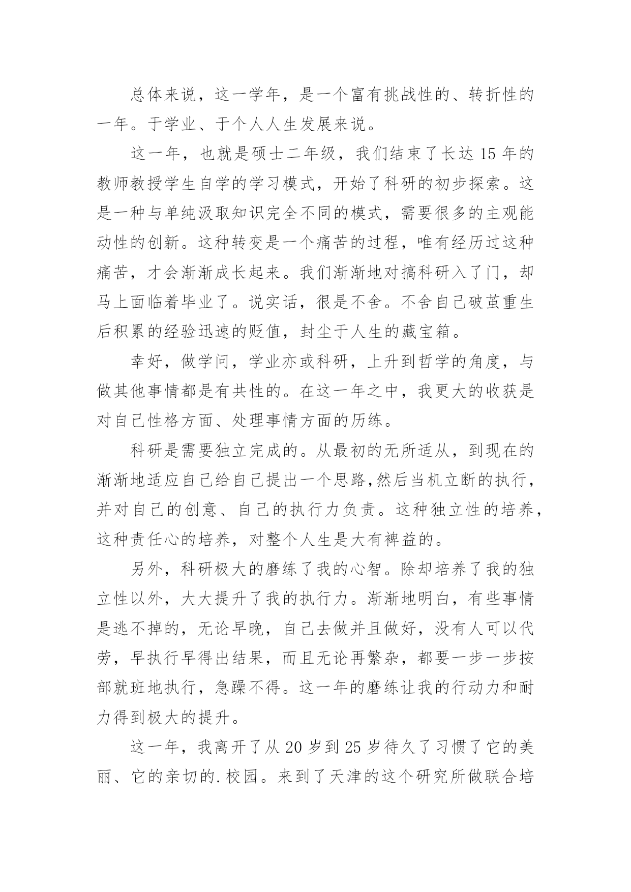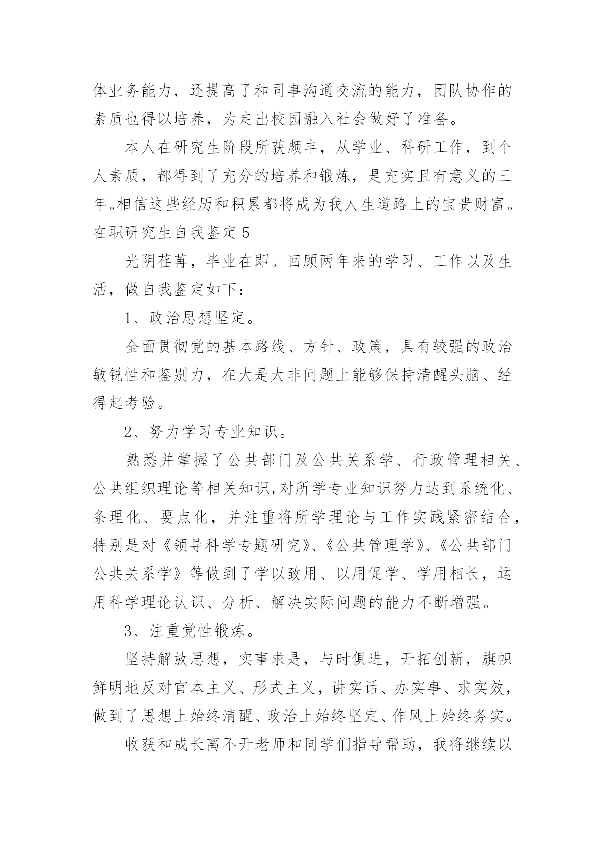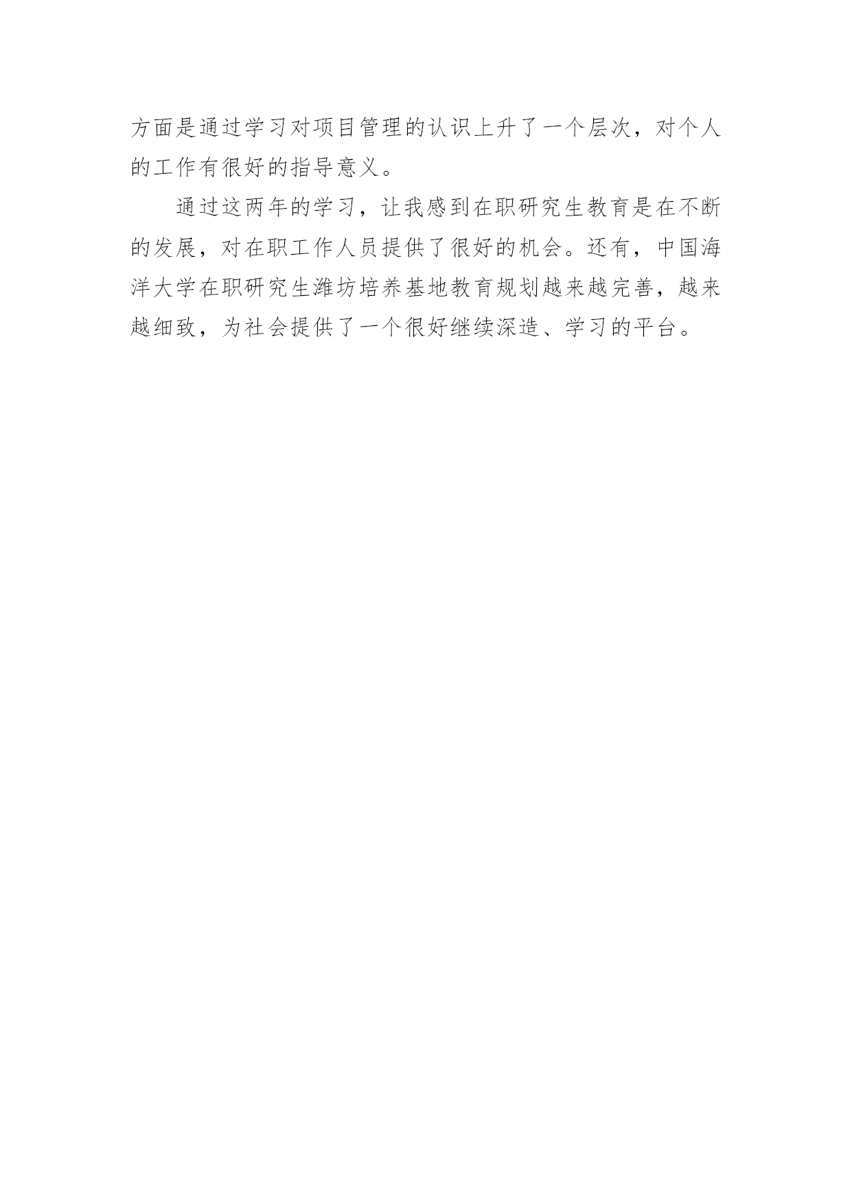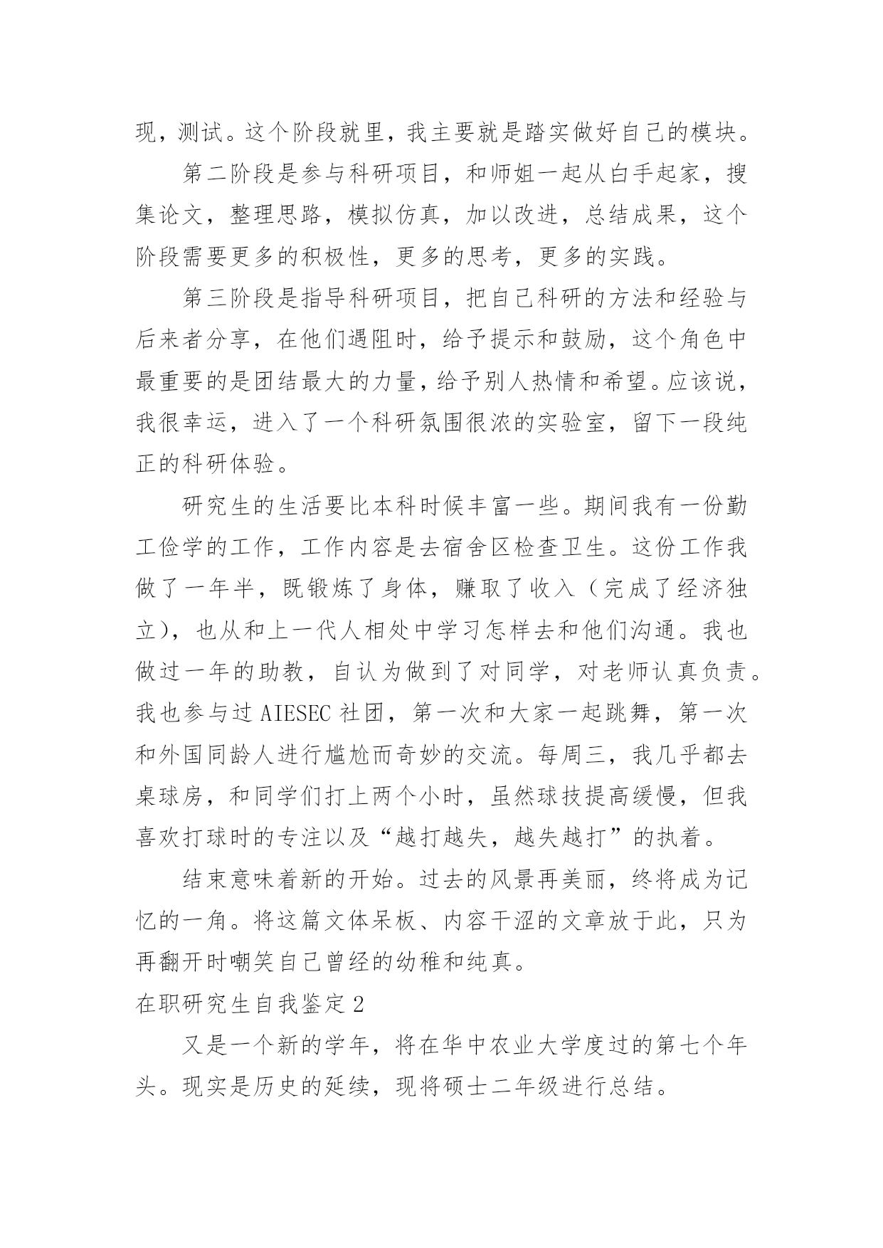 在职研究生自我鉴定在职研究生自我鉴定自我鉴定是个人在一个时期的自我总结,写自我鉴定可以帮助我们正确地认识自我,快快来写一份自我鉴定吧。你所见过的自我鉴定应该是什么样的?以下是小编为大家收集的在职研究生自我鉴定,供大家参考借鉴,希望可以帮助到有需要的朋友。在职研究生自我鉴定1作为一名硕士研究生,在即将离开母校之际,回顾一下我这两年半在校的点点滴滴。都说学习是一名学生的基本工作。研究生阶段的课堂学习只有一年,课程的安排较本科也少了许多。学得少但不见得轻松。在这段学习生活中,我学会了有所取舍,快速学习。相对投入的精力和时间,我比较满意取得的学习成绩。当然学习还包括课外的部分。我喜欢去包图逛逛,在书架旁站定,随手拿起一本来读一读。这两年多我看了一些好书,也算是一种收获。如果要问我研究生和本科最大的不同,我一定会说在研究两字上。我的研究生涯可以分为3个阶段,第一个阶段是参与具体应用项目,主要是和领导讨论接口,然后就默默地编码实现,测试。这个阶段就里,我主要就是踏实做好自己的模块。第二阶段是参与科研项目,和师姐一起从白手起家,搜集论文,整理思路,模拟仿真,加以改进,总结成果,这个阶段需要更多的积极性,更多的思考,更多的实践。第三阶段是指导科研项目,把自己科研的方法和经验与后来者分享,在他们遇阻时,给予提示和鼓励,这个角色中最重要的是团结最大的力量,给予别人热情和希望。应该说,我很幸运,进入了一个科研氛围很浓的实验室,留下一段纯正的科研体验。研究生的生活要比本科时候丰富一些。期间我有一份勤工俭学的工作,工作内容是去宿舍区检查卫生。这份工作我做了一年半,既锻炼了身体,赚取了收入(完成了经济独立),也从和上一代人相处中学习怎样去和他们沟通。我也做过一年的助教,自认为做到了对同学,对老师认真负责。我也参与过AIESEC社团,第一次和大家一起跳舞,第一次和外国同龄人进行尴尬而奇妙的交流。每周三,我几乎都去桌球房,和同学们打上两个小时,虽然球技提高缓慢,但我喜欢打球时的专注以及“越打越失,越失越打”的执着。结束意味着新的开始。过去的风景再美丽,终将成为记忆的一角。将这篇文体呆板、内容干涩的文章放于此,只为再翻开时嘲笑自己曾经的幼稚和纯真。在职研究生自我鉴定2又是一个新的学年,将在华中农业大学度过的第七个年头。现实是历史的延续,现将硕士二年级进行总结。总体来说,这一学年,是一个富有挑战性的、转折性的一年。于学业、于个人人生发展来说。这一年,也就是硕士二年级,我们结束了长达15年的教师教授学生自学的学习模式,开始了科研的初步探索。这是一种与单纯汲取知识完全不同的模式,需要很多的主观能动性的创新。这种转变是一个痛苦的过程,唯有经历过这种痛苦,才会渐渐成长起来。我们渐渐地对搞科研入了门,却马上面临着毕业了。说实话,很是不舍。不舍自己破茧重生后积累的经验迅速的贬值,封尘于人生的藏宝箱。幸好,做学问,学业亦或科研,上升到哲学的角度,与做其他事情都是有共性的。在这一年之中,我更大的收获是对自己性格方面、处理事情方面的历练。科研是需要独立完成的。从最初的无所适从,到现在的渐渐地适应自己给自己提出一个思路,然后当机立断的执行,并对自己的创意、自己的执行力负责。这种独立性的培养,这种责任心的培养,对整个人生是大有裨益的。另外,科研极大的磨练了我的心智。除却培养了我的独立性以外,大大提升了我的执行力。渐渐地明白,有些事情是逃不掉的,无论早晚,自己去做并且做好,没有人可以代劳,早执行早得出结果,而且无论再繁杂,都要一步一步按部就班地执行,急躁不得。这一年的磨练让我的行动力和耐力得到极大的提升。这一年,我离开了从20岁到25岁待久了习惯了它的美丽、它的亲切的.校园。来到了天津的这个研究所做联合培养生。在一个熟悉的环境呆得太久,对新环境的适应能力都有些忘却了。在职研究生自我鉴定3现代社会是一个学习型的社会,终身学习是每个人成才的必要途径。为提高自身的专业技能,创新理念和现代管理知识,促使在工作中进一步更新观念、理清思路,更好的工作。通过这两年的在职研究生学习,让我受益非浅。中国海洋大学在职研究生班就我个人的发展而言,它所起的作用都是不容忽视的。课程班的课程安排很紧凑,几乎每月都安排有两次课程,自己也能克服困难坚持上课,两年来,我学到了先进的文化知识,掌握了解了项目管理方面的相关知识,使自己在工作和管理上上了一个新台阶。通过这两年的在职研究生学习,拓宽了自己的知识面,提高了认识。一方面是对自我的认识,认识到自身的不足,需要不断提高自己的专业知识、管理知识和职业素养;另一方面是通过学习对项目管理的认识上升了一个层次,对个人的工作有很好的指导意义。通过这两年的学习,第一让我感到在职研究生教育是在不断的发展,对在职工作人员提供了很好的机会。第二中国海洋大学在职研究生潍坊培养基地教育