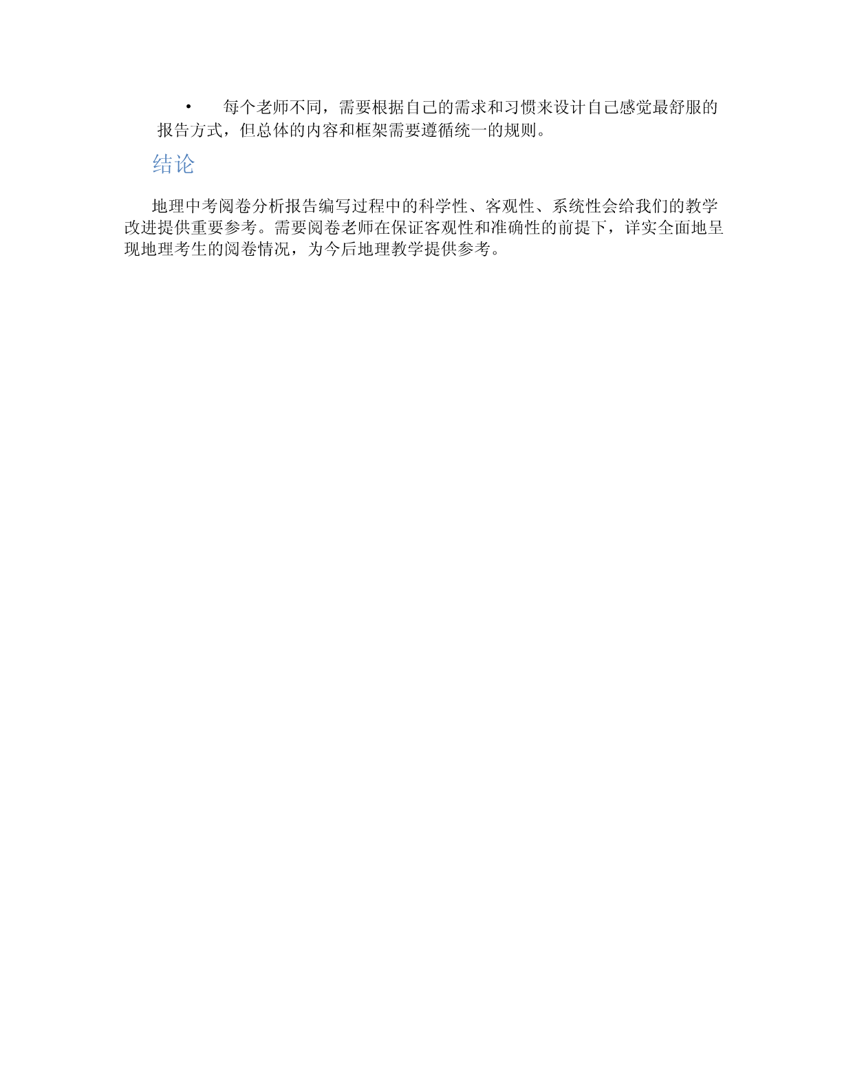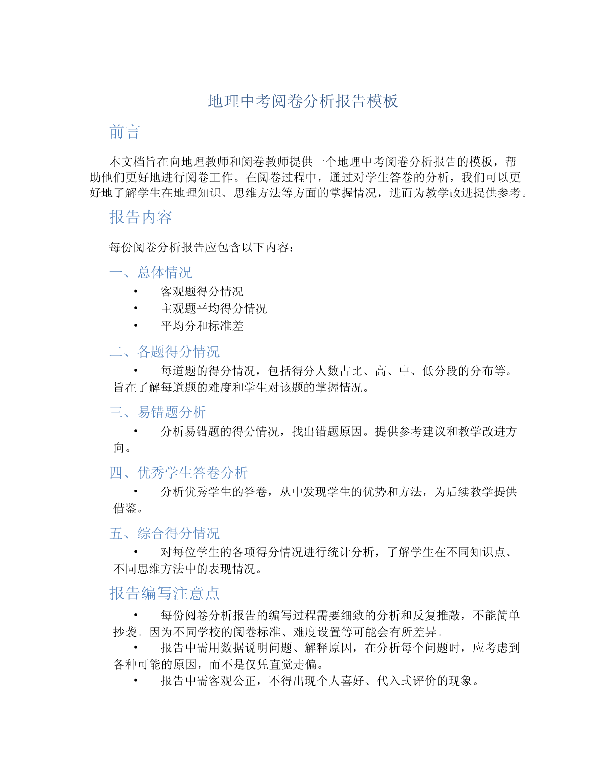 地理中考阅卷分析报告模板前言本文档旨在向地理教师和阅卷教师提供一个地理中考阅卷分析报告的模板,帮助他们更好地进行阅卷工作。在阅卷过程中,通过对学生答卷的分析,我们可以更好地了解学生在地理知识、思维方法等方面的掌握情况,进而为教学改进提供参考。报告内容每份阅卷分析报告应包含以下内容:一、总体情况•客观题得分情况•主观题平均得分情况•平均分和标准差二、各题得分情况•每道题的得分情况,包括得分人数占比、高、中、低分段的分布等。旨在了解每道题的难度和学生对该题的掌握情况。三、易错题分析•分析易错题的得分情况,找出错题原因。提供参考建议和教学改进方向。四、优秀学生答卷分析•分析优秀学生的答卷,从中发现学生的优势和方法,为后续教学提供借鉴。五、综合得分情况•对每位学生的各项得分情况进行统计分析,了解学生在不同知识点、不同思维方法中的表现情况。报告编写注意点•每份阅卷分析报告的编写过程需要细致的分析和反复推敲,不能简单抄袭。因为不同学校的阅卷标准、难度设置等可能会有所差异。•报告中需用数据说明问题、解释原因,在分析每个问题时,应考虑到各种可能的原因,而不是仅凭直觉走偏。•报告中需客观公正,不得出现个人喜好、代入式评价的现象。•每个老师不同,需要根据自己的需求和习惯来设计自己感觉最舒服的报告方式,但总体的内容和框架需要遵循统一的规则。结论地理中考阅卷分析报告编写过程中的科学性、客观性、系统性会给我们的教学改进提供重要参考。需要阅卷老师在保证客观性和准确性的前提下,详实全面地呈现地理考生的阅卷情况,为今后地理教学提供参考。