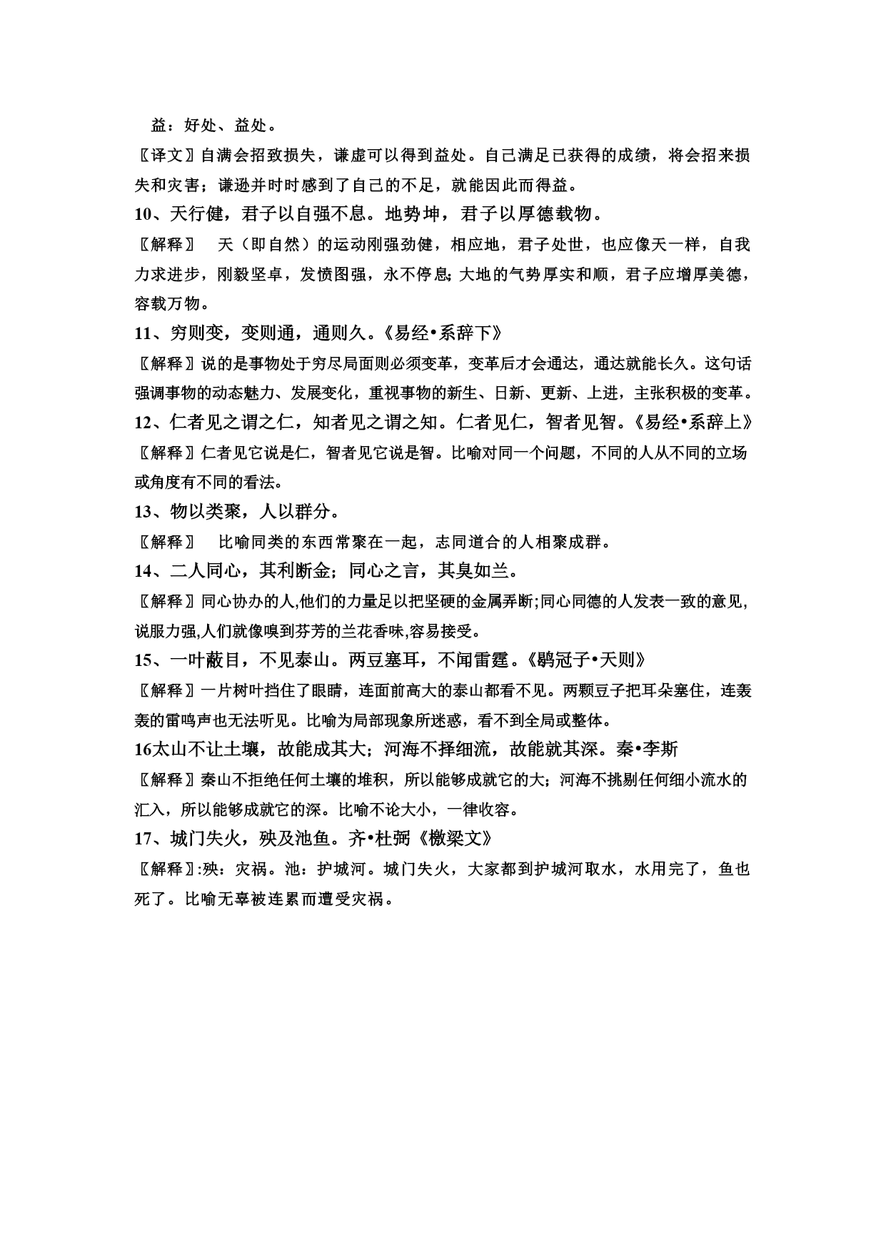课外高考名句默写81、他山之石,可以攻玉。《诗经•小雅•鹤鸣》【注释】他山:别的山。攻:琢磨。【译文】别的山上的石头,可以用来琢磨玉器。原指一国的人才,也可以为另一国所用。后来比喻借他人的批评帮助来改正自己的过错,或者比喻拿别人的情况作为借鉴。2、如切如磋,如琢如磨。《诗经•卫风•湛奥》【解释】像切,像磋,像琢,像磨。切磋琢磨(qiēcuōzhuómó):本来指把骨头、象牙、玉石、石头等加工制成器物。形容文采好,有修养。后引申为学问上的研究、探讨。指共同研究学习,互相取长补短。3、高山仰止,景行行止。gāoshānyǎngzhǐjǐnghángxíngzhǐ【解释】高山,喻高尚的德行。,“仰”是慕仰;景行(háng道路)行(xíng跟随)止。景行,大路,比喻行为正大光明,经常“喻以崇高的品行”之意。高山仰止,景行行止比喻对高尚的品德的仰慕。后以“高山景行”比喻崇高的德行。两句中的“止”字,是语助词,表示确定语气,后代引用时有改用“之”字的。这话是用来赞美孔子的,意思是:虽然不能达到这种程度,可是心里却一直向往着。4、靡不有初,鲜克有终。《诗经•大雅•荡》〖解释〗靡:无;初:开始;鲜:少;克:能。事情都有个开头,但很少能到终了。多用以告诫人们为人做事要善始善终。5、战战兢兢,如临深渊,如履薄冰。〖解释〗战战:恐惧的样子;兢兢:小心谨慎的样子。形容非常害怕而微微发抖的样子。也形容小心谨慎的样子。临:靠近;渊:深水坑。履:践、踩在上面。【译文】内心害怕发抖,如同处于深渊边缘一般,象走在薄冰上一样。比喻存有戒心,行事极为谨慎。6、风雨如晦,鸡鸣不已。〖解释〗晦:黑暗;已:止。风雨交加天色昏暗的早晨,雄鸡啼叫不止。比喻在黑暗的社会里不乏有识之士。7.青青子衿,悠悠我心。《诗经•郑风•子衿》〖解释〗子:诗中女子指她的情人。衿(jīn):衣领。悠悠:忧思貌。[译文]你那青青的衣领,我悠悠牵挂的心。8.言者无罪,闻者足戒。《诗经•大序》〖解释〗指提意见的人只要是善意的,即使提的不正确,也是无罪的。听取意见的人即使没有对方所提的缺点错误,也值得引以为戒。9、满招损,谦受益。《尚书》〖解释〗满:骄傲、自满;招:招来;损:损害;损失谦:谦虚;受:受到;益:好处、益处。〖译文〗自满会招致损失,谦虚可以得到益处。自己满足已获得的成绩,将会招来损失和灾害;谦逊并时时感到了自己的不足,就能因此而得益。10、天行健,君子以自强不息。地势坤,君子以厚德载物。〖解释〗天(即自然)的运动刚强劲健,相应地,君子处世,也应像天一样,自我力求进步,刚毅坚卓,发愤图强,永不停息;大地的气势厚实和顺,君子应增厚美德,容载万物。11、穷则变,变则通,通则久。《易经•系辞下》〖解释〗说的是事物处于穷尽局面则必须变革,变革后才会通达,通达就能长久。这句话强调事物的动态魅力、发展变化,重视事物的新生、日新、更新、上进,主张积极的变革。12、仁者见之谓之仁,知者见之谓之知。仁者见仁,智者见智。《易经•系辞上》〖解释〗仁者见它说是仁,智者见它说是智。比喻对同一个问题,不同的人从不同的立场或角度有不同的看法。13、物以类聚,人以群分。〖解释〗比喻同类的东西常聚在一起,志同道合的人相聚成群。14、二人同心,其利断金;同心之言,其臭如兰。〖解释〗同心协办的人,他们的力量足以把坚硬的金属弄断;同心同德的人发表一致的意见,说服力强,人们就像嗅到芬芳的兰花香味,容易接受。15、一叶蔽目,不见泰山。两豆塞耳,不闻雷霆。《鹖冠子•天则》〖解释〗一片树叶挡住了眼睛,连面前高大的泰山都看不见。两颗豆子把耳朵塞住,连轰轰的雷鸣声也无法听见。比喻为局部现象所迷惑,看不到全局或整体。16太山不让土壤,故能成其大;河海不择细流,故能就其深。秦•李斯〖解释〗秦山不拒绝任何土壤的堆积,所以能够成就它的大;河海不挑剔任何细小流水的汇入,所以能够成就它的深。比喻不论大小,一律收容。17、城门失火,殃及池鱼。齐•杜弼《檄梁文》〖解释〗:殃:灾祸。池:护城河。城门失火,大家都到护城河取水,水用完了,鱼也死了。比喻无辜被连累而遭受灾祸。
