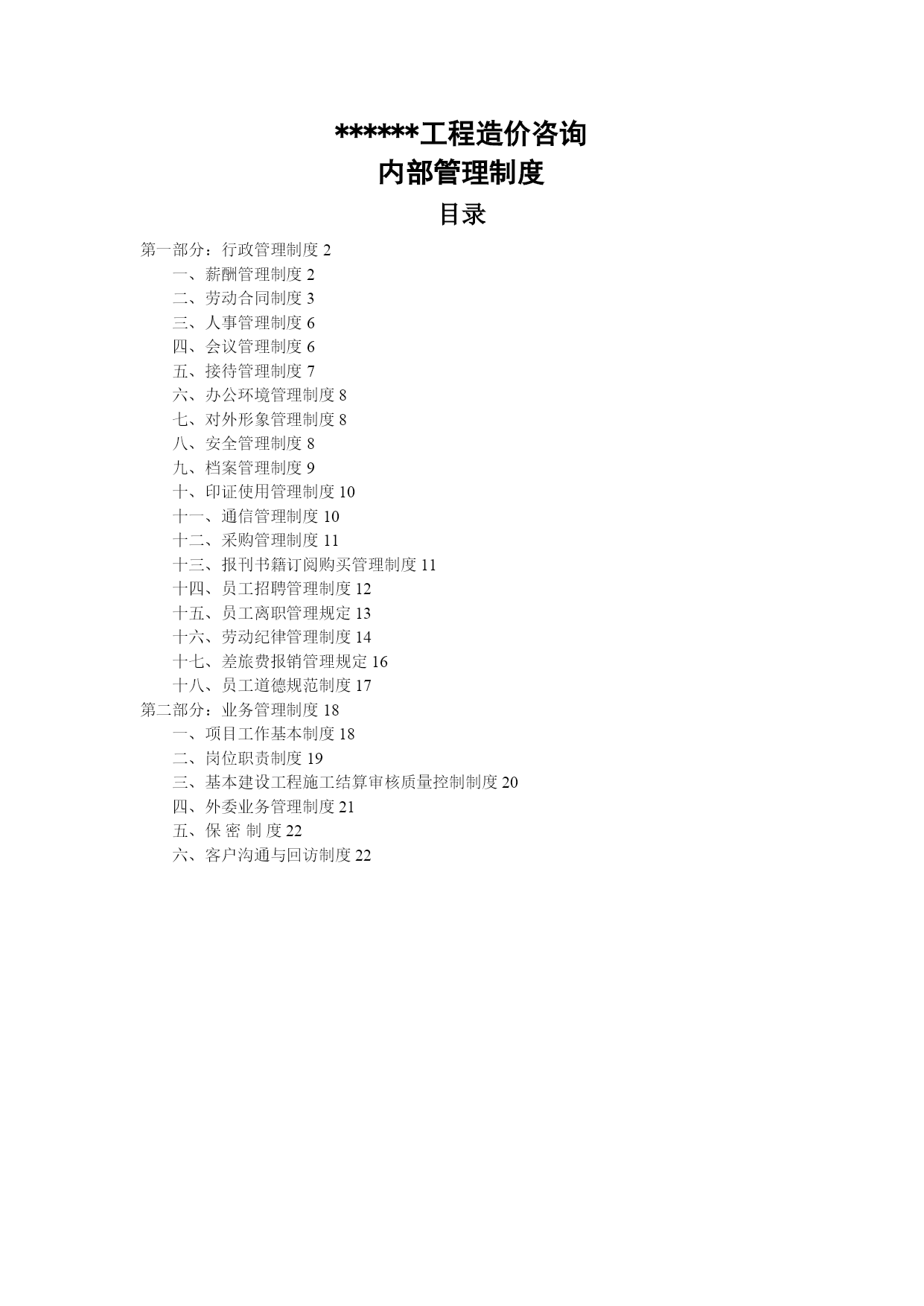 造价咨询企业内部管理制度优质资料(可以直接使用,可编辑优质资料,欢迎下载)******工程造价咨询内部管理制度目录TOC\o"1-3"\h\z\uHYPERLINK\l"_Toc424631461"第一部分:行政管理制度PAGEREF_Toc424631461\h2HYPERLINK\l"_Toc424631462"一、薪酬管理制度PAGEREF_Toc424631462\h2HYPERLINK\l"_Toc424631463"二、劳动合同制度PAGEREF_Toc424631463\h3HYPERLINK\l"_Toc424631464"三、人事管理制度PAGEREF_Toc424631464\h6HYPERLINK\l"_Toc424631465"四、会议管理制度PAGEREF_Toc424631465\h6HYPERLINK\l"_Toc424631466"五、接待管理制度PAGEREF_Toc424631466\h7HYPERLINK\l"_Toc424631467"六、办公环境管理制度PAGEREF_Toc424631467\h8HYPERLINK\l"_Toc424631468"七、对外形象管理制度PAGEREF_Toc424631468\h8HYPERLINK\l"_Toc424631469"八、安全管理制度PAGEREF_Toc424631469\h8HYPERLINK\l"_Toc424631470"九、档案管理制度PAGEREF_Toc424631470\h9HYPERLINK\l"_Toc424631471"十、印证使用管理制度PAGEREF_Toc424631471\h10HYPERLINK\l"_Toc424631472"十一、通信管理制度PAGEREF_Toc424631472\h10HYPERLINK\l"_Toc424631473"十二、采购管理制度PAGEREF_Toc424631473\h11HYPERLINK\l"_Toc424631474"十三、报刊书籍订阅购买管理制度PAGEREF_Toc424631474\h11HYPERLINK\l"_Toc424631475"十四、员工招聘管理制度PAGEREF_Toc424631475\h12HYPERLINK\l"_Toc424631476"十五、员工离职管理规定PAGEREF_Toc424631476\h13HYPERLINK\l"_Toc424631477"十六、劳动纪律管理制度PAGEREF_Toc424631477\h14HYPERLINK\l"_Toc424631478"十七、差旅费报销管理规定PAGEREF_Toc424631478\h16HYPERLINK\l"_Toc424631479"十八、员工道德规范制度PAGEREF_Toc424631479\h17HYPERLINK\l"_Toc424631480"第二部分:业务管理制度PAGEREF_Toc424631480\h18HYPERLINK\l"_Toc424631481"一、项目工作基本制度PAGEREF_Toc424631481\h18HYPERLINK\l"_Toc424631482"二、岗位职责制度PAGEREF_Toc424631482\h19HYPERLINK\l"_Toc424631483"三、基本建设工程施工结算审核质量控制制度PAGEREF_Toc424631483\h20HYPERLINK\l"_Toc424631484"四、外委业务管理制度PAGEREF_Toc424631484\h21HYPERLINK\l"_Toc424631485"五、保密制度PAGEREF_Toc424631485\h22HYPERLINK\l"_Toc424631486"六、客户沟通与回访制度PAGEREF_Toc424631486\h22第一部分:行政管理制度一、薪酬管理制度第一章总则第一条目的为了规范薪酬管理体系,体现员工价值,激发员工工作热情,合理使用公司财务资源,并使公司能长远健康发展,结合本公司实际情况,制定本制度。第二条对象本制度适用于本公司全体员工的薪酬管理。第三条管理部门公司所长办公会是公司薪酬管理的决策机构,总经理是公司薪酬管理的执行机构,负