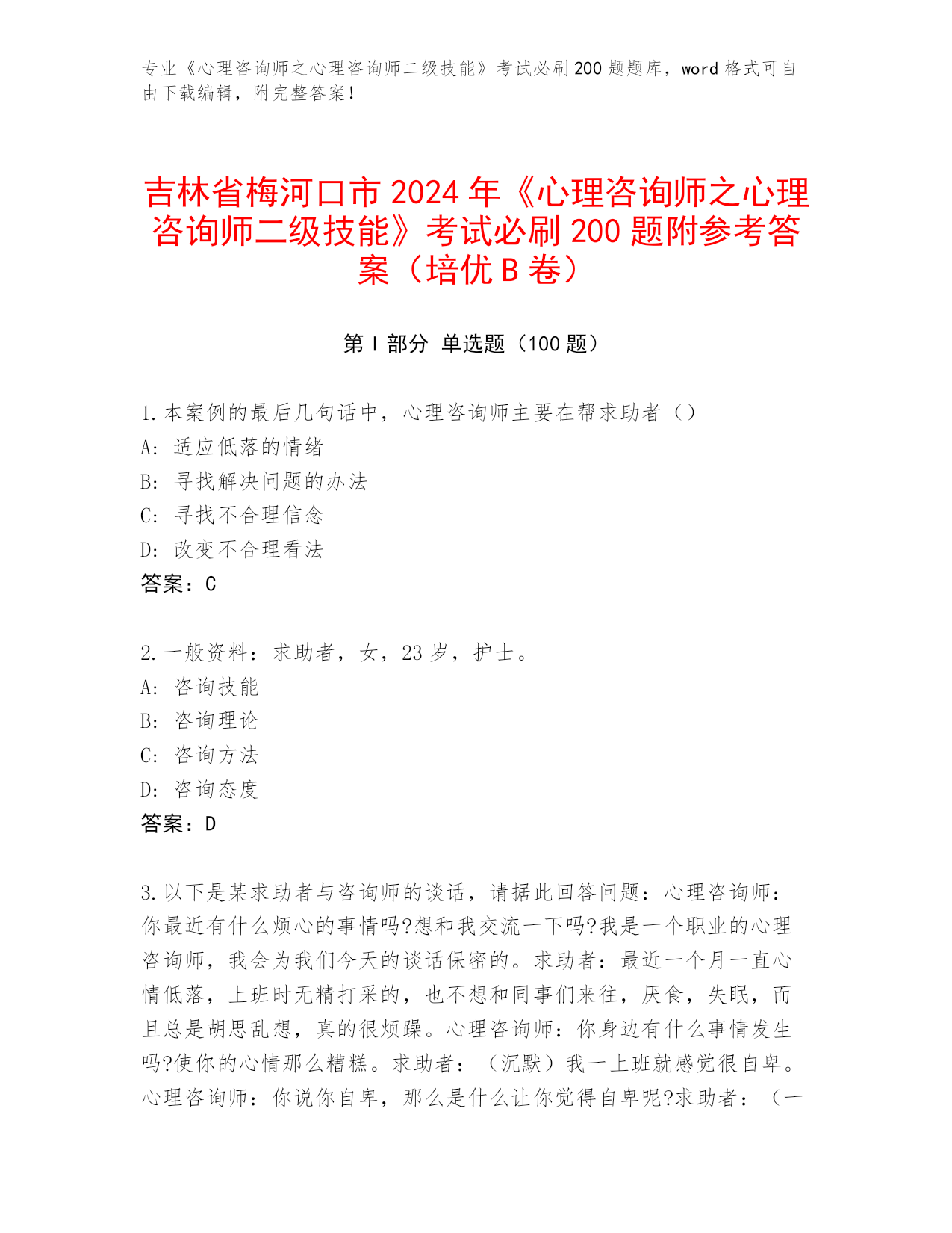 吉林省梅河口市2024年《心理咨询师之心理咨询师二级技能》考试必刷200题附参考答案(培优B卷)