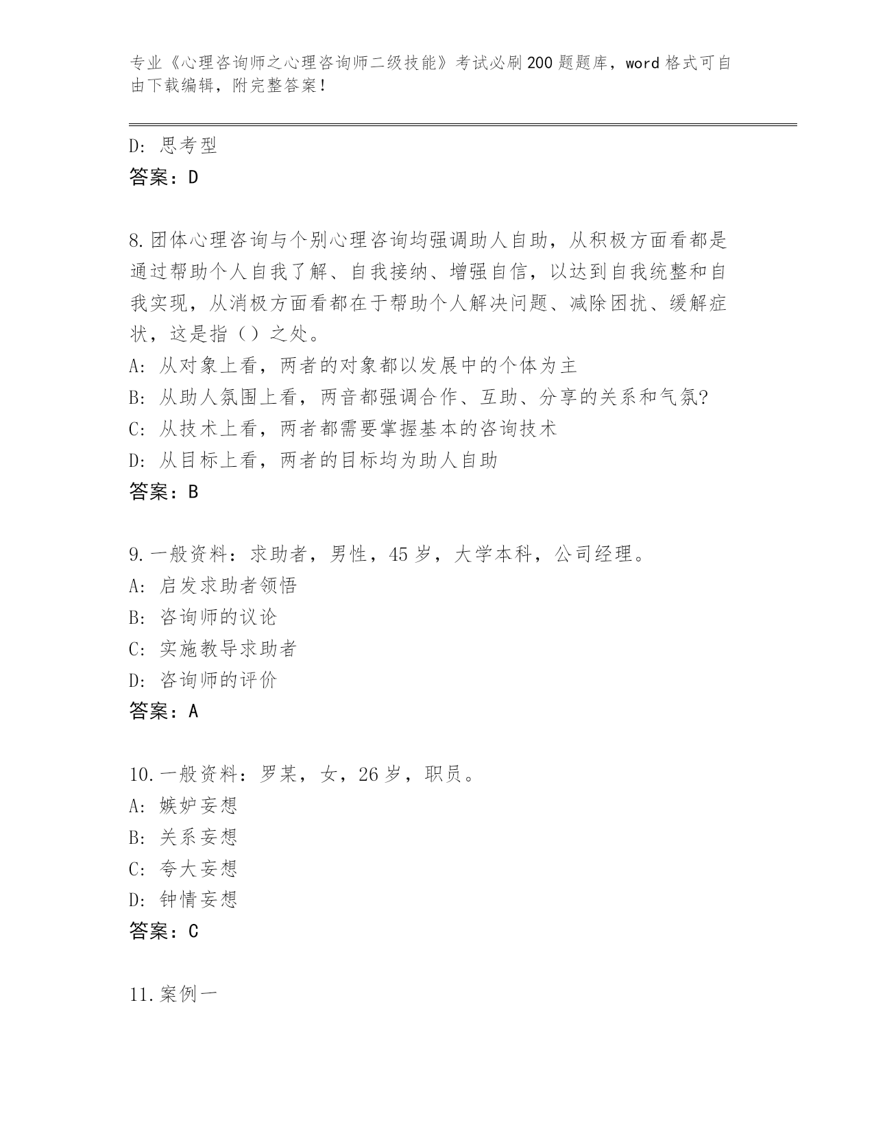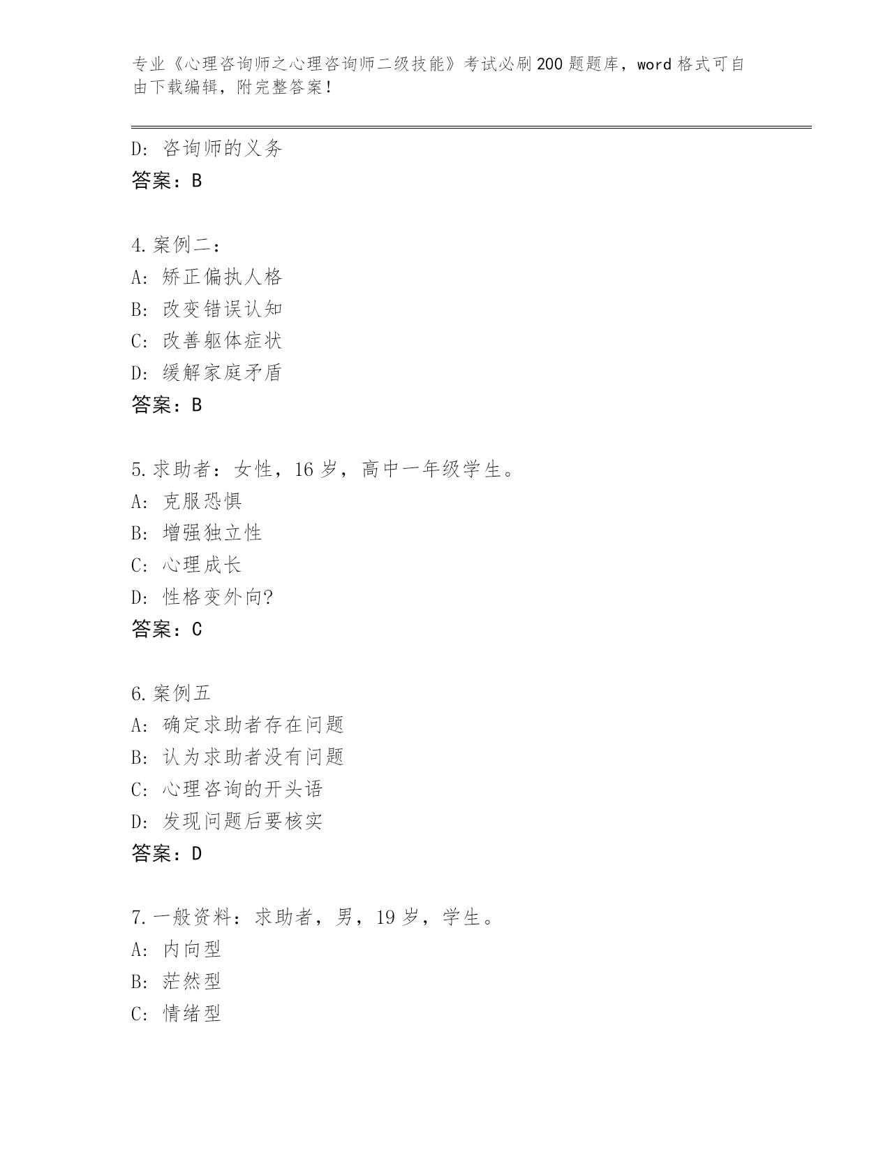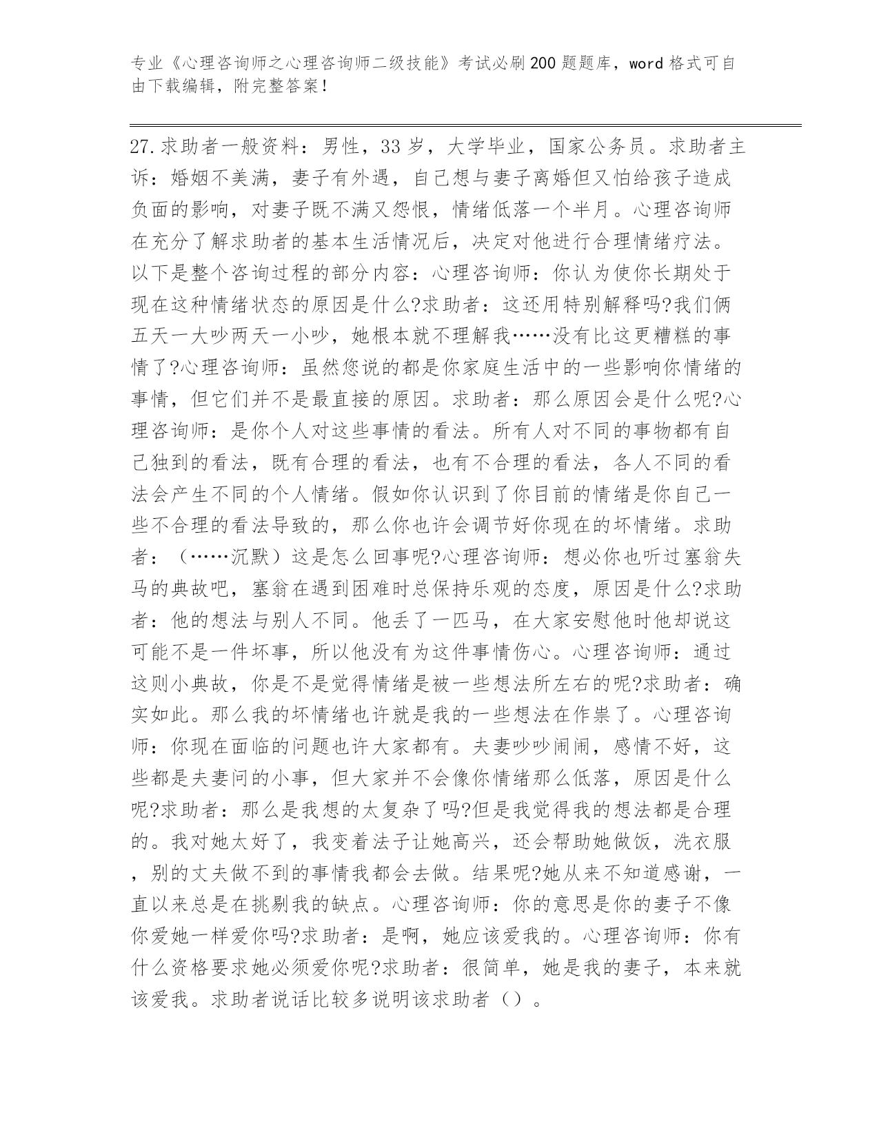 江苏省宜兴市整理《心理咨询师之心理咨询师二级技能》考试必刷200题(培优B卷)