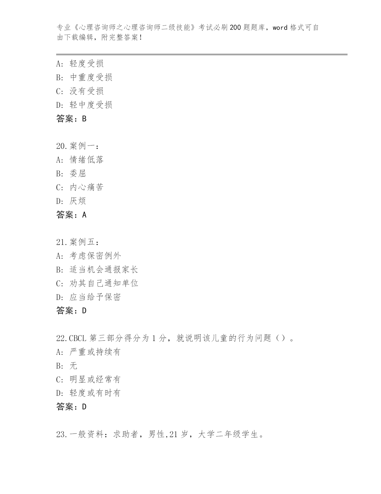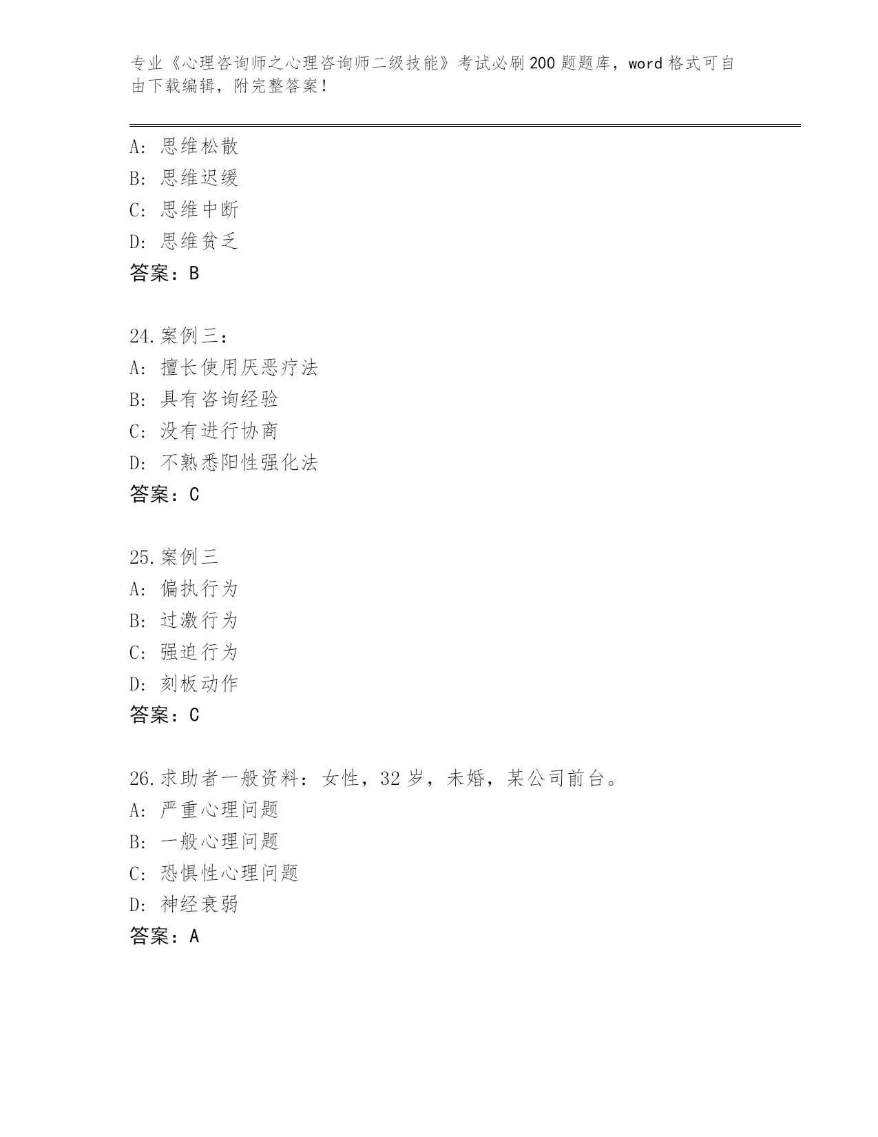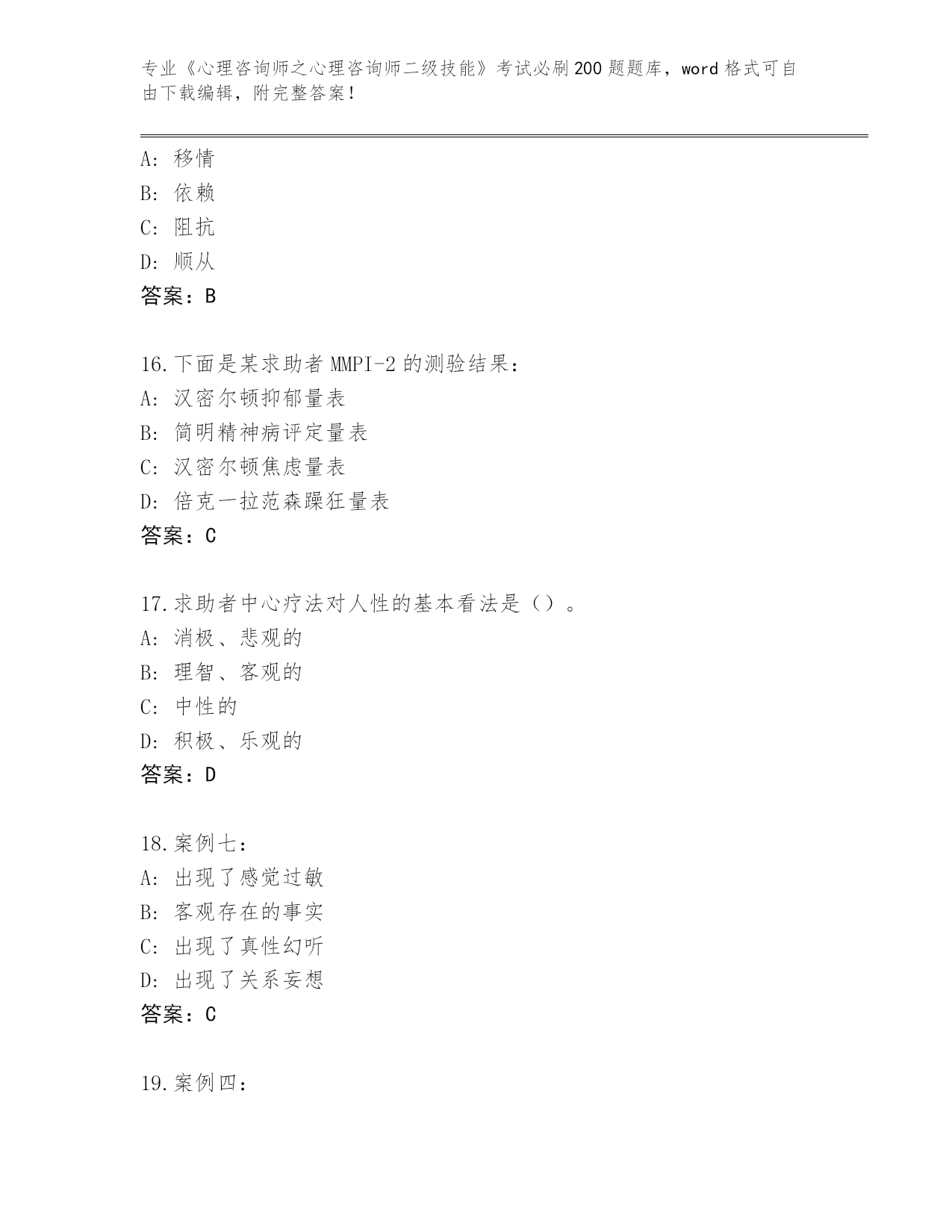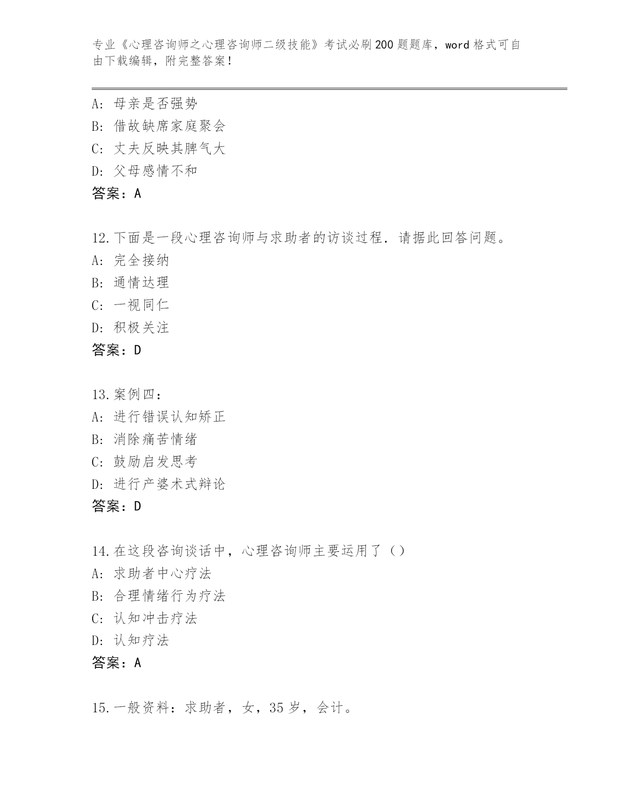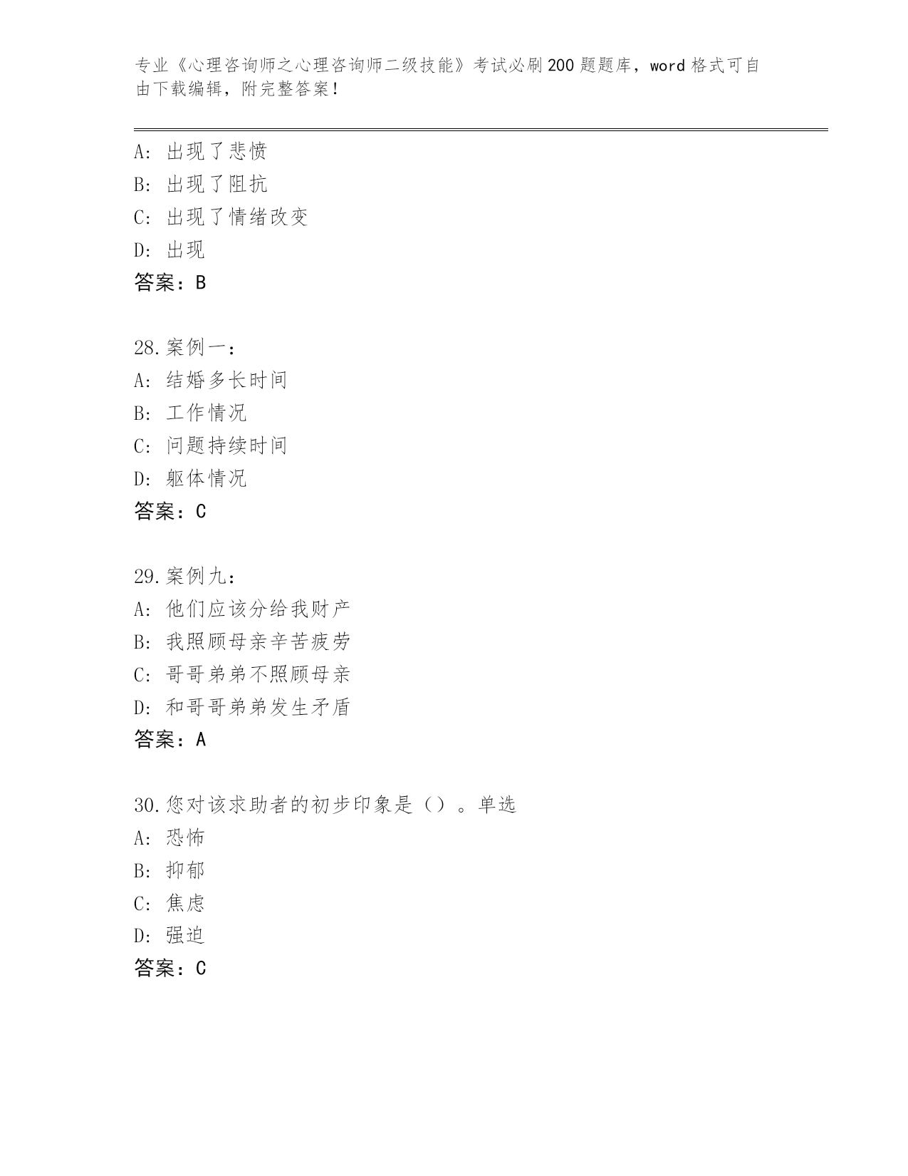 吉林省梅河口市内部使用《心理咨询师之心理咨询师二级技能》资格考试必刷200题通关秘籍题库附参考答案(培优A卷)