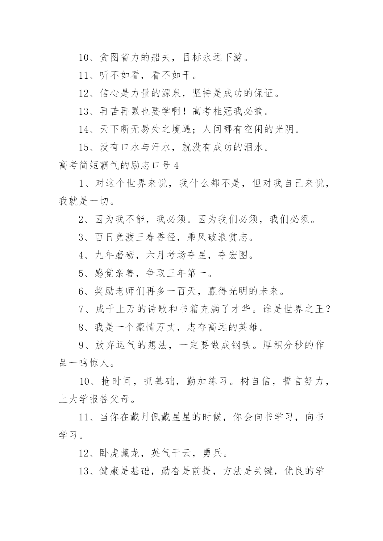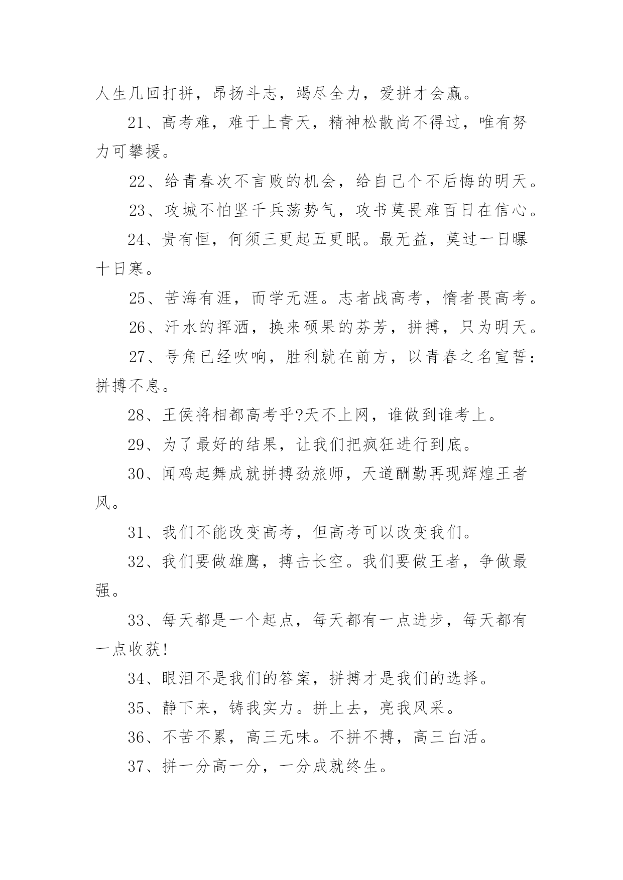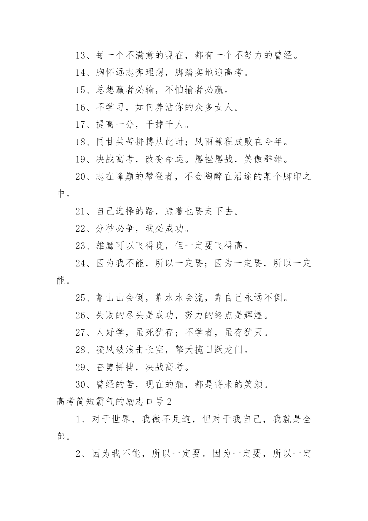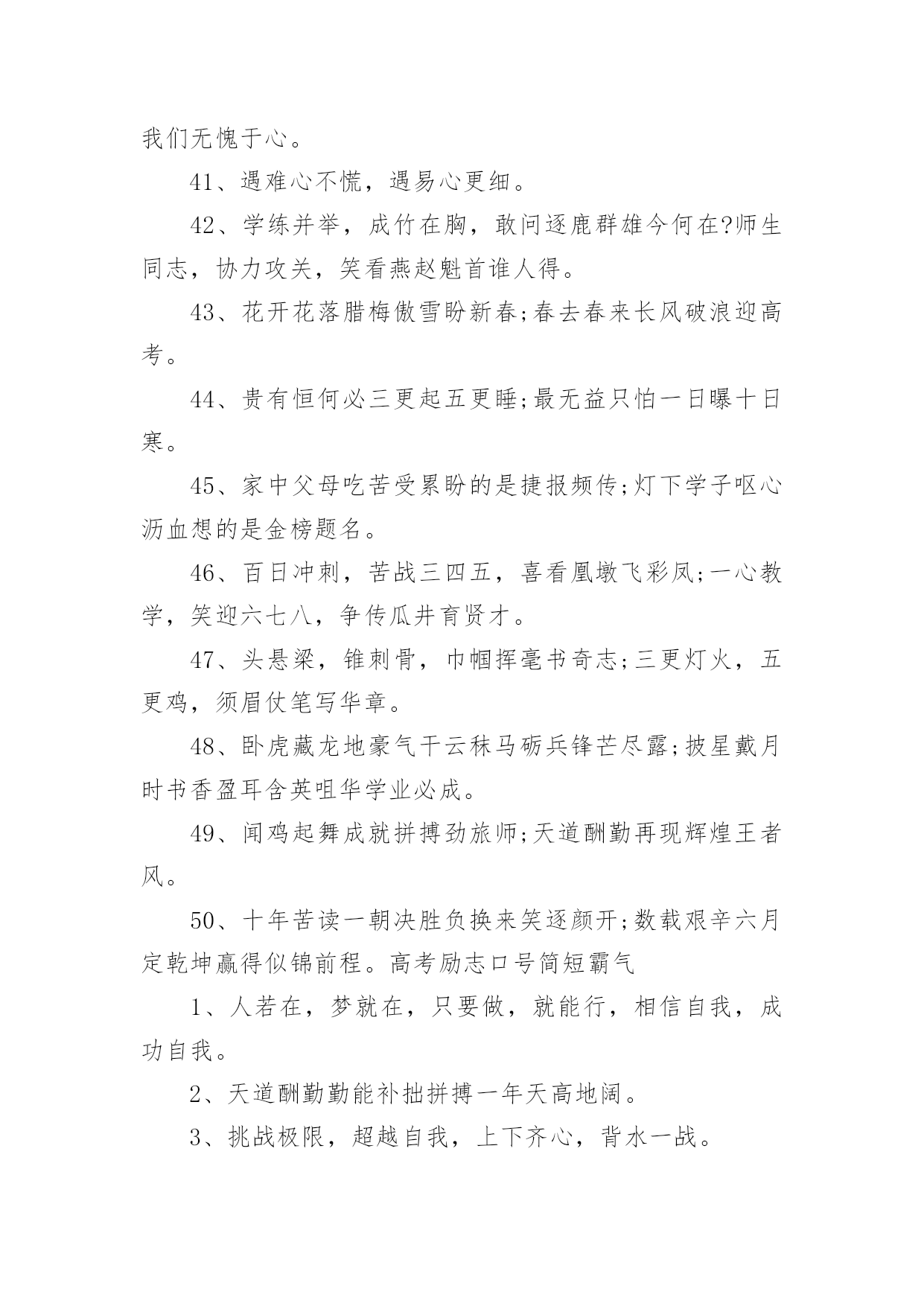 高考简短霸气的励志口号高考简短霸气的励志口号在学习、工作或生活中,说到口号,大家肯定都不陌生吧,口号作为意识的表现形式之一,是对当时社会政治、经济、文化的一种反映,不同性质的口号起着不同的作用。那什么样的口号才算得上是经典呢?下面是小编整理的高考简短霸气的励志口号,仅供参考,欢迎大家阅读。高考简短霸气的励志口号11、努力就能成功,坚持确保胜利。2、读书改变命运,刻苦成就事业,态度决定一切。3、不经风雨怎见彩虹;敢搏则过,爱拼才会赢。4、聚精会神搞学习,一心一意迎高考。5、人之所以能,是相信能。6、拼搏改变命运,虚度毁灭前途。7、立足基础,脚踏实地搏击高考。8、争分夺秒巧复习,勤学苦练创佳绩。9、更快更高更强。领先就是金牌。10、拼搏每一天,充实每一天,快乐每一天。11、对于世界,我微不足道,但对于我自己,我就是全部。12、精神成人,知识成才,态度成全。13、每一个不满意的现在,都有一个不努力的曾经。14、胸怀远志奔理想,脚踏实地迎高考。15、总想赢者必输,不怕输者必赢。16、不学习,如何养活你的众多女人。17、提高一分,干掉千人。18、同甘共苦拼搏从此时;风雨兼程成败在今年。19、决战高考,改变命运。屡挫屡战,笑傲群雄。20、志在峰巅的攀登者,不会陶醉在沿途的某个脚印之中。21、自己选择的路,跪着也要走下去。22、分秒必争,我必成功。23、雄鹰可以飞得晚,但一定要飞得高。24、因为我不能,所以一定要;因为一定要,所以一定能。25、靠山山会倒,靠水水会流,靠自己永远不倒。26、失败的尽头是成功,努力的终点是辉煌。27、人好学,虽死犹存;不学者,虽存犹灭。28、凌风破浪击长空,擎天揽日跃龙门。29、奋勇拼搏,决战高考。30、曾经的苦,现在的痛,都是将来的笑颜。高考简短霸气的励志口号21、对于世界,我微不足道,但对于我自己,我就是全部。2、因为我不能,所以一定要。因为一定要,所以一定能。3、百日竞渡三春香径乘风破浪酬壮志。4、九年磨砺六月考场摘星折桂展宏图。5、感亲恩直拼三年志在金榜题名。6、报师情再搏百日赢得似锦前程。7、千卷诗书满腹才华试问天下谁为王者。8、万丈豪情青春壮志敢对苍穹我是英雄。9、摒弃侥幸之念,必取百炼成钢。厚积分秒之功,始得一鸣惊人。10、抢时间,抓基础,勤演练定有收获。树自信,誓拼搏,升大学回报父母。11、披星戴月时书香盈耳含英咀华建学业。12、卧虎藏龙地豪气干云秣马厉兵显锋芒。13、健康是基础,勤奋是前提,方法是关键,优秀学风是条件,良好心理是保证。14、信心来自实力,实力来自勤奋。最困难的时候,也是离成功不远的时候。15、勇攀书山逐群雄实现心中梦想。16、泛游学海定乾坤赢得似锦前程。17、惜光阴百日犹短,细安排一刻也长。18、平日从严,高考坦然。19、脚踏实地,珍惜分秒。紧跟老师,夯实基础。20、求常胜,更求常省。21、青春多壮志硕果飘香迎佳绩。22、人生贵奋斗笑傲高考创辉煌。23、有大目标,须有大动作。有大追求,须有大改变。24、对命运承诺,对承诺负责25、再苦再累不掉队,再难再险不放弃26、请老师放心,我是你最骄傲的学子。请父母放心,我是你们最争气的孩子。27、我因一班而自豪,一班因我而骄傲28、拼搏高考,今生无悔。爬过高三,追求卓越!29、高三高考高目标,苦学善学上好学。30、无才无以立足,不苦不能成才。31、乐学实学,挑战高考。勤勉向上,成就自我。32、山高不厌攀,水深不厌潜,学精不厌苦:追求!33、作业考试化,考试高考化,将平时考试当高考,高考考试当平时。34、挑战人生是我无悔的选择,决胜高考是我不懈的追求。35、我心飞翔,路在脚下。36、保持平常心,营造好环境,扬起常笑脸,轻松迎高考。37、我自信,我出色:我拼搏,我成功!38、拧成一股绳,搏尽一份力,狠下一条心,共圆一个梦。39、努力就能成功,坚持确保胜利。40、回忆很美,尽管过程艰辛:也许结果总有遗憾,但我们无愧于心。41、遇难心不慌,遇易心更细。42、学练并举,成竹在胸,敢问逐鹿群雄今何在?师生同志,协力攻关,笑看燕赵魁首谁人得。43、花开花落腊梅傲雪盼新春;春去春来长风破浪迎高考。44、贵有恒何必三更起五更睡;最无益只怕一日曝十日寒。45、家中父母吃苦受累盼的是捷报频传;灯下学子呕心沥血想的是金榜题名。46、百日冲刺,苦战三四五,喜看凰墩飞彩凤;一心教学,笑迎六七八,争传瓜井育贤才。47、头悬梁,锥刺骨,巾帼挥毫书奇志;三更灯火,五更鸡,须眉仗笔写华章。48、卧虎藏龙地豪气干云秣马砺兵锋芒尽露;披星戴月时书香盈耳含英咀华学业必成。49、闻鸡起舞成就拼搏劲旅师;天道酬勤再现辉煌王者风。50、十年苦读一朝决胜负换来笑逐颜开;数载艰辛六月定乾坤赢得似锦前程。高考励志口号简短霸气1、人若在,梦就在,只要做,就能行,相信自我,成功自我。2、天道